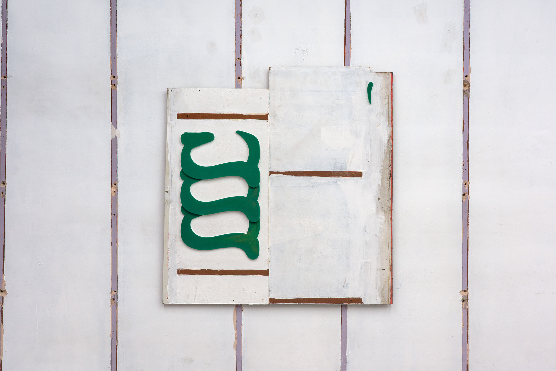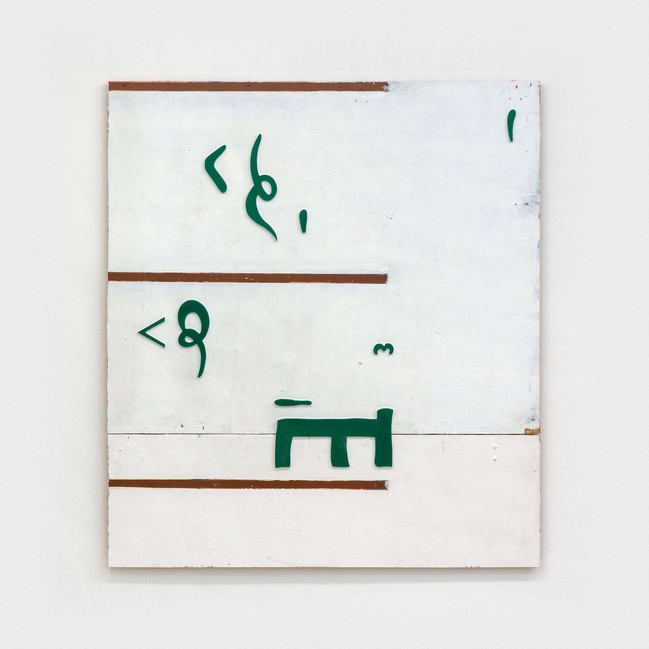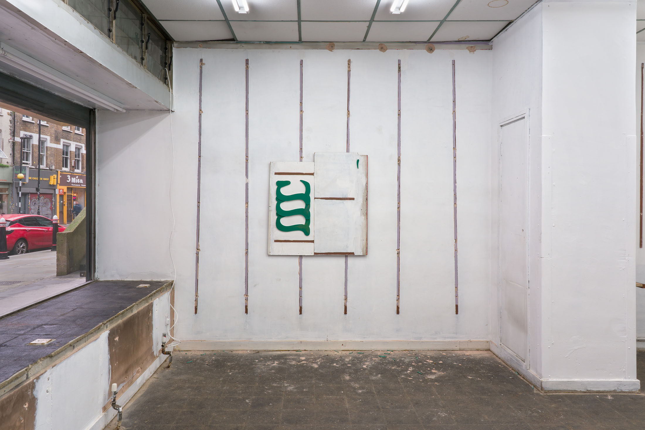 Khan’s wall-based works mobilize composition not as expressions of formal coherence, but as measures of instability. Integrating cut-up shop signs and found materials, they disperse authorial intention – a process of registration rather than expression. The method of deconstruction weighs in similar importance to that which is being taken apart: a gallery space housed in a brutalist estate, erected as a proclamation of utopian progress and aspiration, yet equally marked by a postwar housing crisis in east London, inseparable from the material realities of wartime destruction. Khan’s own familial history echoes this pattern, relocating from Kashmir following the construction of the Mangla Dam in 1966 – its construction mapping a parallel relationship between idealism, industrial achievement, mass displacement and violence. Across his spatial intervention and works on panel, Khan both investigates