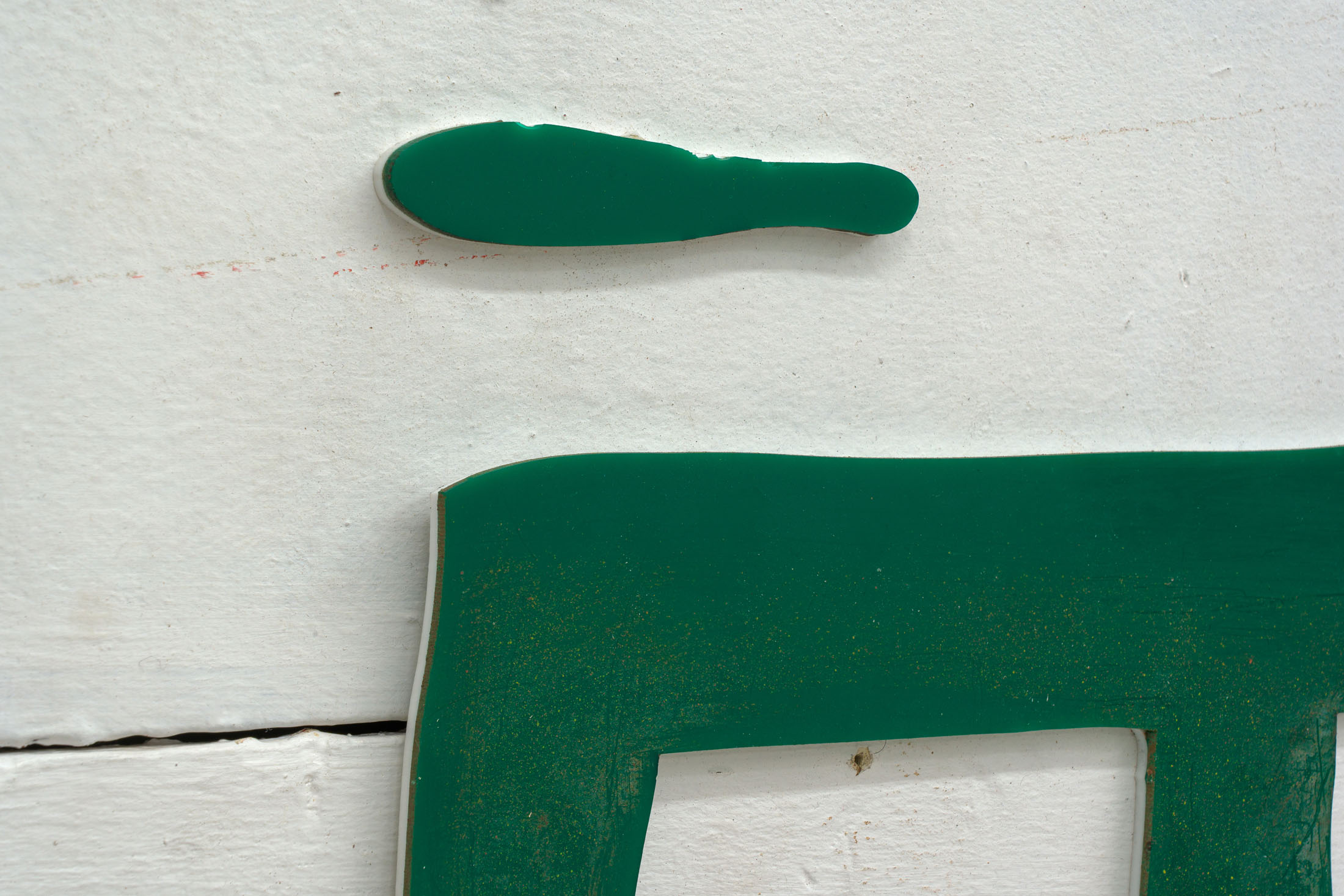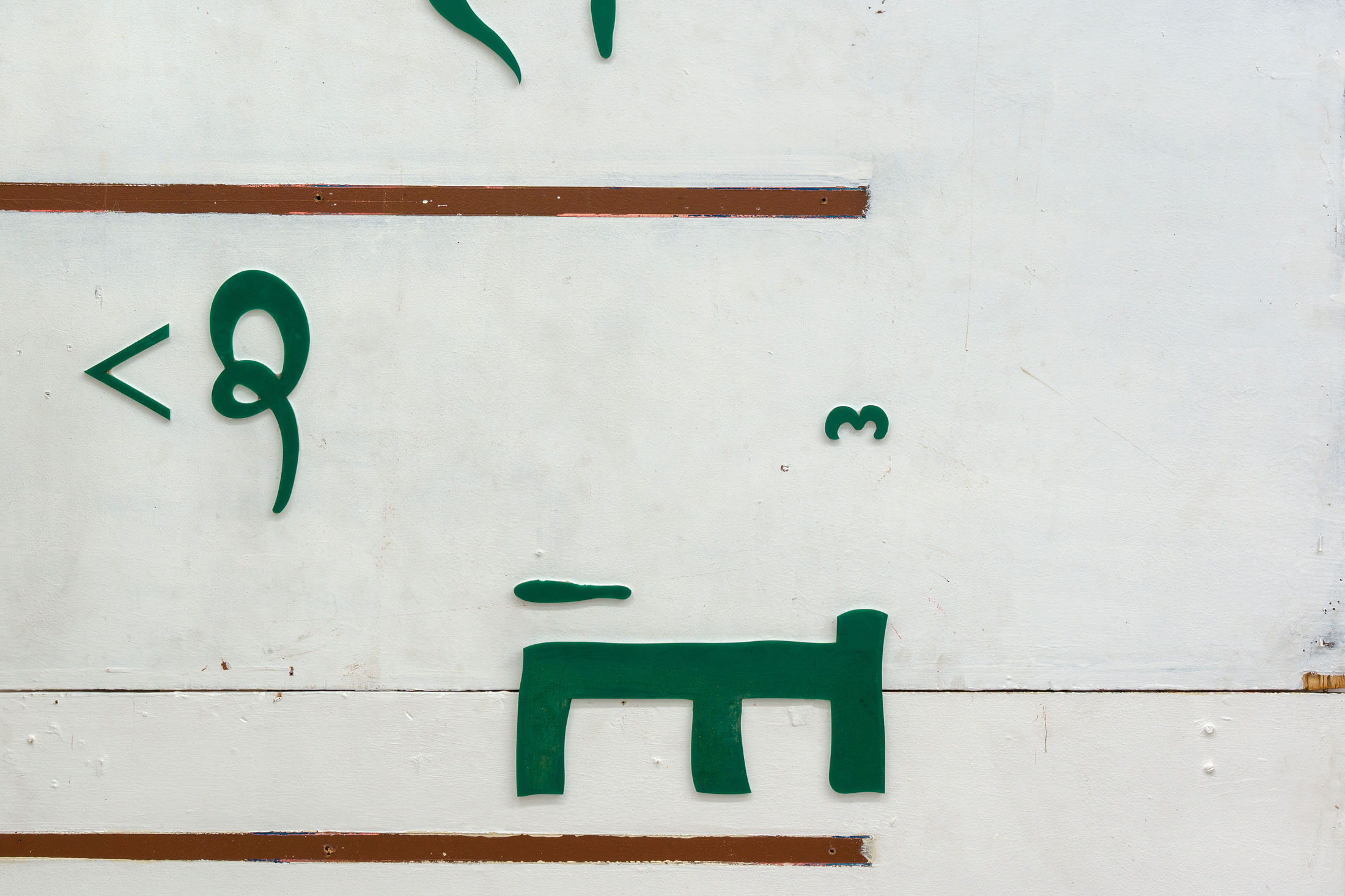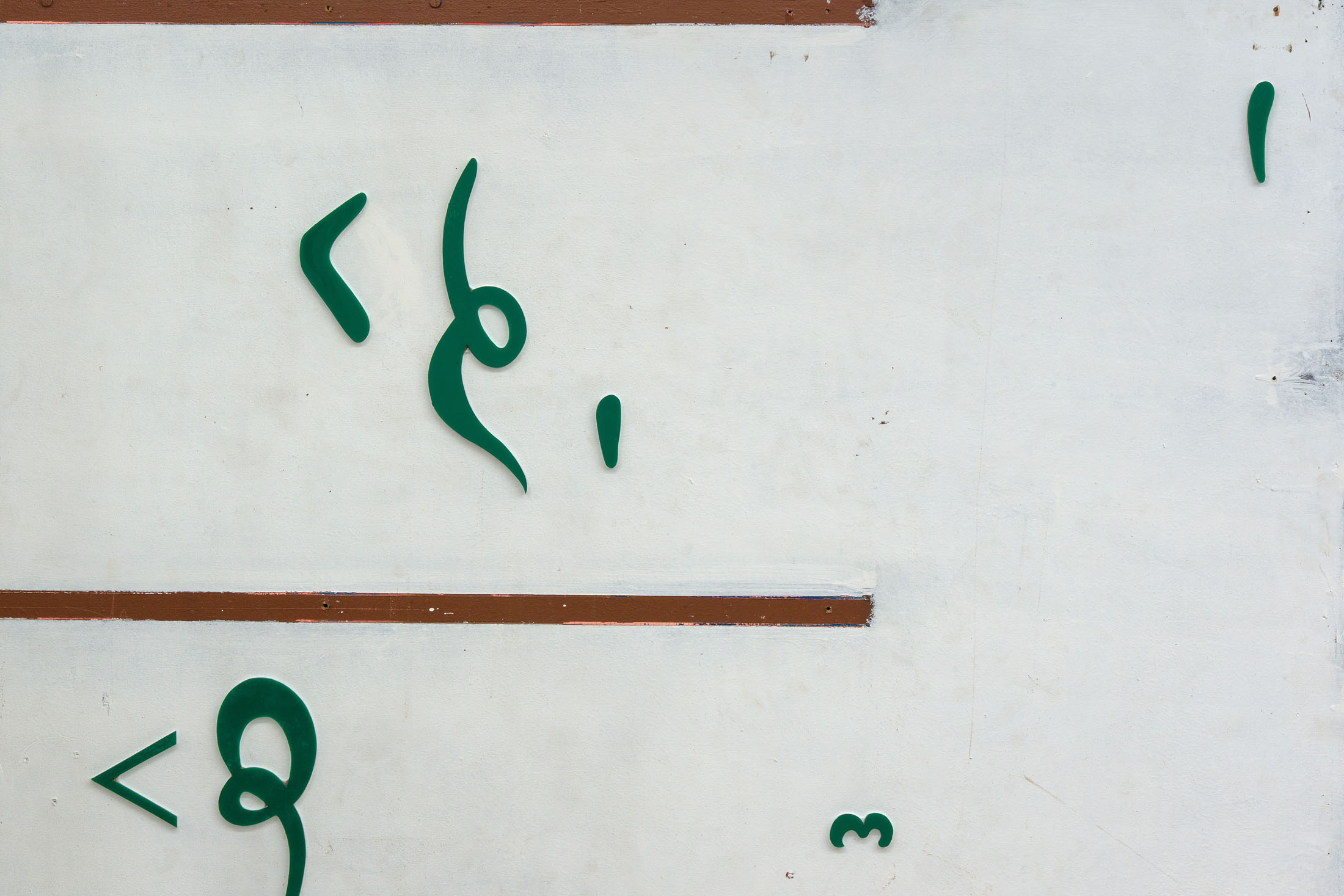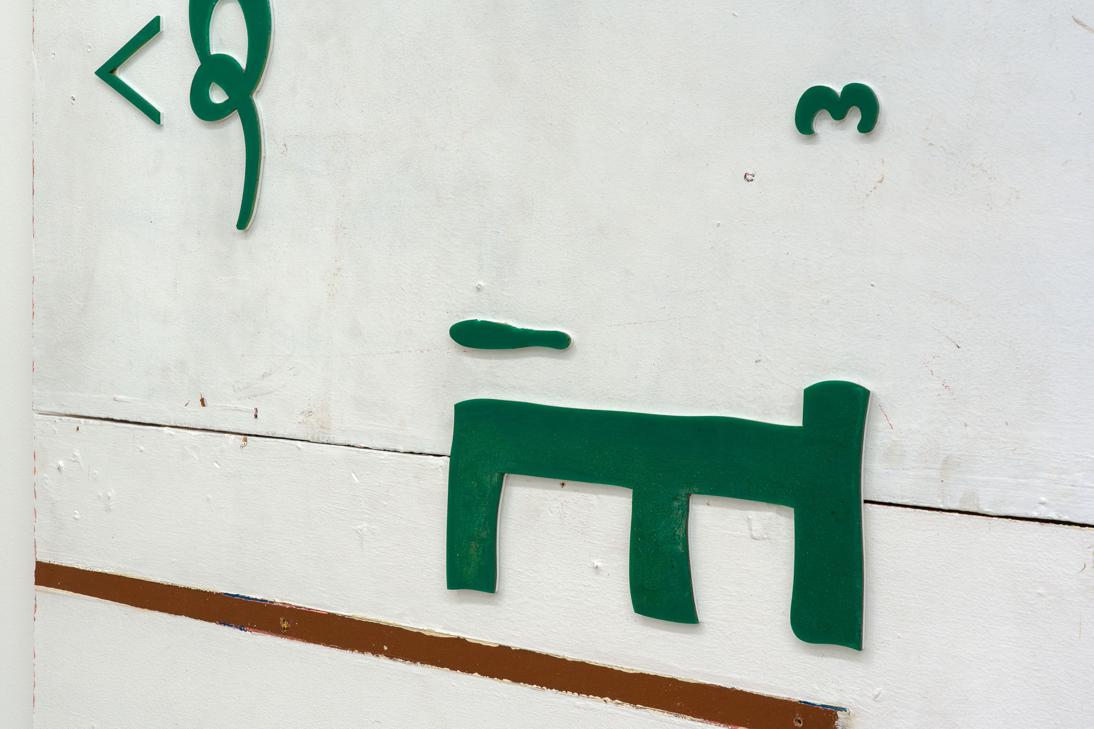 Khan’s wall-based works mobilize composition not as expressions of formal coherence, but as measures of instability. Integrating cut-up shop signs and found materials, they disperse authorial intention – a process of registration rather than expression. The method of deconstruction weighs in similar importance to that which is being taken apart: a gallery space housed in a brutalist estate, erected as a proclamation of utopian progress and aspiration, yet equally marked by a postwar housing crisis in east London, inseparable from the material realities of wartime destruction. Khan’s own familial history echoes this pattern, relocating from Kashmir following the construction of the Mangla Dam in 1966 – its construction mapping a parallel relationship between idealism, industrial achievement, mass displacement and violence. Across his spatial intervention and works on panel, Khan both investigates