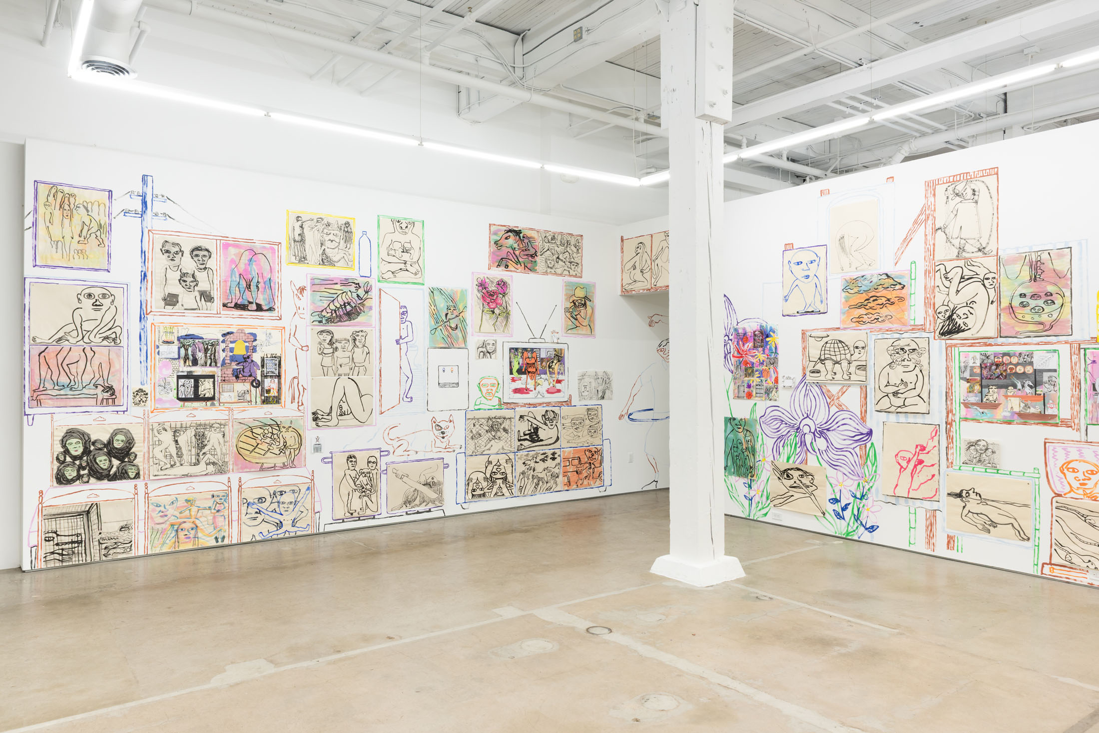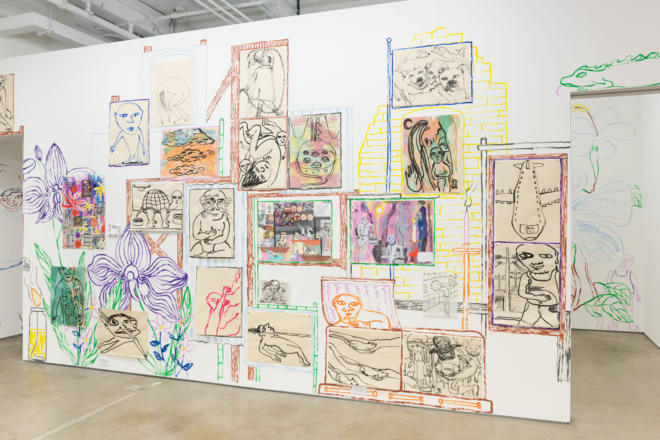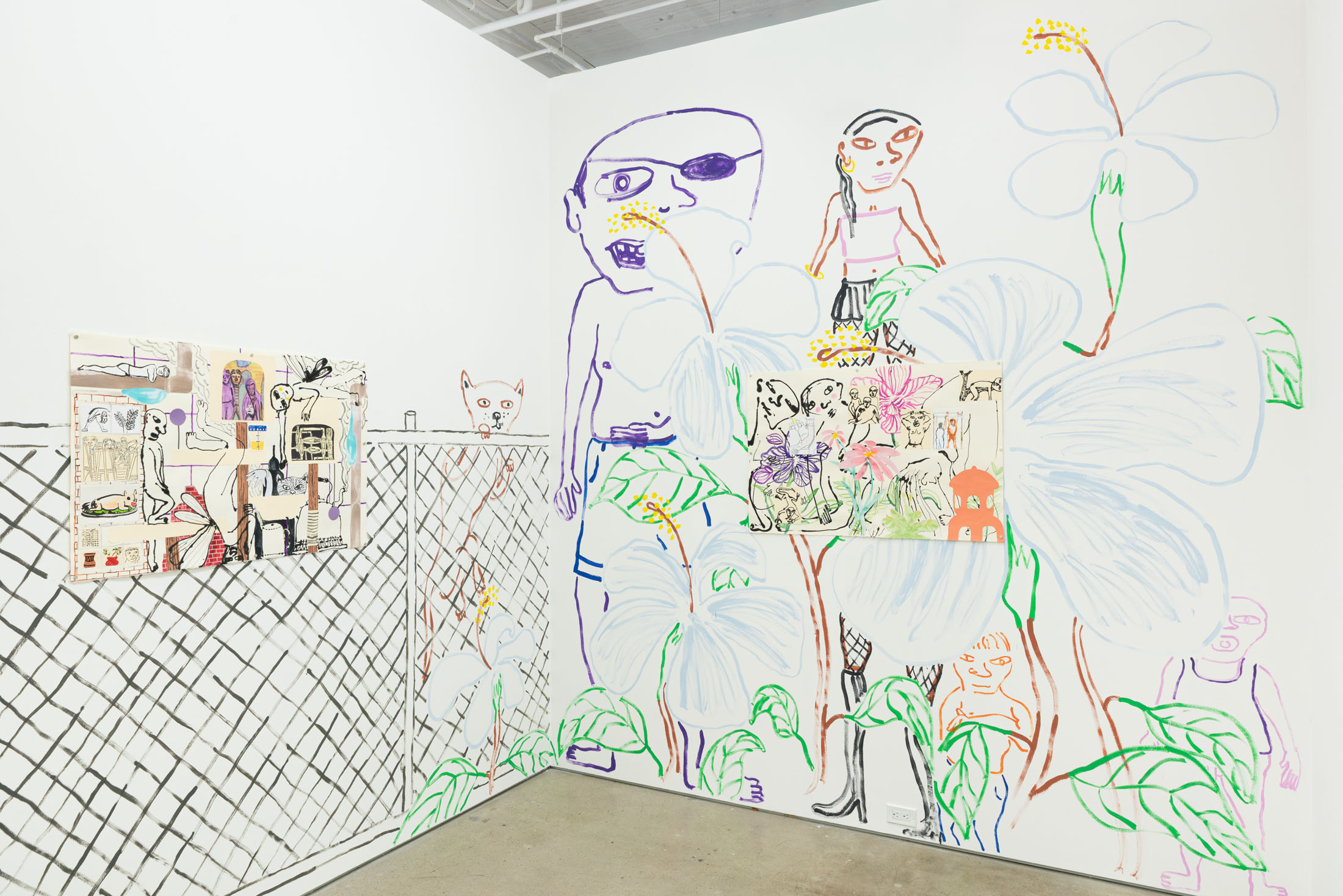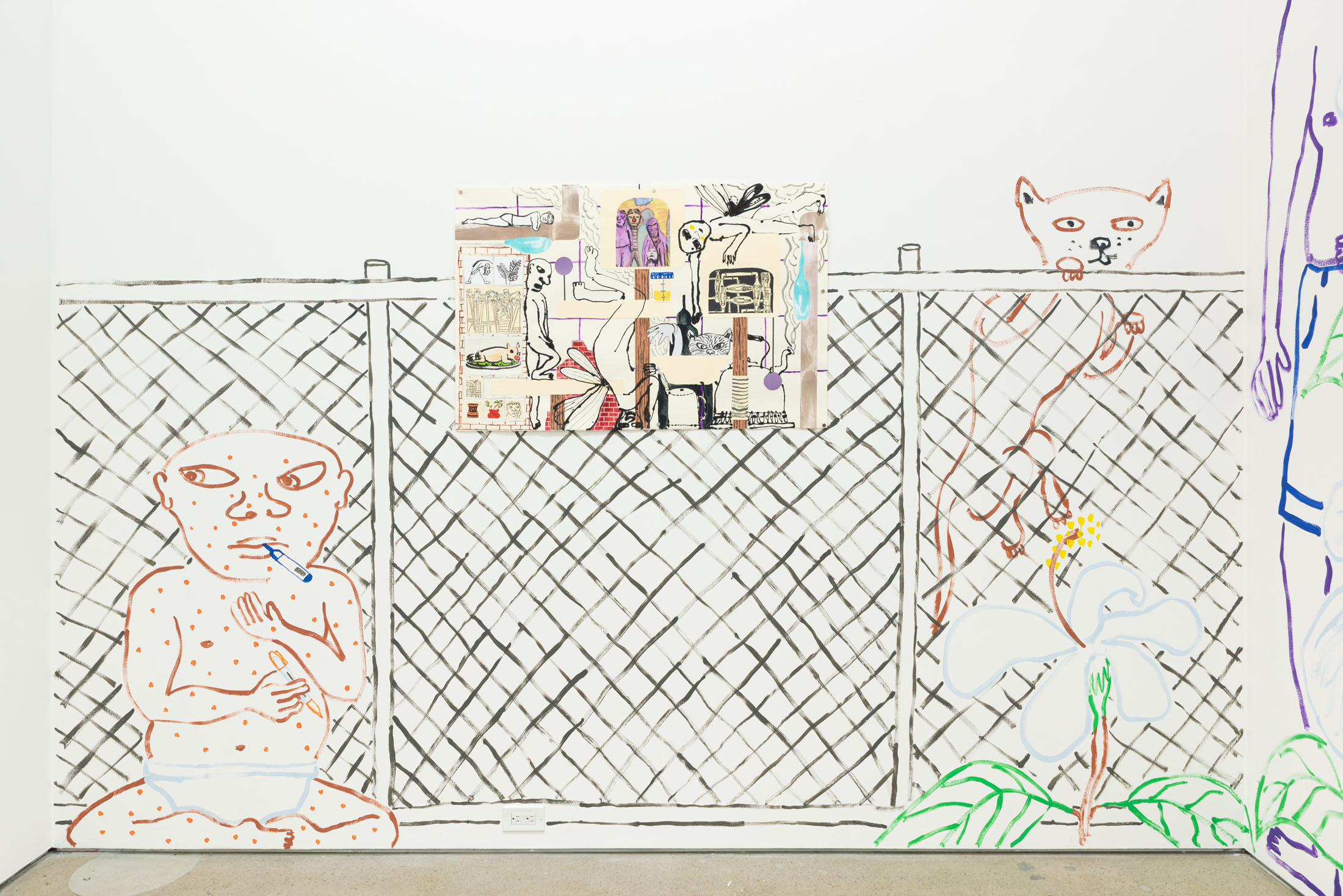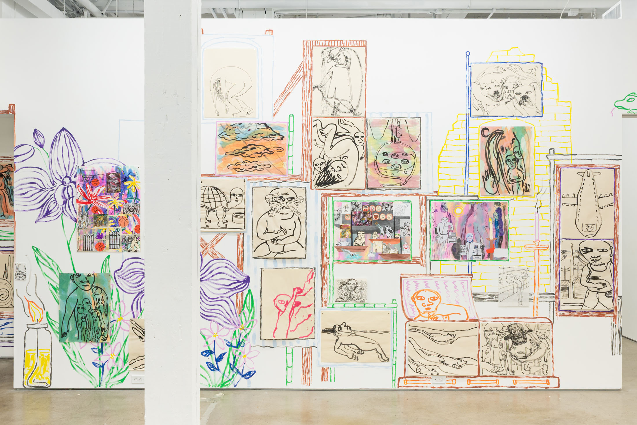 The foundation of Pugay’s exhibition, his second with the gallery, is a series of large-scale wall drawings referencing memories and myths of the artist’s upbringing both in the Philippines and the United States. Bold graphic lines fill the space with details of his former family home (bulldozed shortly after the family immigrated to the U.S.) and imagined temple-like structures that, in part, reflect the body and self as fragile or provisional architecture. Layered against this foundation is a dizzying array of drawings and collages that exist in a state of playful free association. Pugay populates his world with mutant archetypes and spiritual apparitions, shape-shifting dancers, anthropomorphized beings, and sentimental posers. These figures navigate disjointed realms drawn from historical, mythological, and religious imagery; the visual language of video games; viral social media narratives; and clickbait.