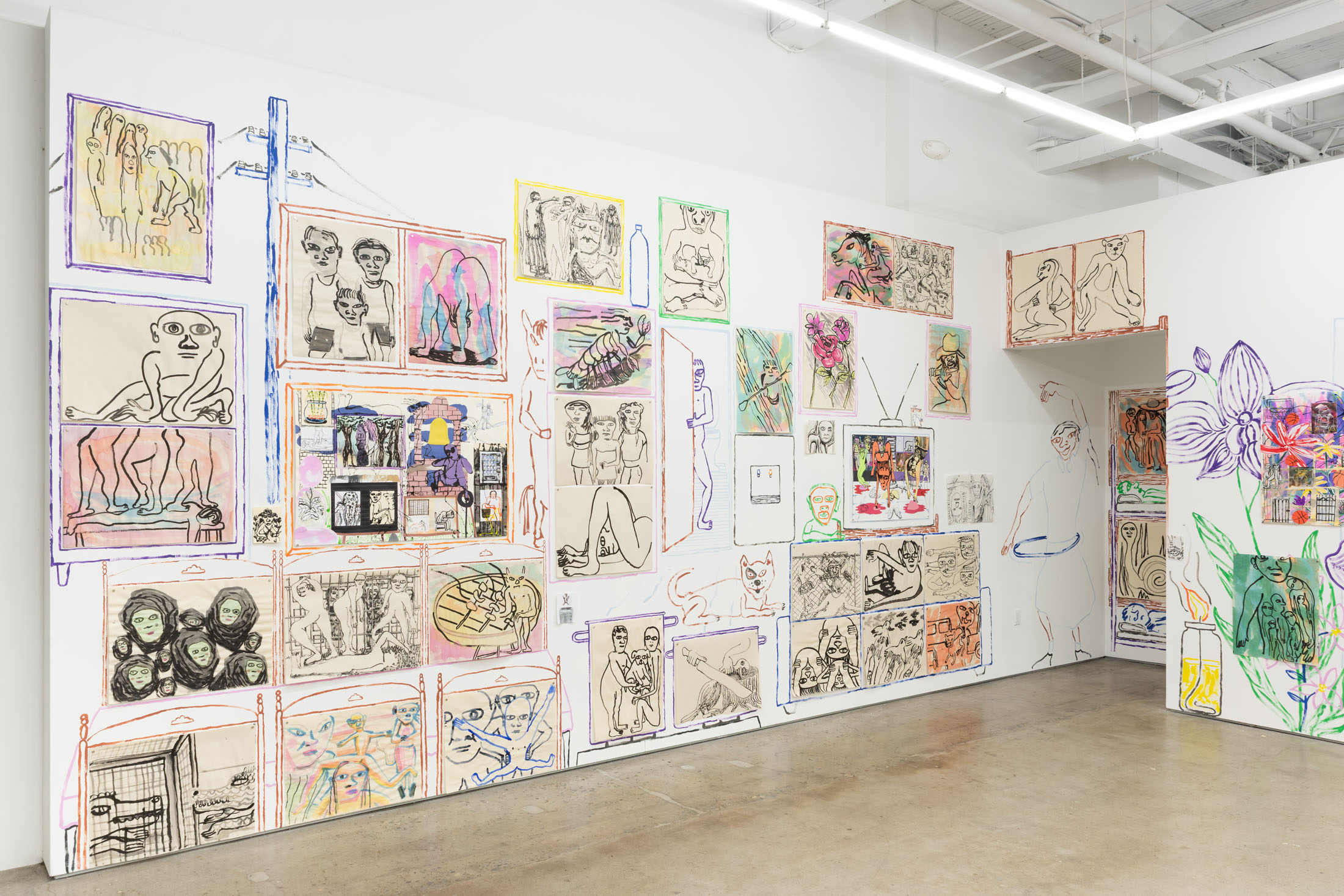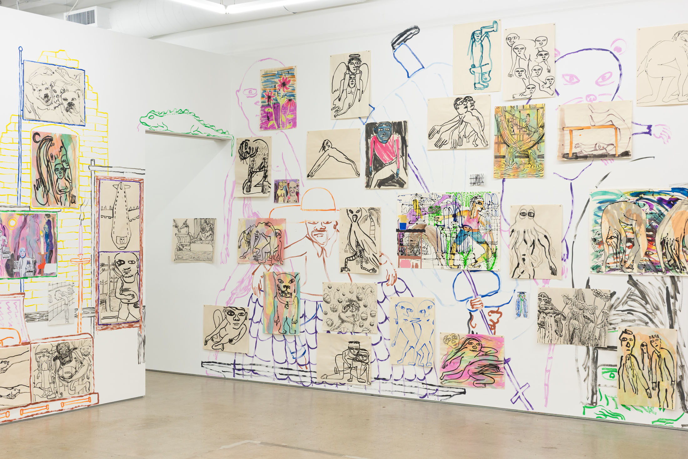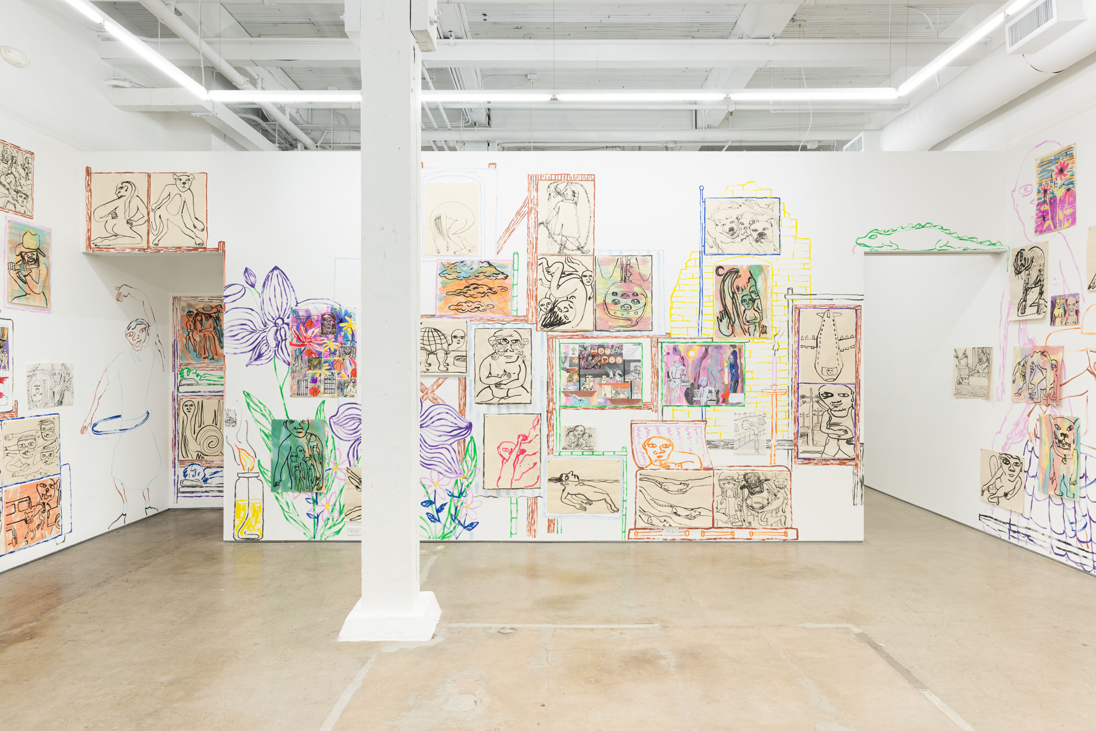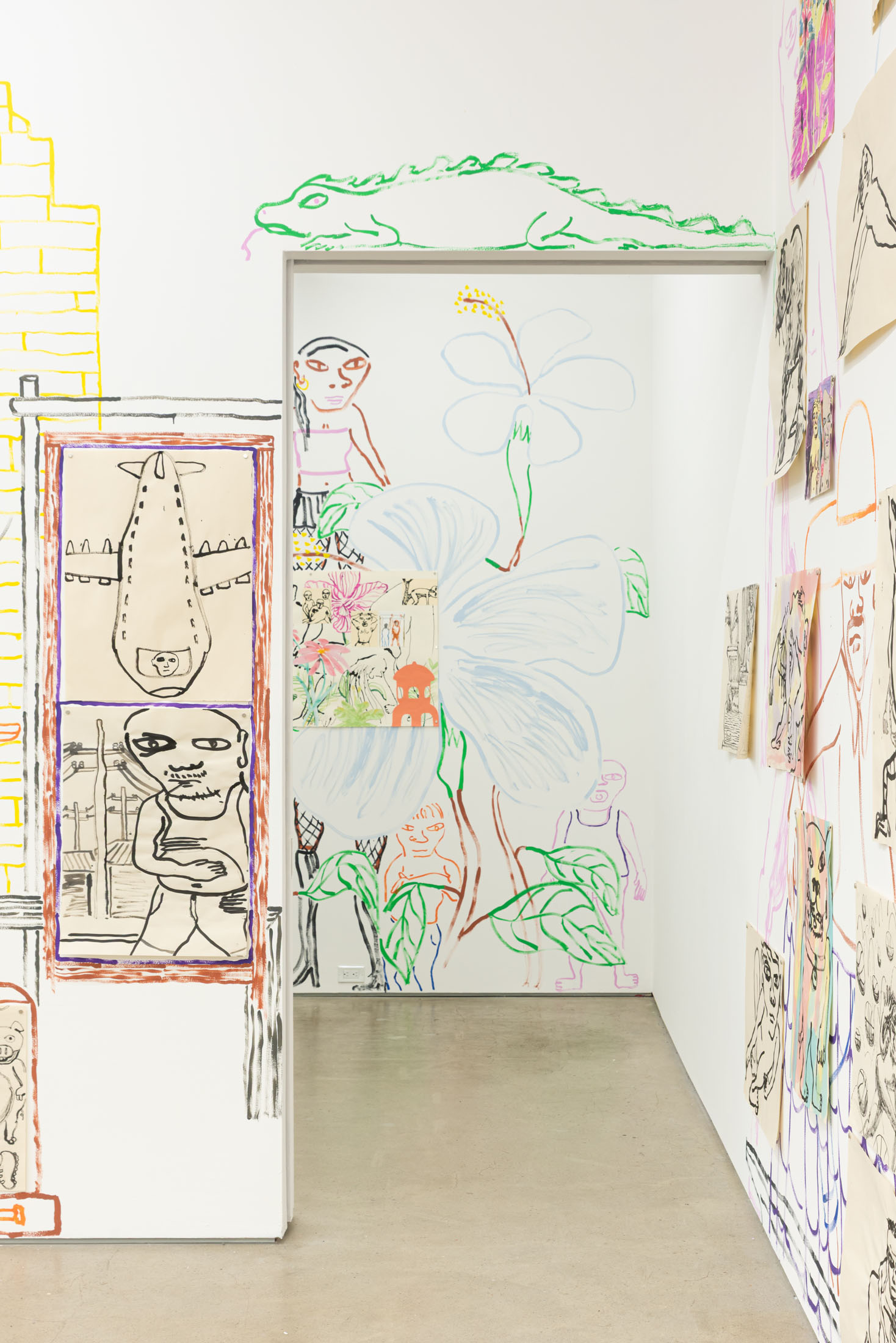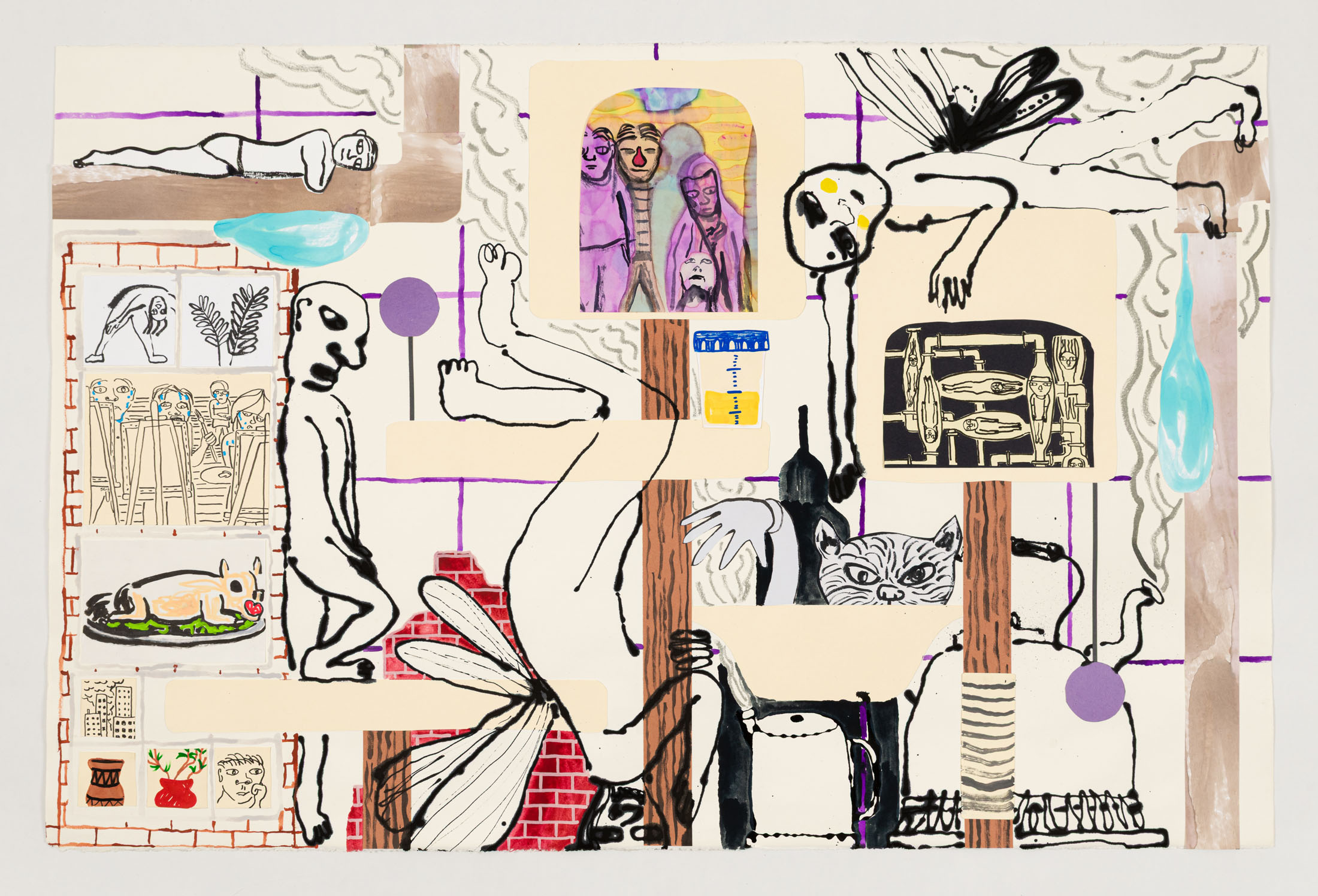 The foundation of Pugay’s exhibition, his second with the gallery, is a series of large-scale wall drawings referencing memories and myths of the artist’s upbringing both in the Philippines and the United States. Bold graphic lines fill the space with details of his former family home (bulldozed shortly after the family immigrated to the U.S.) and imagined temple-like structures that, in part, reflect the body and self as fragile or provisional architecture. Layered against this foundation is a dizzying array of drawings and collages that exist in a state of playful free association. Pugay populates his world with mutant archetypes and spiritual apparitions, shape-shifting dancers, anthropomorphized beings, and sentimental posers. These figures navigate disjointed realms drawn from historical, mythological, and religious imagery; the visual language of video games; viral social media narratives; and clickbait.