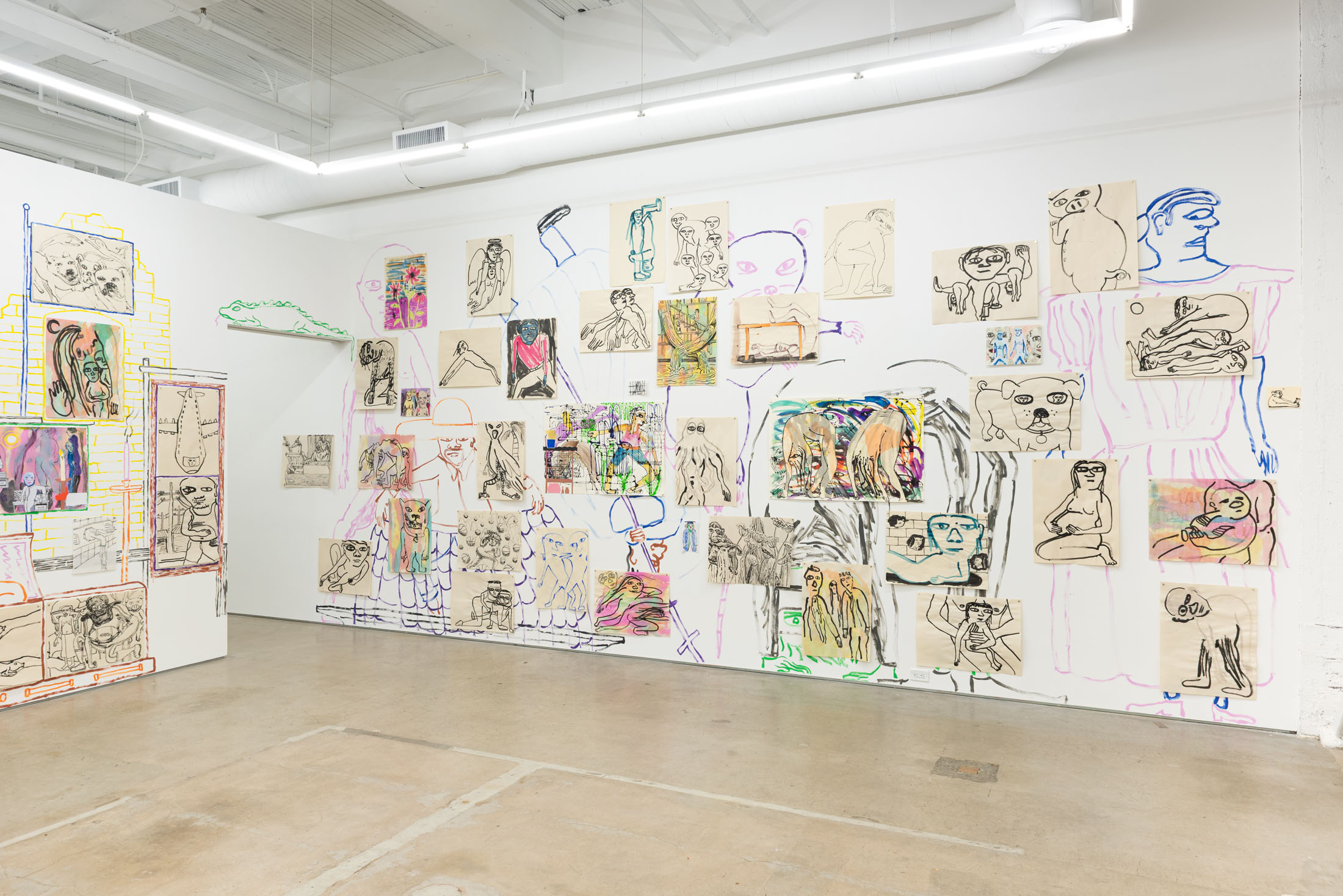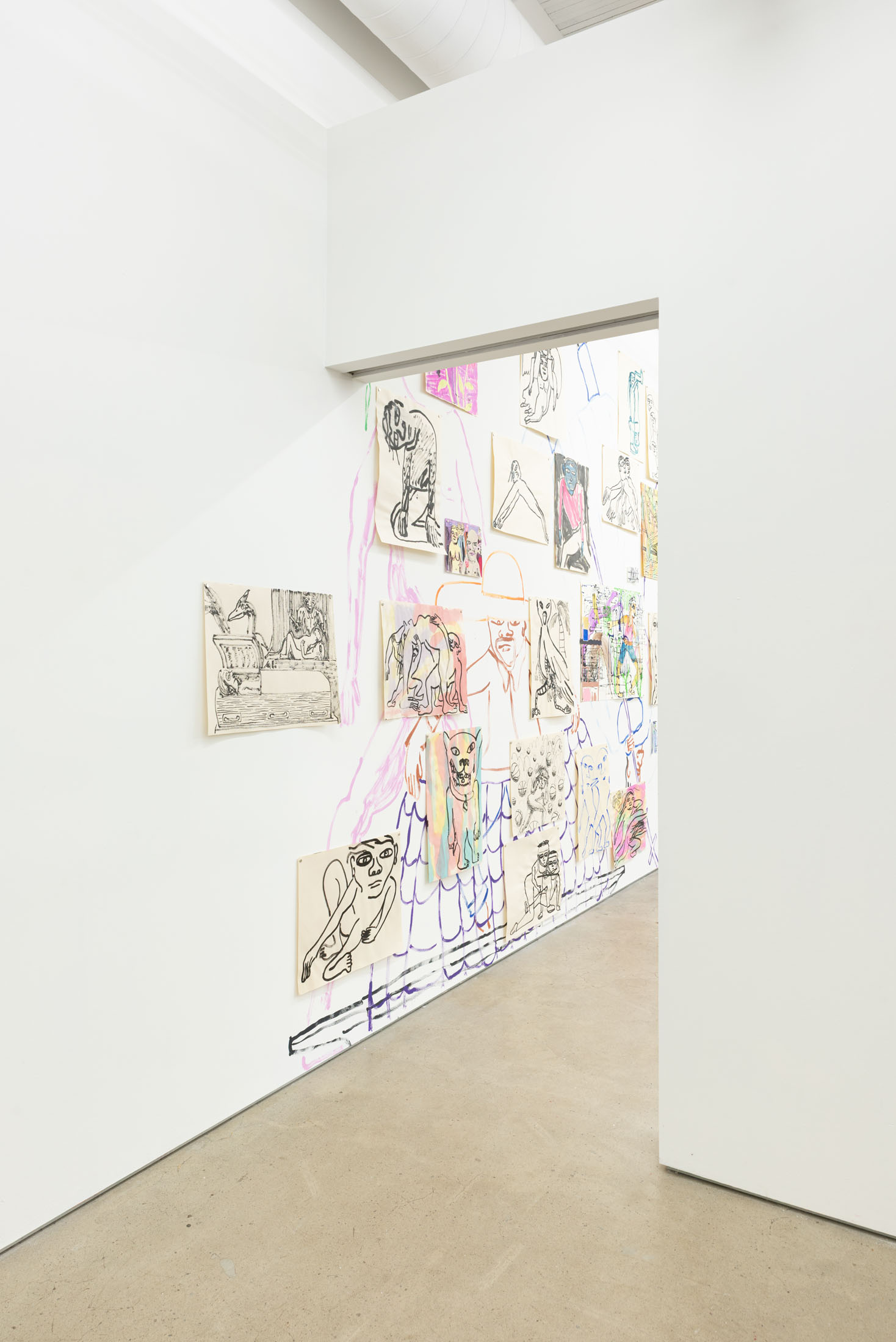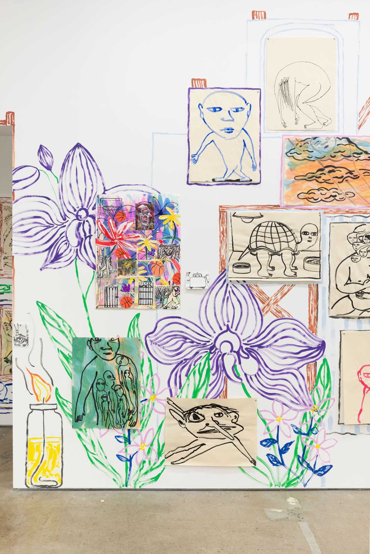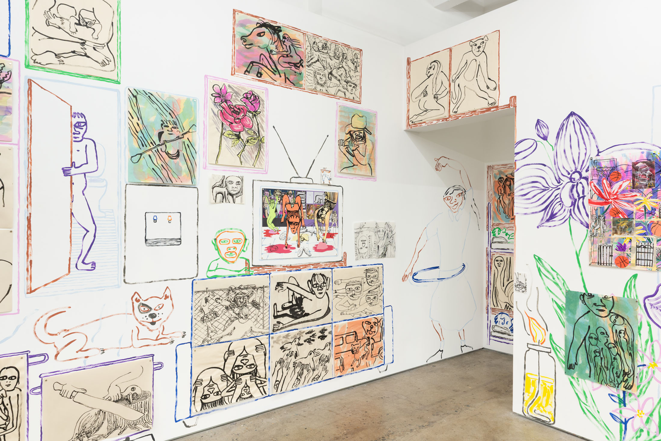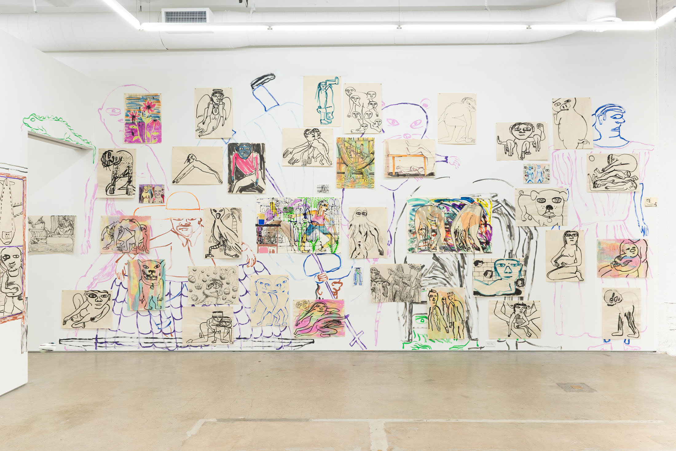 The foundation of Pugay’s exhibition, his second with the gallery, is a series of large-scale wall drawings referencing memories and myths of the artist’s upbringing both in the Philippines and the United States. Bold graphic lines fill the space with details of his former family home (bulldozed shortly after the family immigrated to the U.S.) and imagined temple-like structures that, in part, reflect the body and self as fragile or provisional architecture. Layered against this foundation is a dizzying array of drawings and collages that exist in a state of playful free association. Pugay populates his world with mutant archetypes and spiritual apparitions, shape-shifting dancers, anthropomorphized beings, and sentimental posers. These figures navigate disjointed realms drawn from historical, mythological, and religious imagery; the visual language of video games; viral social media narratives; and clickbait.