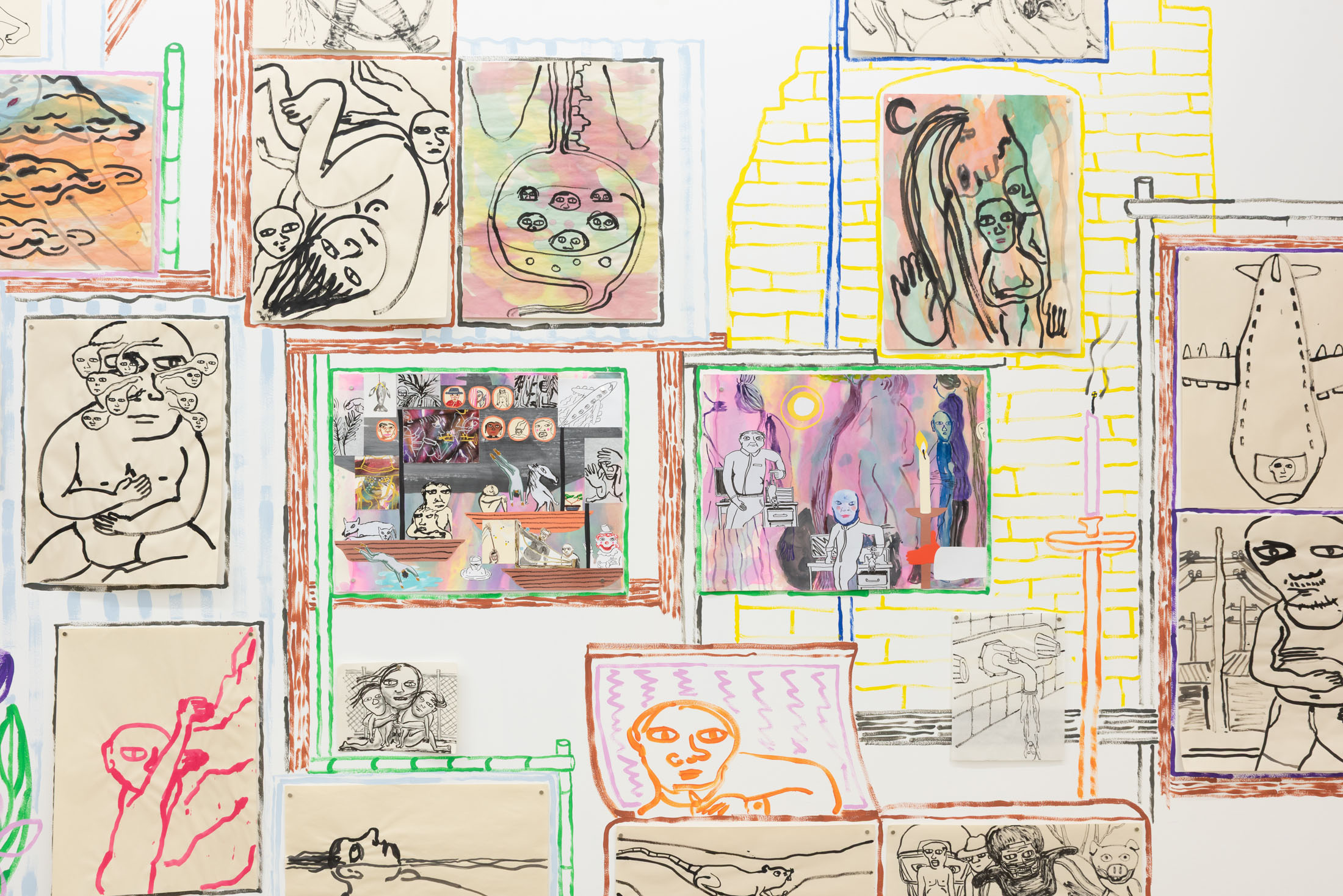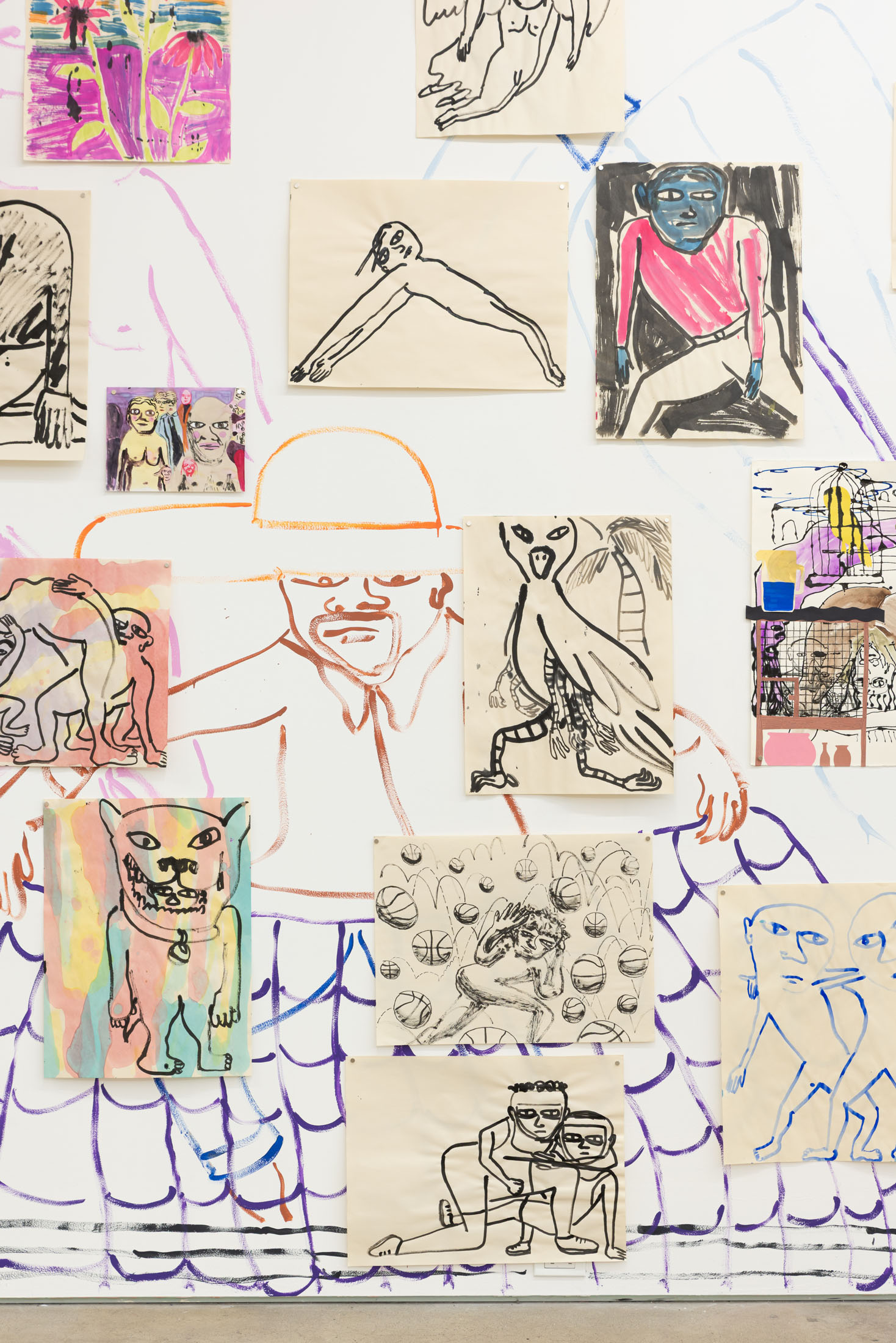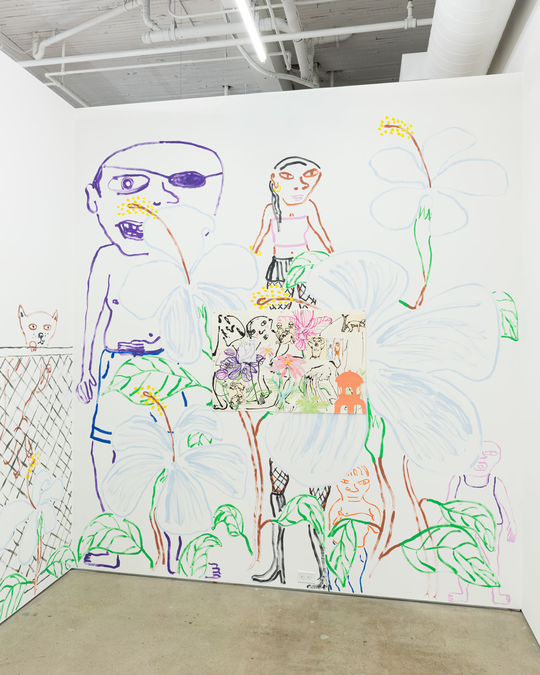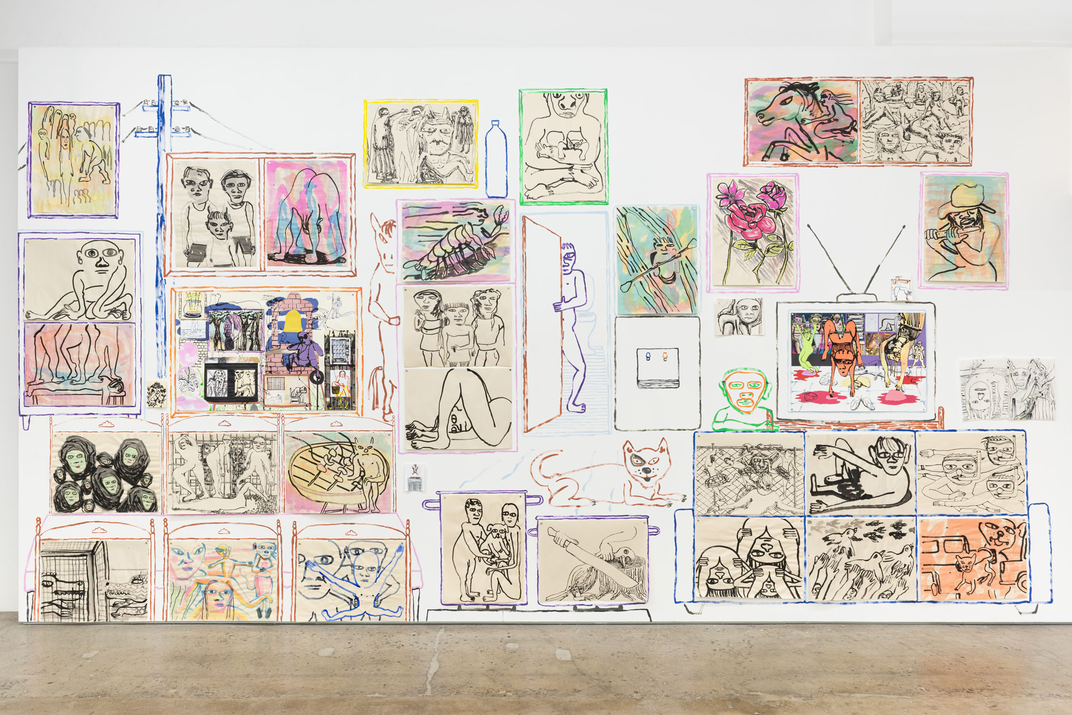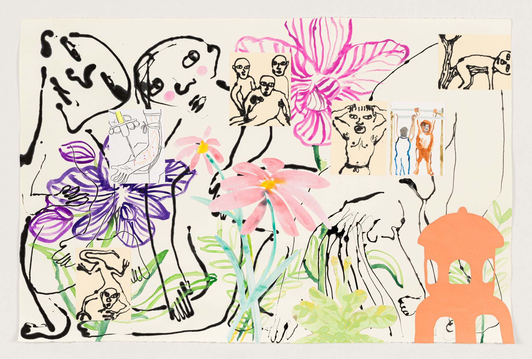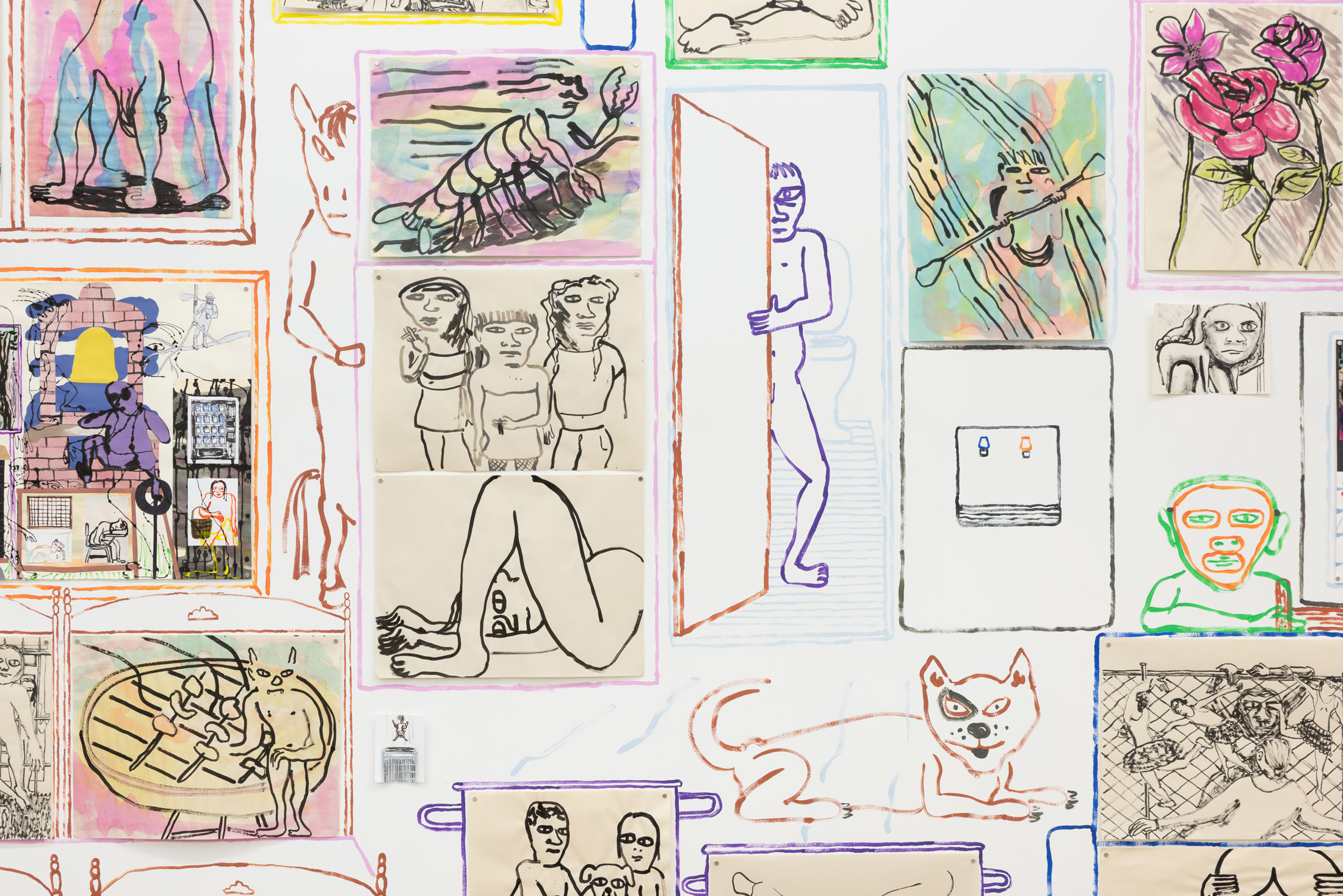 The foundation of Pugay’s exhibition, his second with the gallery, is a series of large-scale wall drawings referencing memories and myths of the artist’s upbringing both in the Philippines and the United States. Bold graphic lines fill the space with details of his former family home (bulldozed shortly after the family immigrated to the U.S.) and imagined temple-like structures that, in part, reflect the body and self as fragile or provisional architecture. Layered against this foundation is a dizzying array of drawings and collages that exist in a state of playful free association. Pugay populates his world with mutant archetypes and spiritual apparitions, shape-shifting dancers, anthropomorphized beings, and sentimental posers. These figures navigate disjointed realms drawn from historical, mythological, and religious imagery; the visual language of video games; viral social media narratives; and clickbait.