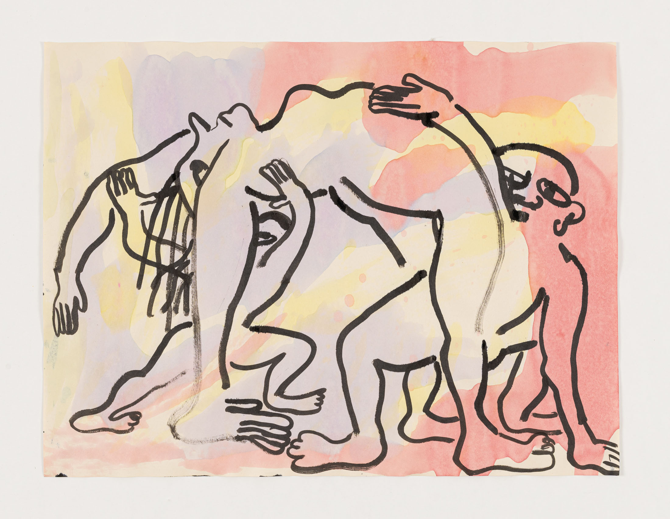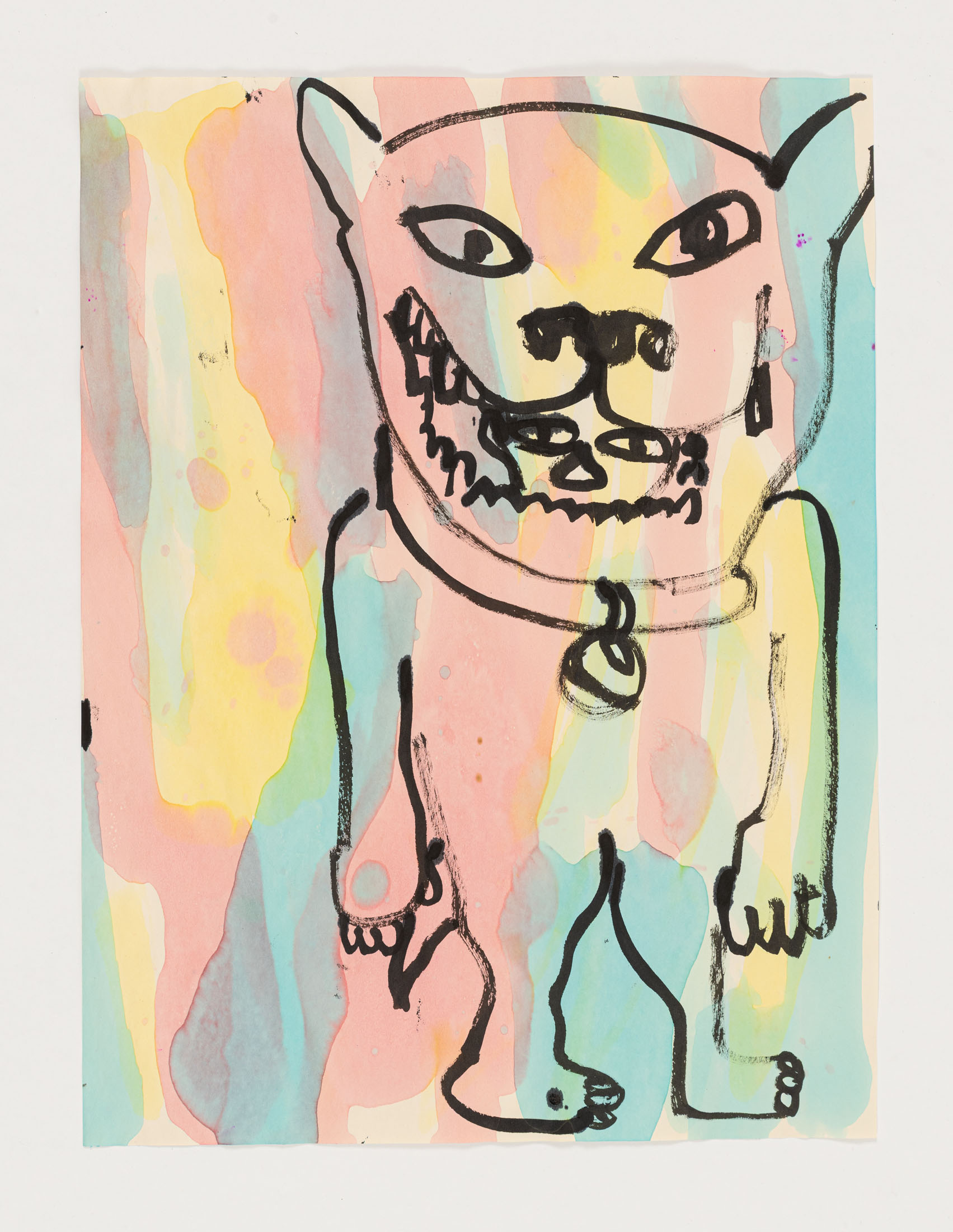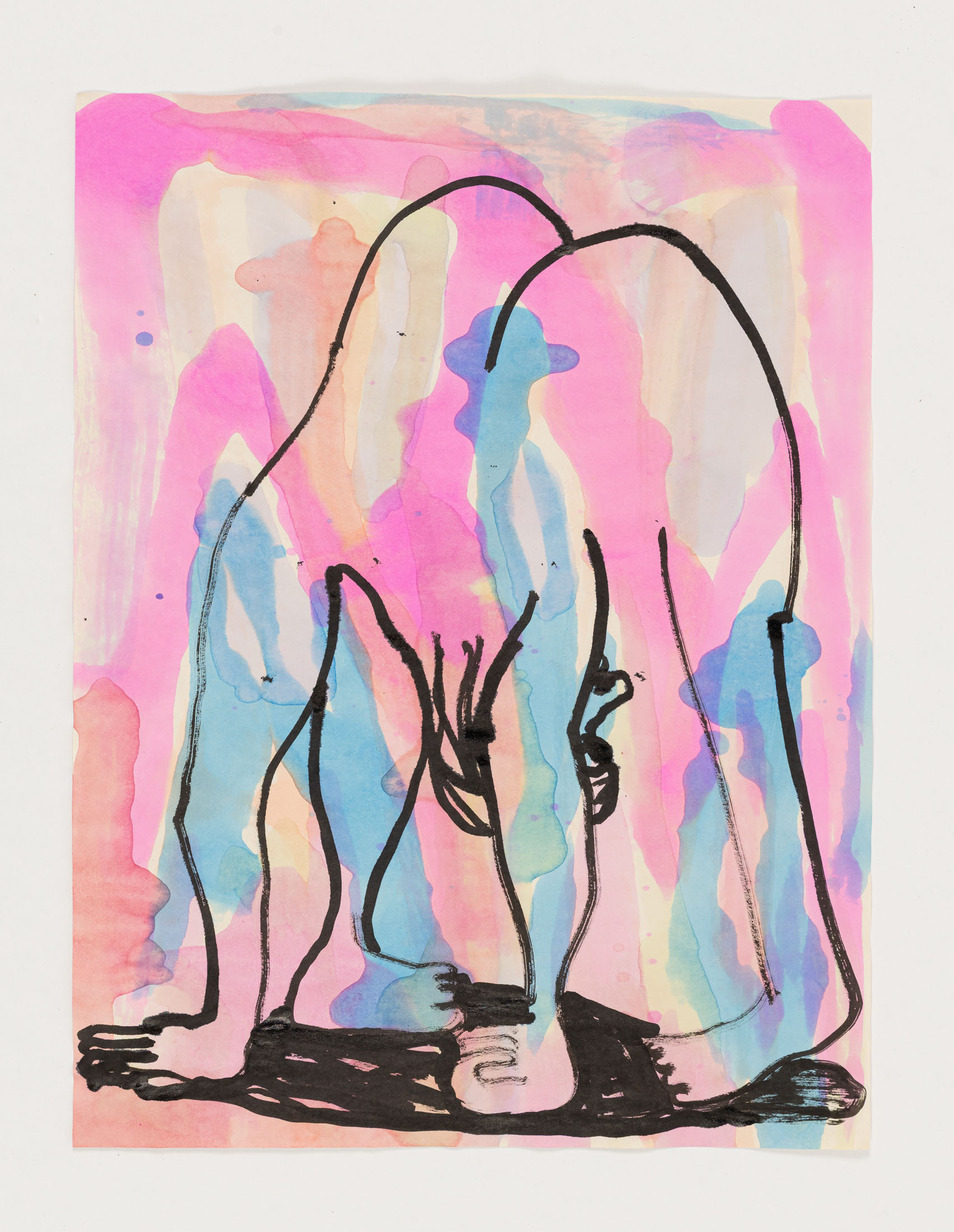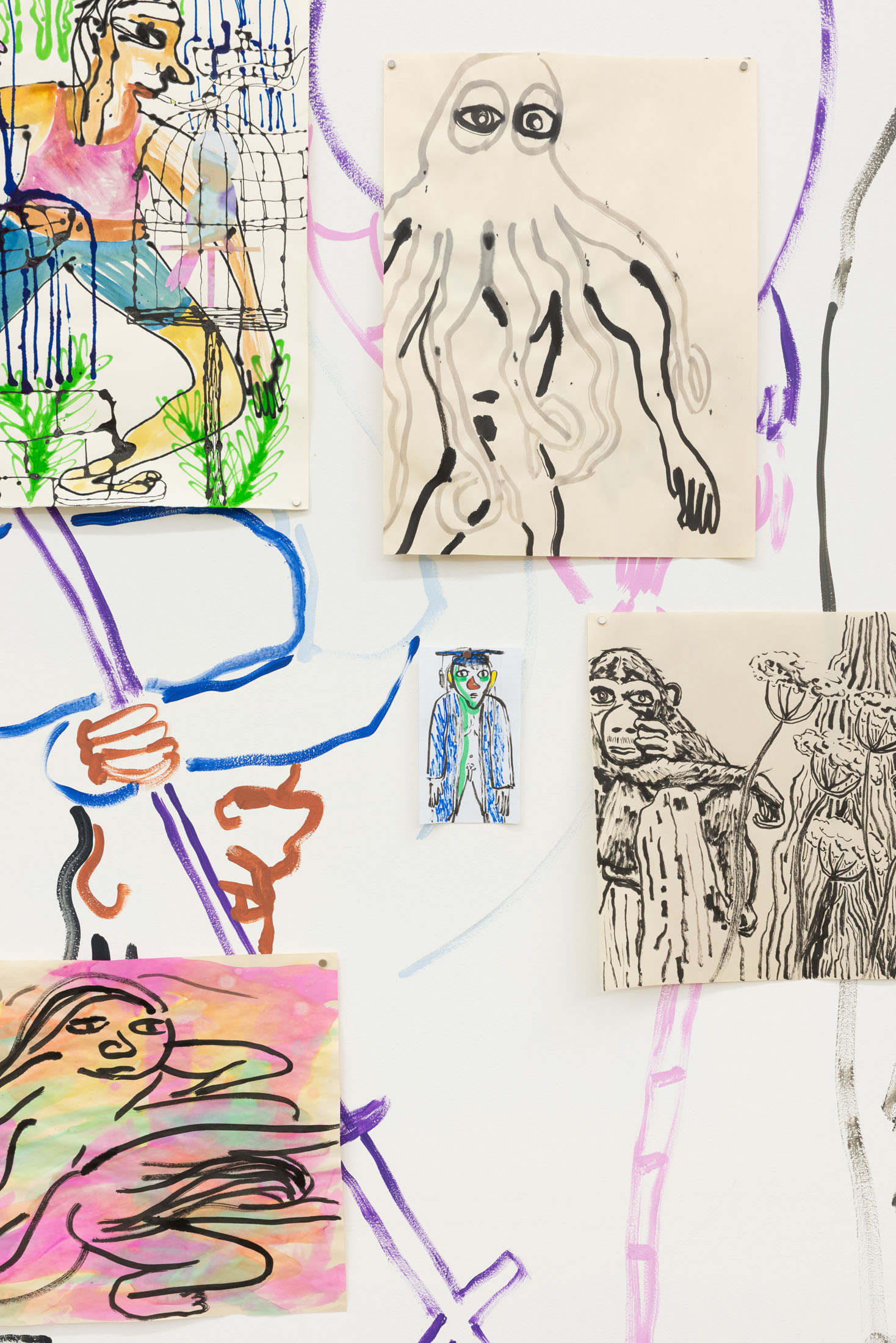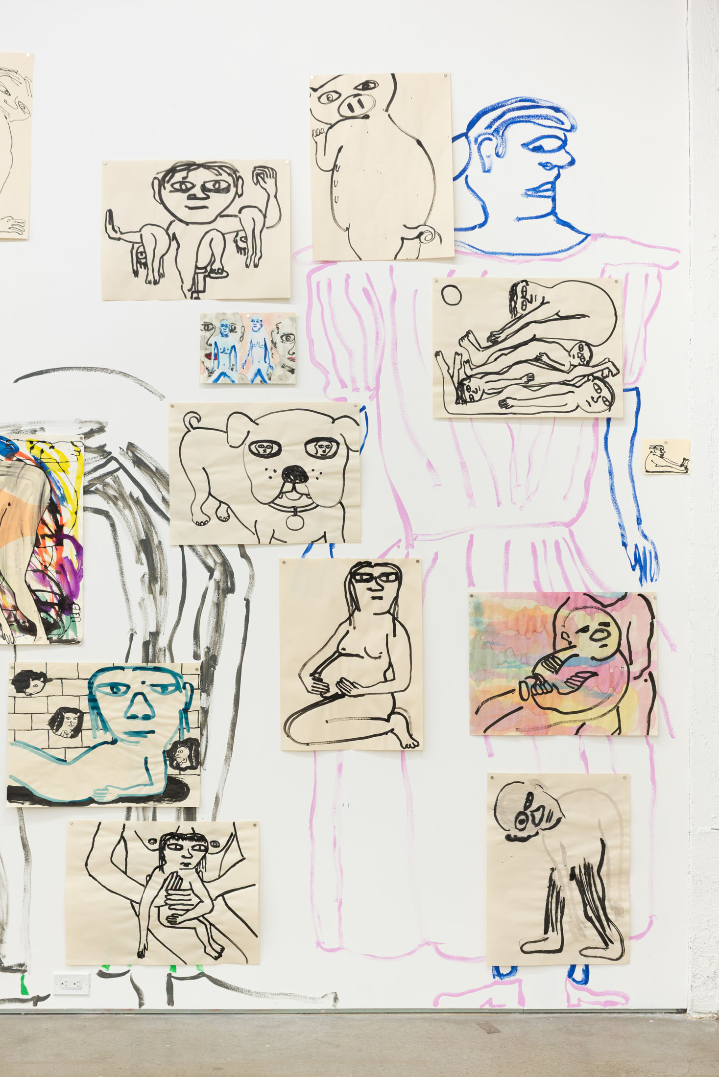 The foundation of Pugay’s exhibition, his second with the gallery, is a series of large-scale wall drawings referencing memories and myths of the artist’s upbringing both in the Philippines and the United States. Bold graphic lines fill the space with details of his former family home (bulldozed shortly after the family immigrated to the U.S.) and imagined temple-like structures that, in part, reflect the body and self as fragile or provisional architecture. Layered against this foundation is a dizzying array of drawings and collages that exist in a state of playful free association. Pugay populates his world with mutant archetypes and spiritual apparitions, shape-shifting dancers, anthropomorphized beings, and sentimental posers. These figures navigate disjointed realms drawn from historical, mythological, and religious imagery; the visual language of video games; viral social media narratives; and clickbait.