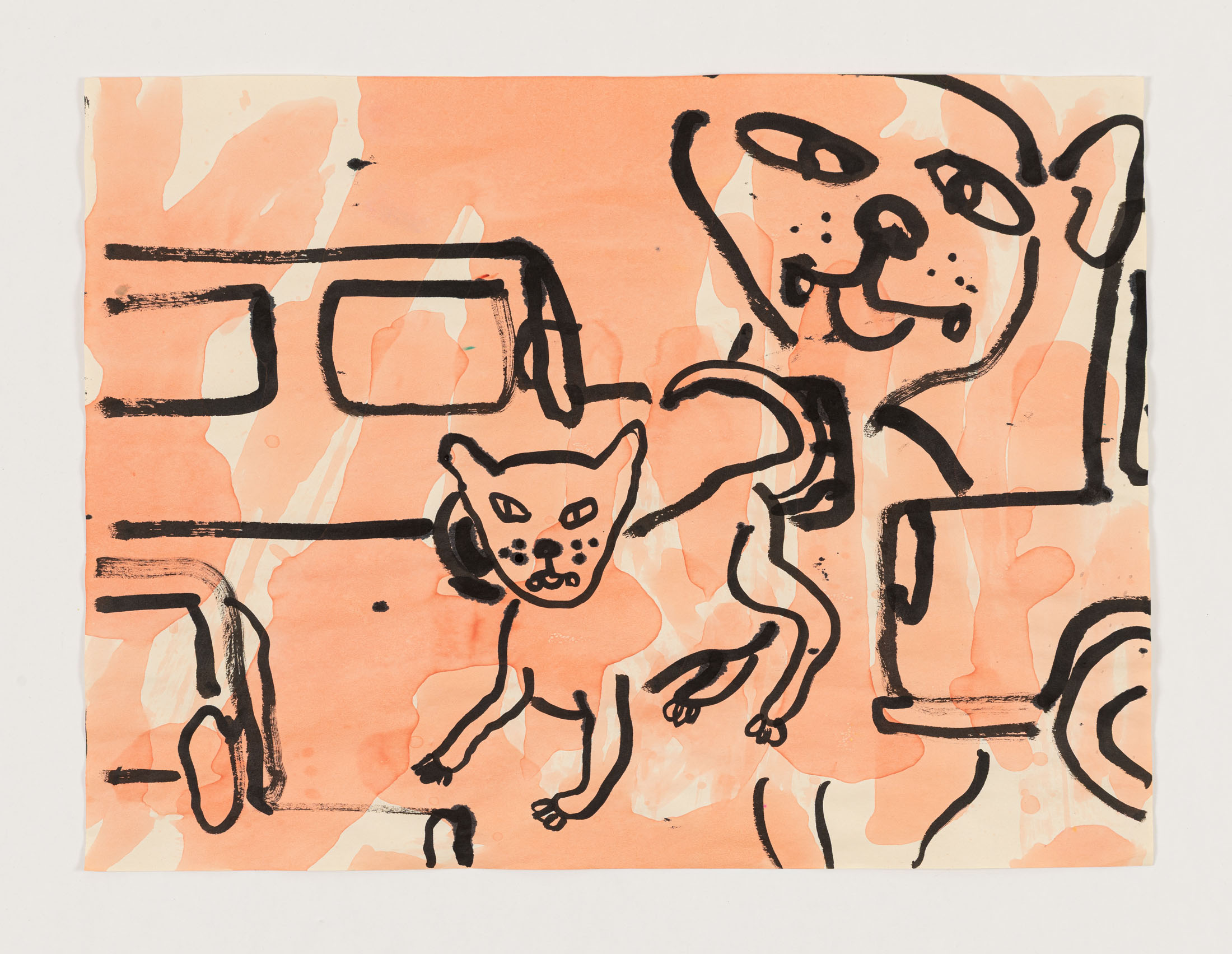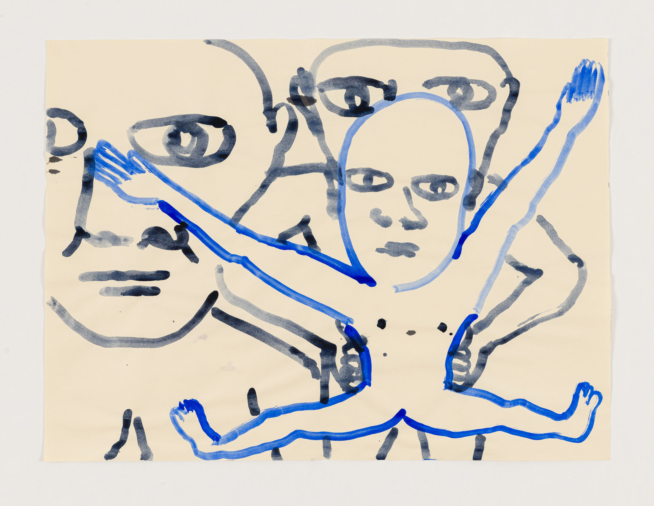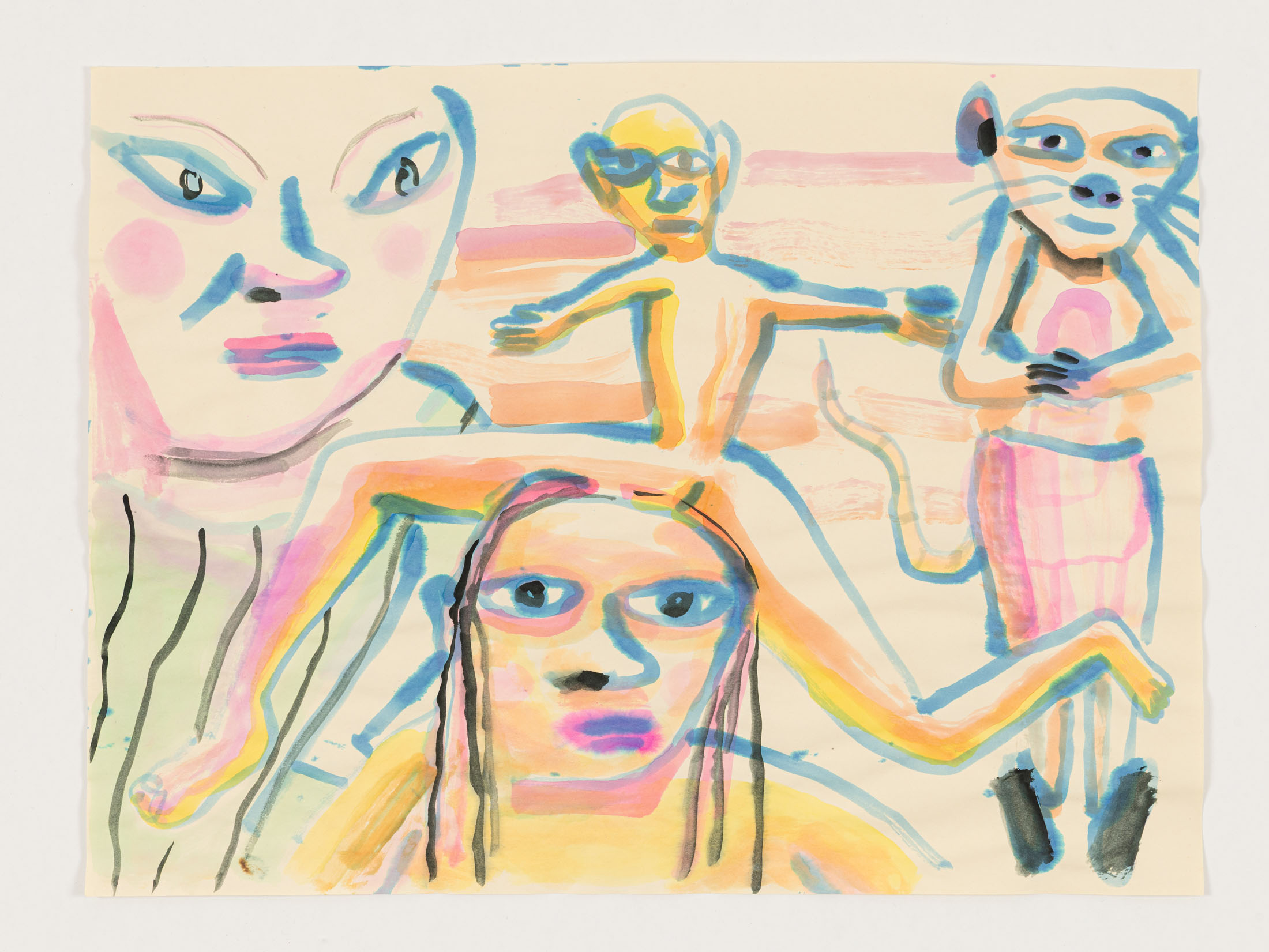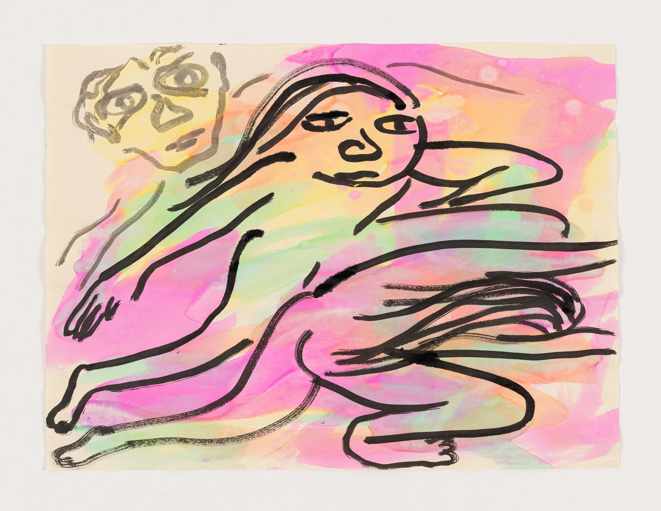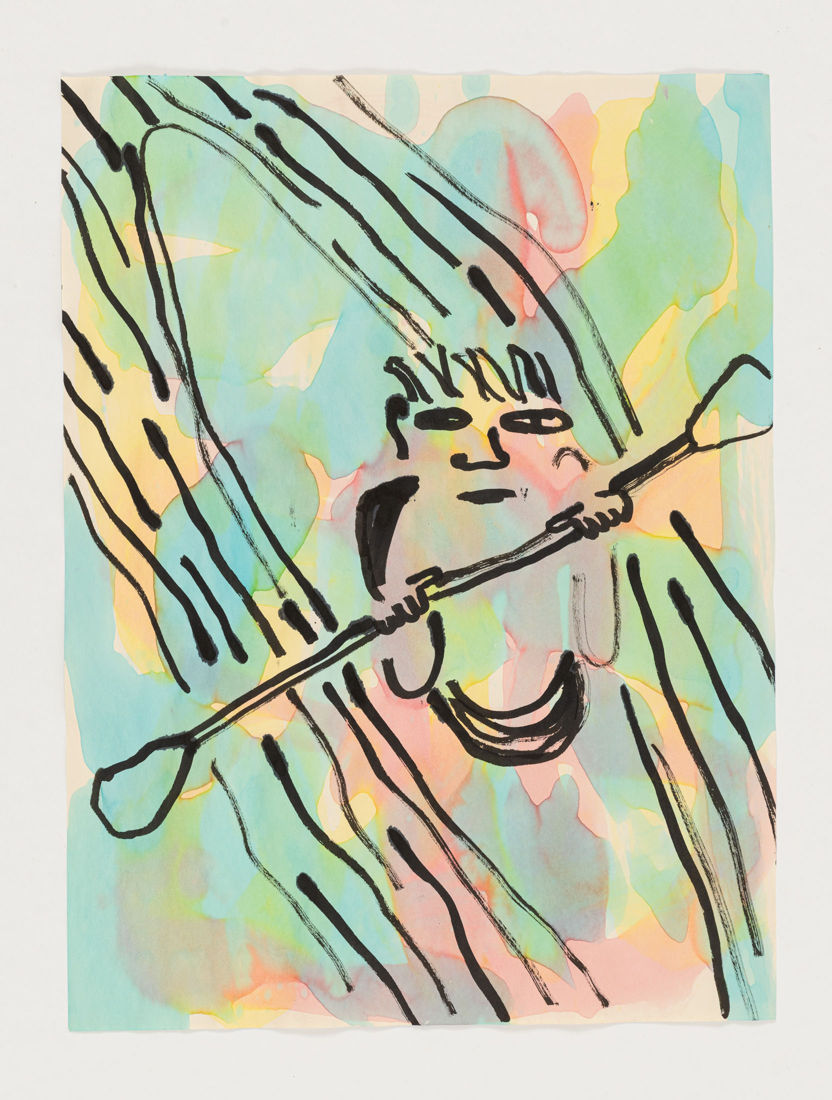 The foundation of Pugay’s exhibition, his second with the gallery, is a series of large-scale wall drawings referencing memories and myths of the artist’s upbringing both in the Philippines and the United States. Bold graphic lines fill the space with details of his former family home (bulldozed shortly after the family immigrated to the U.S.) and imagined temple-like structures that, in part, reflect the body and self as fragile or provisional architecture. Layered against this foundation is a dizzying array of drawings and collages that exist in a state of playful free association. Pugay populates his world with mutant archetypes and spiritual apparitions, shape-shifting dancers, anthropomorphized beings, and sentimental posers. These figures navigate disjointed realms drawn from historical, mythological, and religious imagery; the visual language of video games; viral social media narratives; and clickbait.