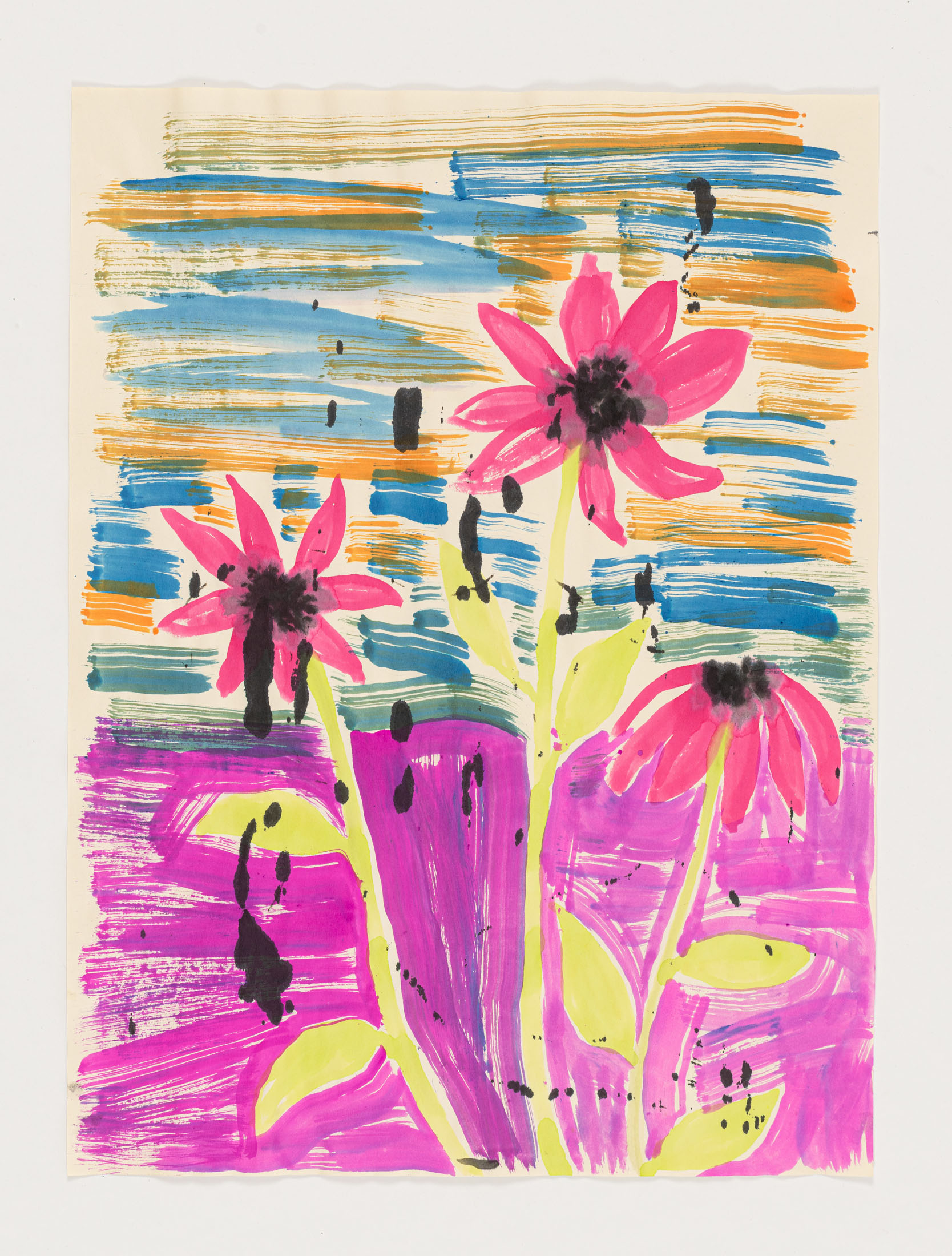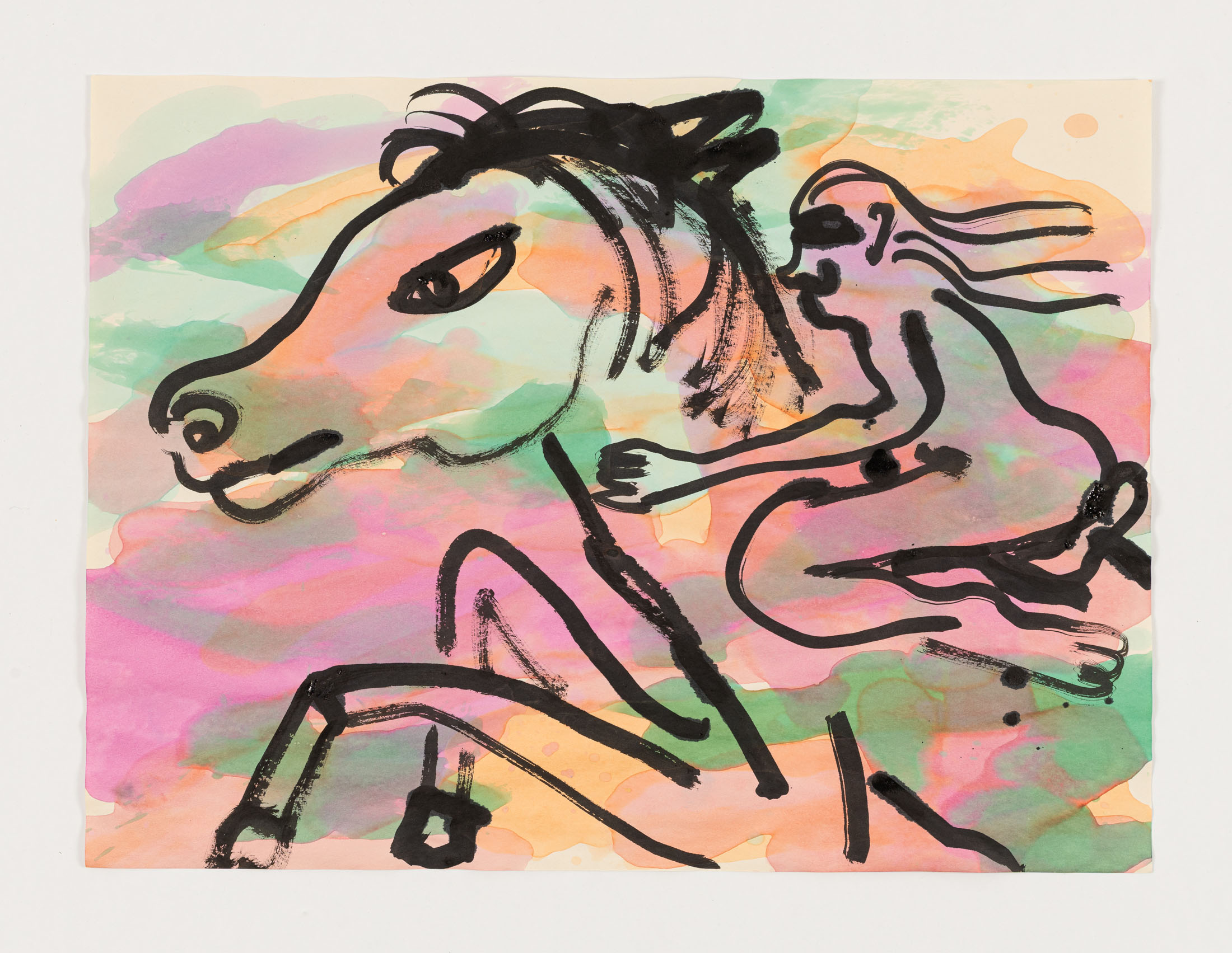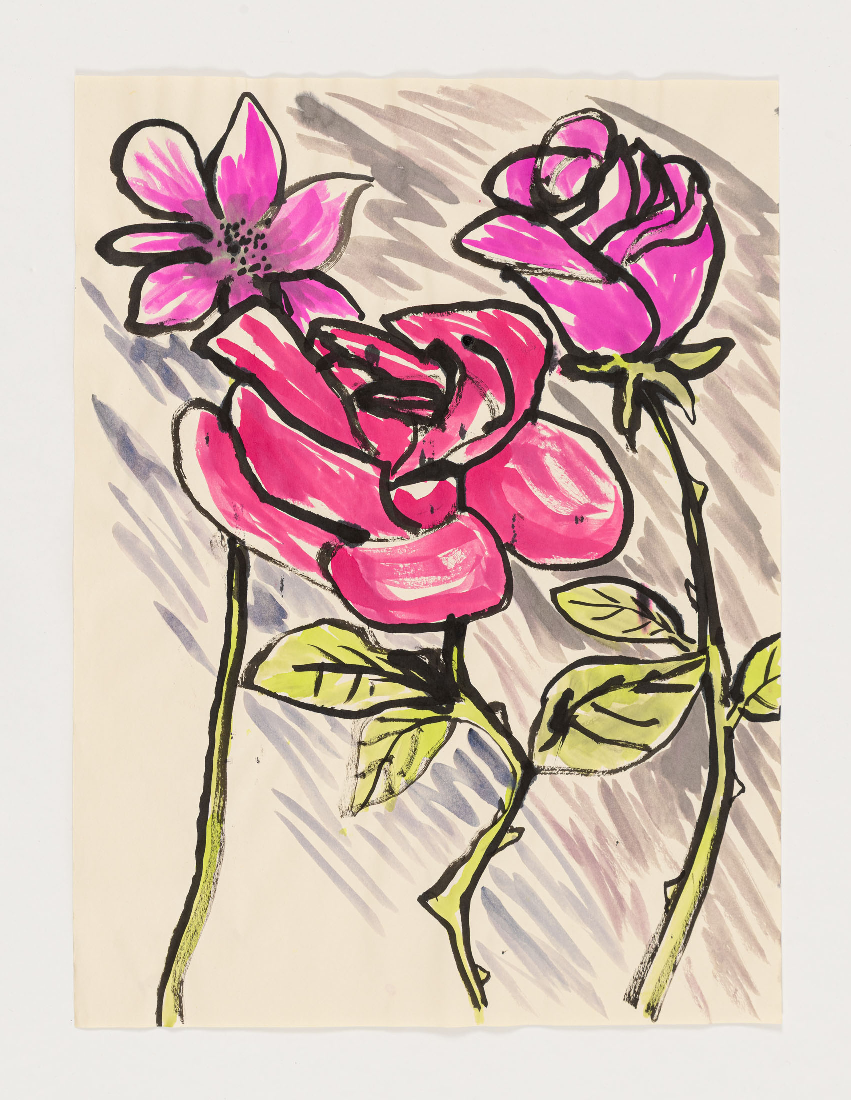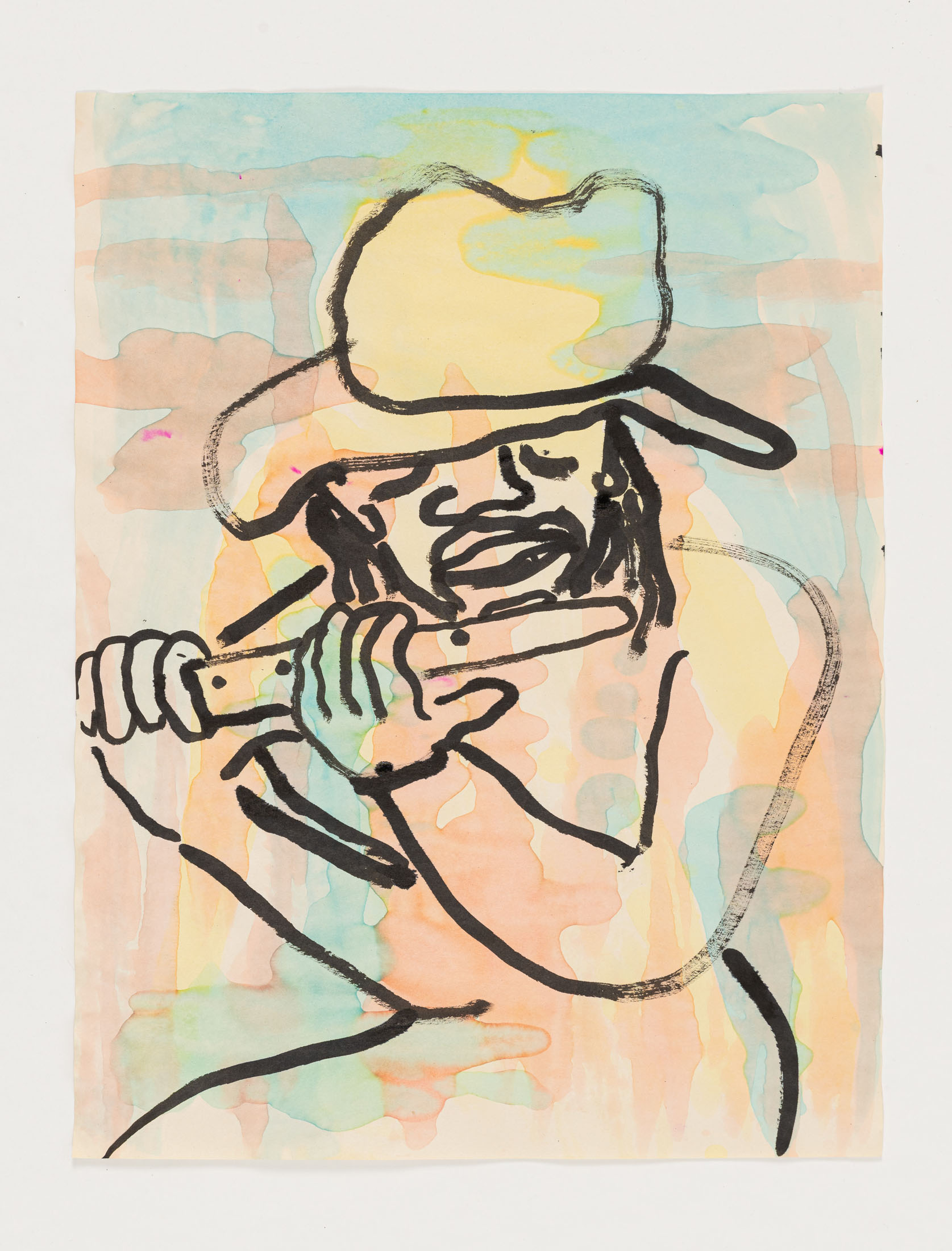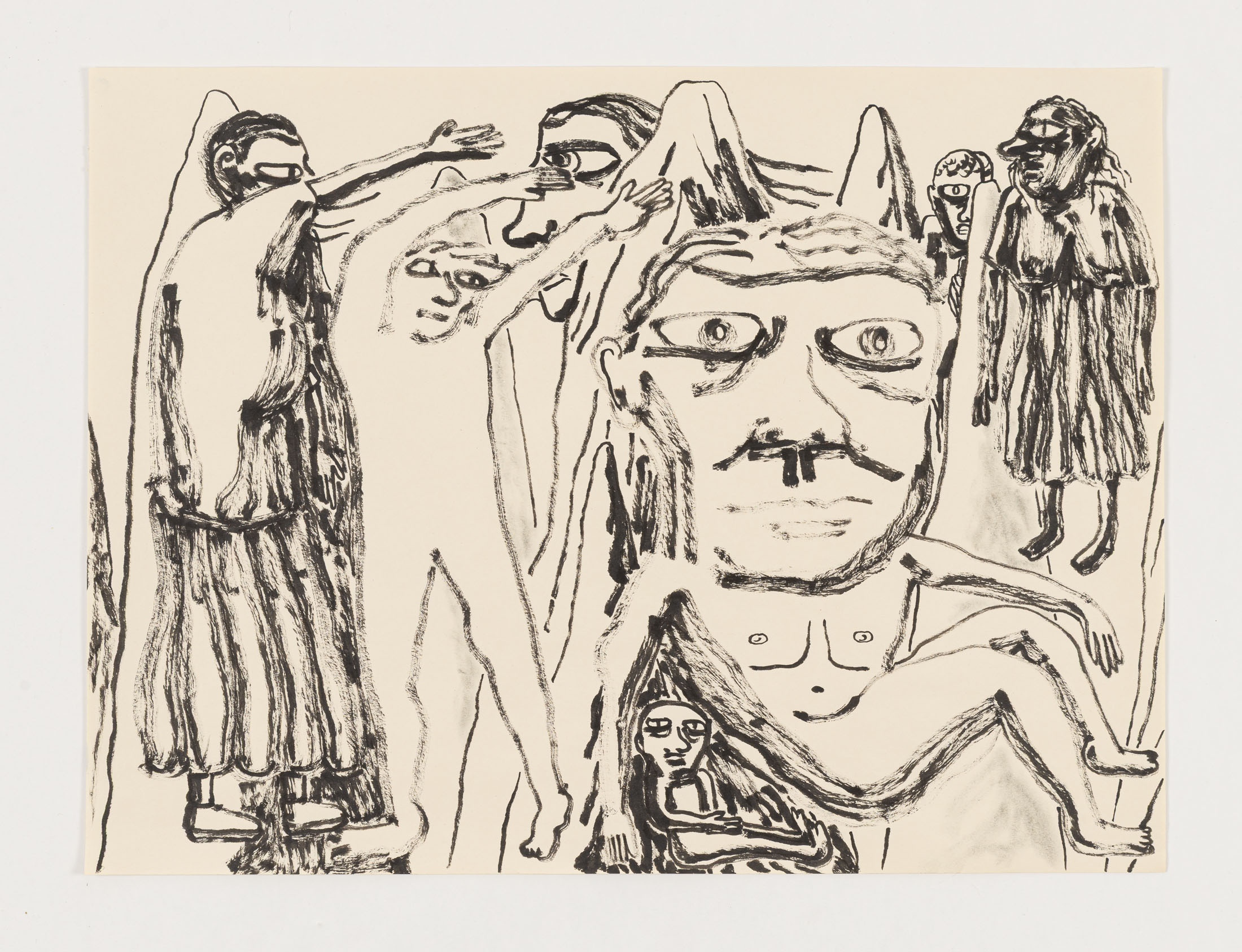 The foundation of Pugay’s exhibition, his second with the gallery, is a series of large-scale wall drawings referencing memories and myths of the artist’s upbringing both in the Philippines and the United States. Bold graphic lines fill the space with details of his former family home (bulldozed shortly after the family immigrated to the U.S.) and imagined temple-like structures that, in part, reflect the body and self as fragile or provisional architecture. Layered against this foundation is a dizzying array of drawings and collages that exist in a state of playful free association. Pugay populates his world with mutant archetypes and spiritual apparitions, shape-shifting dancers, anthropomorphized beings, and sentimental posers. These figures navigate disjointed realms drawn from historical, mythological, and religious imagery; the visual language of video games; viral social media narratives; and clickbait.