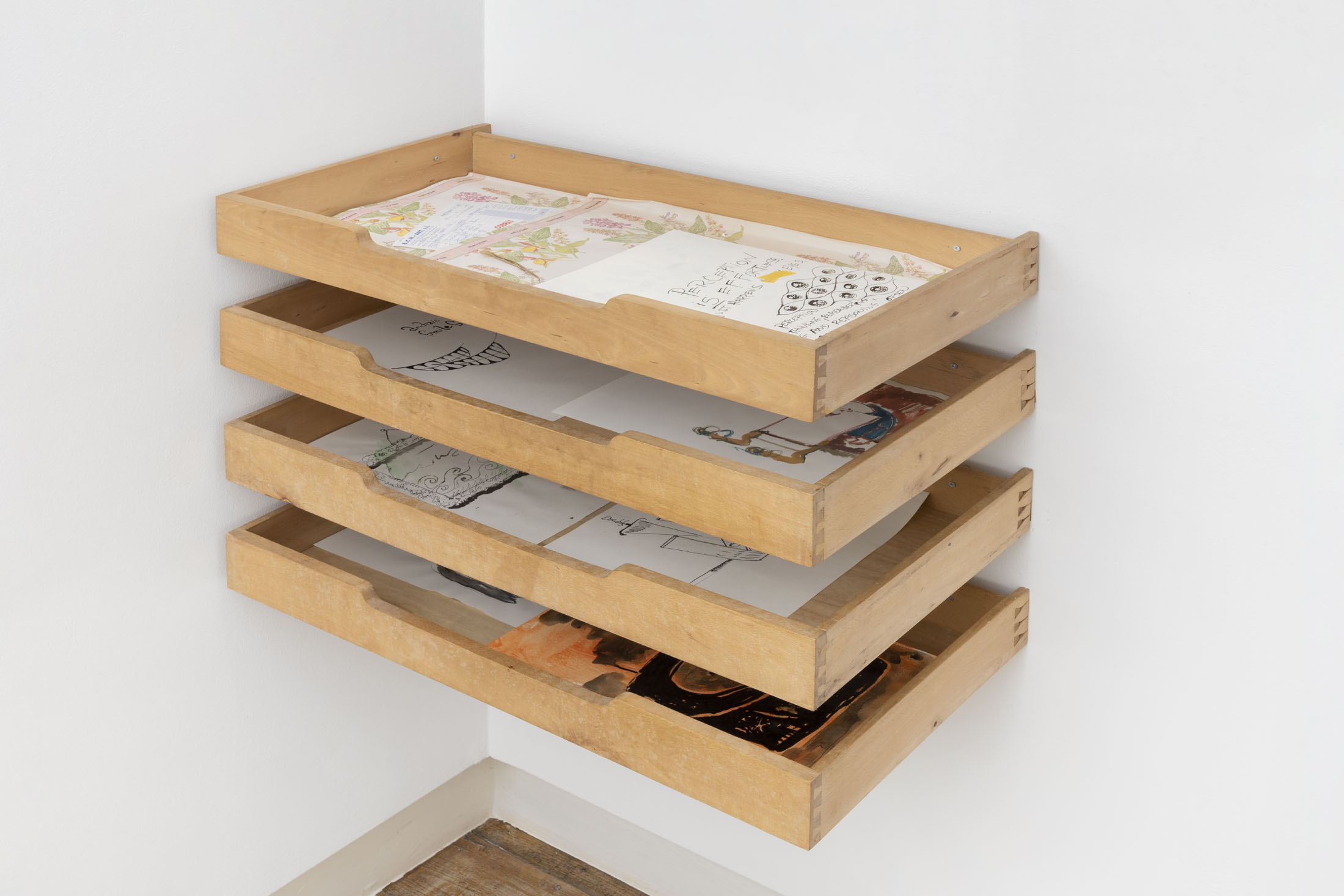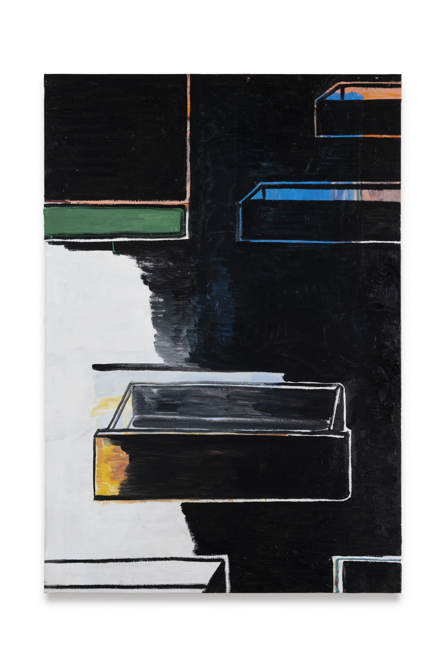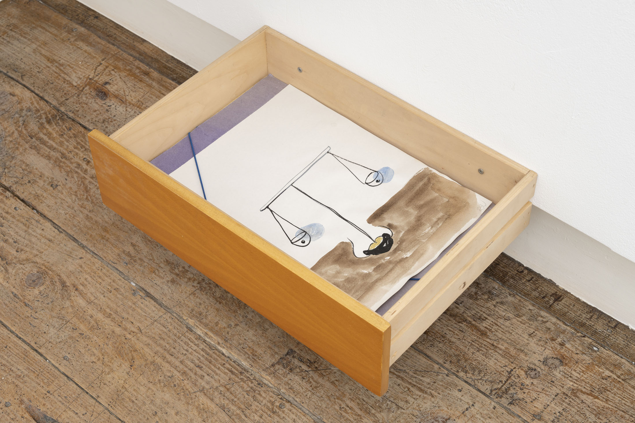 When I read through Rasmus’s own notes, I think of Simone Weil’s claim that attention, taken to its highest degree, is akin to a prayer. In my eyes, the artist’s attention seems to belong to that order. His paintings make room for doubt, for the slow sedimentation of perception. InArchive (2024), for instance, the artist recalls childhood attempts to categorise the world, building imaginary shelf-systems to store the day’s events. This archival impulse reappears across his work — drawers, grids, lists and linguistic tangles that mark the human need to systematise what resists organisation. But what happens when the shelves collapse, when memory overflows its categories? “Memory is almost full”, he writes underFeedback (2025) — a quiet, tragicomic phrase that could serve as the subtitle of our age. Yet the irony of painting in the digital century is not lost on him. His canvases act asanalogue servers of the self, in other words, sites of storage and overflow. They are painted, repainted — doubted into existence. Ultimately, paint itself becomes a metaphor for data and yet, unlike the screen, it remains unhurried — each stroke bears its own latency.