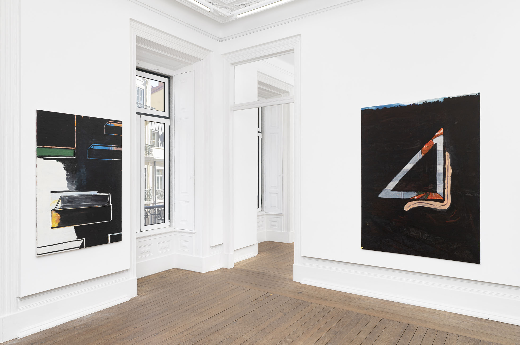 If orientation is how we inhabit space, then Nilausen paints the act of positioning as an ethical practice. His recurring motifs are devices for finding one’s place within discernment. They suggest that seeing is not passive but relational: we must keep adjusting our footing on the moving ground of the muddle. TakeLanguage Angle (2023–25): a carrot, a tongue, an angle — each an emblem of movement. The carrot as motivation, the tongue as both taste and speech, the angle as perspective. Together, they articulate how the act of seeing involves not just the eyes but the entire body — hungers, speech, moral position. In Rasmus’s words and worlds, perception is never neutral; the art of discernment bends, slips, misreads. You can see hesitation built into the surface. He writes fondly about misunderstanding — how angels and angles can so easily switch places — and that slippage feels central to his method. See Blind Angels (2024): to paint is to misread the world deliberately, with care.