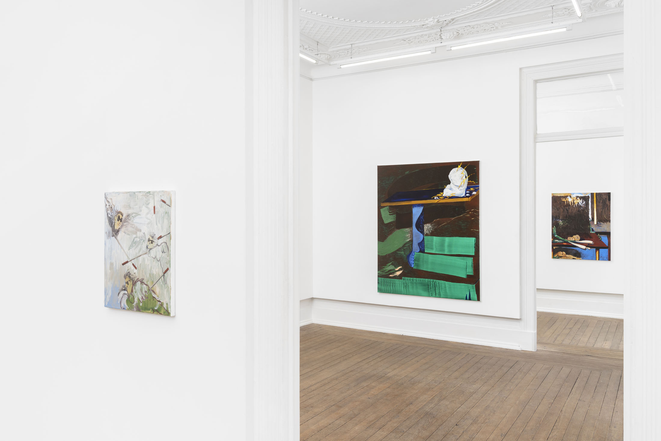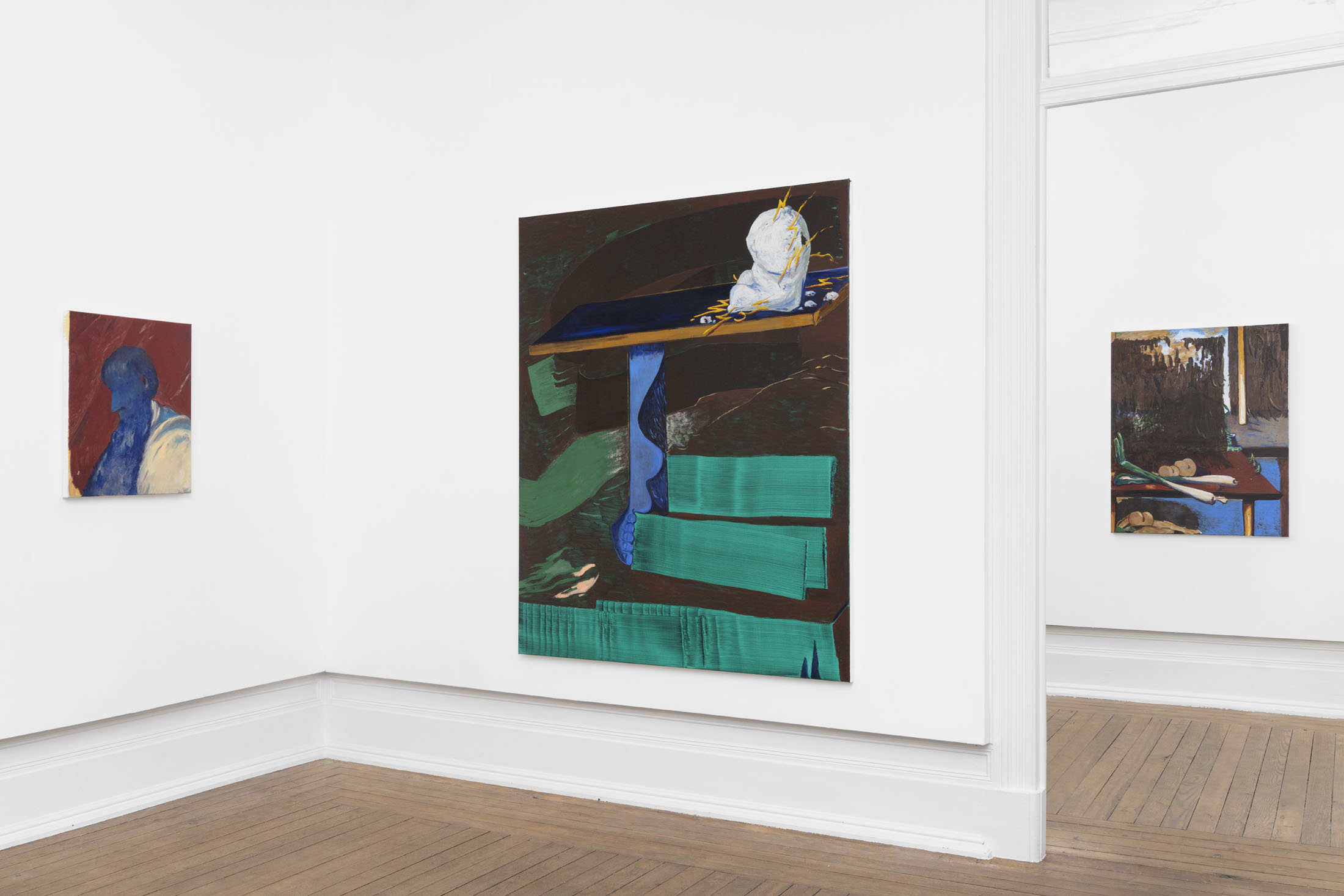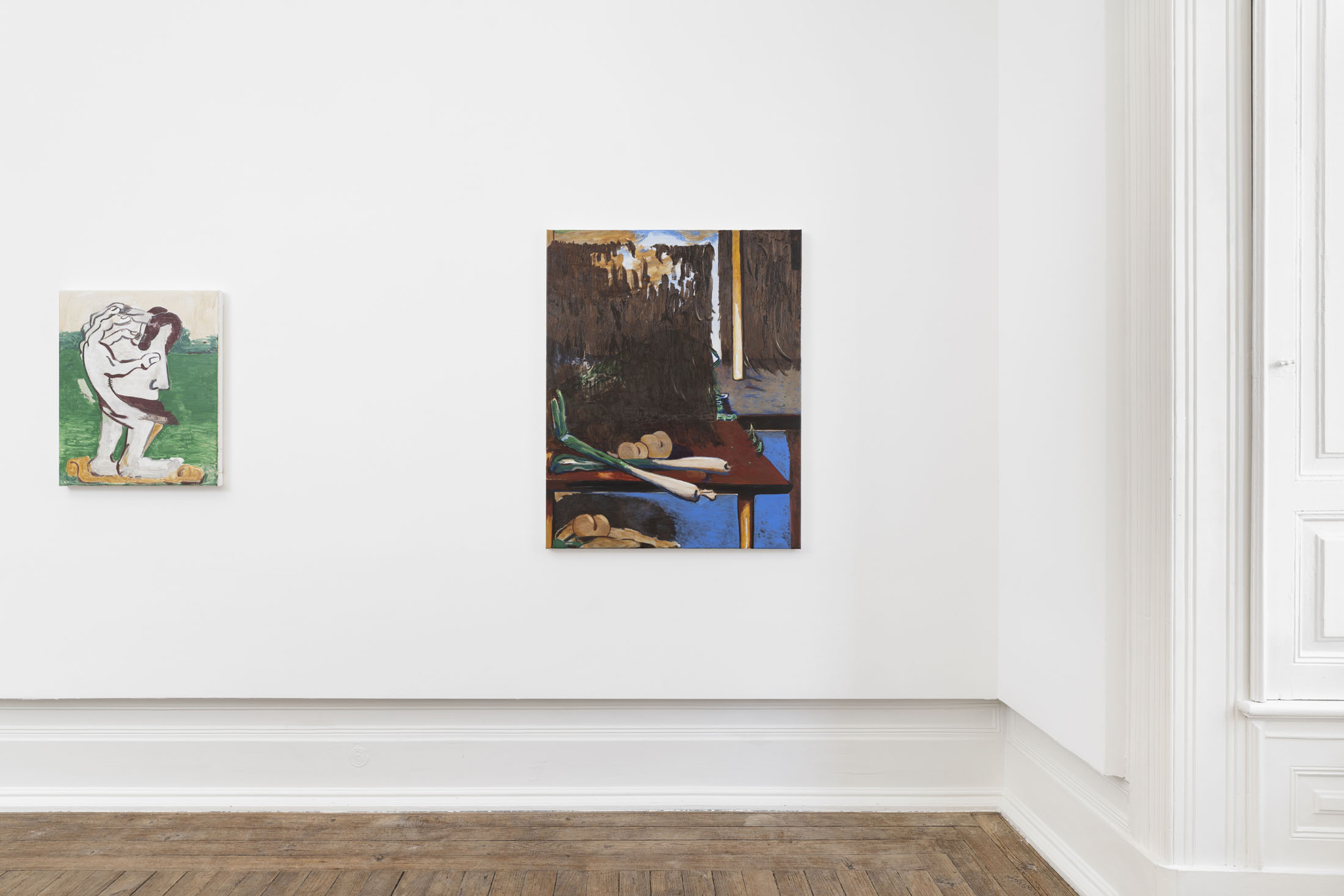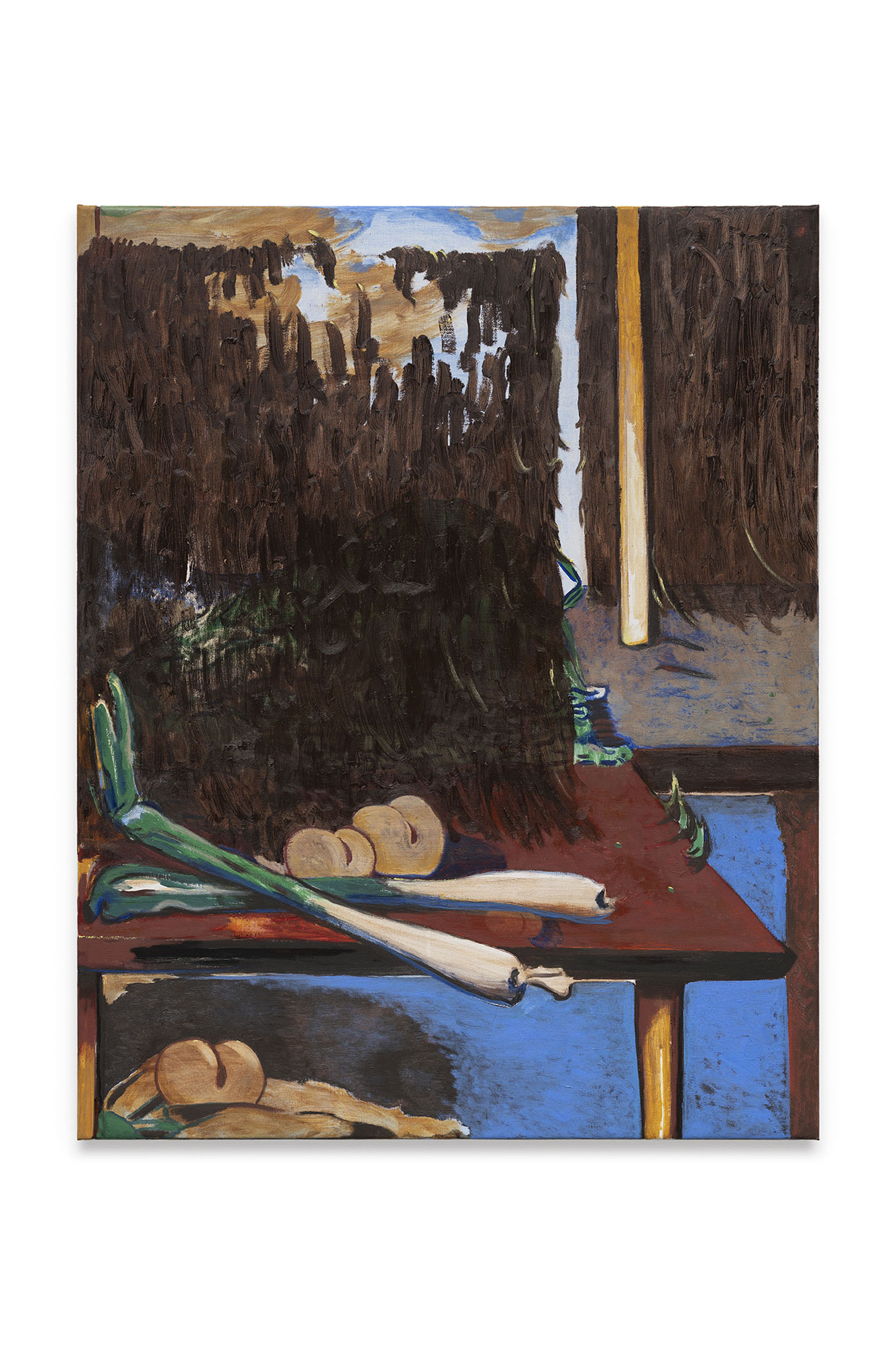 Even his recurring motifs are material studies in balance and instability. The painted table, sometimes overflowing with objects, sometimes empty, becomes the measure of what remains when language falters. These objects feel both ancient and provisional, suspended between usefulness and symbol, between hand and idea. In this way, theTable of Contentscan also be read as a study of surfaces — how they hold, reflect, and betray, as in Still Life with Leeks and Fringe (2025). Each painting is the residue of a conversation. The materiality of these works insists that thought is never abstract. Oil paint carries weight and thickness, resisting the clean transparency of digital seeing. In an era of immaterial images, Nilausen’s insistence on slowness — on drag, on the time it takes for a surface to dry — is radical. His paintings aretemporal machines, inviting us to embody the unhurried art of discernment.