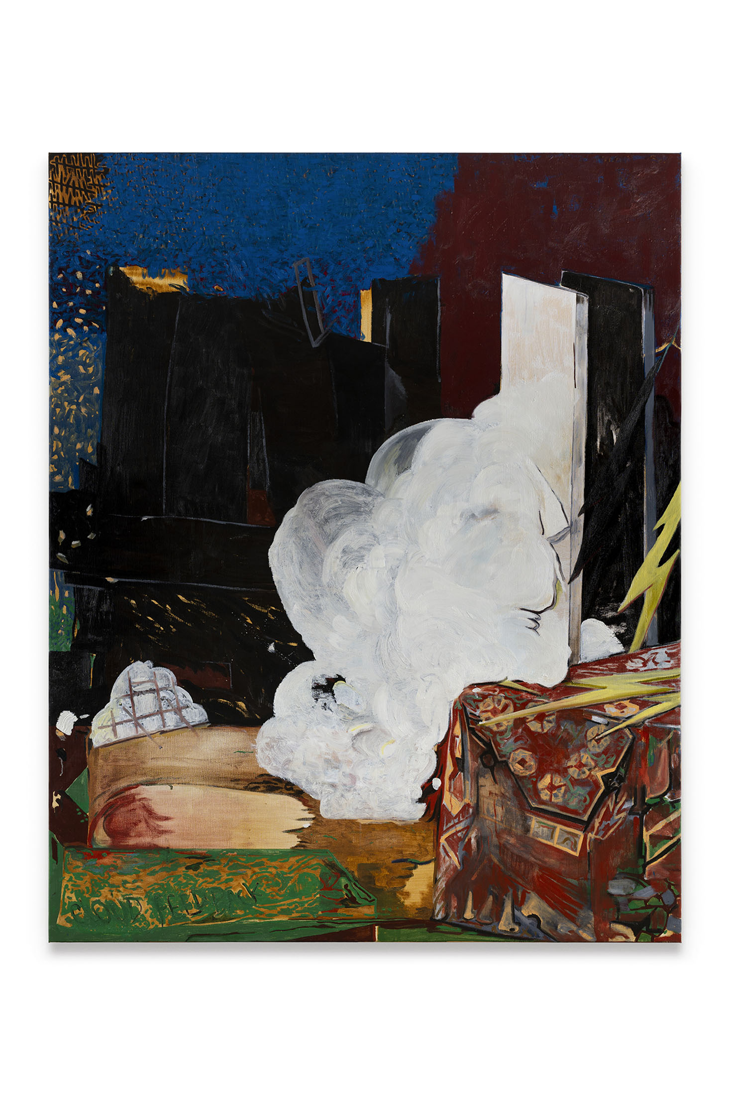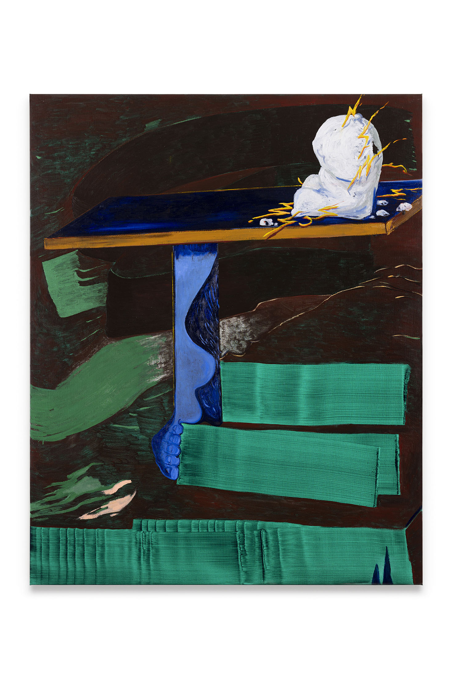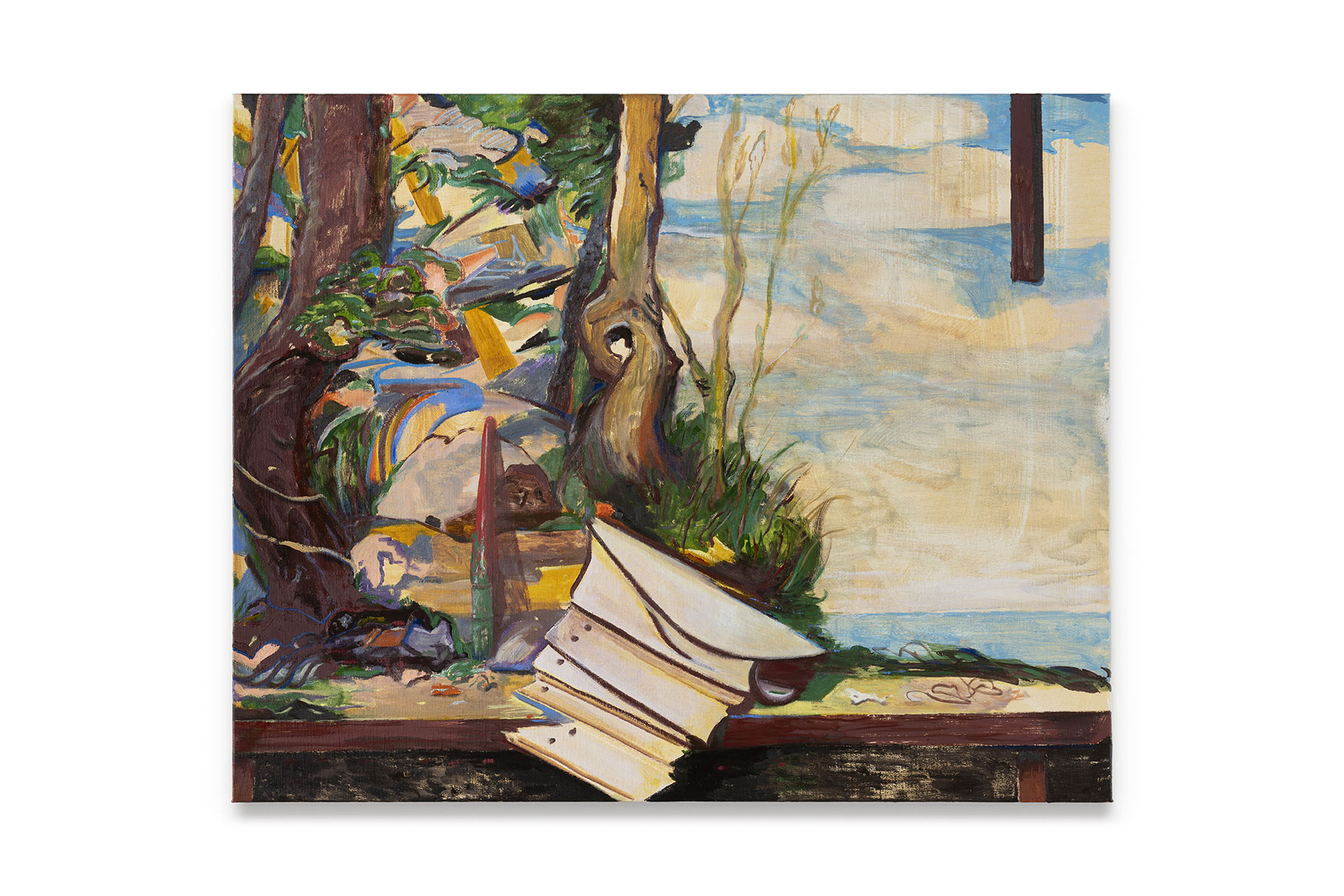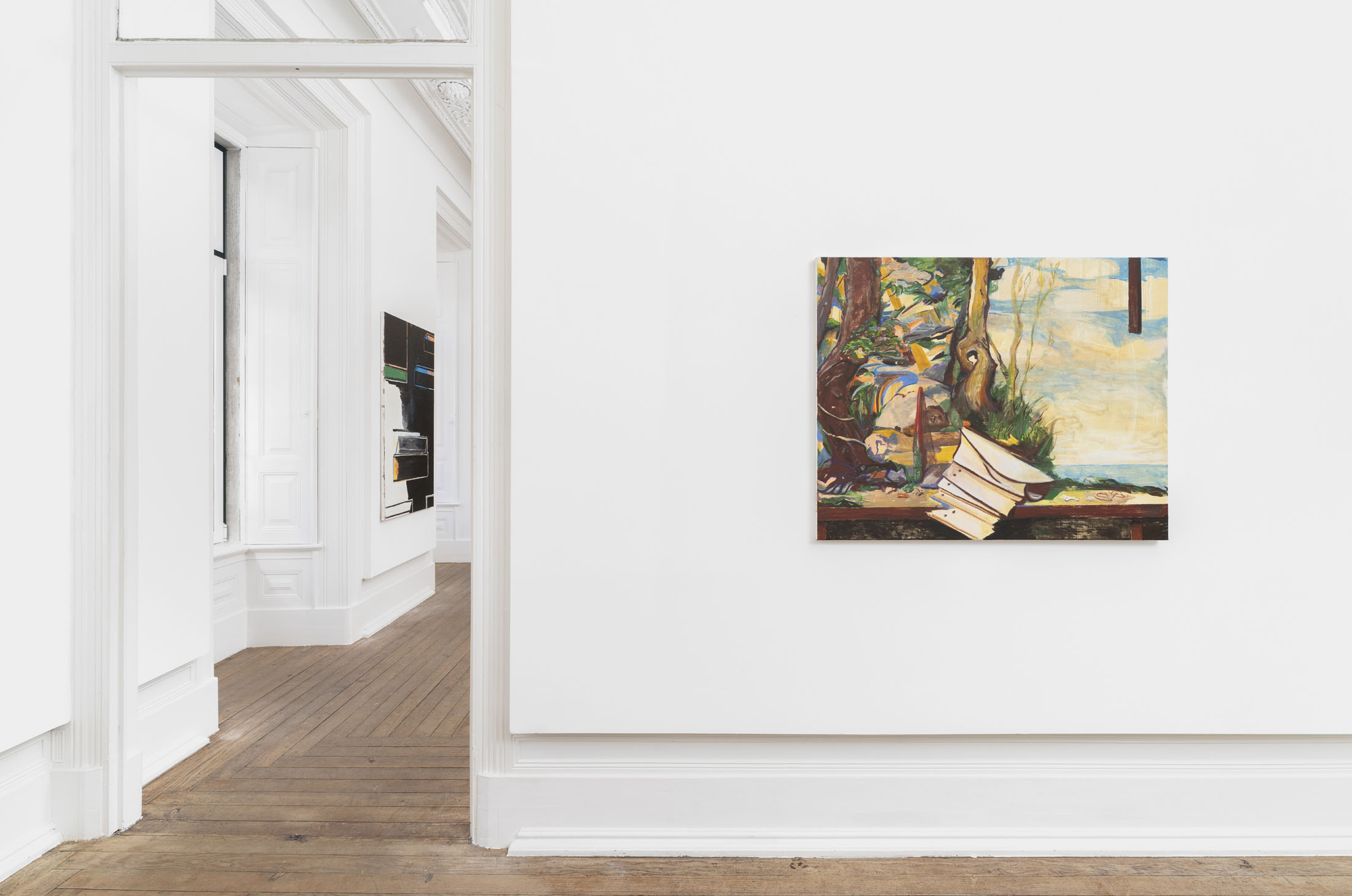 Even his recurring motifs are material studies in balance and instability. The painted table, sometimes overflowing with objects, sometimes empty, becomes the measure of what remains when language falters. These objects feel both ancient and provisional, suspended between usefulness and symbol, between hand and idea. In this way, theTable of Contentscan also be read as a study of surfaces — how they hold, reflect, and betray, as in Still Life with Leeks and Fringe (2025). Each painting is the residue of a conversation. The materiality of these works insists that thought is never abstract. Oil paint carries weight and thickness, resisting the clean transparency of digital seeing. In an era of immaterial images, Nilausen’s insistence on slowness — on drag, on the time it takes for a surface to dry — is radical. His paintings aretemporal machines, inviting us to embody the unhurried art of discernment.