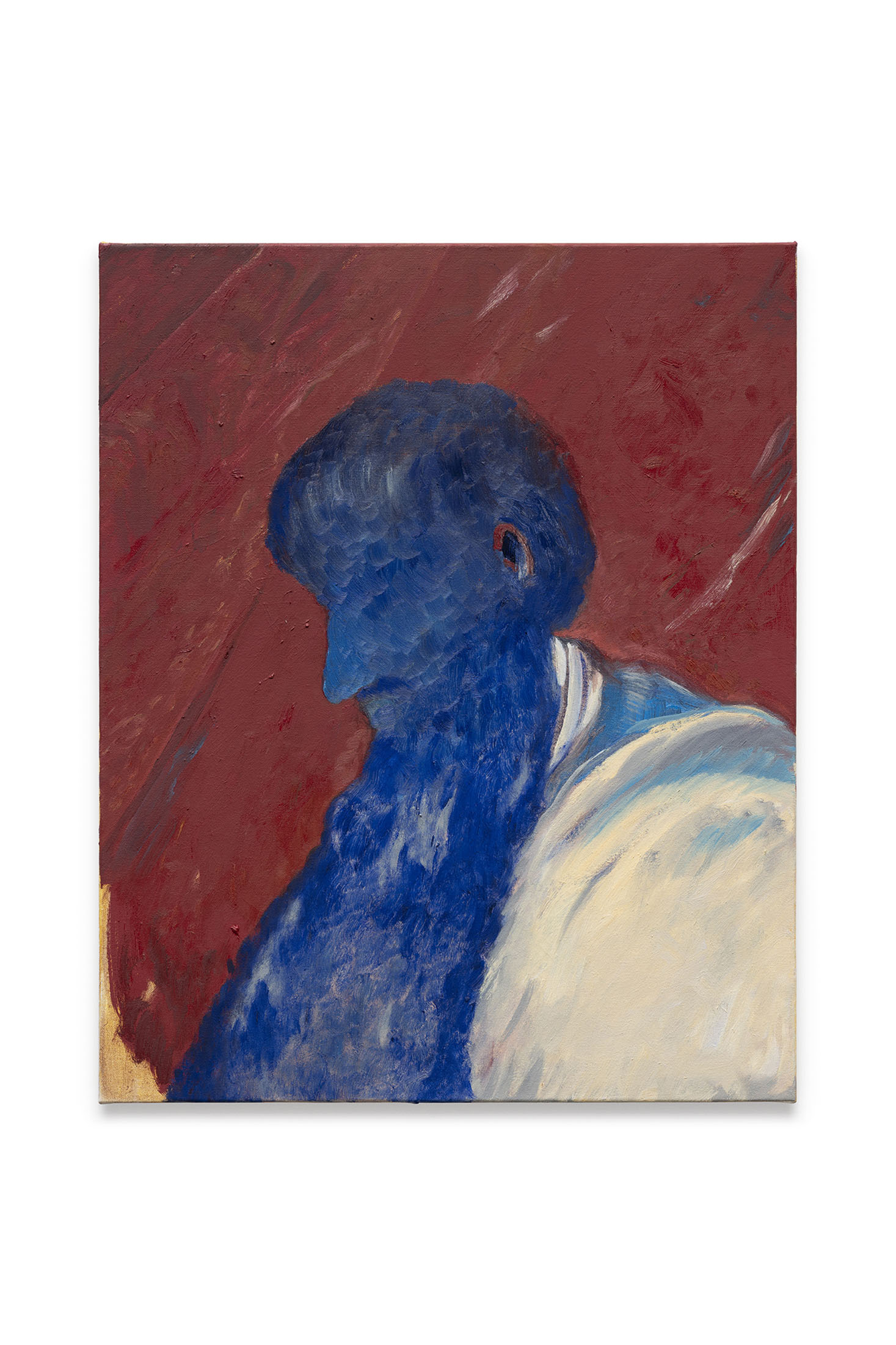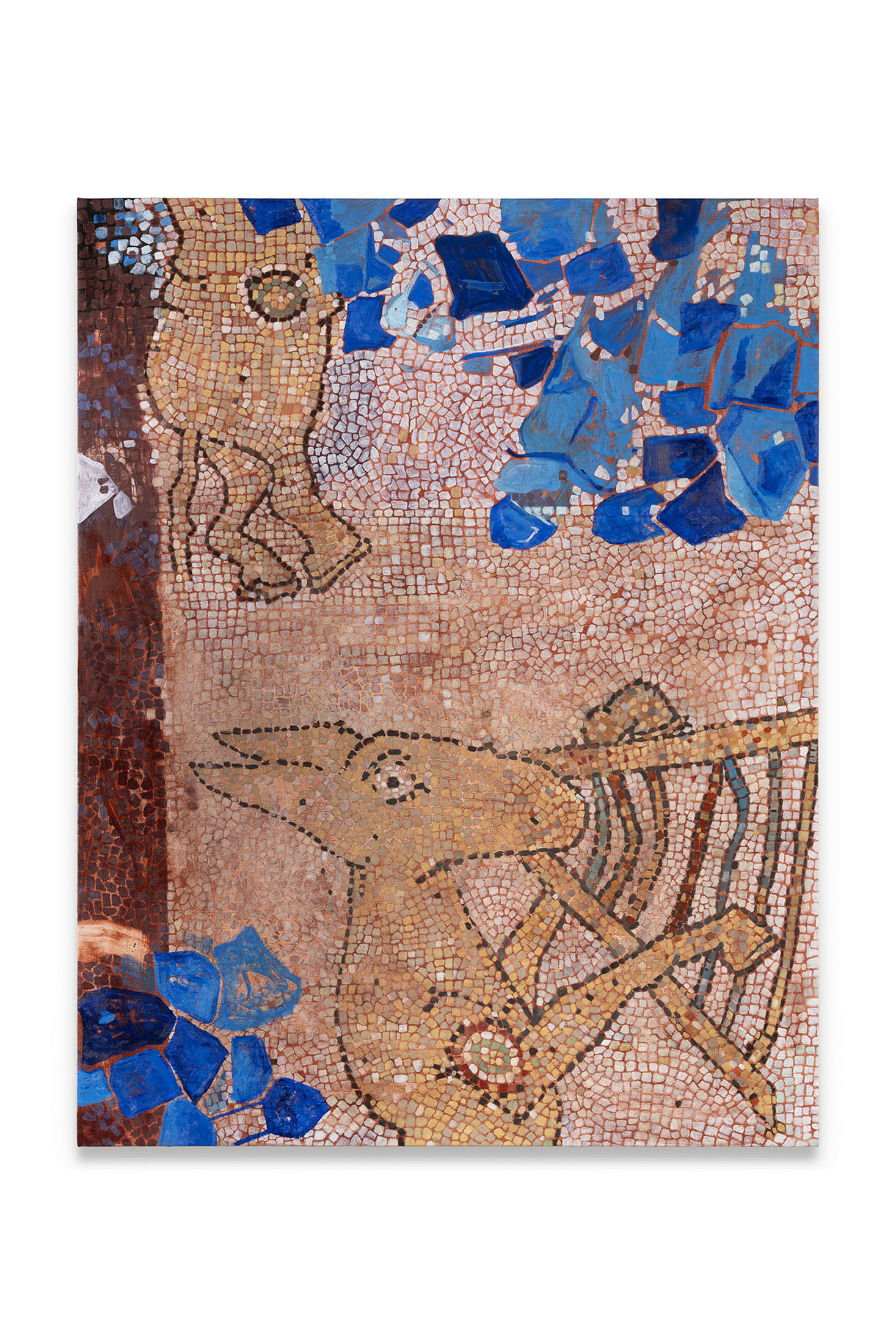 His palette, though quiet, seems to be full of intent. The blues, browns, and ochres are not nostalgic tones but thinking pigments. They feel drawn from the world of desks and shadows, of the everyday table rather than the transcendental sky. The blue recurs as both symbol and mood: once divine, now digital, another form of storage — the “cloud” inFeedbackthat holds too much memory.