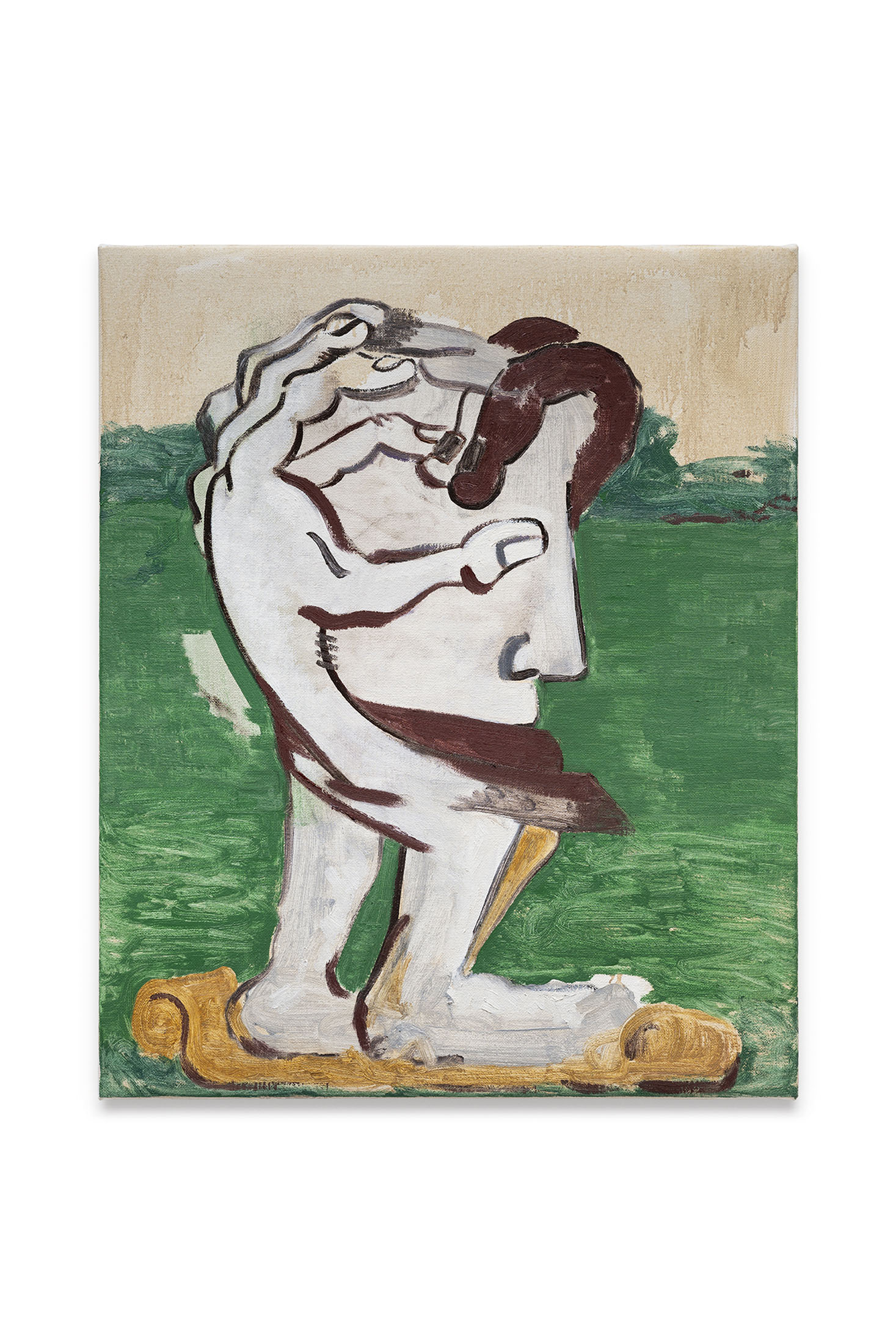 And yet, his paintings are not ascetic. They are full of movement, humour and a kind of metaphysical slapstick. InAsinus ad Lyram (2025), the artist borrows from a medieval mosaic — a donkey playing the lyre — to meditate on stupidity and spectacle. “What’s so attractive about flamboyant stupidity?” he asks. The question could perhaps describe our collective addiction to noise, to outrage, to the aective economies of modern life. But in his hands, the donkey also becomes a figure of humility — the fool who keeps playing despite knowing the tune is absurd. There’s compassion in that gesture. In this light,Self Madeii and iii (2025) read less as irony than as endurance: the act of shaping a self from uncertainty. They remind us that identity, like painting, isa work of continual editing. Each revision is both loss and renewal. If this exhibition is a “table of contents,” the very table itself becomes a site of ethical negotiation — a place where conversation and nourishment converge, stepping outside morality and the politics of representation alike. It is also where fragments are gathered, where the painter-as-editor decides what to keep and what to let go.