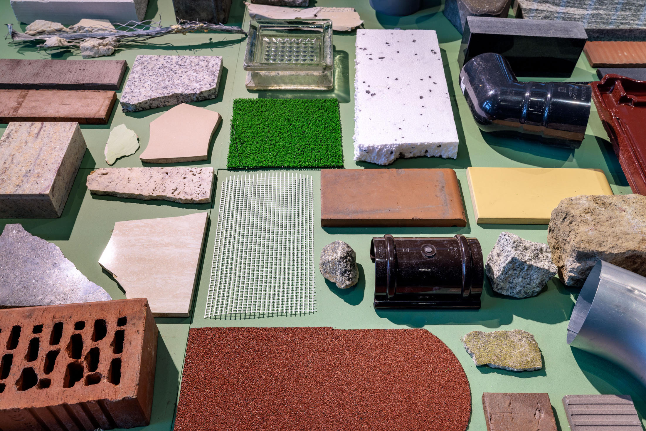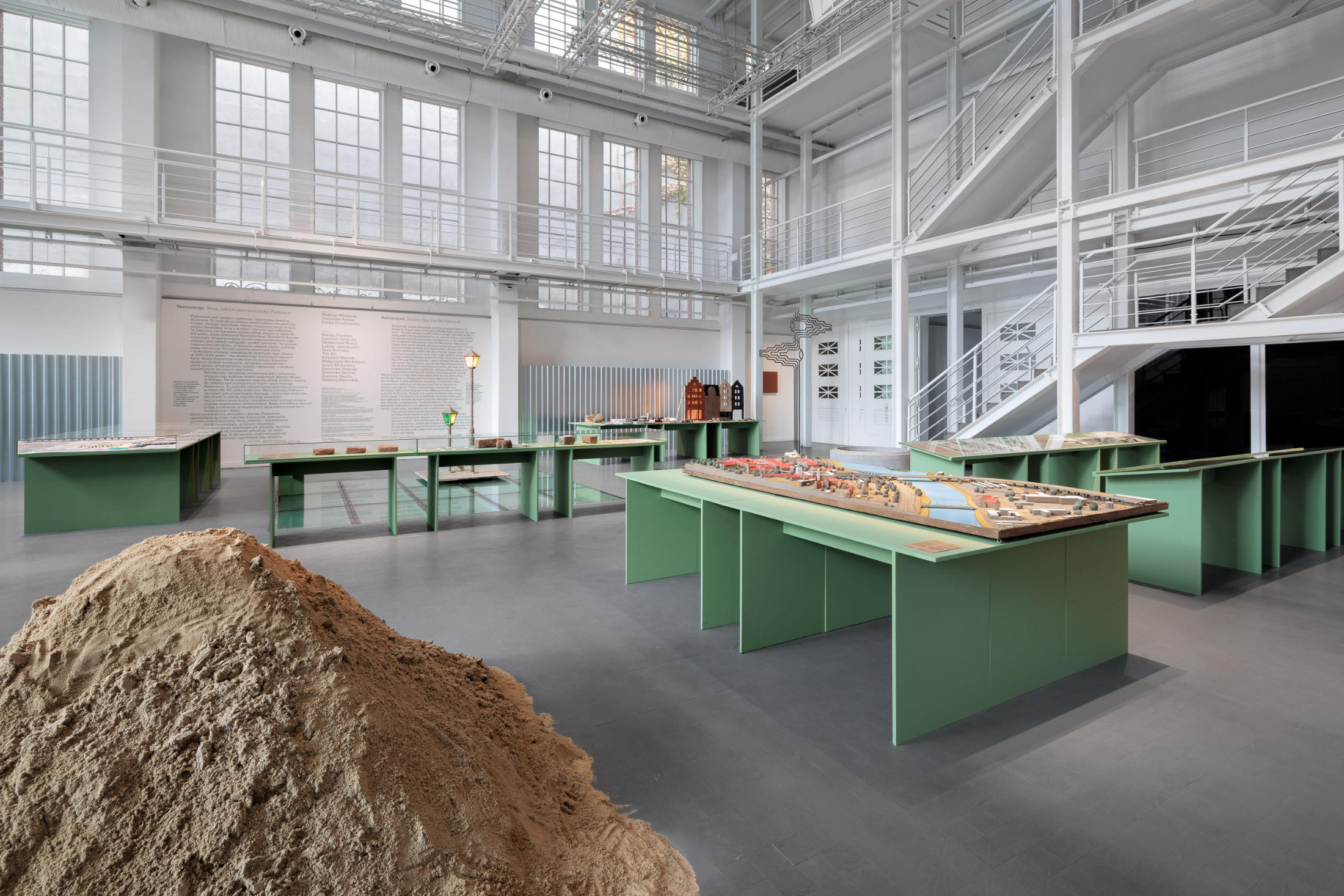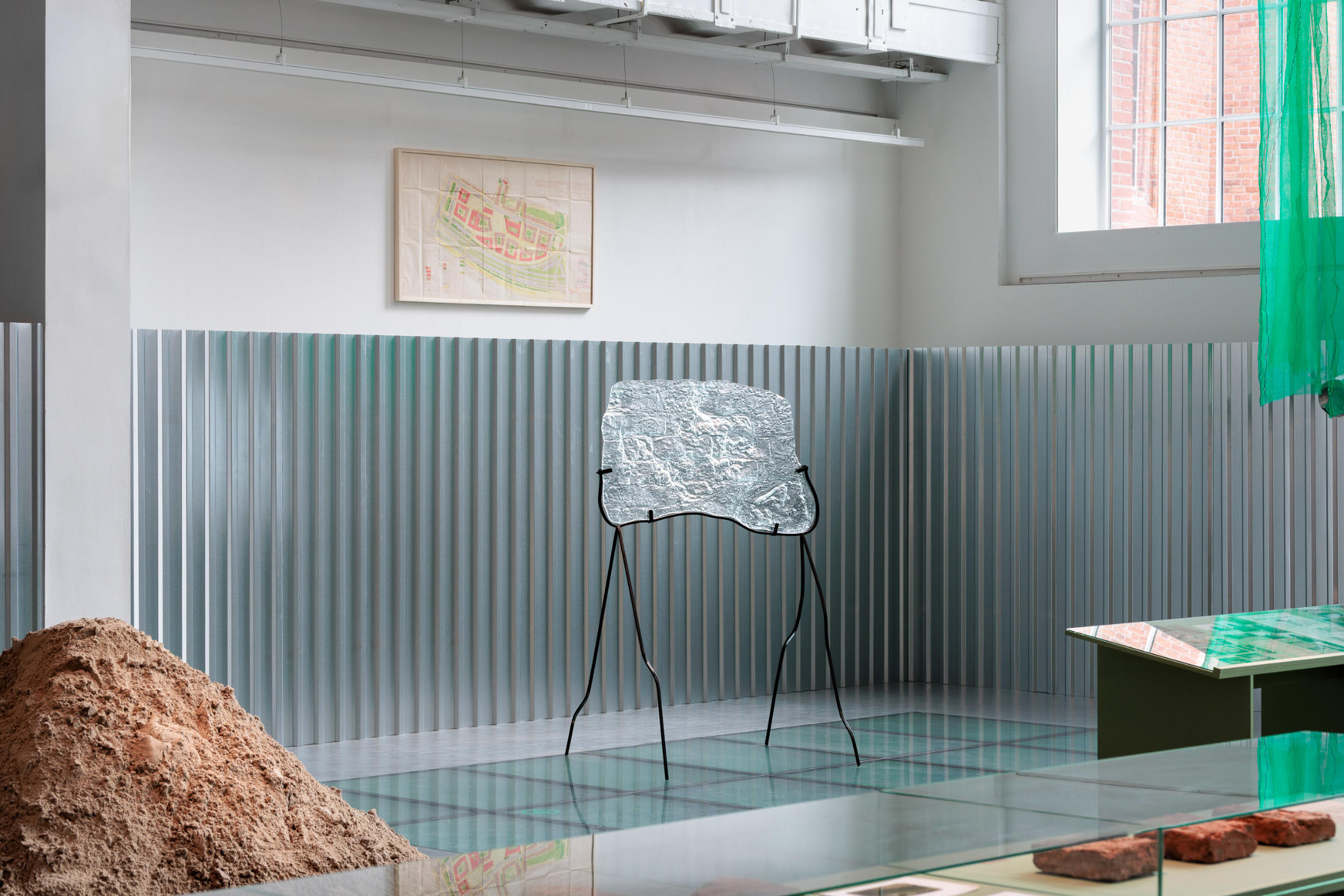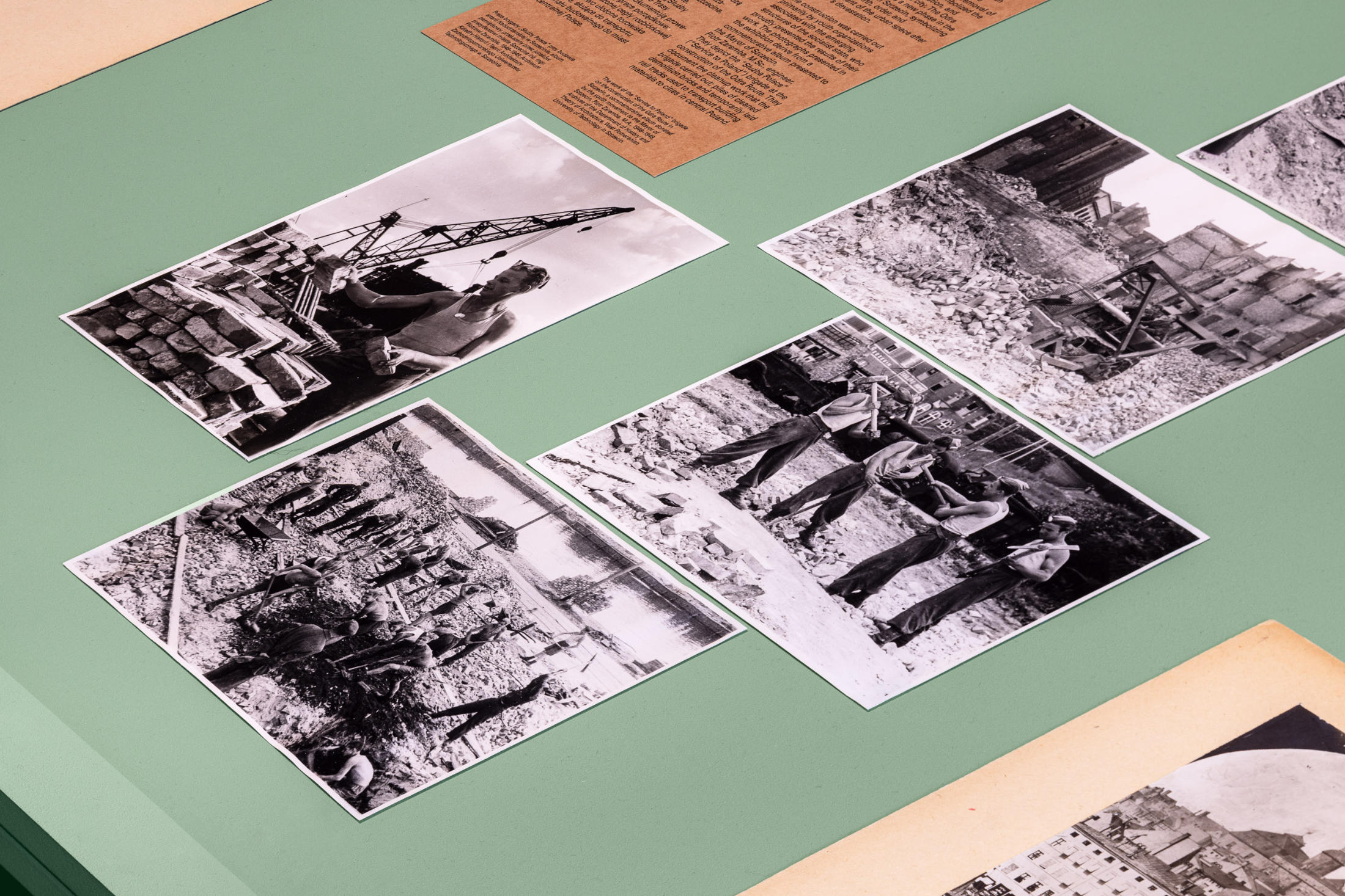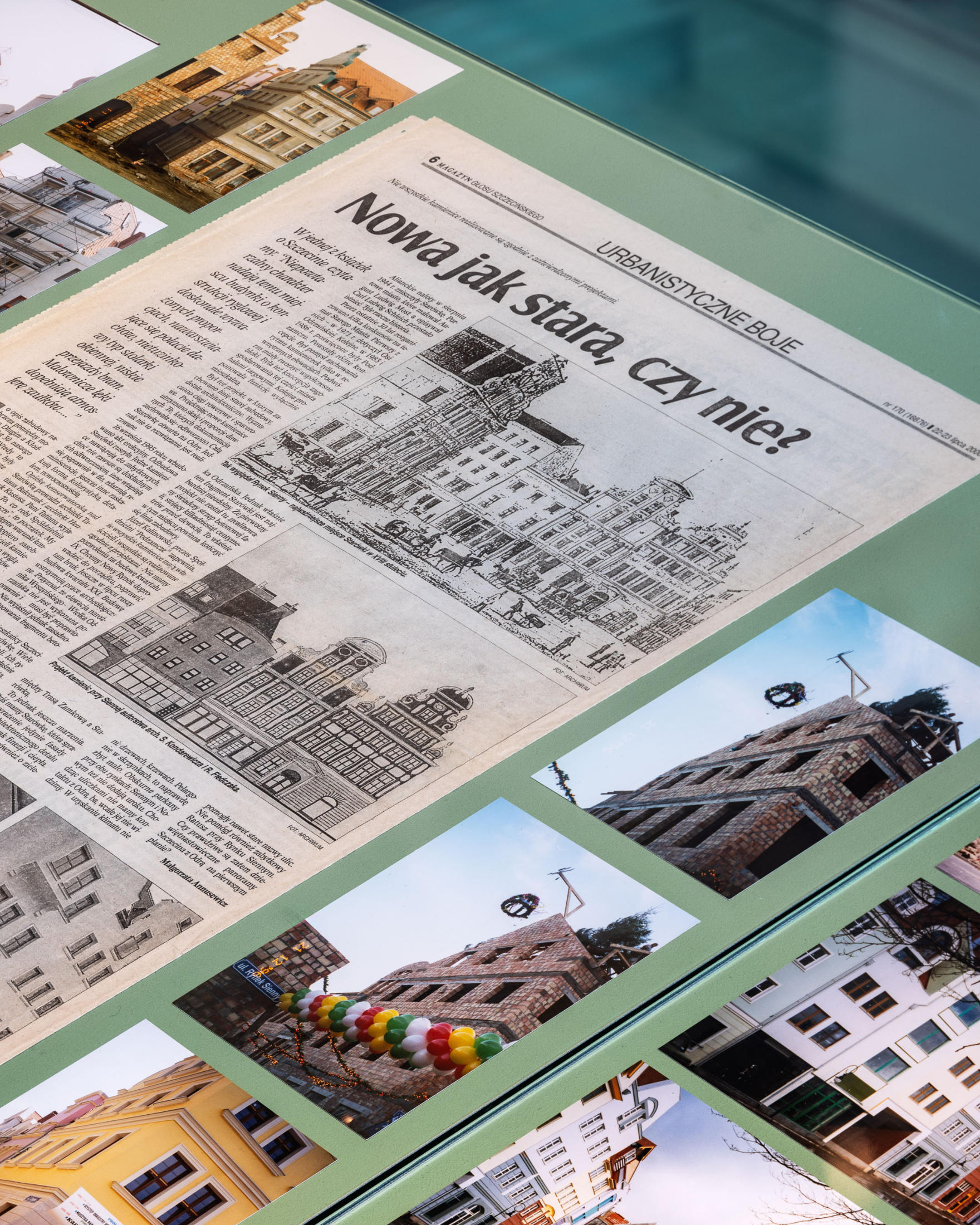 The exhibition space was designed by Zuza Golińska in collaboration with Trin Alt. The artists organize the space as a construction site – referencing archival photographs and the contemporary landscape of Podzamcze, they engage the viewer in the process of recreating the atmosphere of the former town. The space is built from trapezoidal sheet metal, a typical material used to fence off construction sites. The sheet metal frames the exhibition and directs the gaze inward – toward the ways in which old architecture is recreated and reinterpreted. The second material, green MDF, resistant to moisture and usually hidden within walls, is used here to construct slanted display tables reminiscent of drafting furniture. Their arrangement evokes the structure of the streets and squares of Podzamcze, creating a spatial rhythm and organizing the viewer’s movement. In this way, Golińska and Alt create an exhibition environment that is not a neutral backdrop but actively emphasizes the process and fragmentary nature of reconstruction.