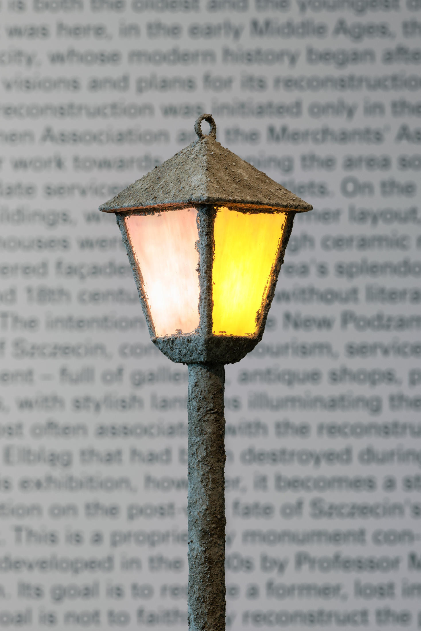 Dominika Olszowy, in her installation A Lamp with a Soul, transforms a piece of urban infrastructure into a vessel of memory. Olszowy covered the lamp with a thin layer of dust, as if pulling it from its basement foundations and trying to save it from oblivion, while simultaneously dousing it with concrete from a nearby construction site. This renovation costume tells a story about layers of history and urban reconstruction.