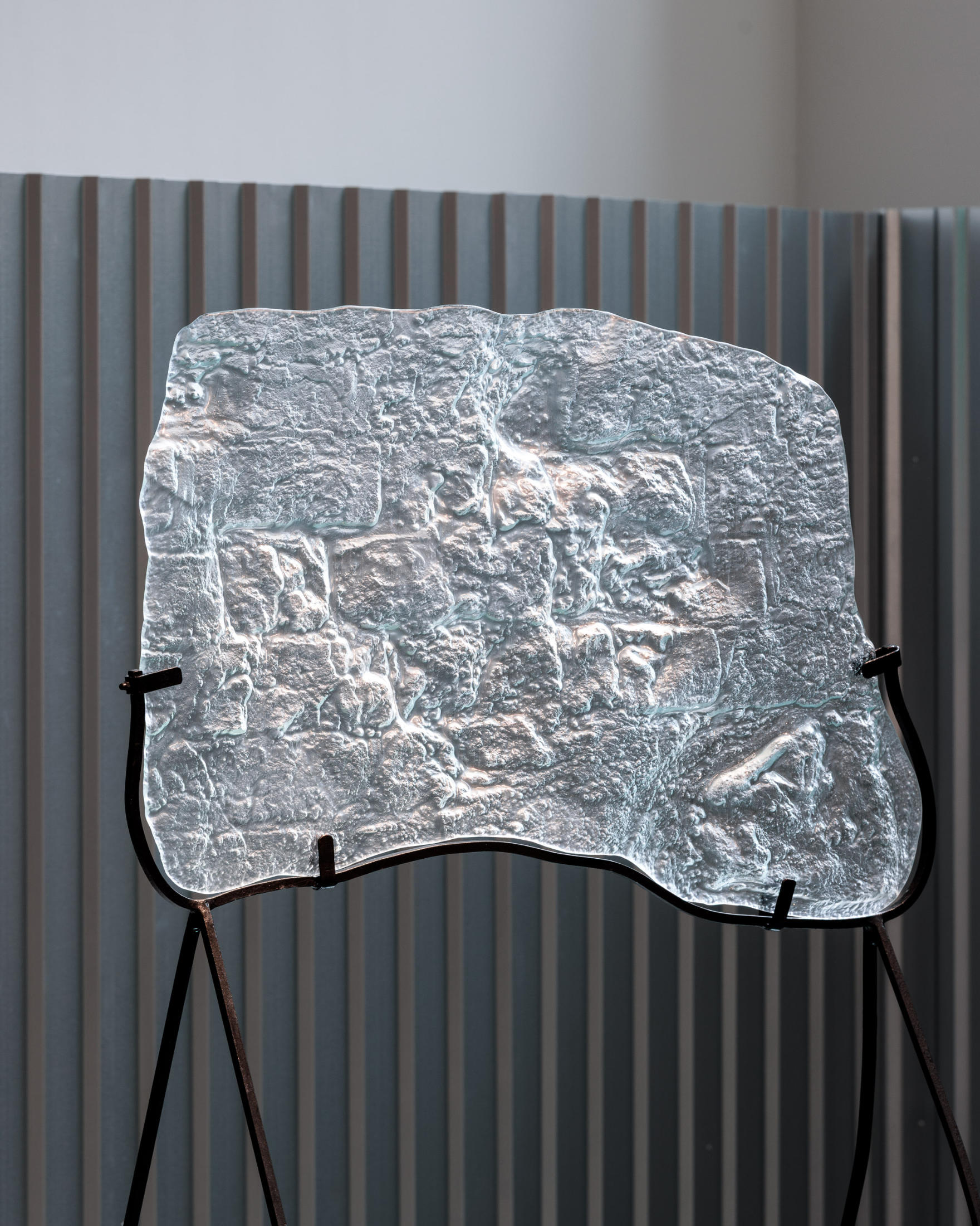 Gizela Mickiewicz, in her sculpture A Place with a View of Time, uses a silicone impression taken from a fragment of a historic wall, later cast in glass. The final form – much like the tenement houses of Podzamcze – derives from a real fragment but is not its literal reproduction. The glass cast does not reconstruct the past but evokes it as a trace, a spectral shell. It reveals a process of reconstruction based on conventional principles and a partially free interpretation of the preserved traces of the past.