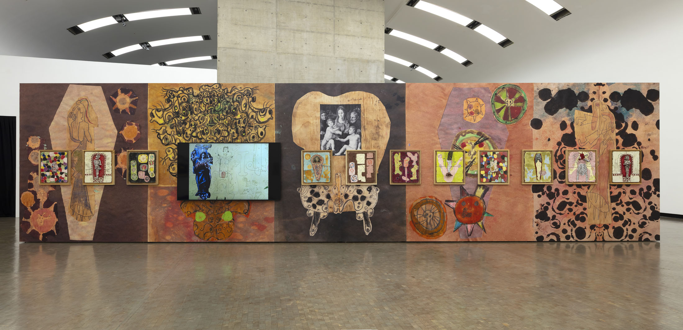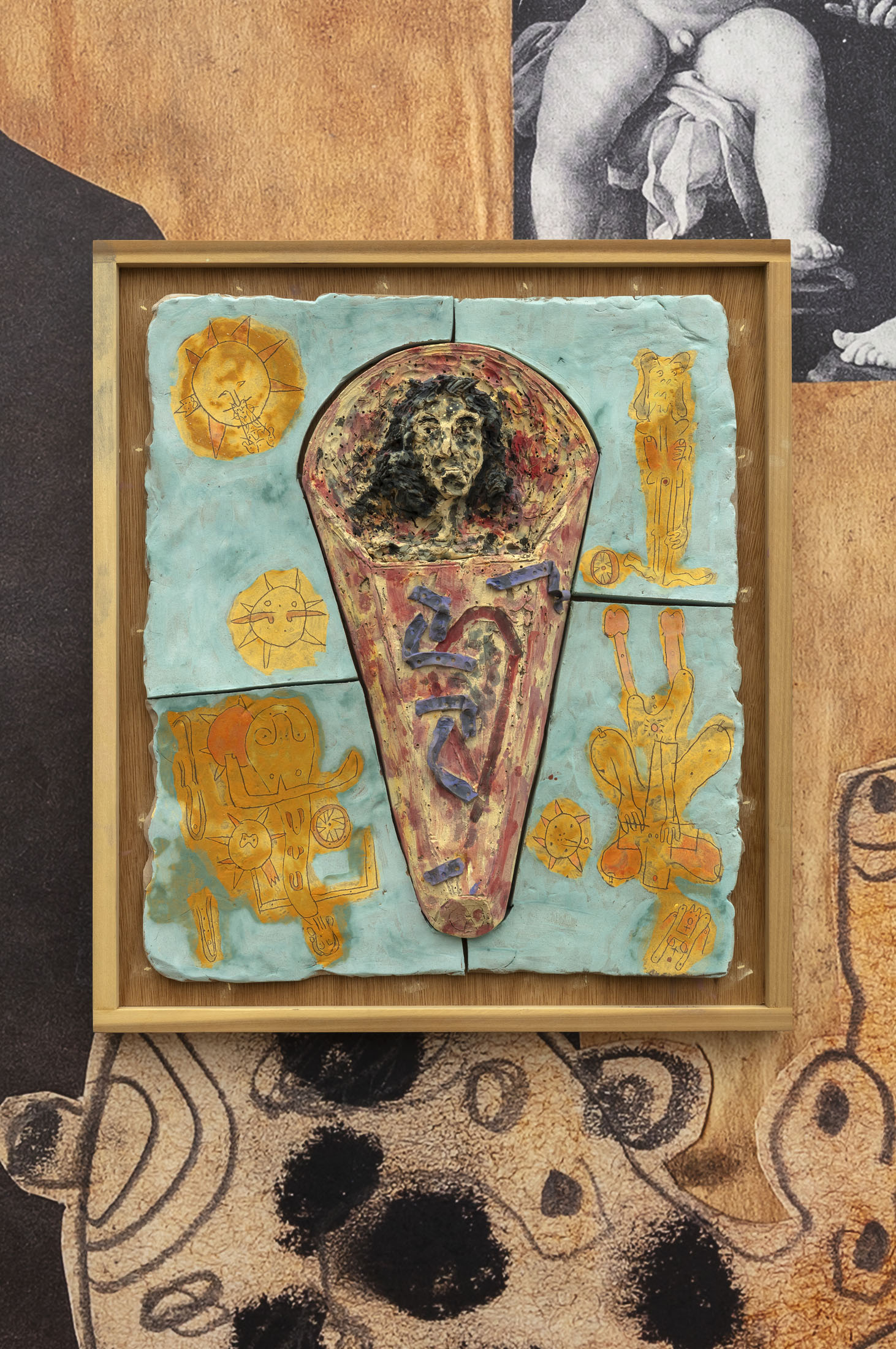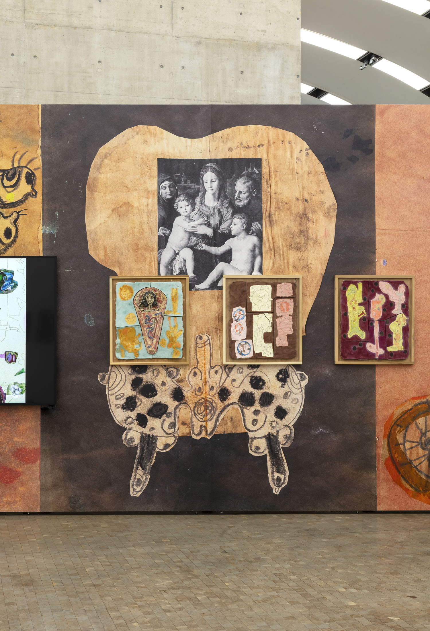 The exhibition manifests distinct lines of obsessive enquiry that has encompassed subjects as diverse as Greek and Roman statuary and the headshots of Japanese male hair models. Hawkins’s fanatical approach makes reference to the often private activity of collating ephemera into scrapbooks. More recently, his video montages allude to online subcultures and shared memes. The exhibition surveys a period of production that begins with meticulously annotated compositions of cut and pasted imagery and leads on through ceramic reliefs and acrylic paintings to videos edited using artificial intelligence to generate what have been described as ‘queer exorcisms’. This exhibition also sees Hawkins enlarge and cannibalise images of his own works to produce wallpapers that allow him to layer and contrast different chapters of research.