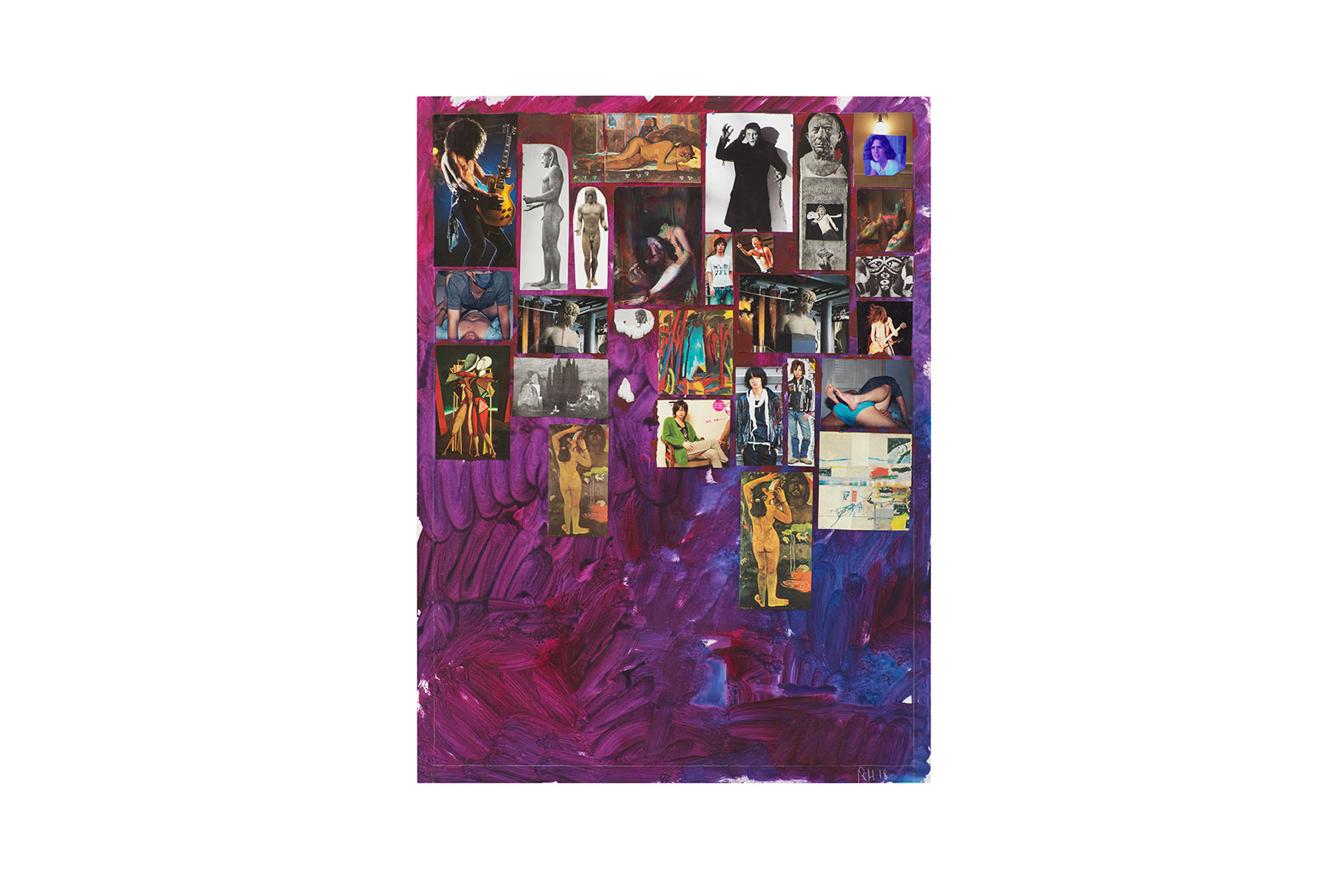Richard Hawkins has produced a limited edition print that will be launched alongside his exhibition at Kunsthalle Wien. Purple Melody Vienna (2025) reproduces a version of the 2018 painting Purple Melody, which is included in the exhibition. In his essay for the exhibition catalogue, Kristian Vistrup Madsen describes the painting as ‘quasi-scientific’ in its ‘ordered grid’, drawing a comparison to ‘Aby Warburg’s Bilderatlas Mnemosyne (1927–29), one man’s attempt to create some sort of coherent world-view. Here is a map of the intersecting relations between the great marble head of Apollo, the majestic manes of guitarists, the particular masculine daintiness evident in some Japanese fashion photography and Arnold Böcklin’s Toteninsel (1883) – all in the same field of vision.’ Madsen describes a ‘melancholy’ in Hawkins’ ‘amassing’ of images: ‘Even at the point where the grid of images falters mid-way […] we recall the god of silence and secrecy and see in the rough application of purple colour only more flesh. Hawkins punishes the terrible angels by capturing them like flies in his spiderweb of colour, pinning their ephemerality onto a form, but he is also loving them by holding them in this way inside the architecture of his art.’