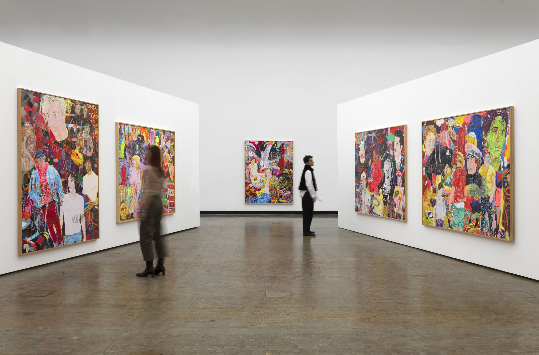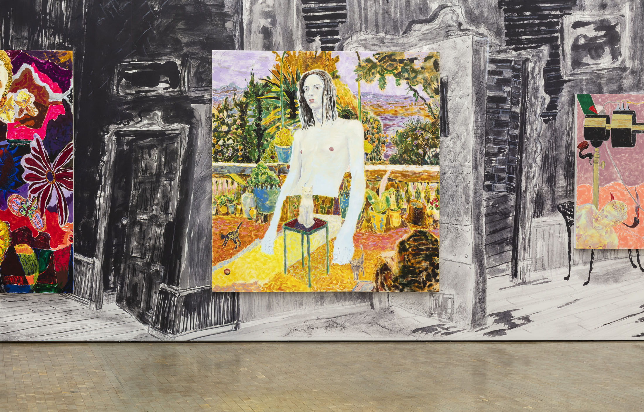 A more recent series of work renders Hollywood celebrities in dense, colourful painted compositions. Hawkins combines candid paparazzi shots with portraits of actors in period costume, using an ostentatious collar or a gratuitous display of flesh to anchor their disembodied heads. Several demonstrate a close study of the late work of the French painter Pierre Bonnard, shifting between portraiture and still life compositions of tables laid with an abundance of fruit. Invoking Bonnard’s application of colour, Hawkins recasts a company of young men in fecund landscapes replete with clouds of blossom, cats and butterflies.