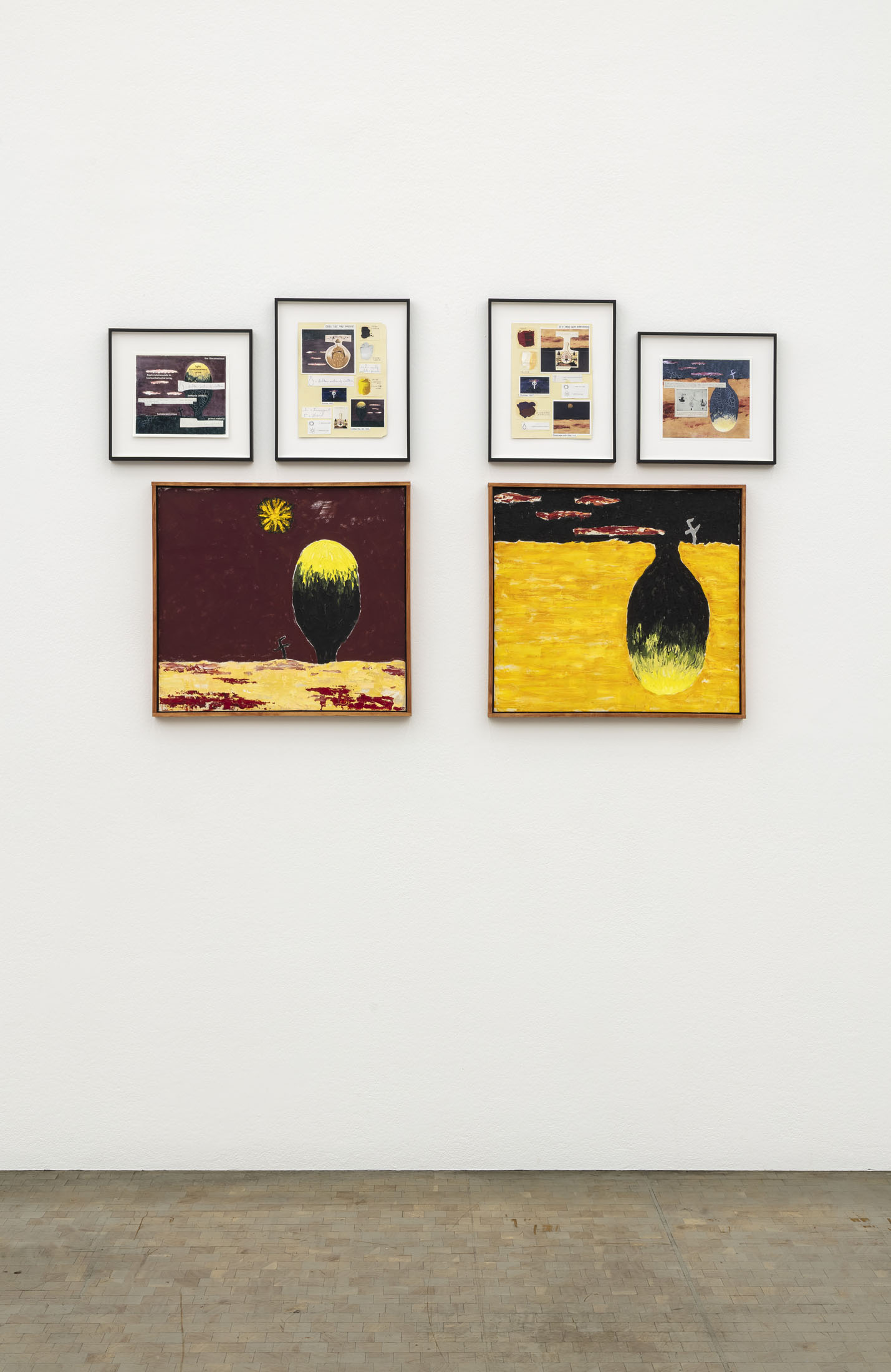 An early series of paintings reinterprets the biblical story of Salome, a subject of paintings by Caravaggio, Artemisia Gentileschi and Titian (among many others) as well as works for the stage by Oscar Wilde and Richard Strauss (whose opera was initially banned in Vienna). Hawkins retells it as a nightmarish fable of ‘homo-dystopia’ set outside a funhouse-cum-bordello where severed heads haunt male prostitutes touting for business. Several other chapters of the exhibition draw upon Hawkins’s studies of the lives and obsessions of different artists including the Japanese choreographer Tatsumi Hijikata, the French writer Antonin Artaud and the American painter Forrest Bess.
