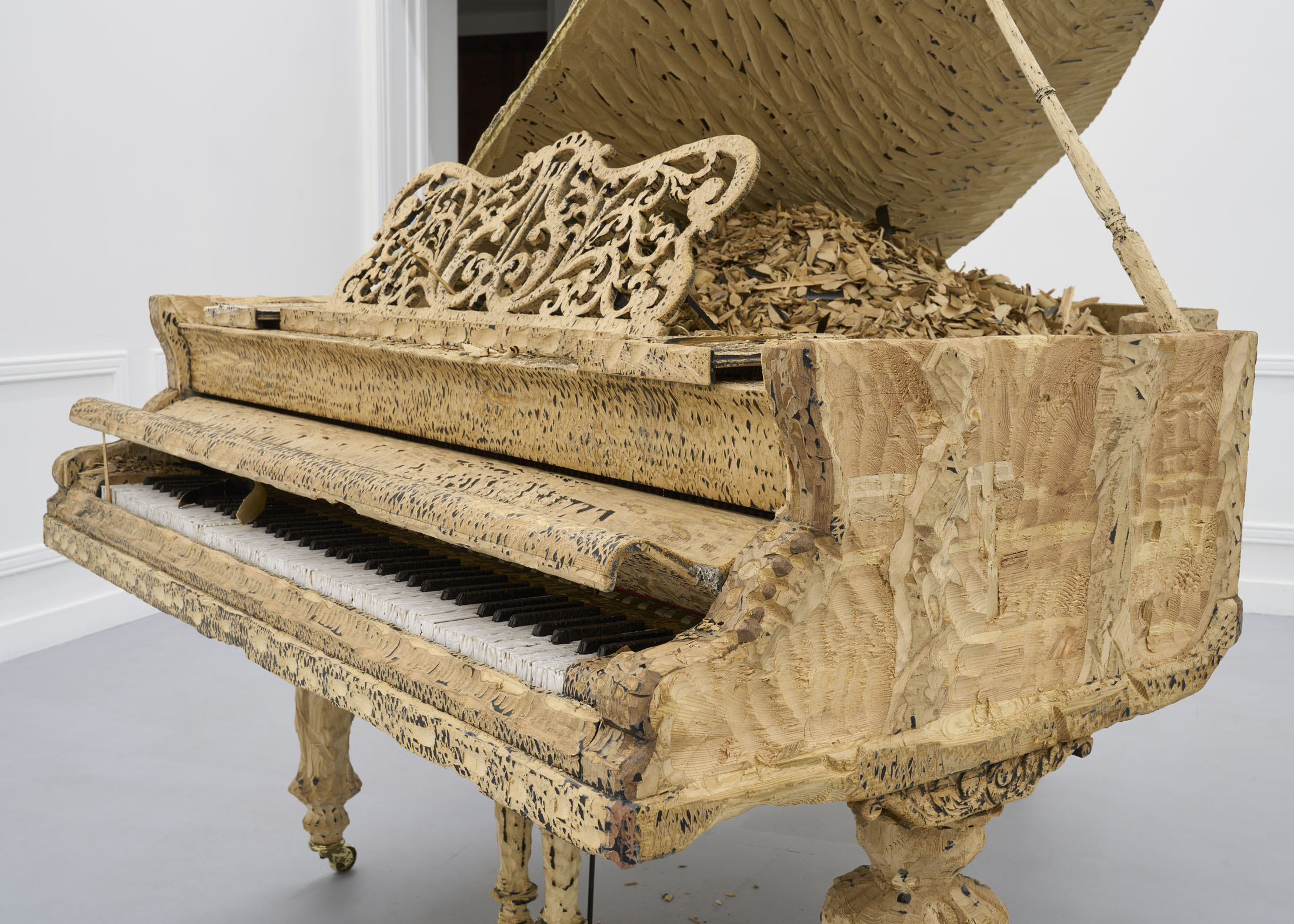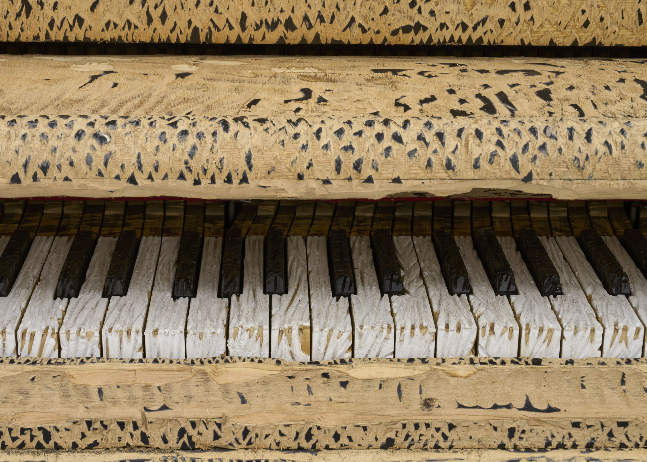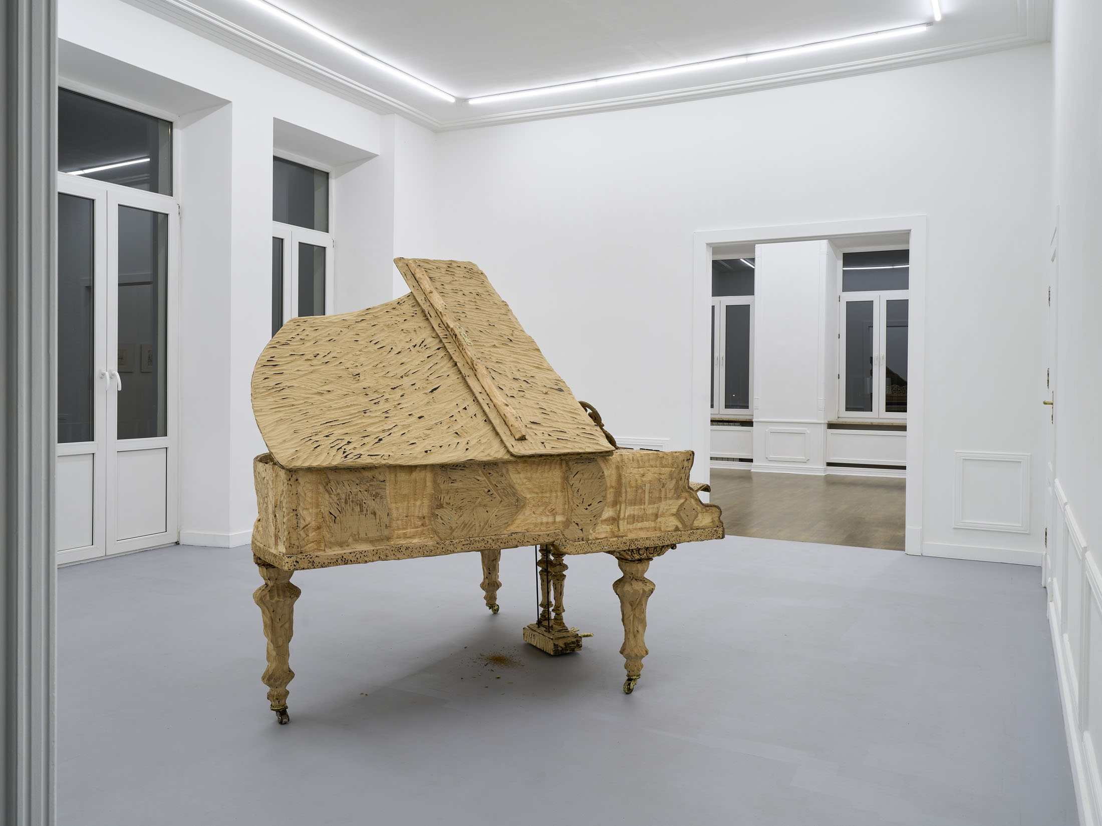 The artist’s latest work, entitled M.C. (2025), is his first project since the famous Flight – a private jet turned inside out like a glove – presented at the Polish Pavilion in Venice in 2019. The piano stands out among the objects featured in Stańczak’s collection due to its unique aura and dense network of socio- cultural references. This is probably what makes it so difficult to put one’s thoughts together when looking at this sculpture, and it certainly posed an additional challenge in the process of working on it. However, the object itself has undergone the same process as the others – a trip to the other side; nothing has been taken away, something has been added. In the case of a piano over a hundred years old, taken from a nearby music school, this something can be called a new life.