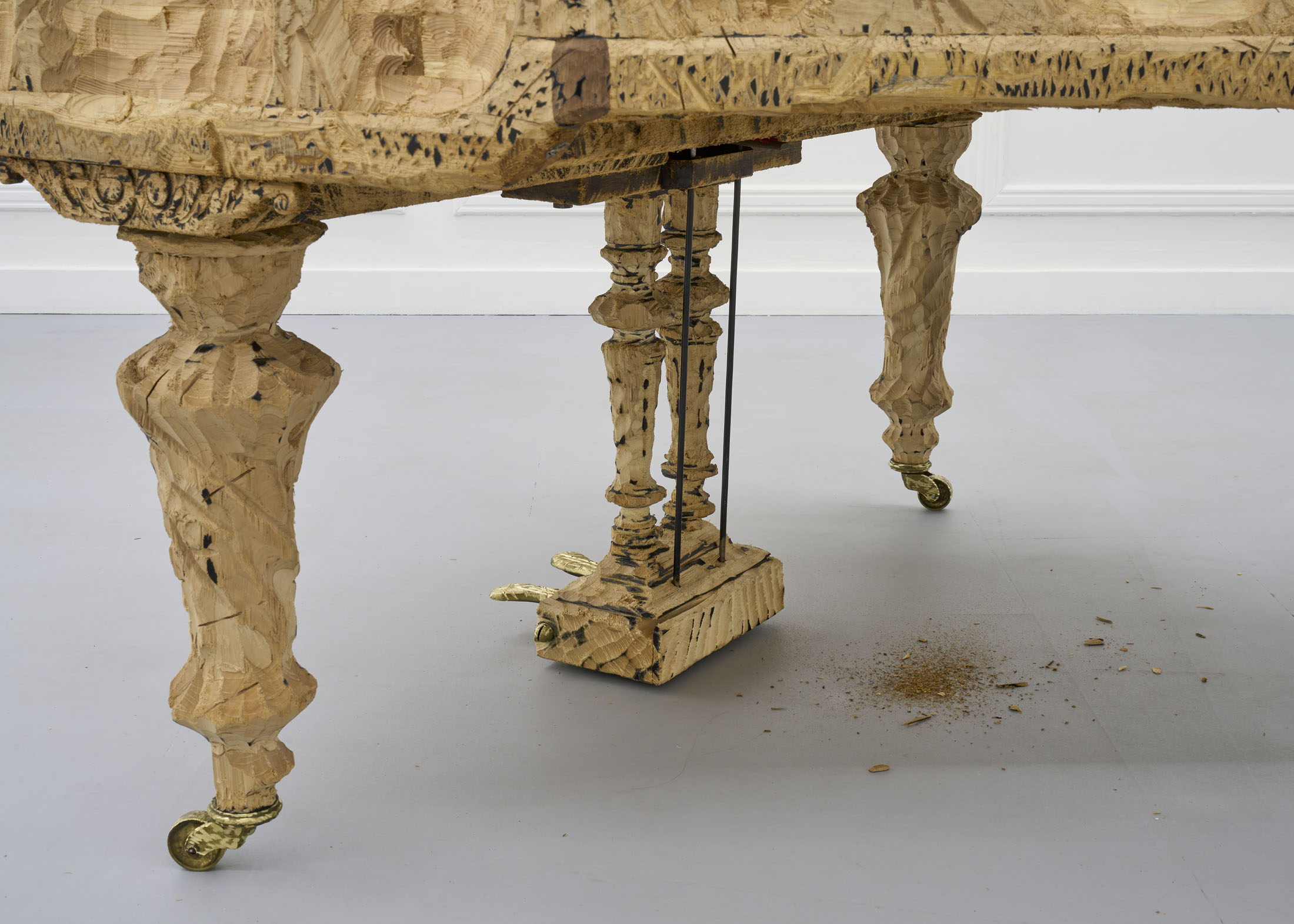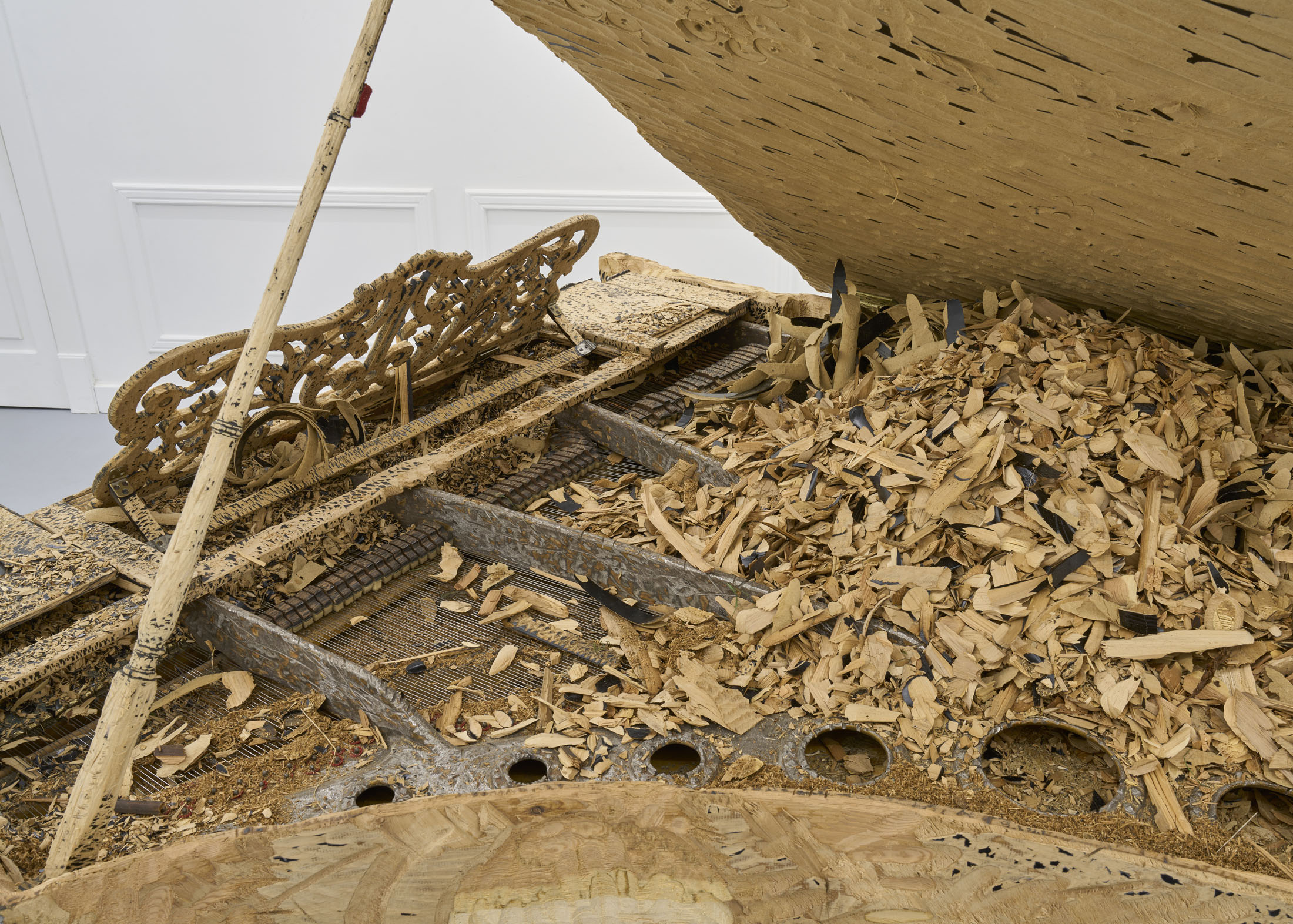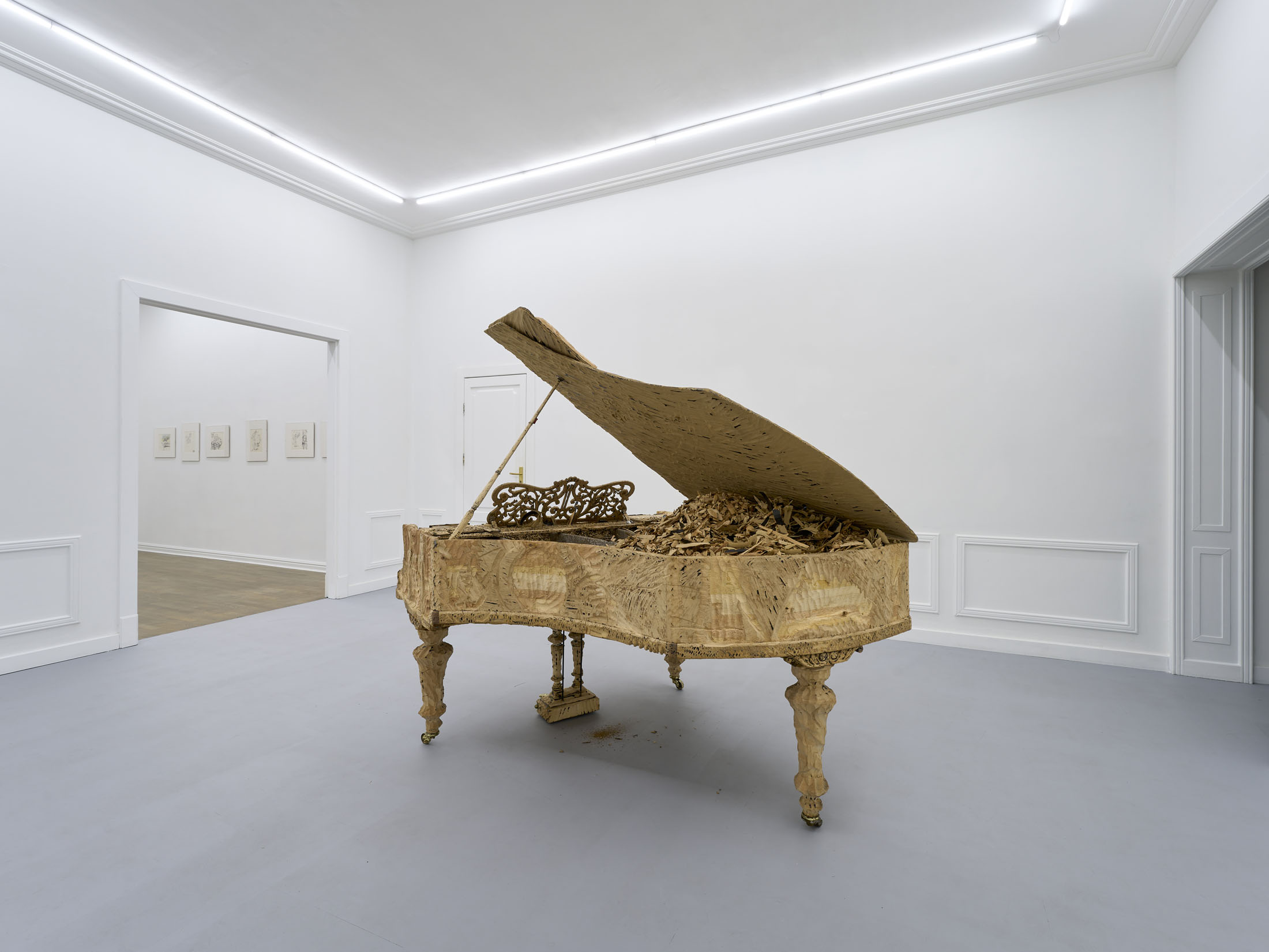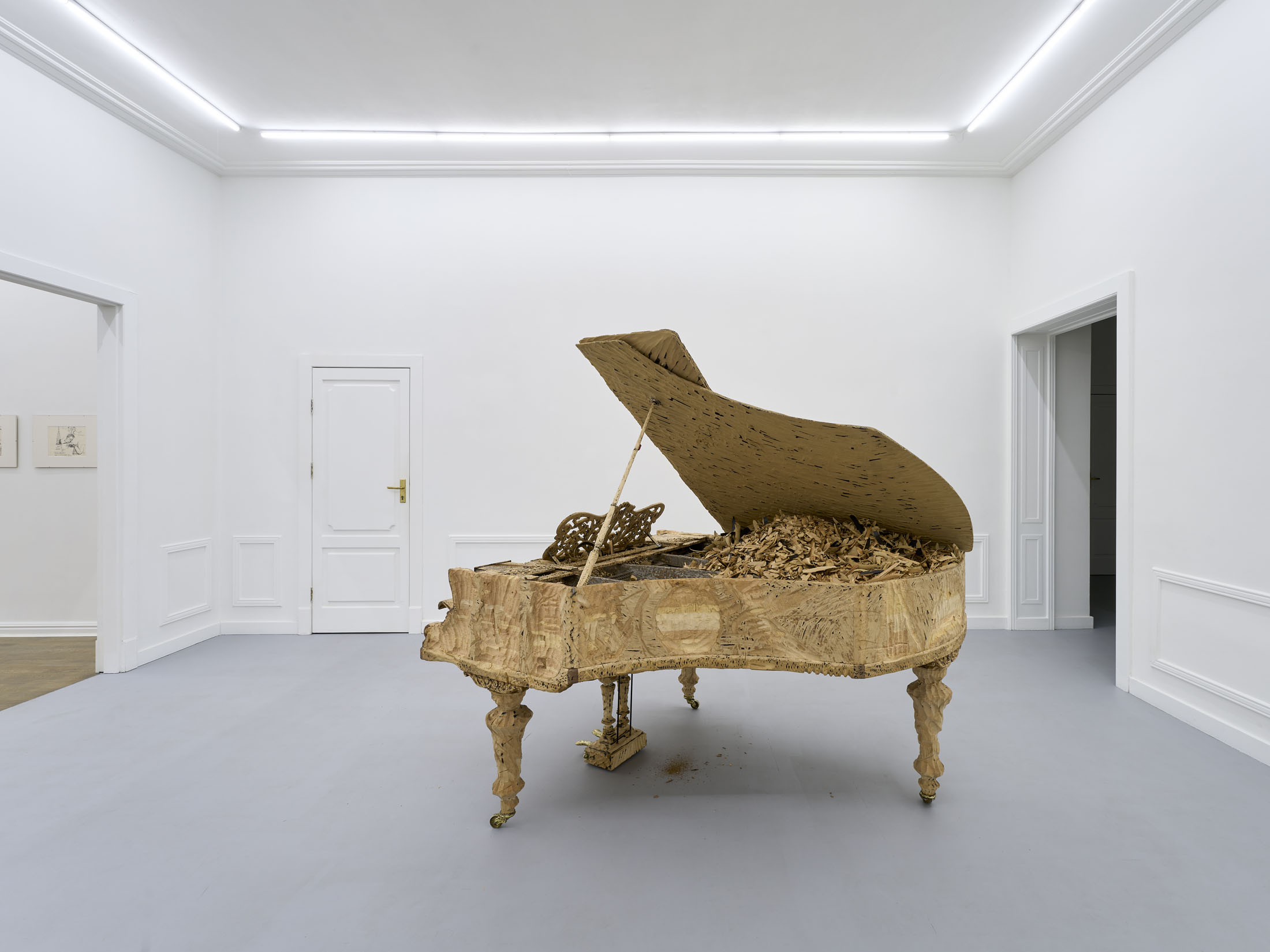 The artist’s latest work, entitled M.C. (2025), is his first project since the famous Flight – a private jet turned inside out like a glove – presented at the Polish Pavilion in Venice in 2019. The piano stands out among the objects featured in Stańczak’s collection due to its unique aura and dense network of socio- cultural references. This is probably what makes it so difficult to put one’s thoughts together when looking at this sculpture, and it certainly posed an additional challenge in the process of working on it. However, the object itself has undergone the same process as the others – a trip to the other side; nothing has been taken away, something has been added. In the case of a piano over a hundred years old, taken from a nearby music school, this something can be called a new life.