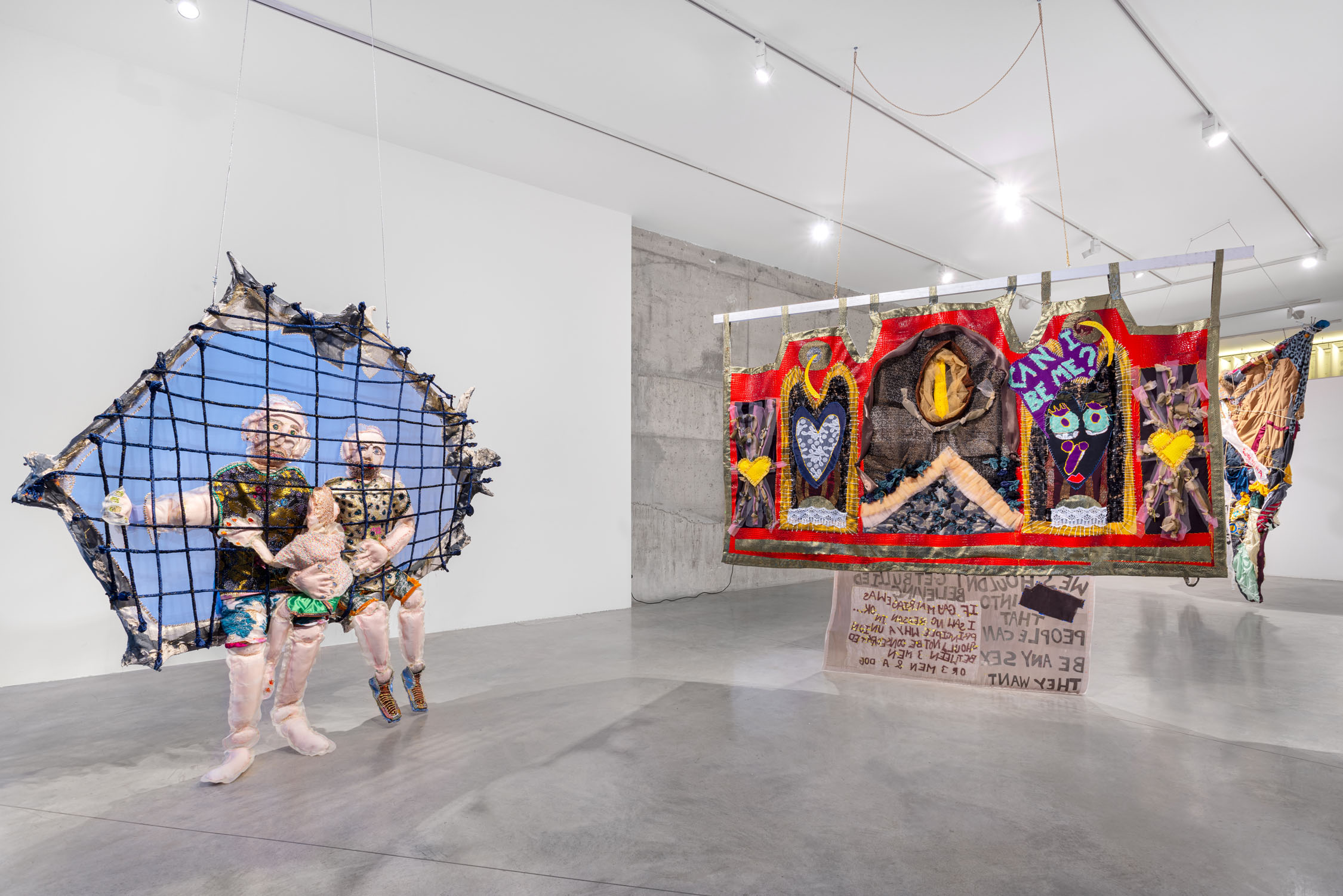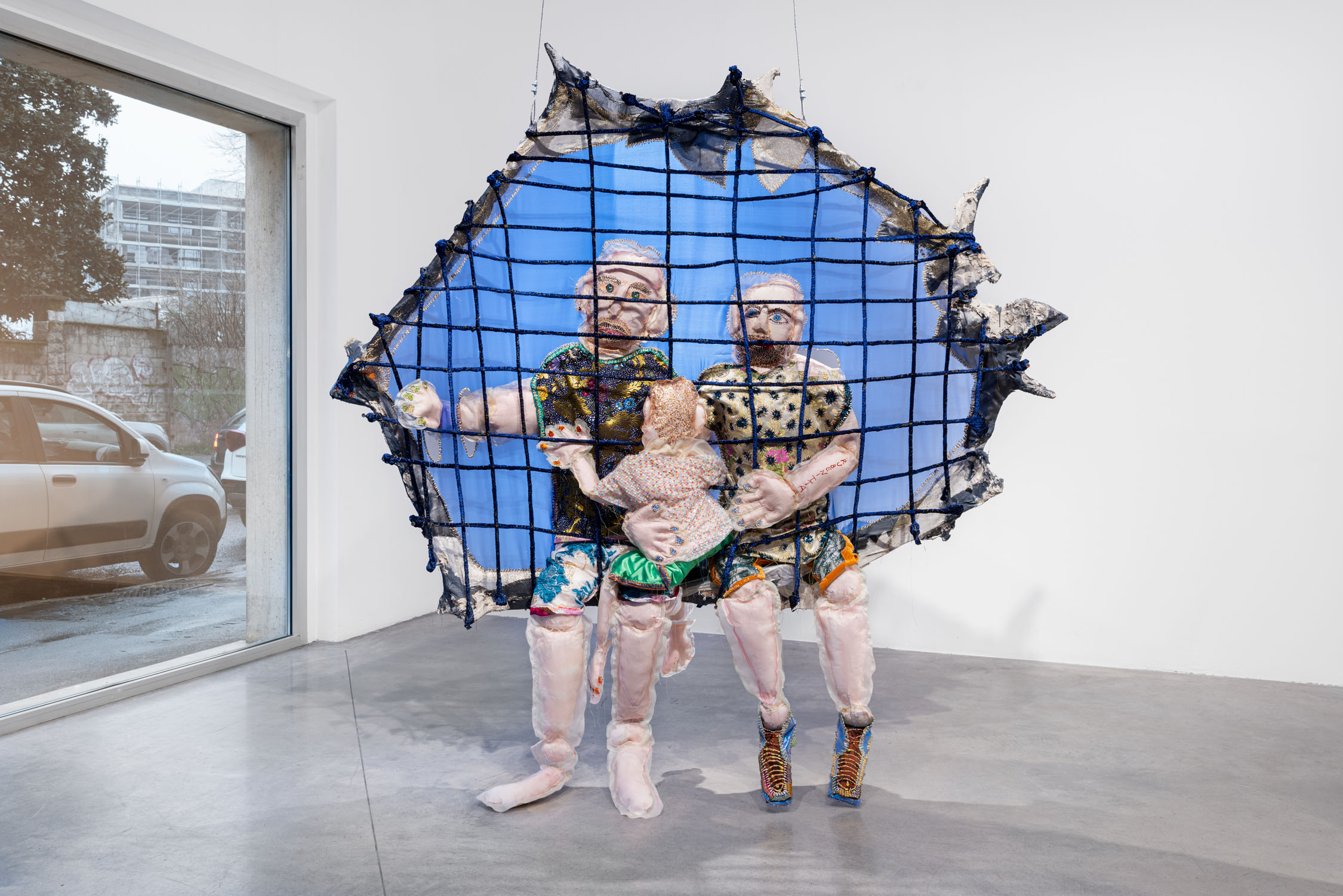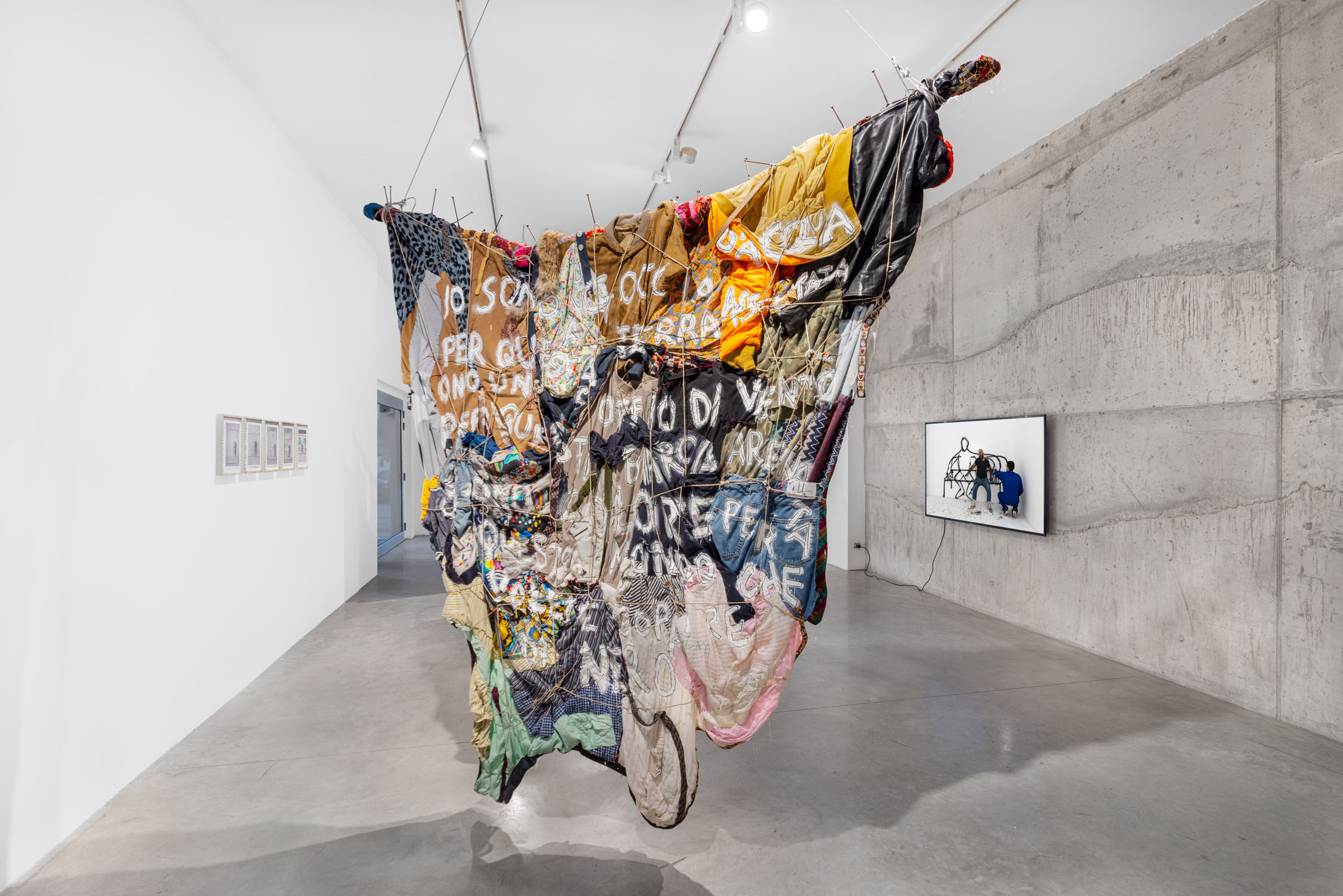 Through a vivid polytheism of fabrics sewn by multiple hands – a powerful metaphor for collaboration, collectivity, memory and continuity – Ruben Montini wants to explore human relationships, the construction of a collective meaning and the interaction between individuality and broader community. By weaving together colours, materials, images, words, slogans of denunciation or of awareness, his art explores the interconnection of opposites and suggests that every aspect of human life is intrinsically linked to the other.
