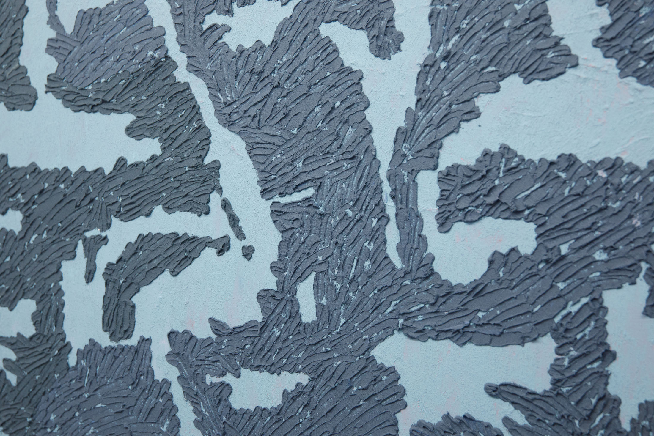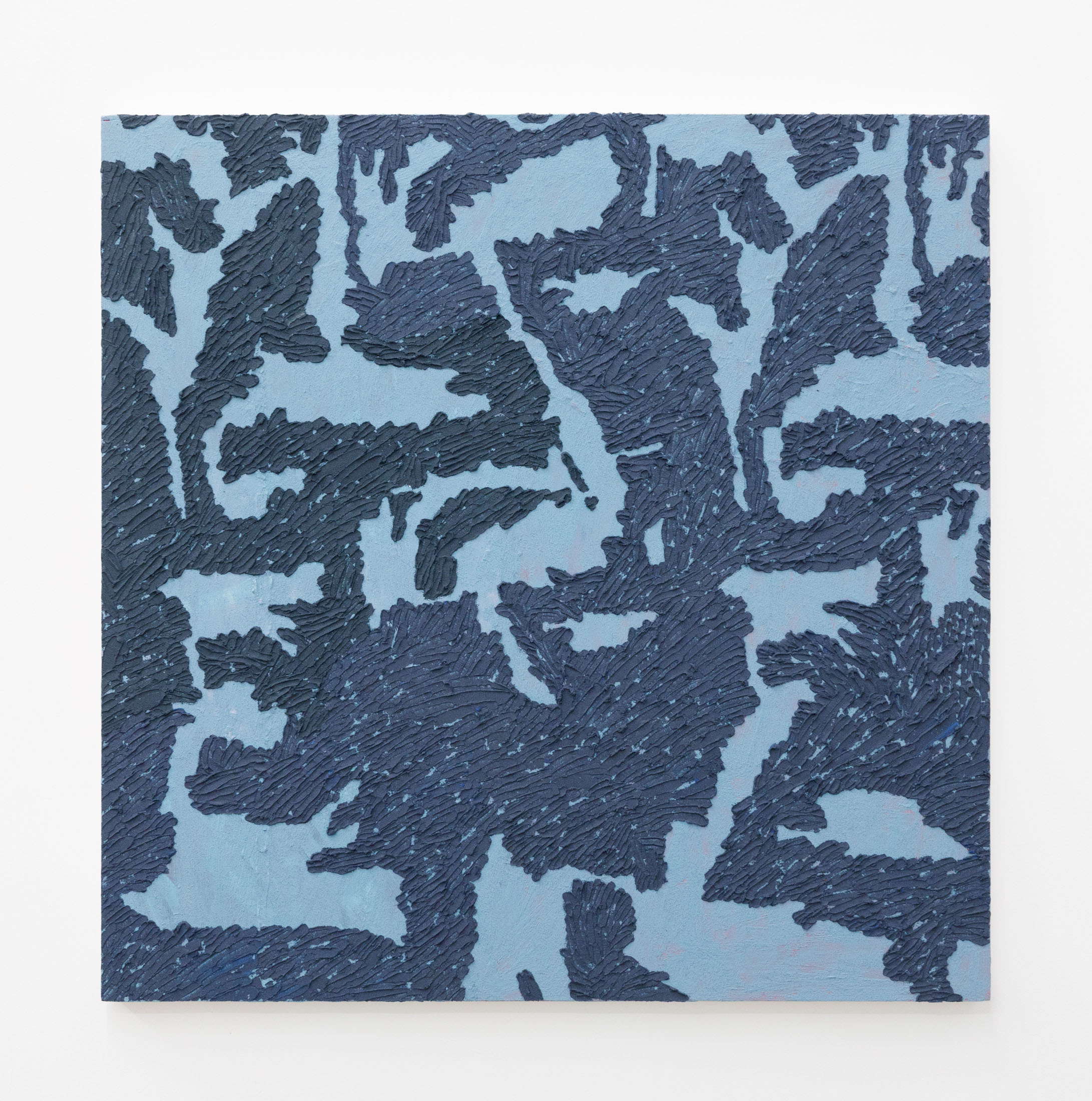 Layering shapes form the meaning of Kaur’s paintings. Panels of canvas are assembled together, emphasizing the work’s physical structure. Repeated gestures, accumulated paint, and overlapping surfaces become analogues for emotion and generational memory. These processes echo Kaur’s early studies in biology, which sharpened her attention to hidden systems, internal frameworks, and the accumulation of time. Rather than resolving these tensions, Kaur sustains them, allowing the paintings to remain dynamic spaces where meaning is continuously formed and undone.