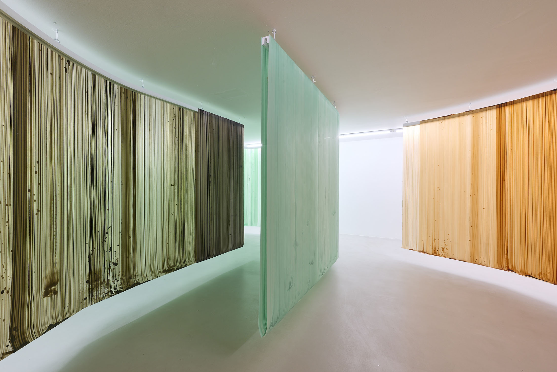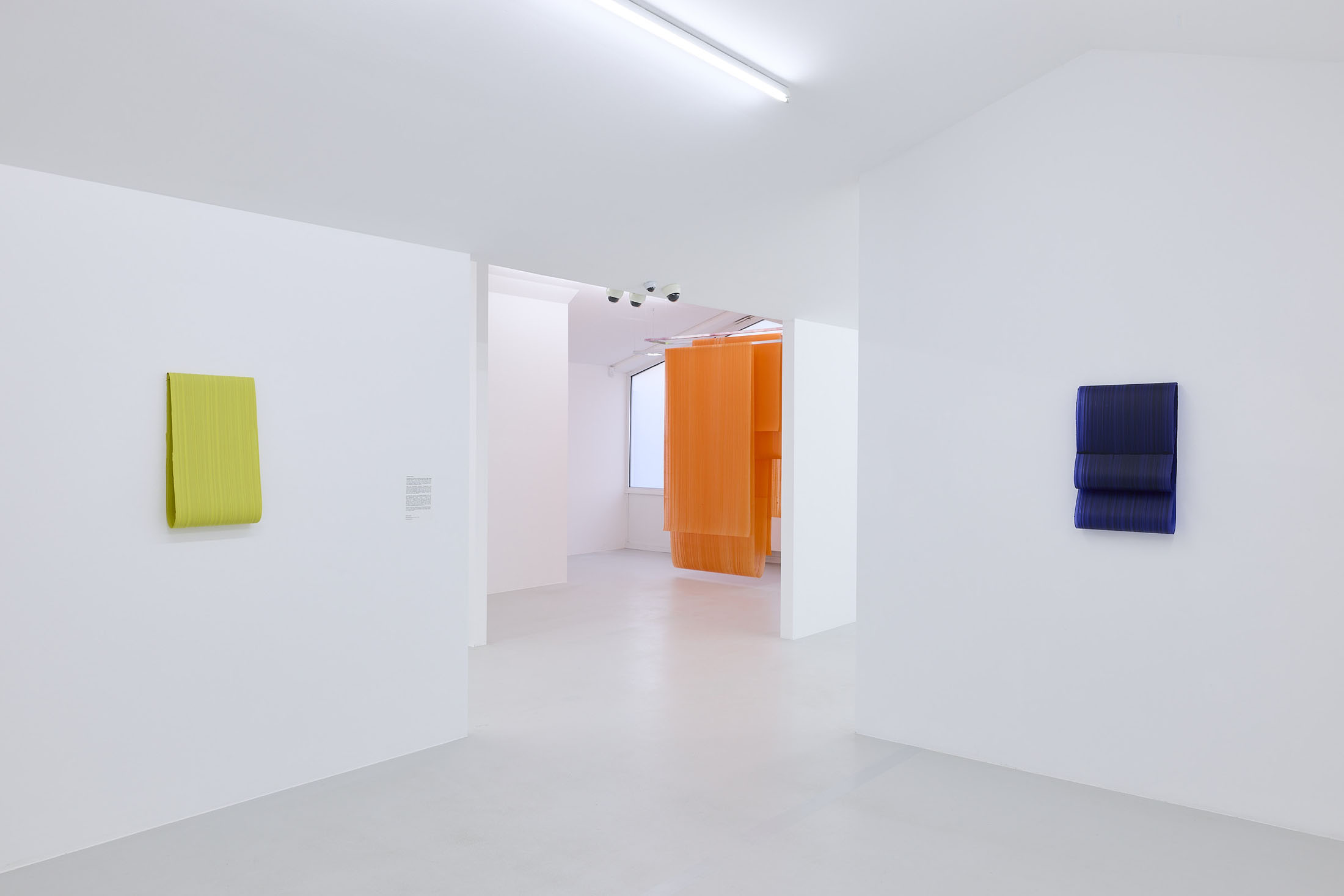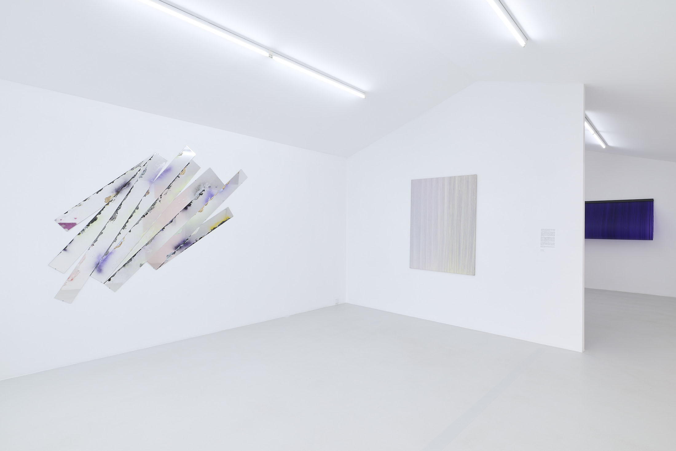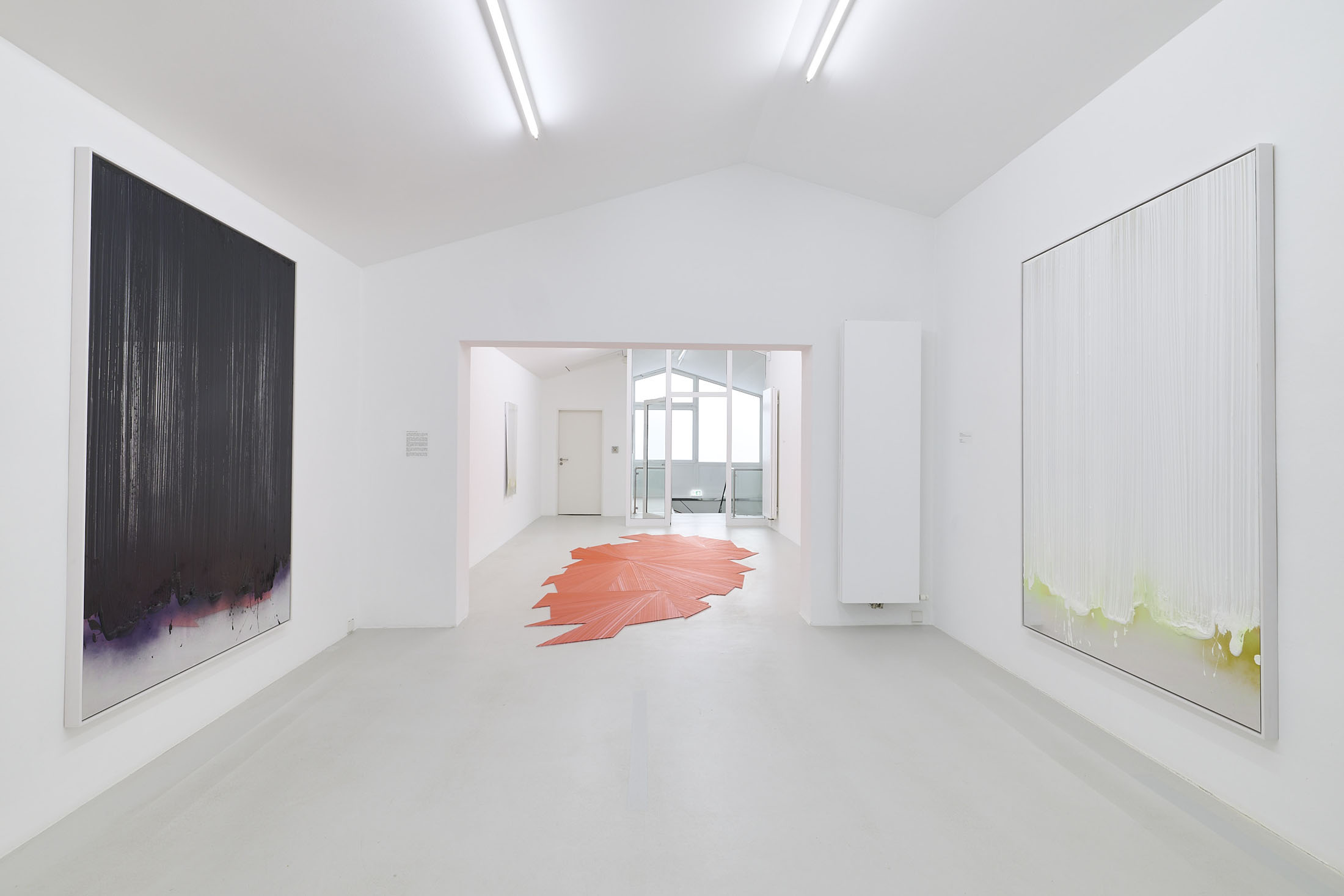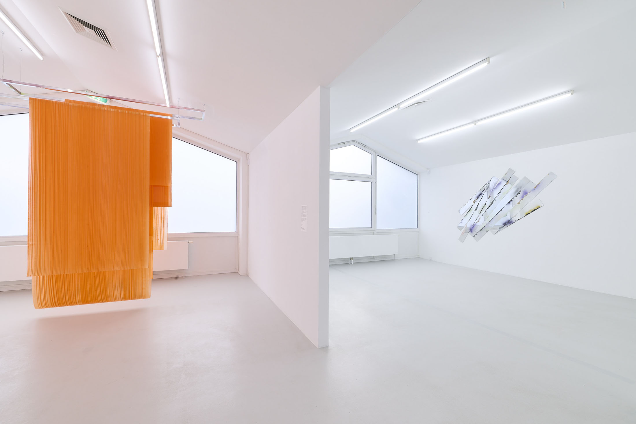 On the ground floor, a walkable, site-specific installation with Campau’s characteristic vertical, gestural brushstrokes on Mylar (polyester film) is created. On the upper floor, the multifaceted nature of her acrylic painting becomes visible: from a powerful orange floor work to suspended colour elements and works on mirrors.