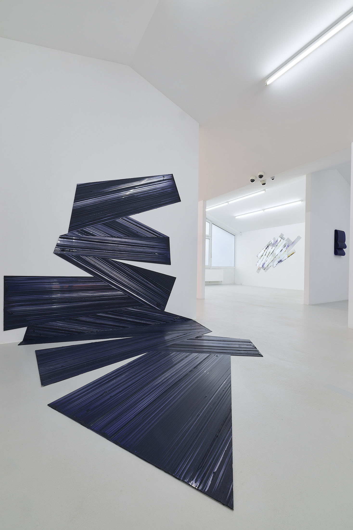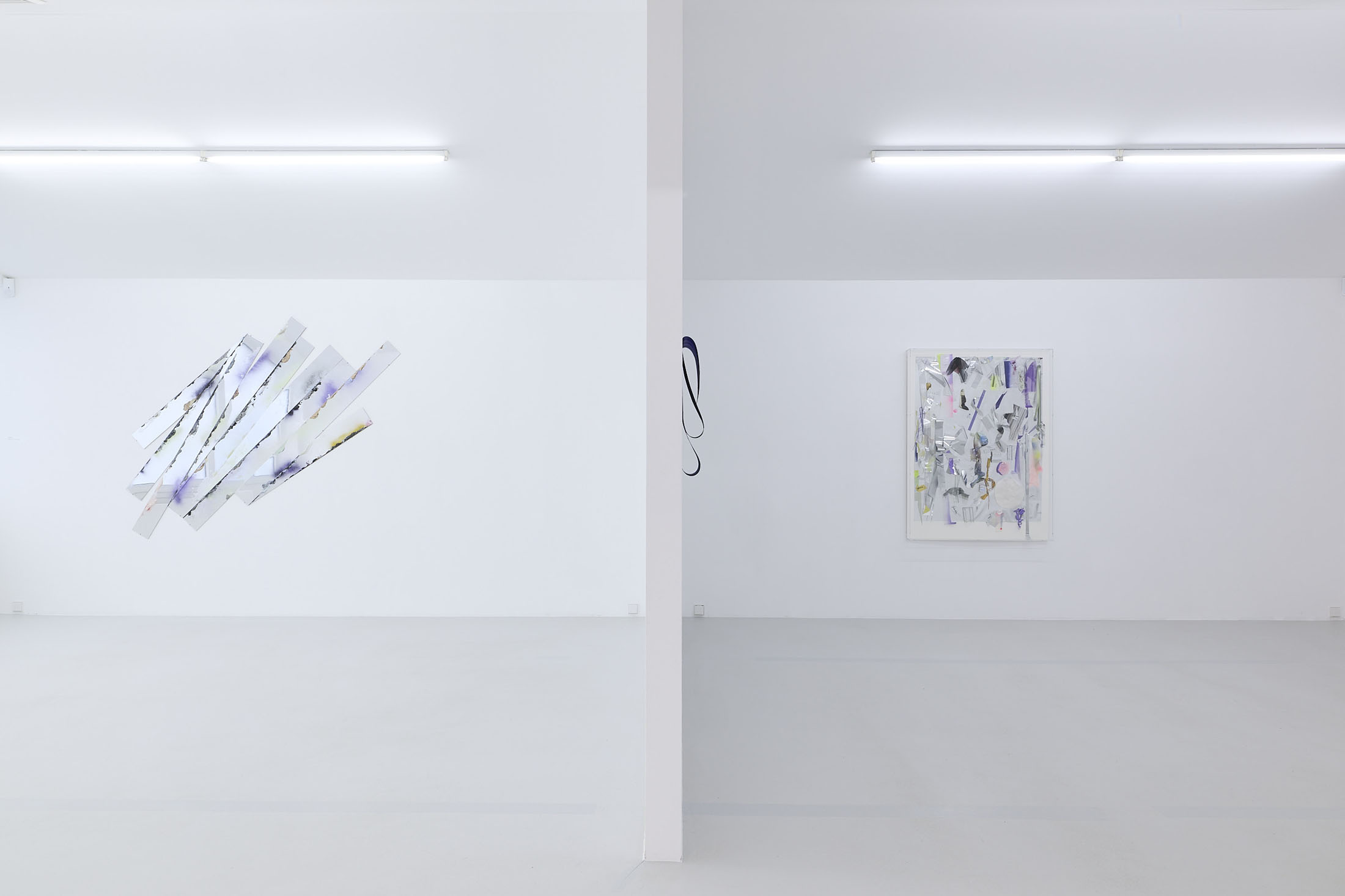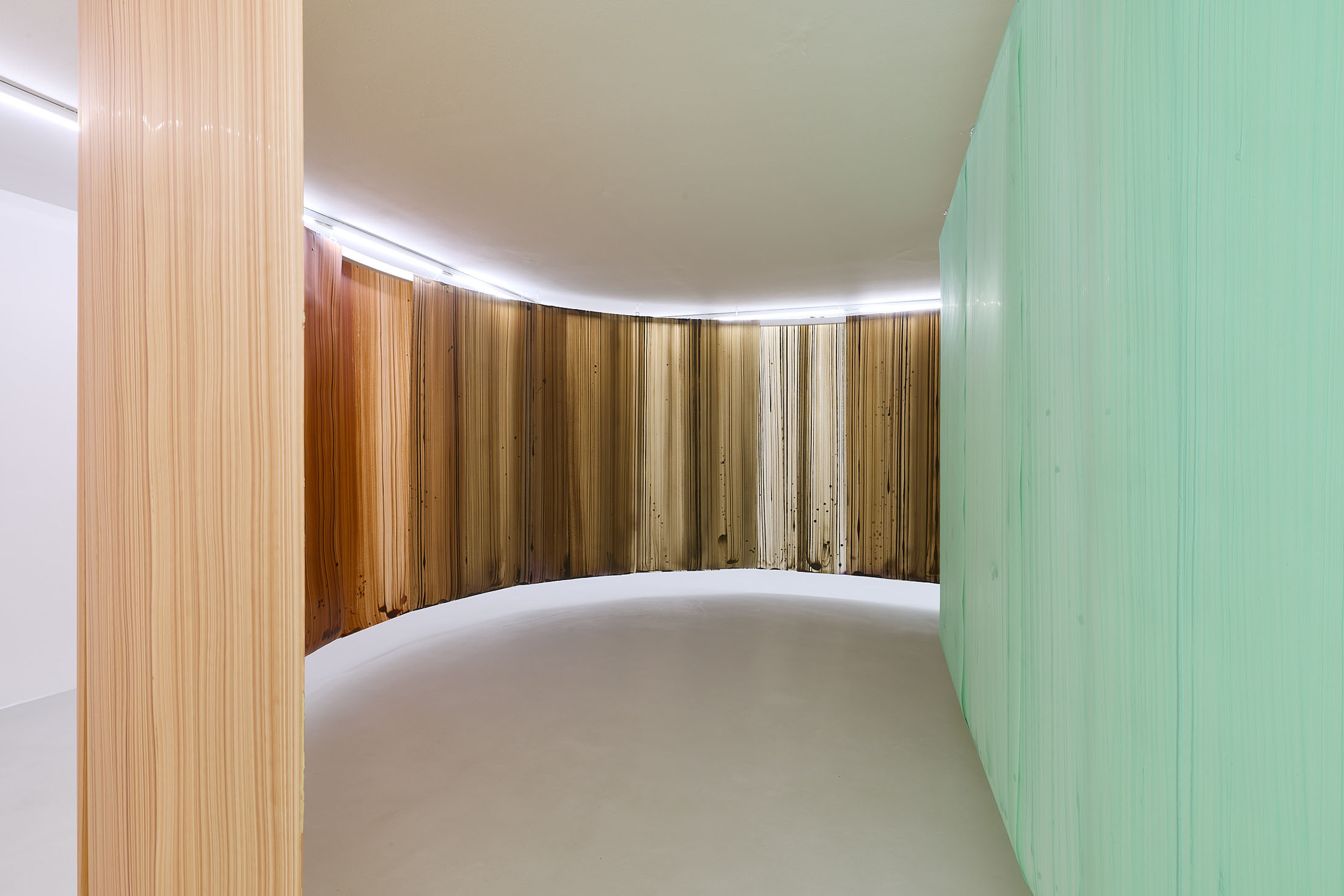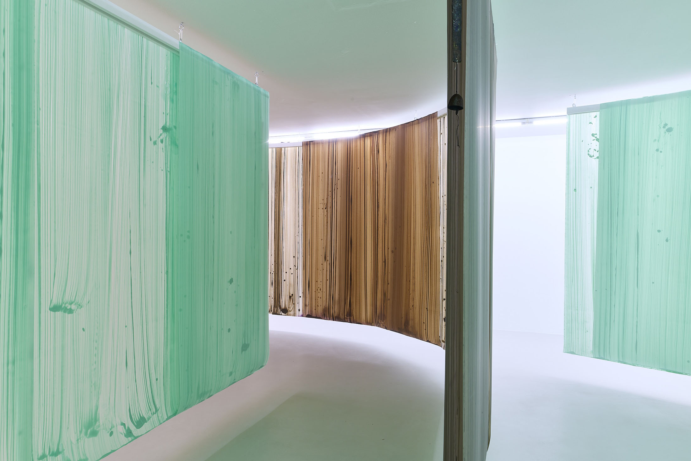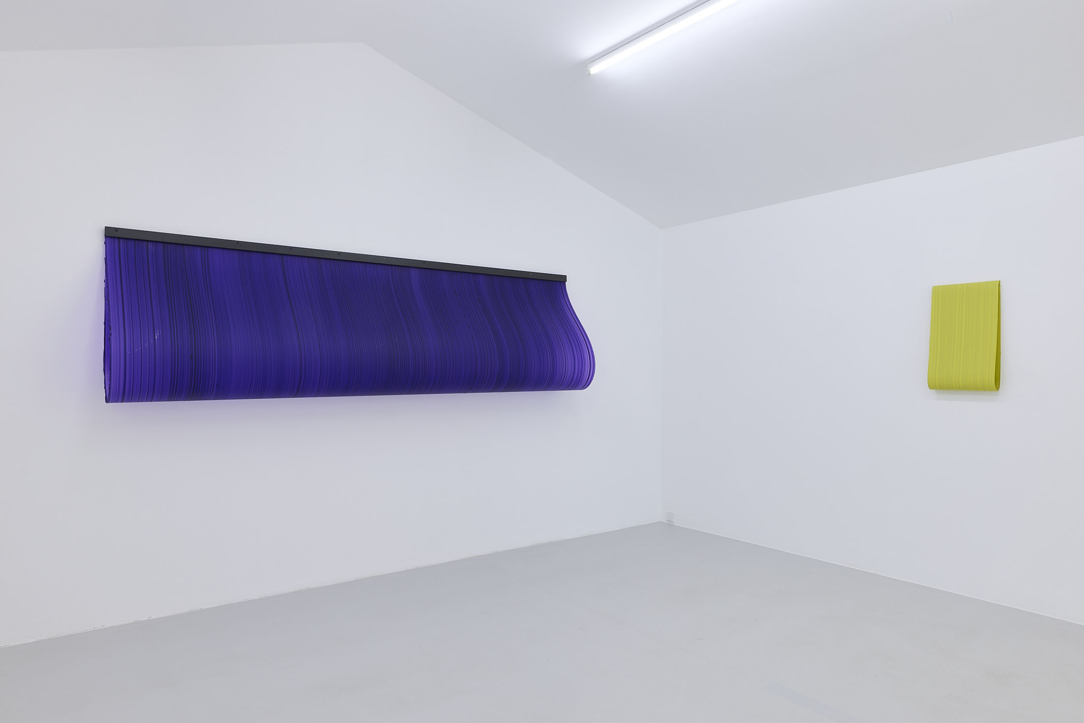 On the ground floor, a walkable, site-specific installation with Campau’s characteristic vertical, gestural brushstrokes on Mylar (polyester film) is created. On the upper floor, the multifaceted nature of her acrylic painting becomes visible: from a powerful orange floor work to suspended colour elements and works on mirrors.