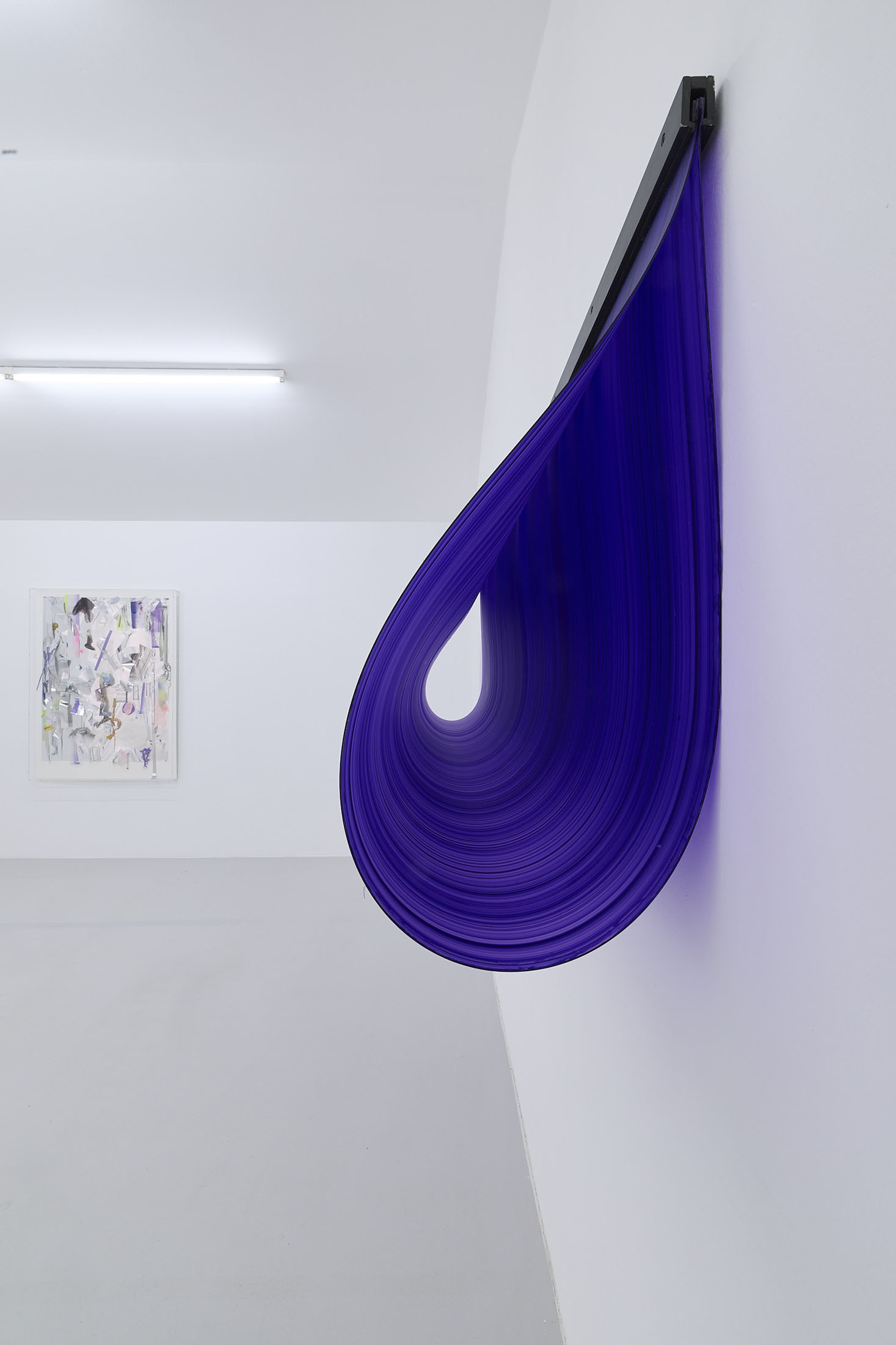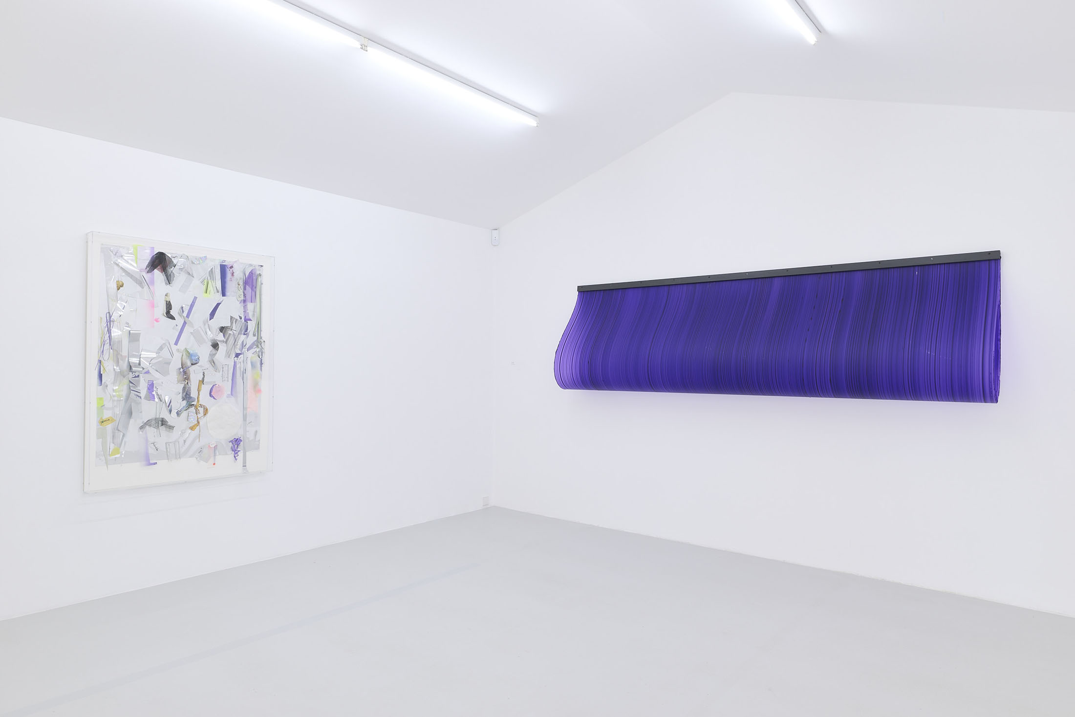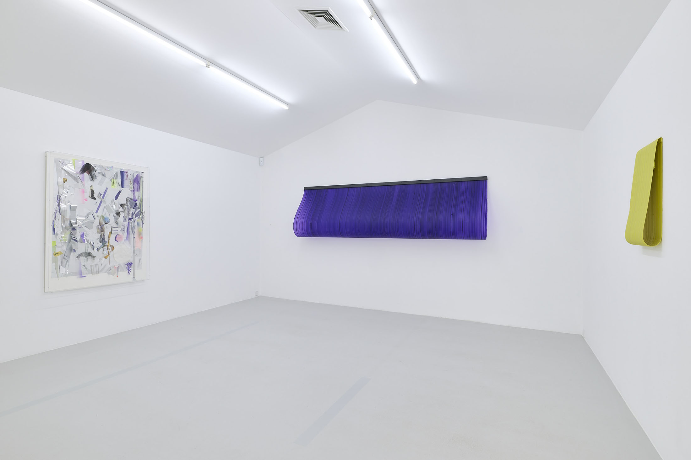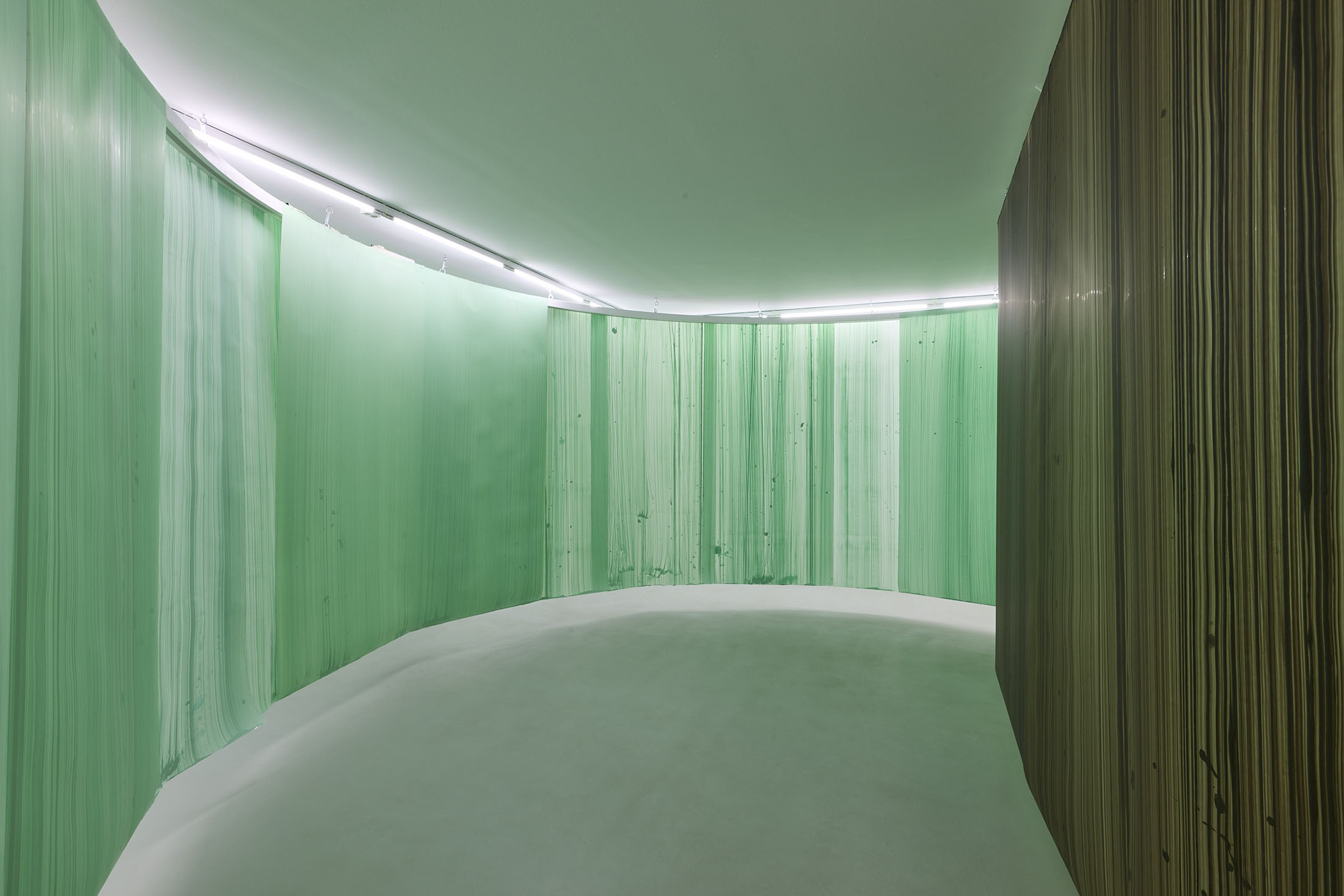 On the ground floor, a walkable, site-specific installation with Campau’s characteristic vertical, gestural brushstrokes on Mylar (polyester film) is created. On the upper floor, the multifaceted nature of her acrylic painting becomes visible: from a powerful orange floor work to suspended colour elements and works on mirrors.