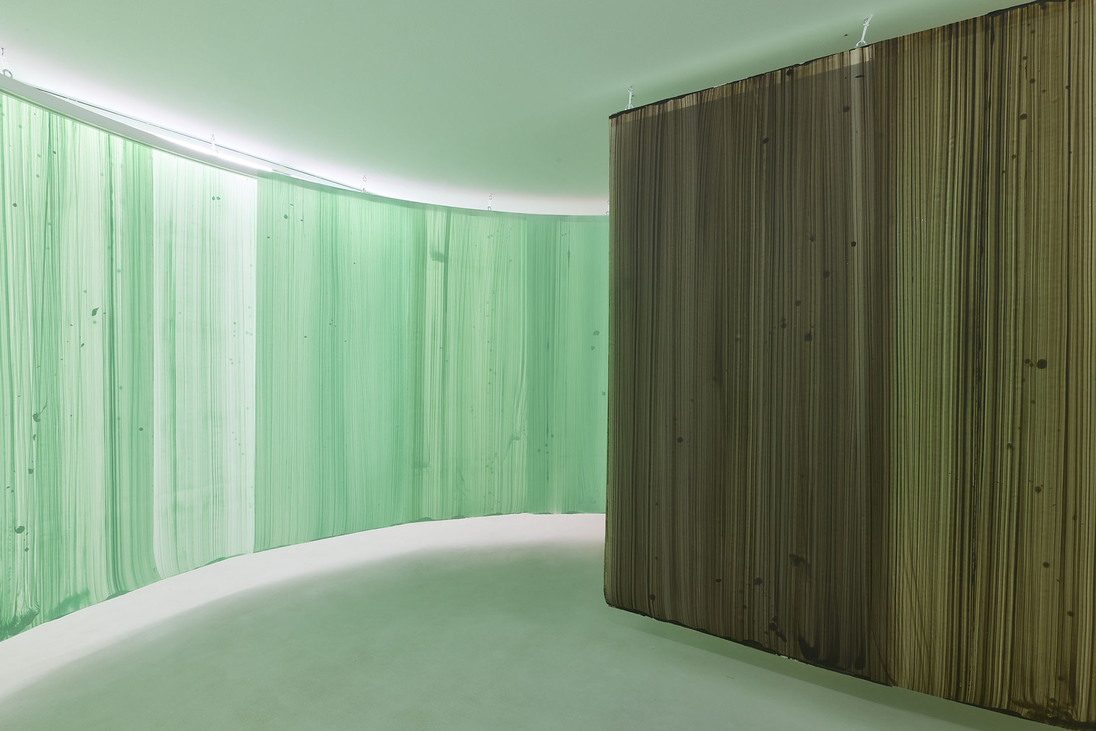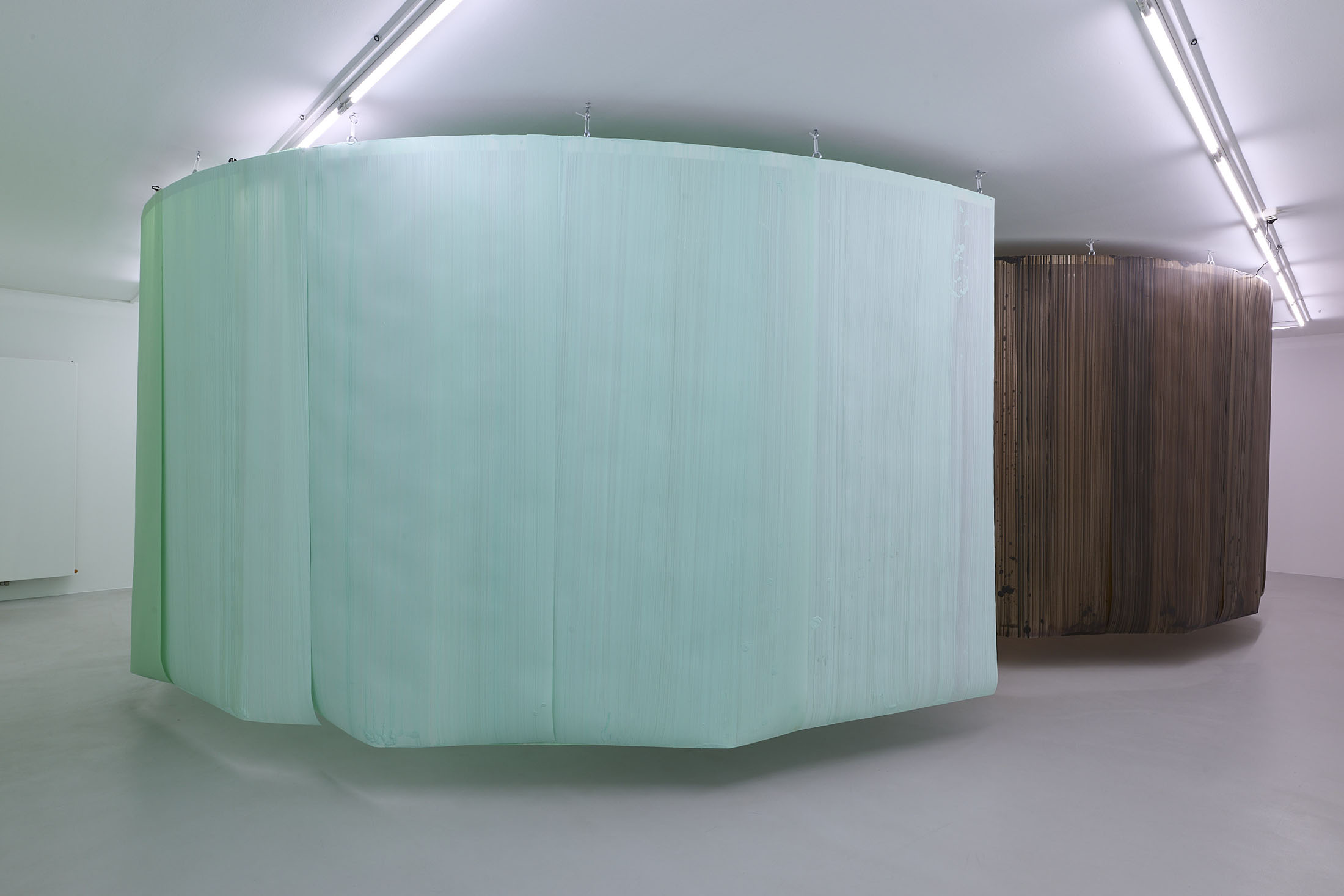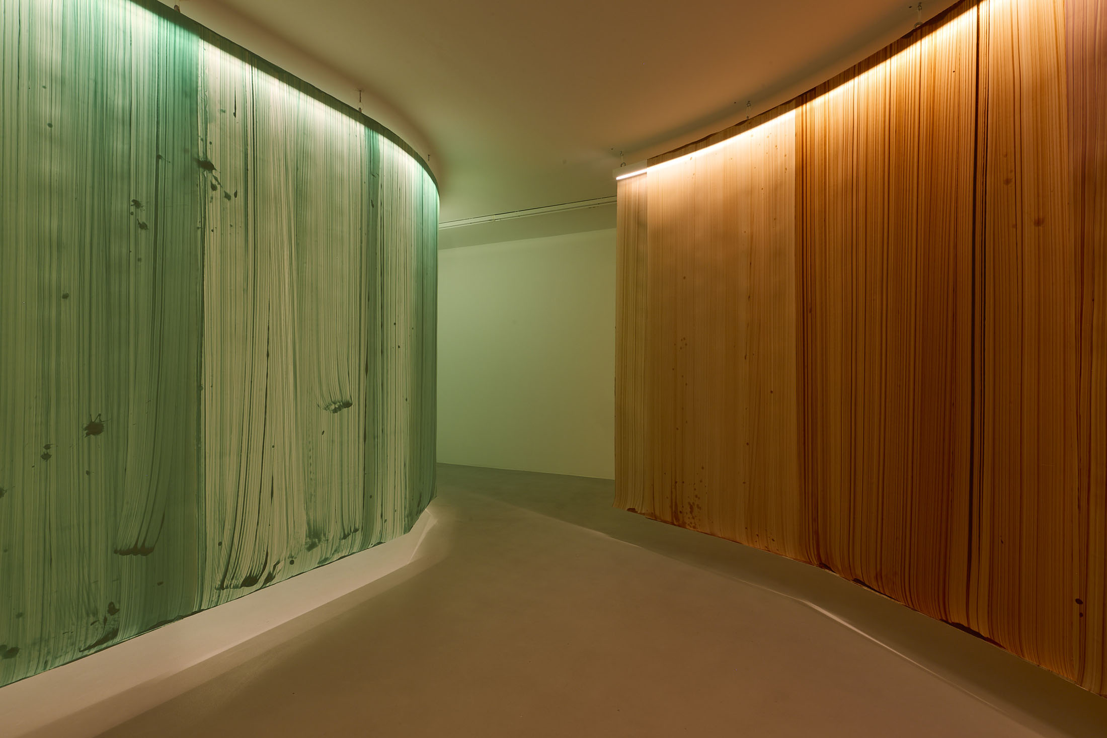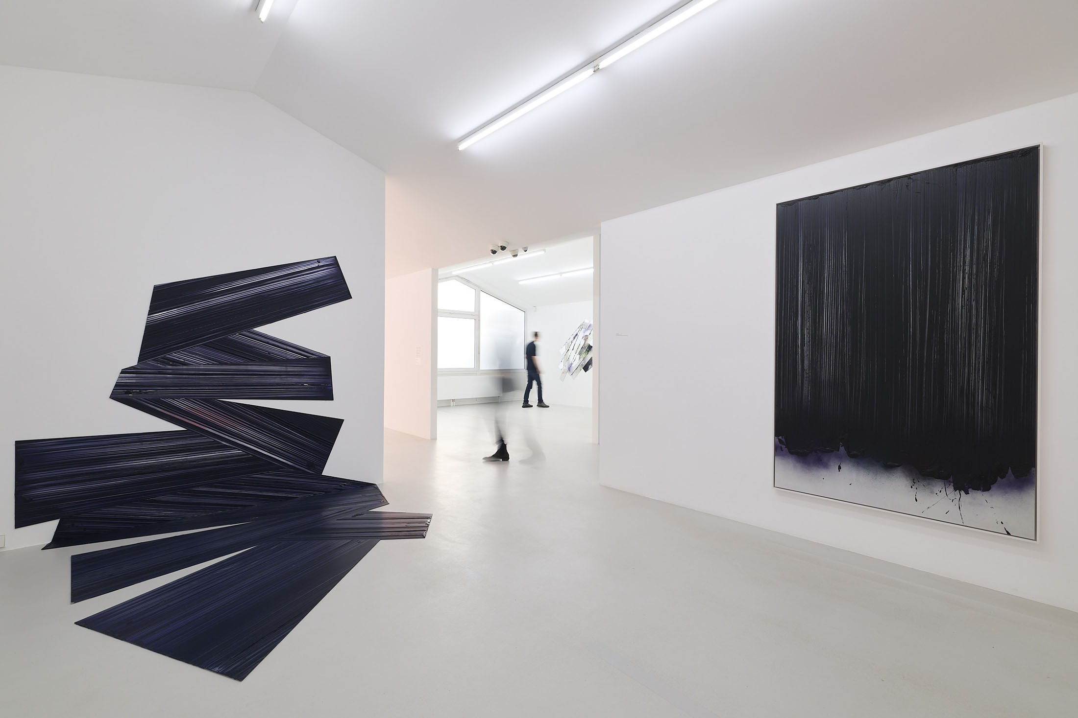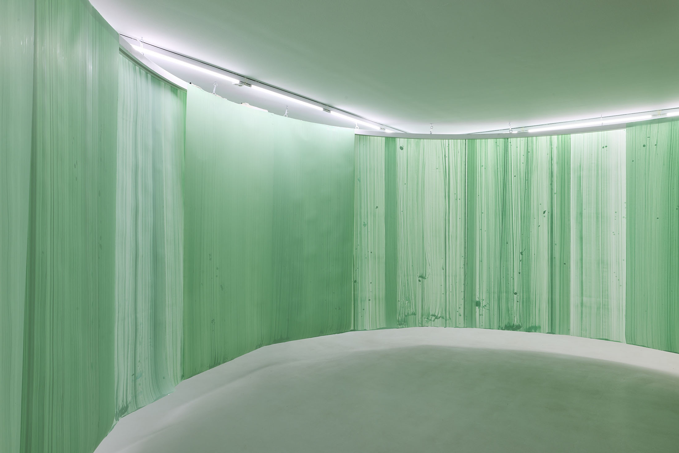 On the ground floor, a walkable, site-specific installation with Campau’s characteristic vertical, gestural brushstrokes on Mylar (polyester film) is created. On the upper floor, the multifaceted nature of her acrylic painting becomes visible: from a powerful orange floor work to suspended colour elements and works on mirrors.