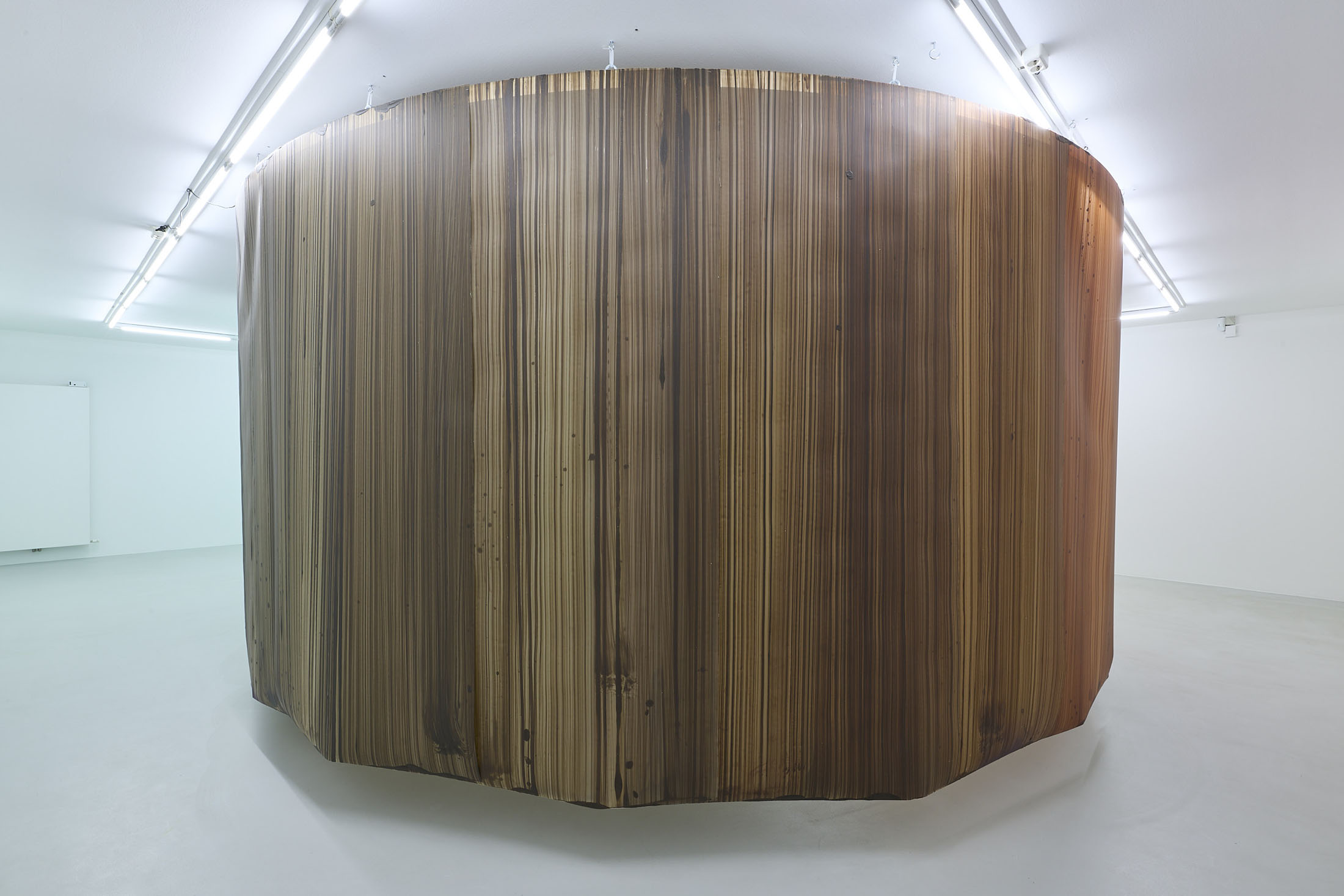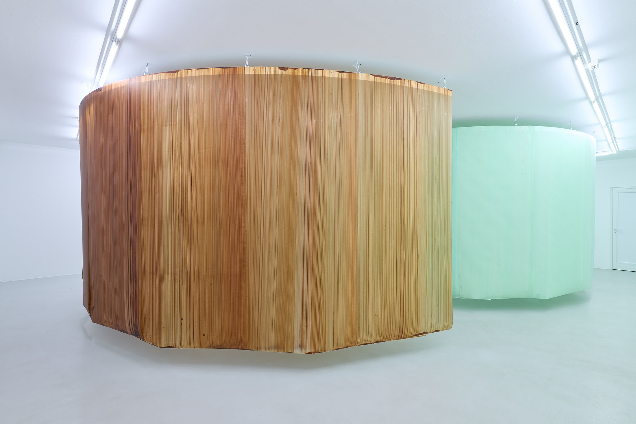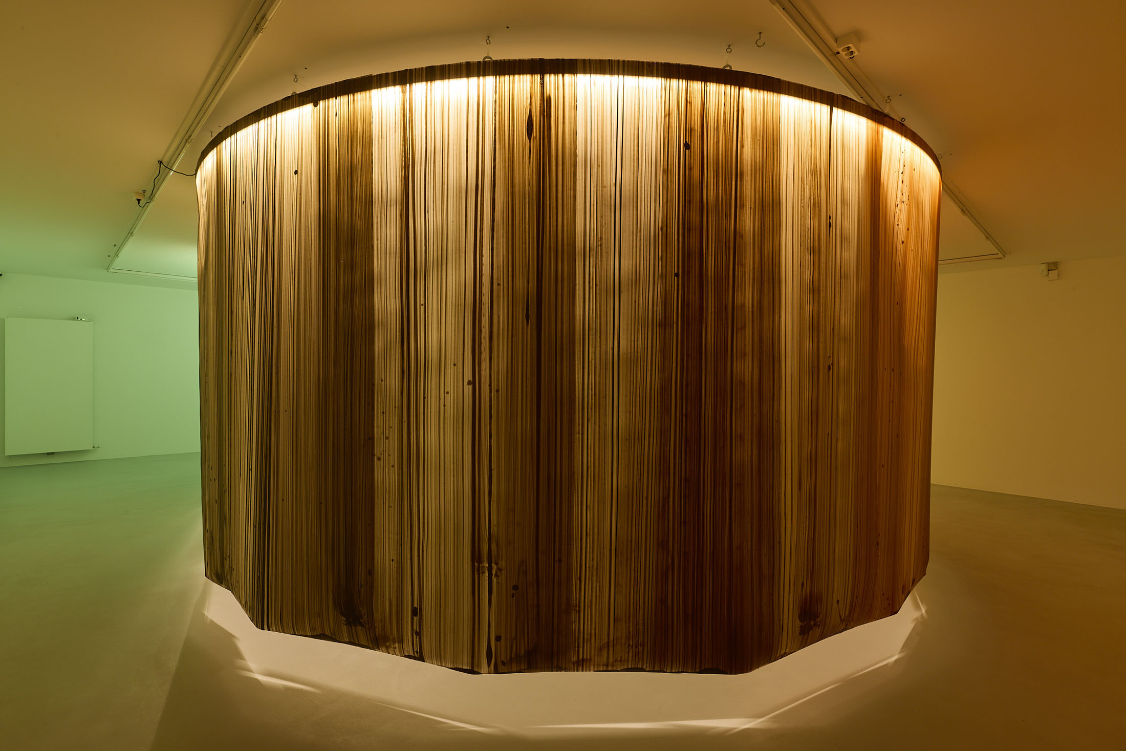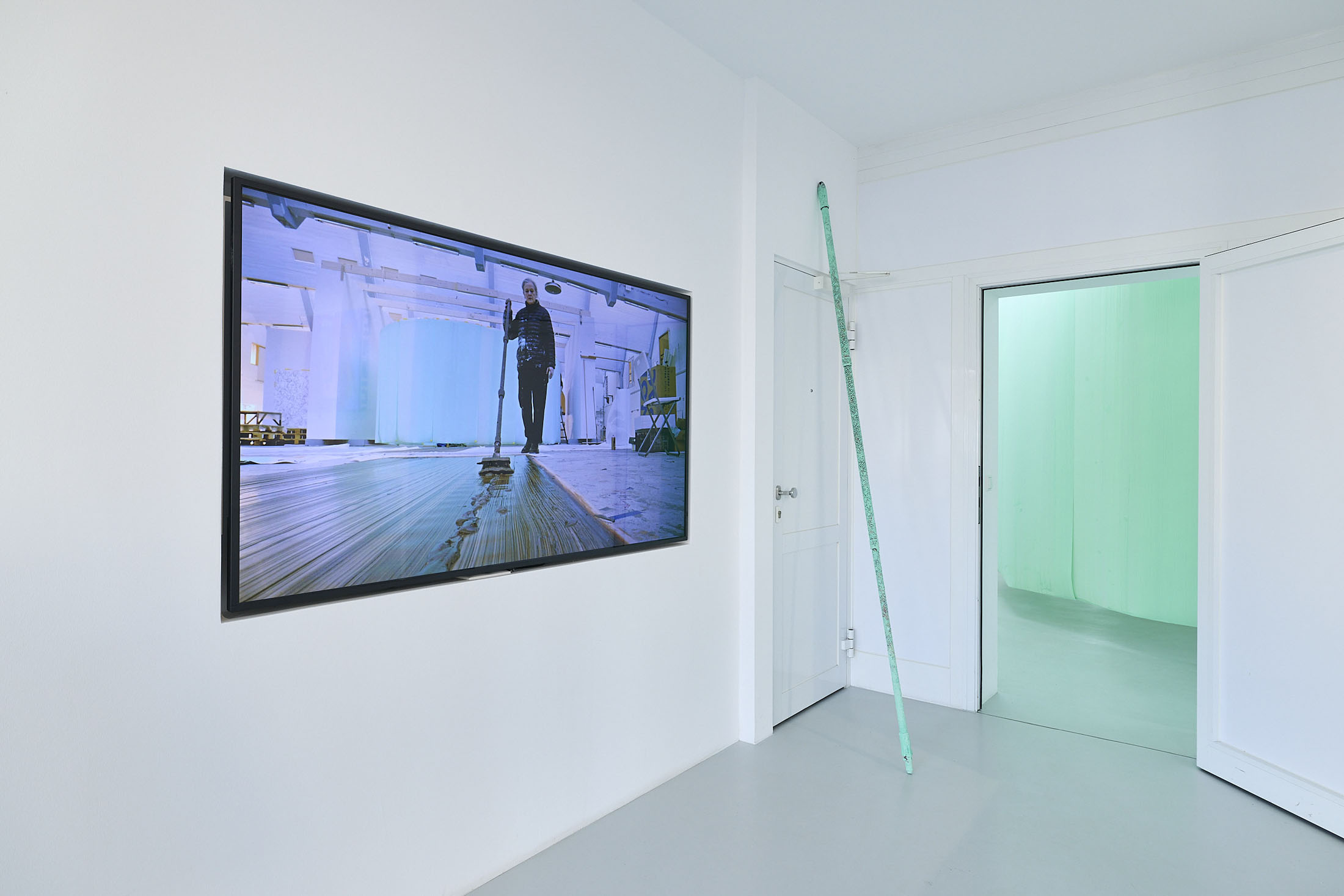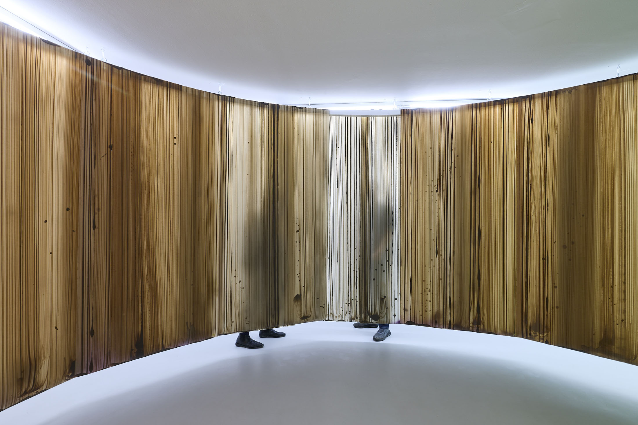 On the ground floor, a walkable, site-specific installation with Campau’s characteristic vertical, gestural brushstrokes on Mylar (polyester film) is created. On the upper floor, the multifaceted nature of her acrylic painting becomes visible: from a powerful orange floor work to suspended colour elements and works on mirrors.