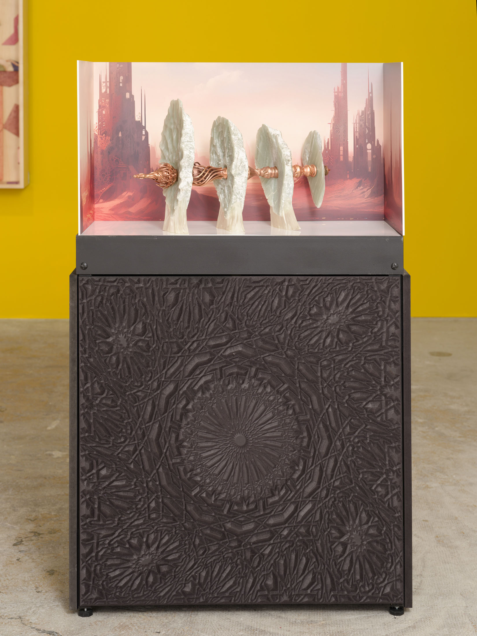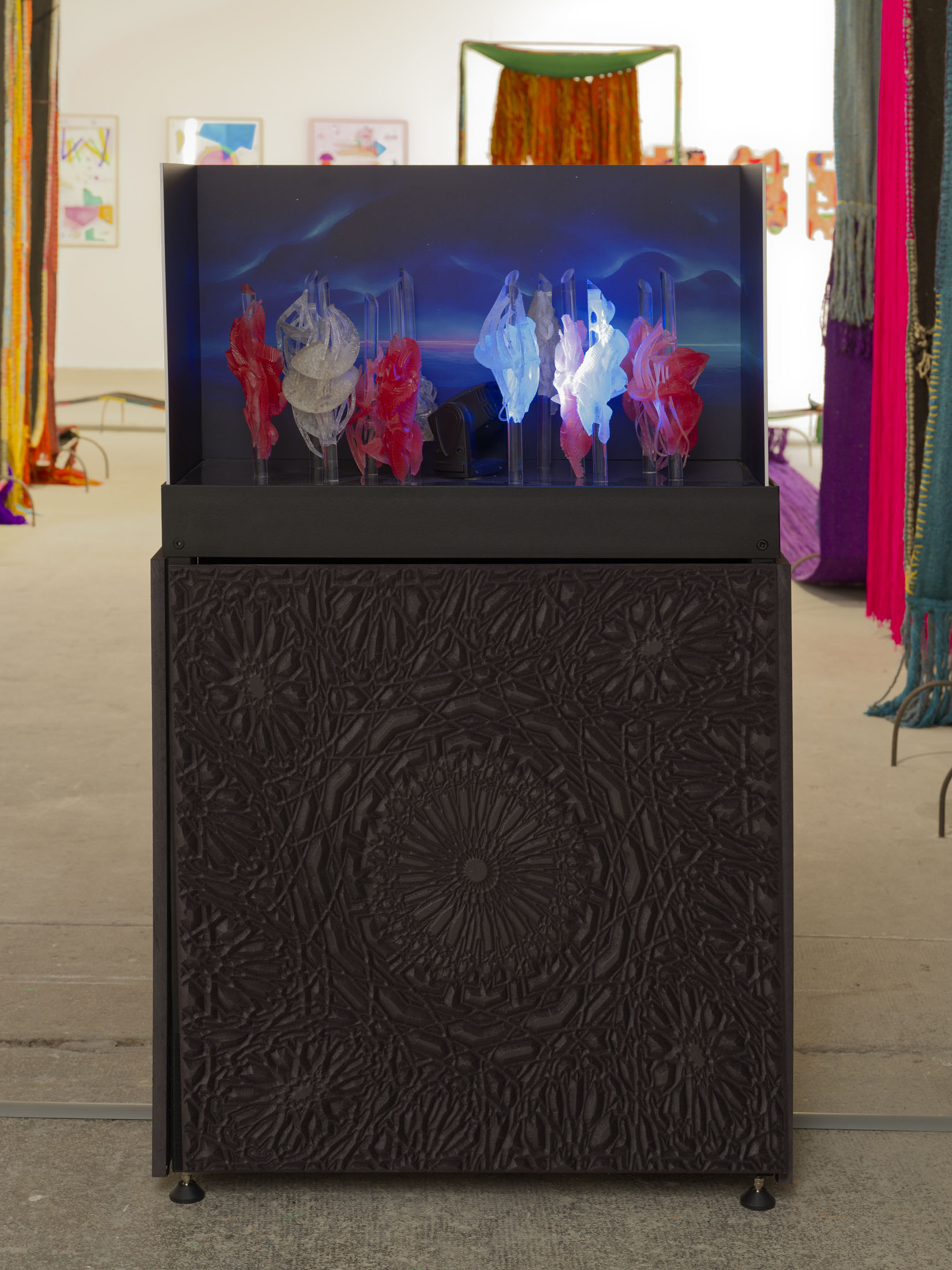 The Pulsar exhibition invites us to reflect in depth on the notion of tradition through the works of Mounir Ayache (1991) and Sara Ouhaddou (1986). Although both are rooted in a rich cultural heritage, their approaches show markedly different interpretations, with one reinventing the very concept of tradition, and the other ensuring the continuance of ancestral knowledge. Their works resonate with philosophical questioning around collective memory, the persistence of knowledge and the emergence of new cultural forms. At the heart of the exhibition is a new work made by 4 hands, entitled Pulsar – a reference to the heart of a fallen star that continues to emit light – bridging the gap between the practices of these two artists.