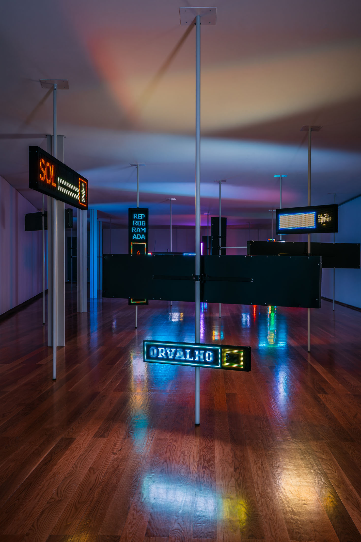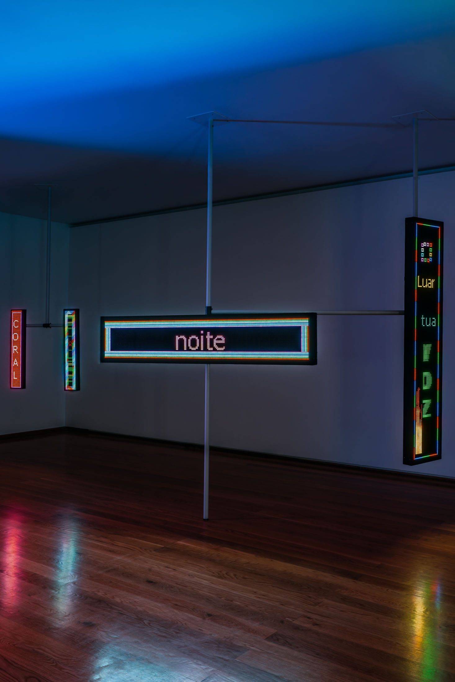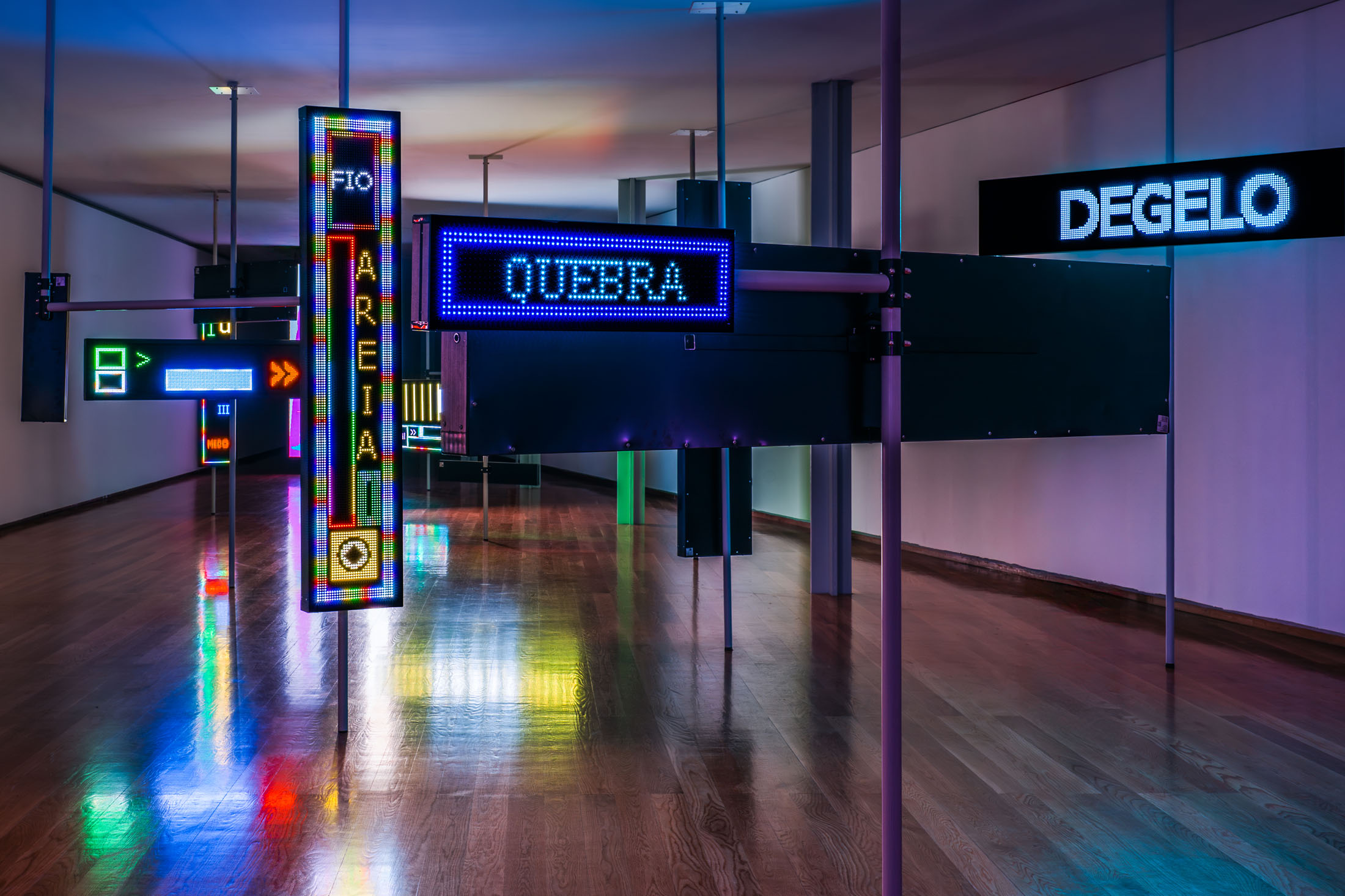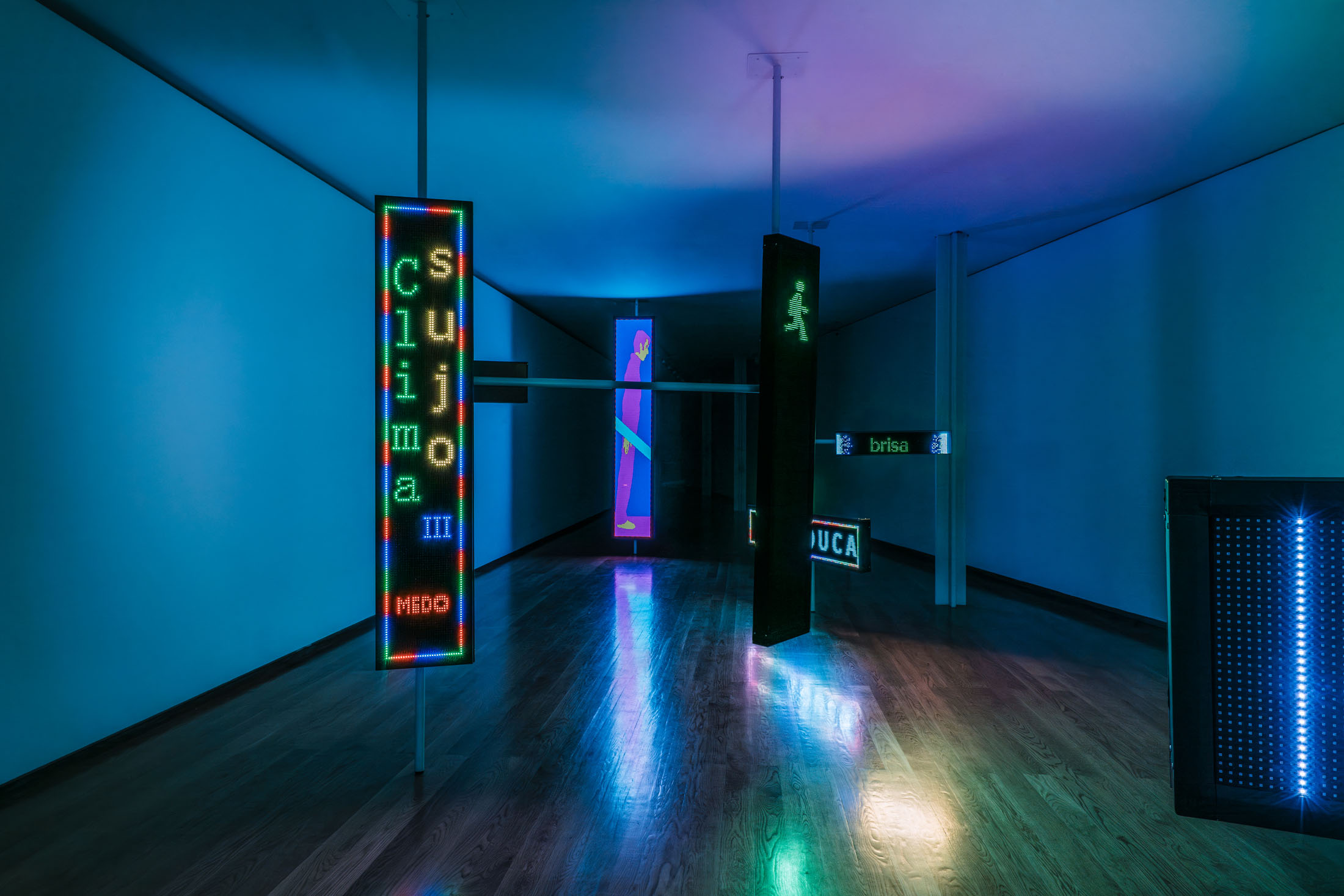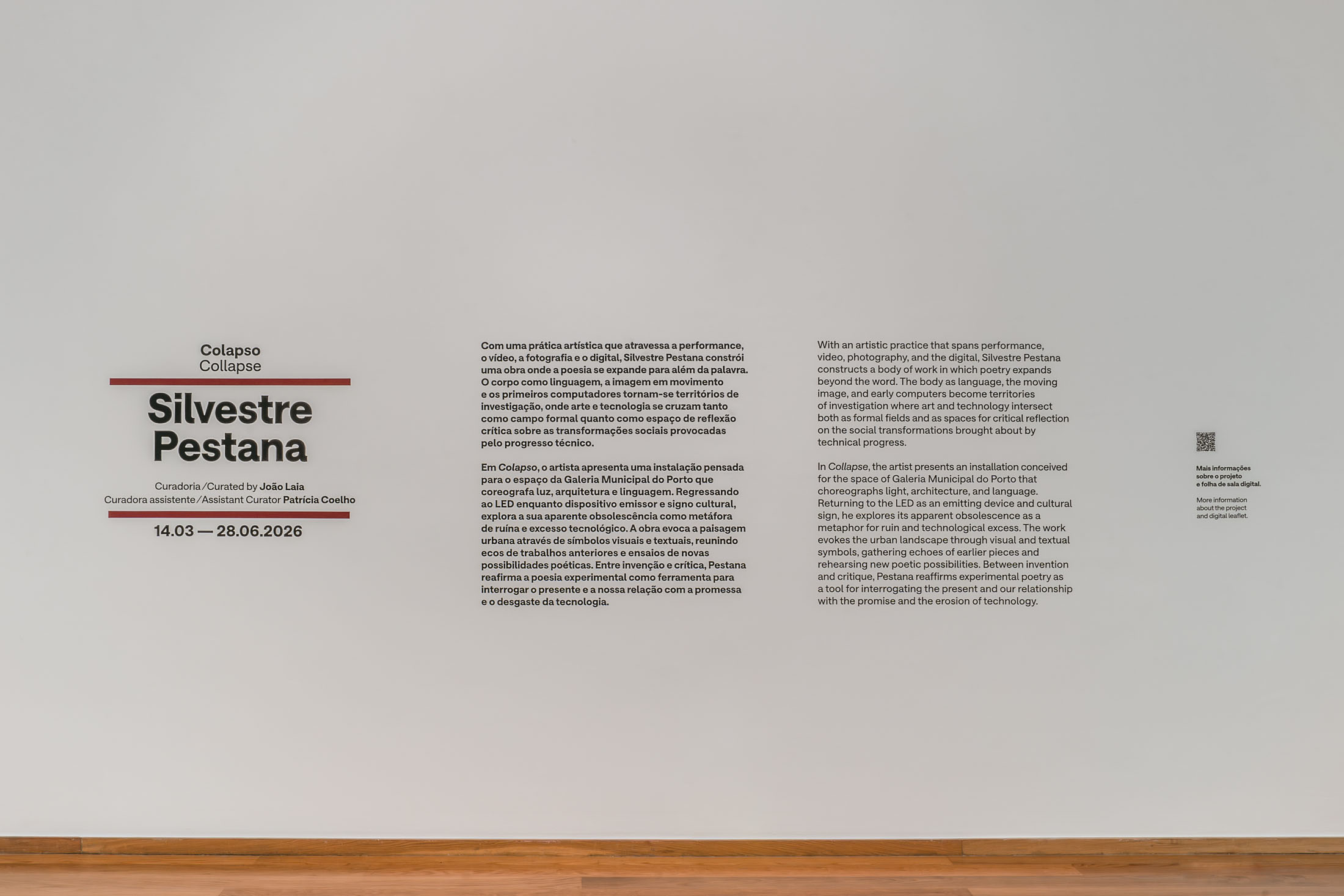 In Collapse, the artist presents an installation conceived for the space of Galeria Municipal do Porto that choreographs light, architecture, and language. Returning to the LED as an emitting device and cultural sign, he explores its apparent obsolescence as a metaphor for ruin and technological excess. The work evokes the urban landscape through visual and textual symbols, gathering echoes of earlier pieces and rehearsing new poetic possibilities. Between invention and critique, Pestana reaffirms experimental poetry as a tool for interrogating the present and our relationship with the promise and the erosion of technology.