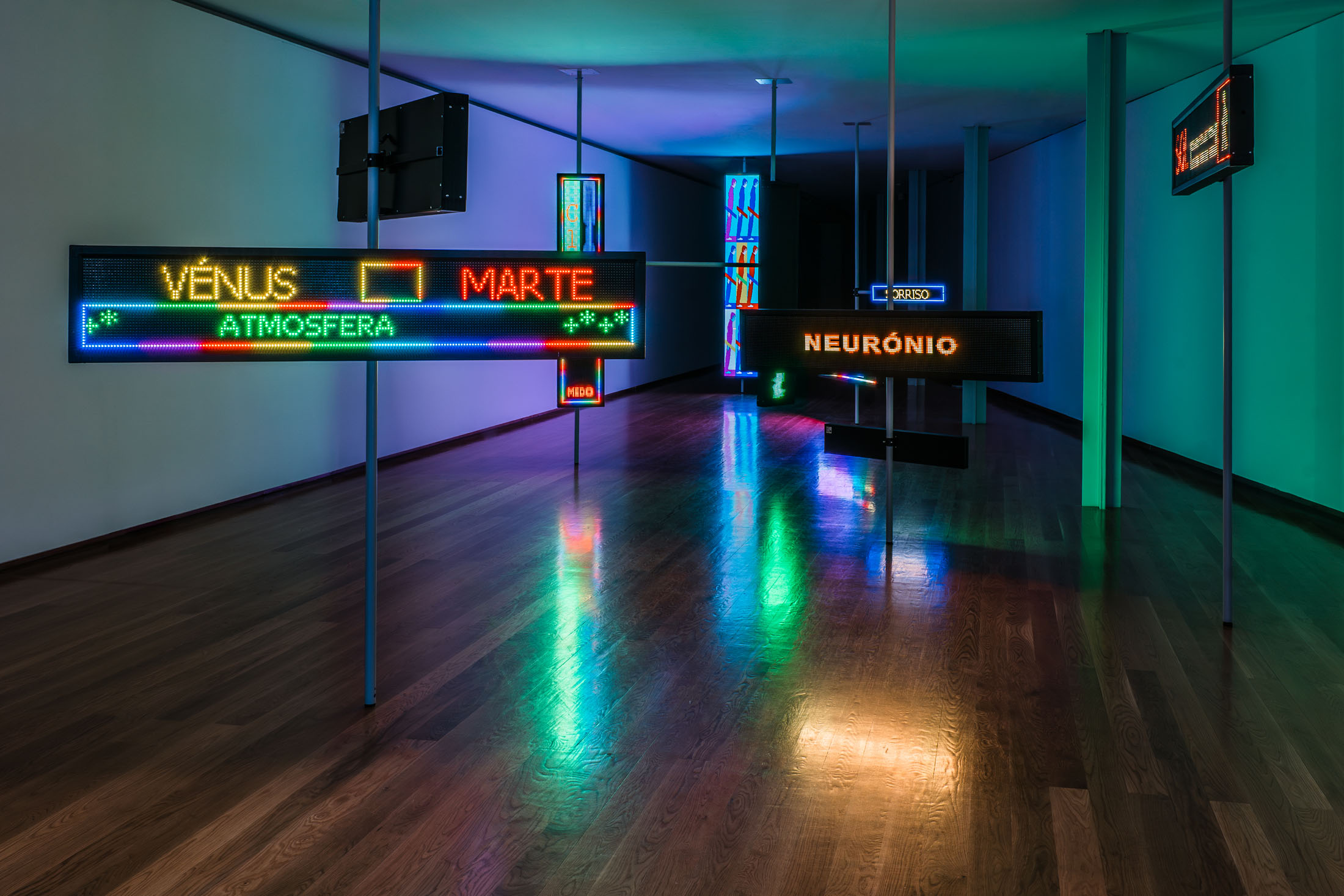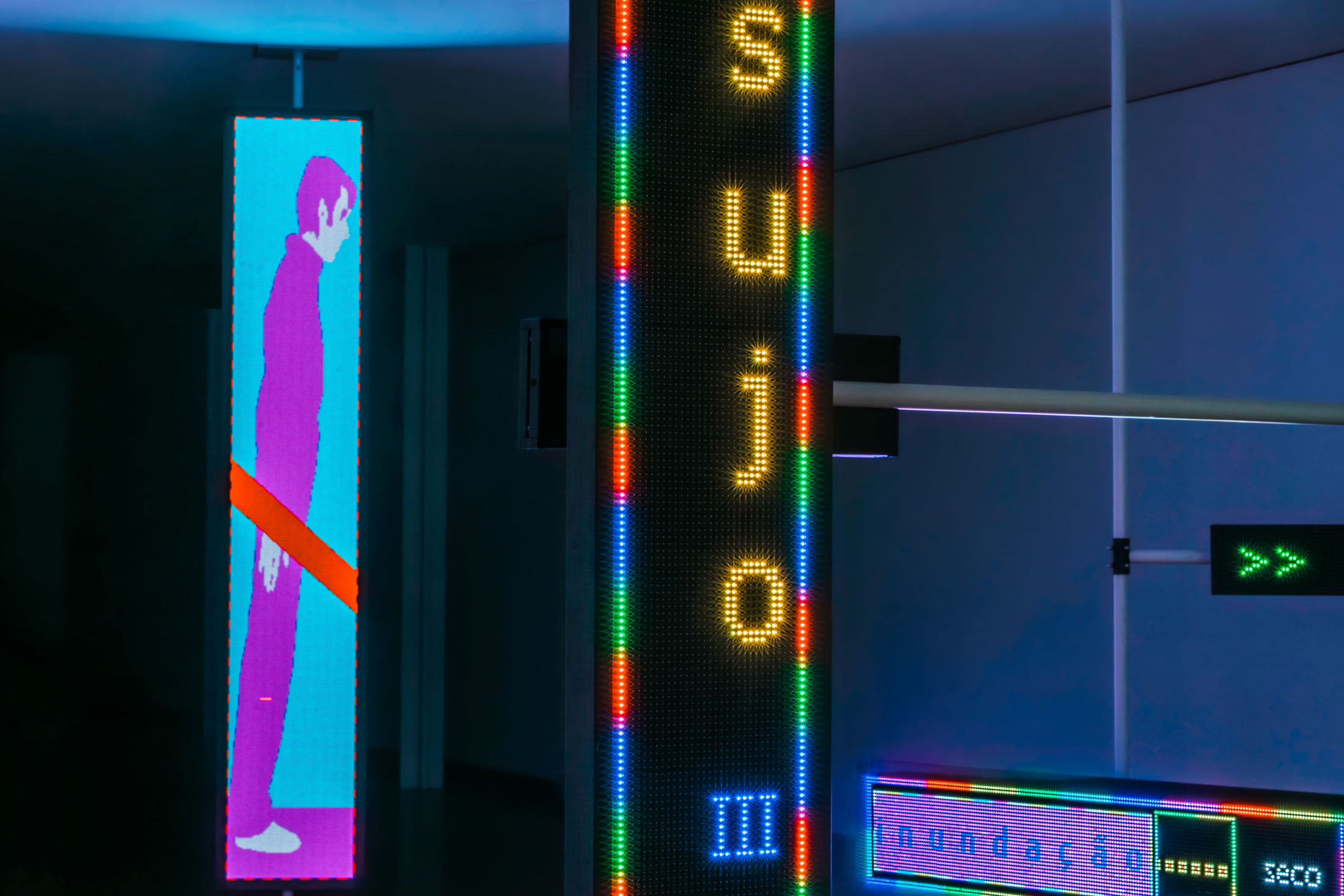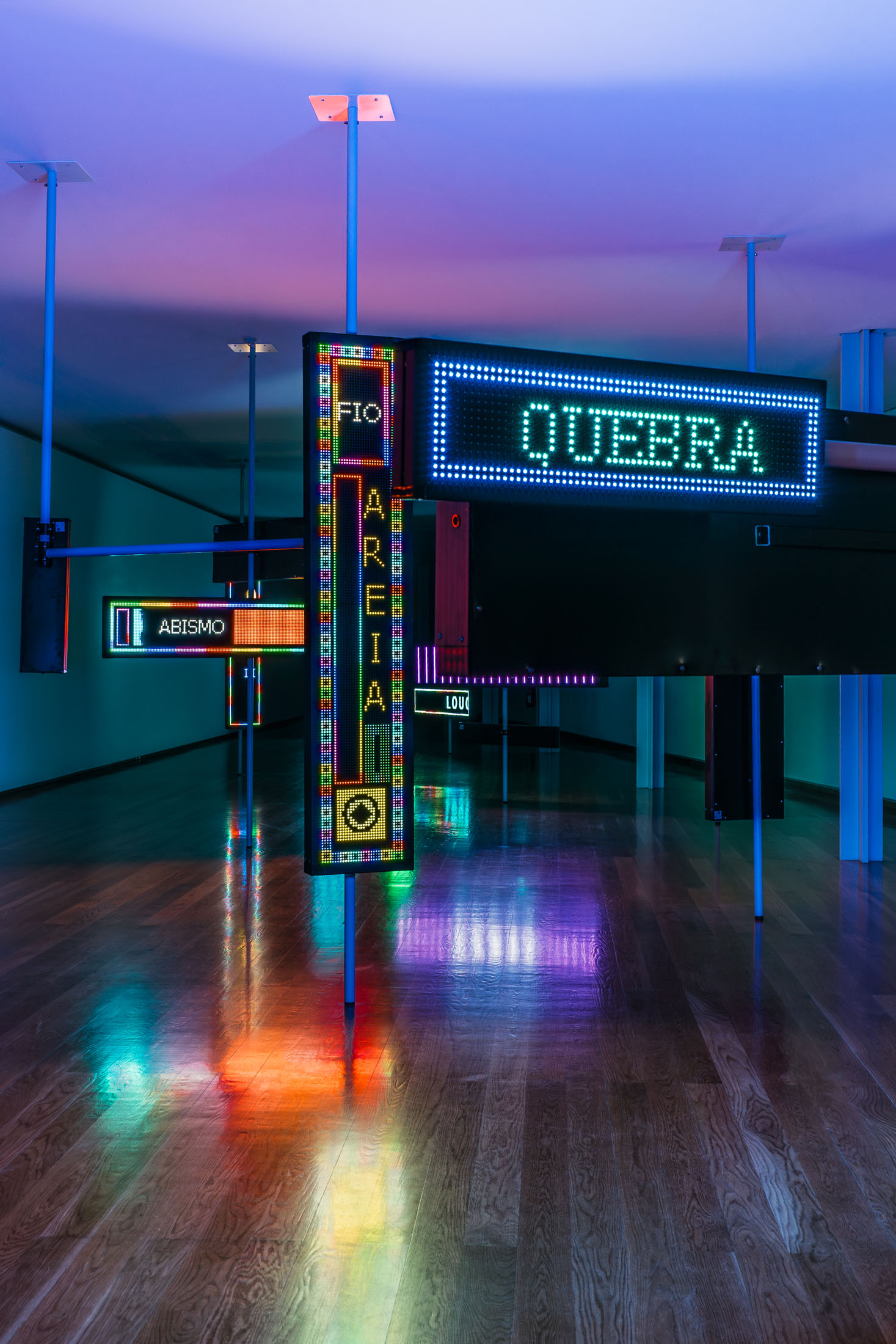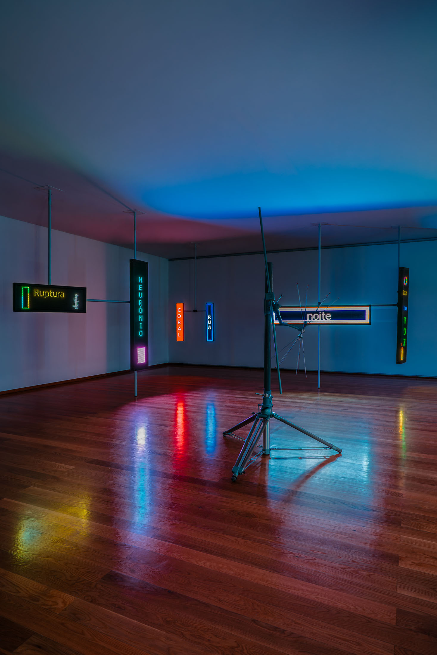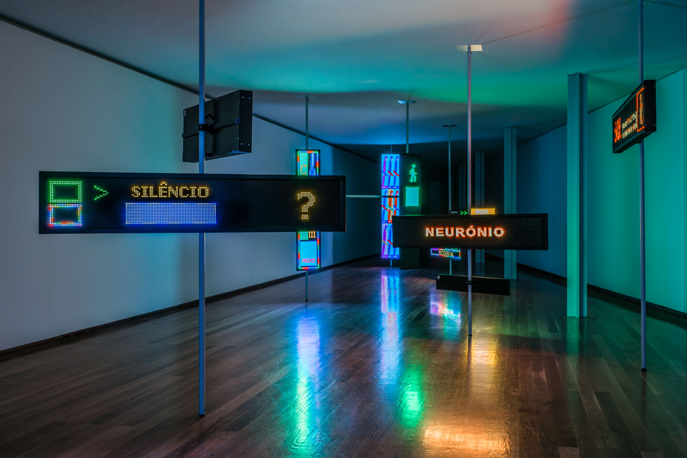 In Collapse, the artist presents an installation conceived for the space of Galeria Municipal do Porto that choreographs light, architecture, and language. Returning to the LED as an emitting device and cultural sign, he explores its apparent obsolescence as a metaphor for ruin and technological excess. The work evokes the urban landscape through visual and textual symbols, gathering echoes of earlier pieces and rehearsing new poetic possibilities. Between invention and critique, Pestana reaffirms experimental poetry as a tool for interrogating the present and our relationship with the promise and the erosion of technology.