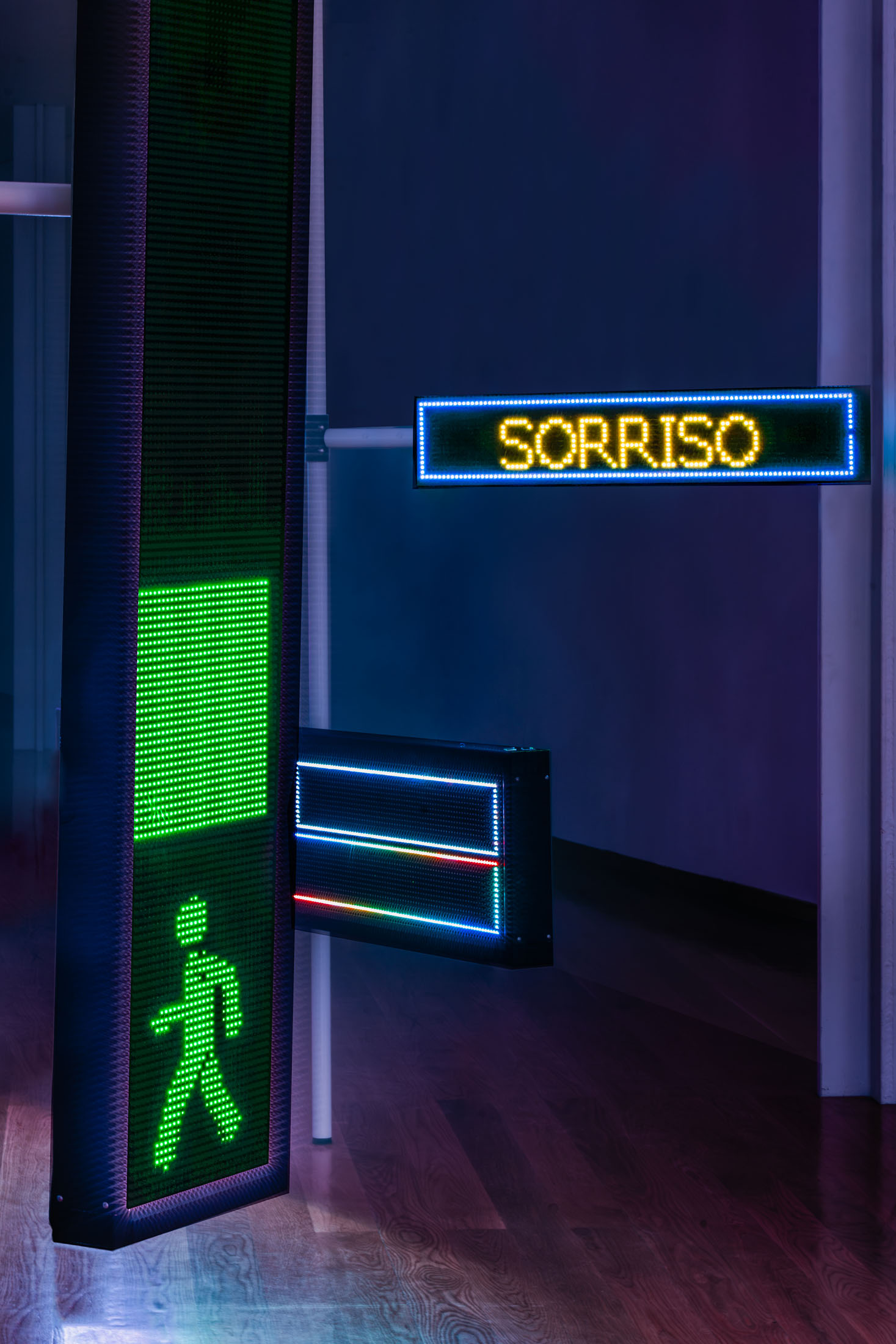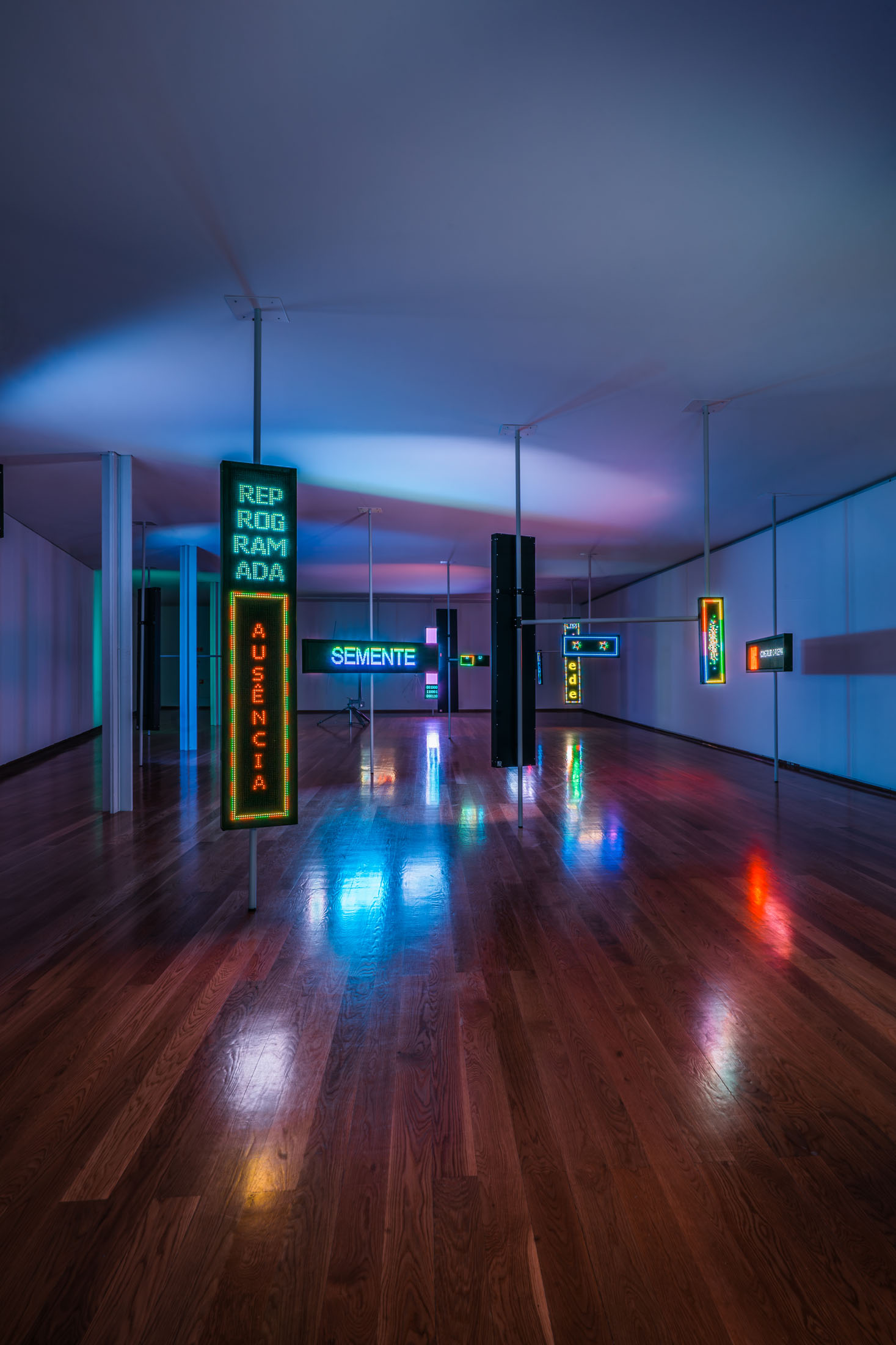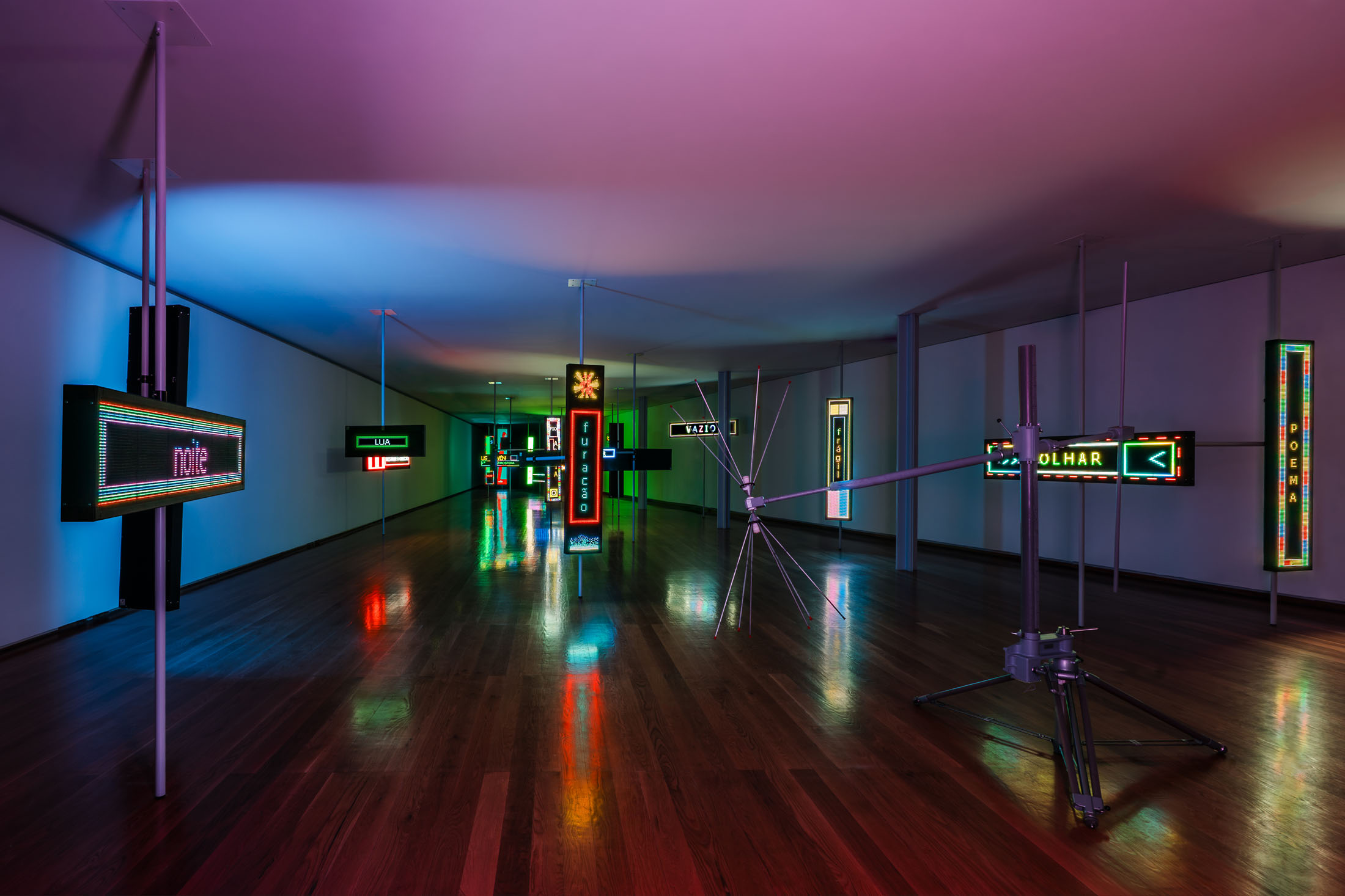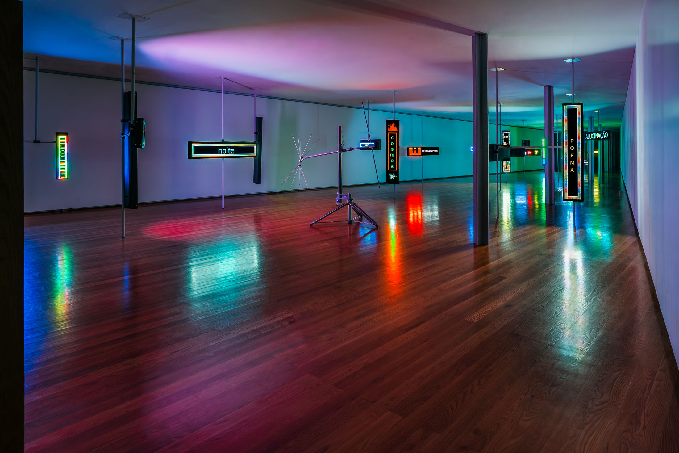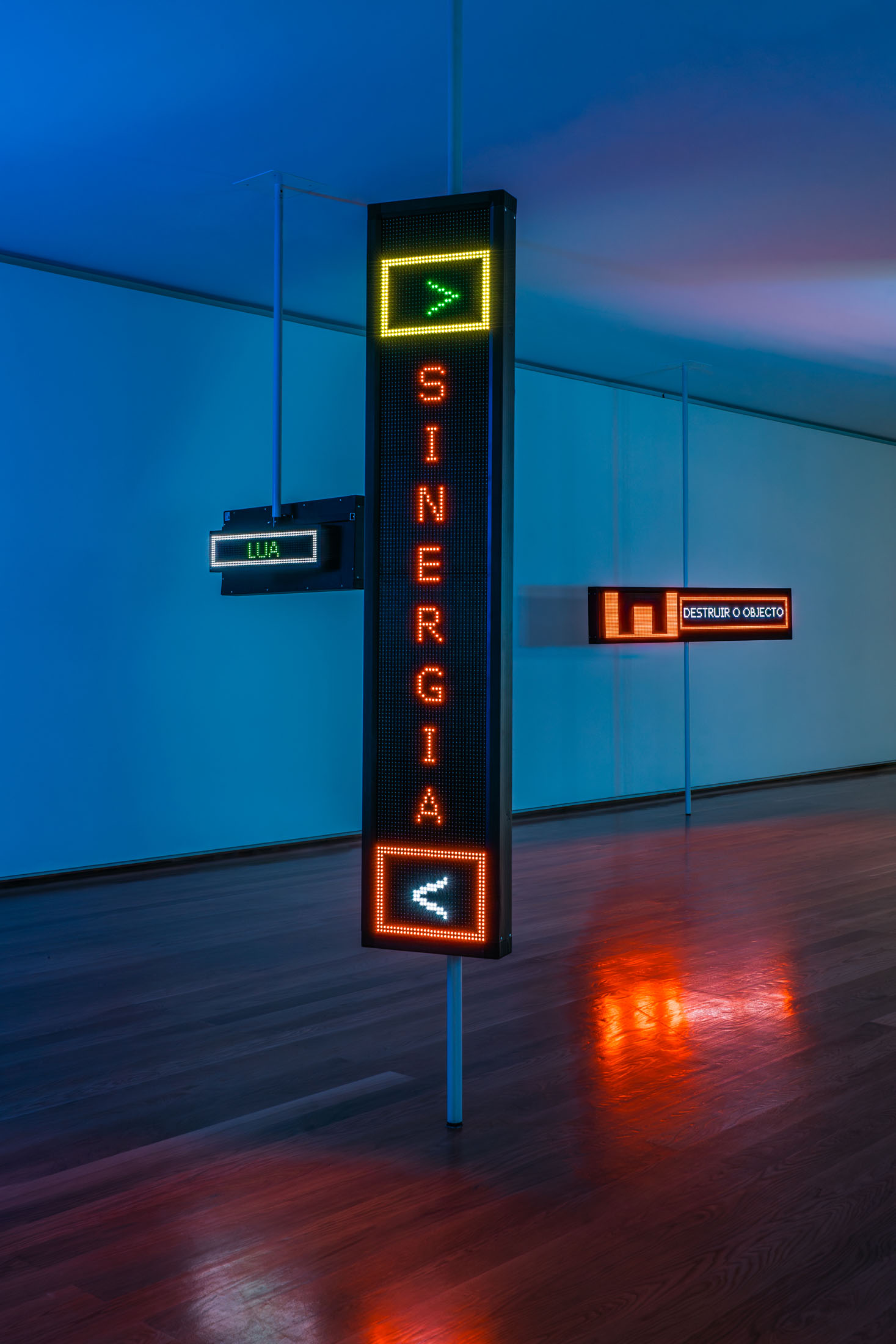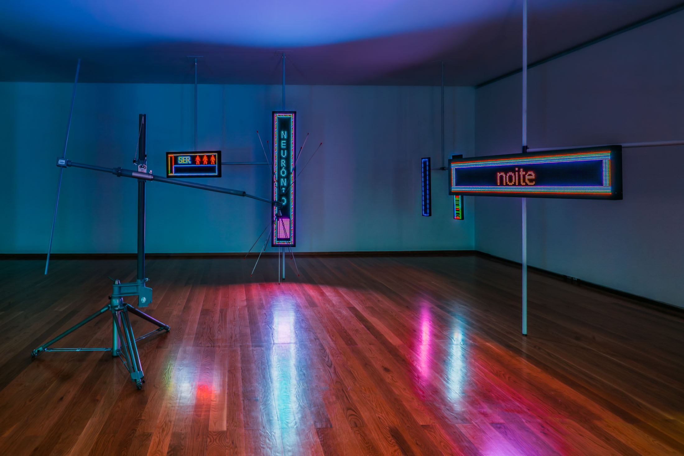 In Collapse, the artist presents an installation conceived for the space of Galeria Municipal do Porto that choreographs light, architecture, and language. Returning to the LED as an emitting device and cultural sign, he explores its apparent obsolescence as a metaphor for ruin and technological excess. The work evokes the urban landscape through visual and textual symbols, gathering echoes of earlier pieces and rehearsing new poetic possibilities. Between invention and critique, Pestana reaffirms experimental poetry as a tool for interrogating the present and our relationship with the promise and the erosion of technology.