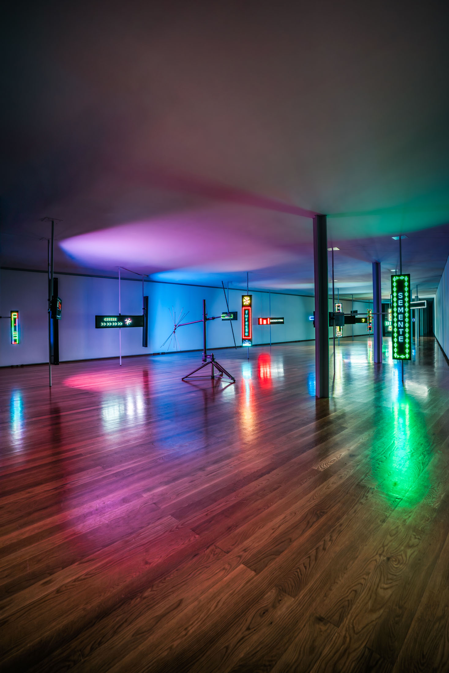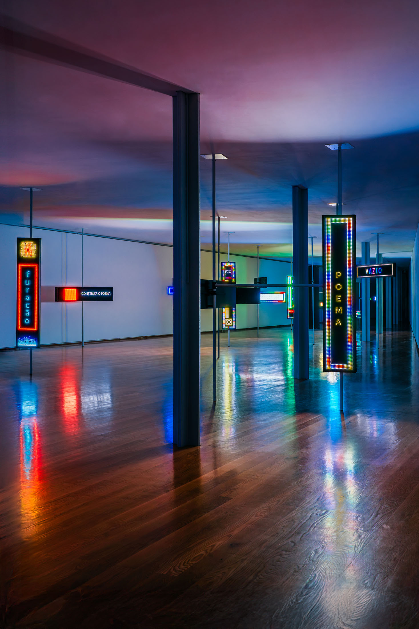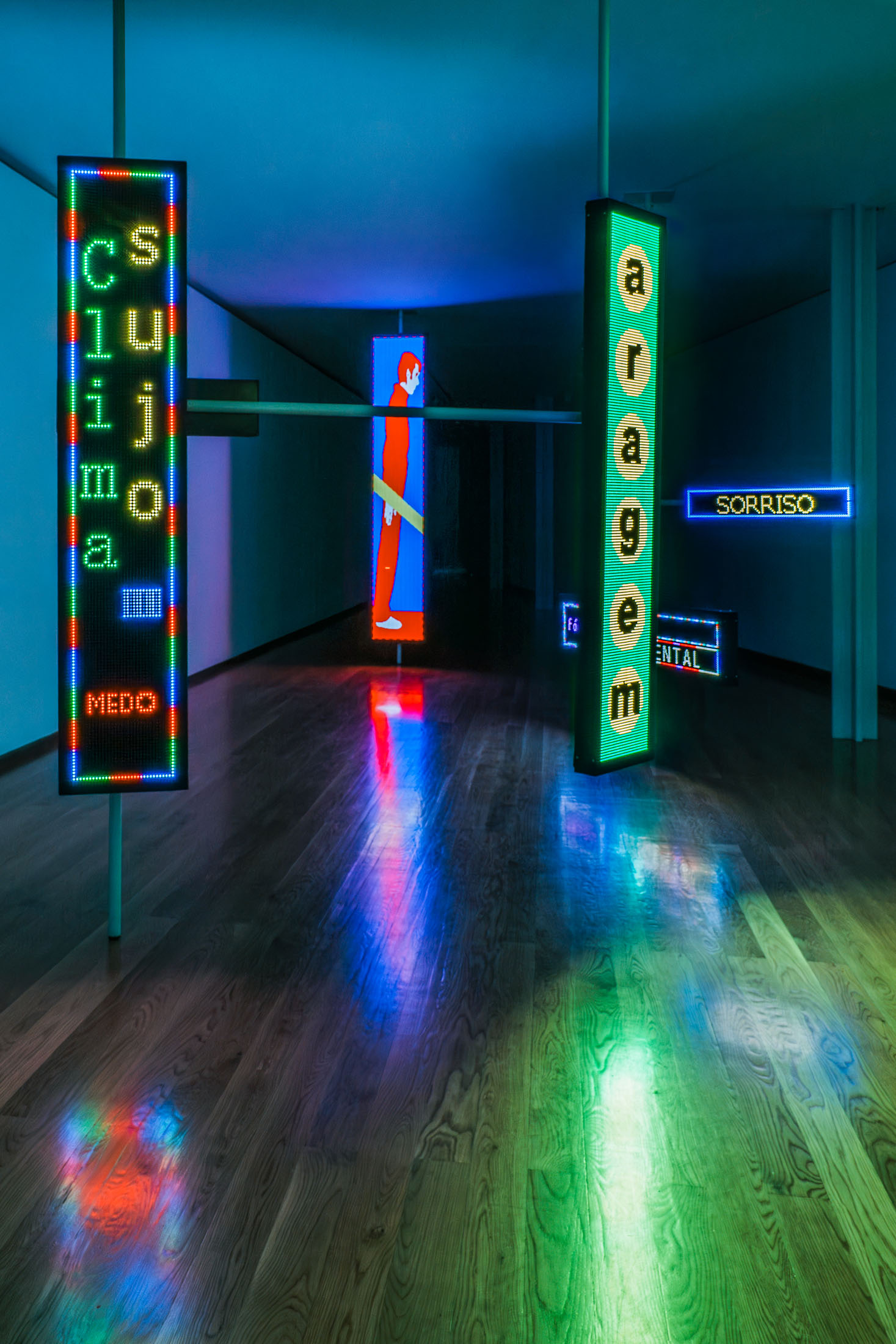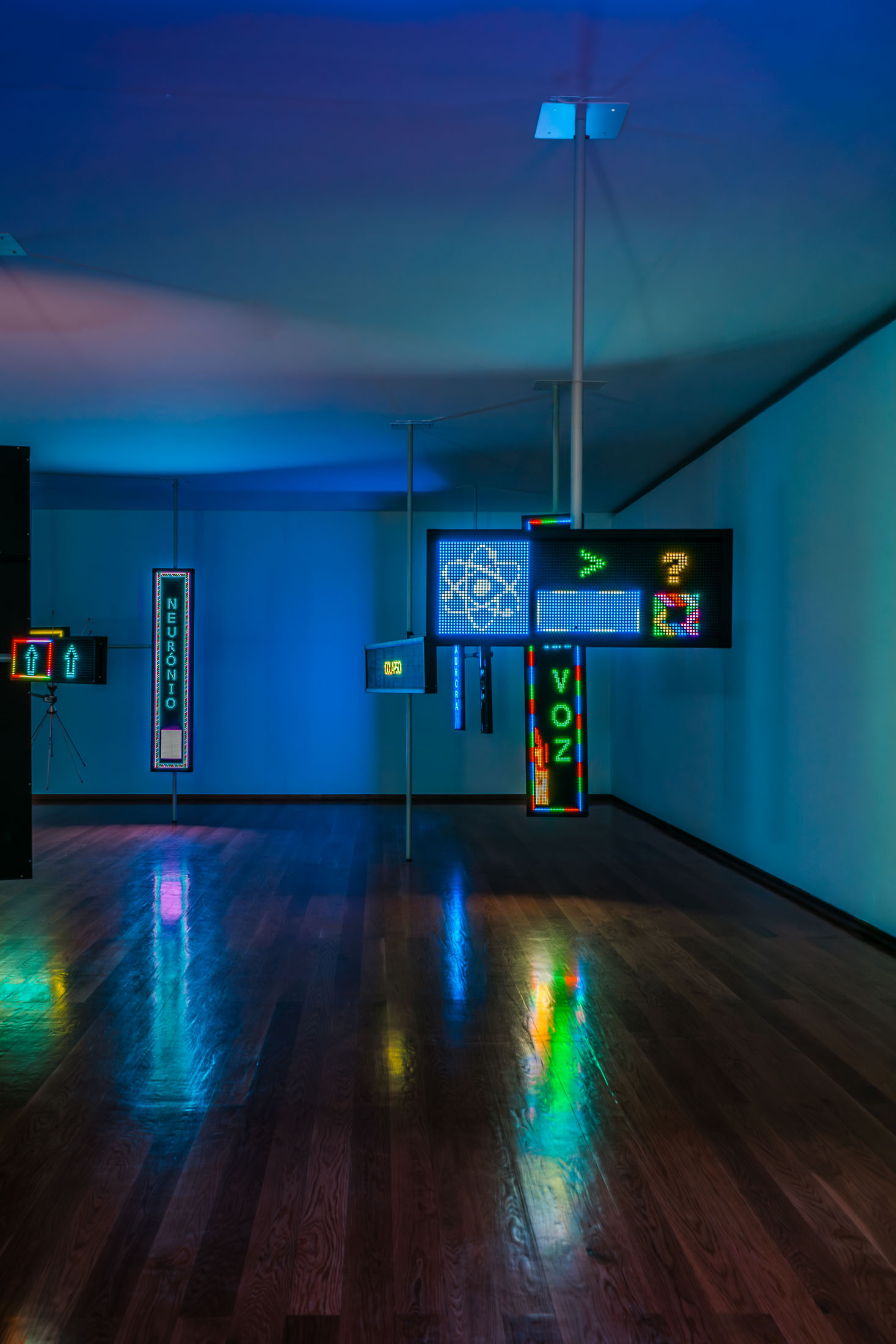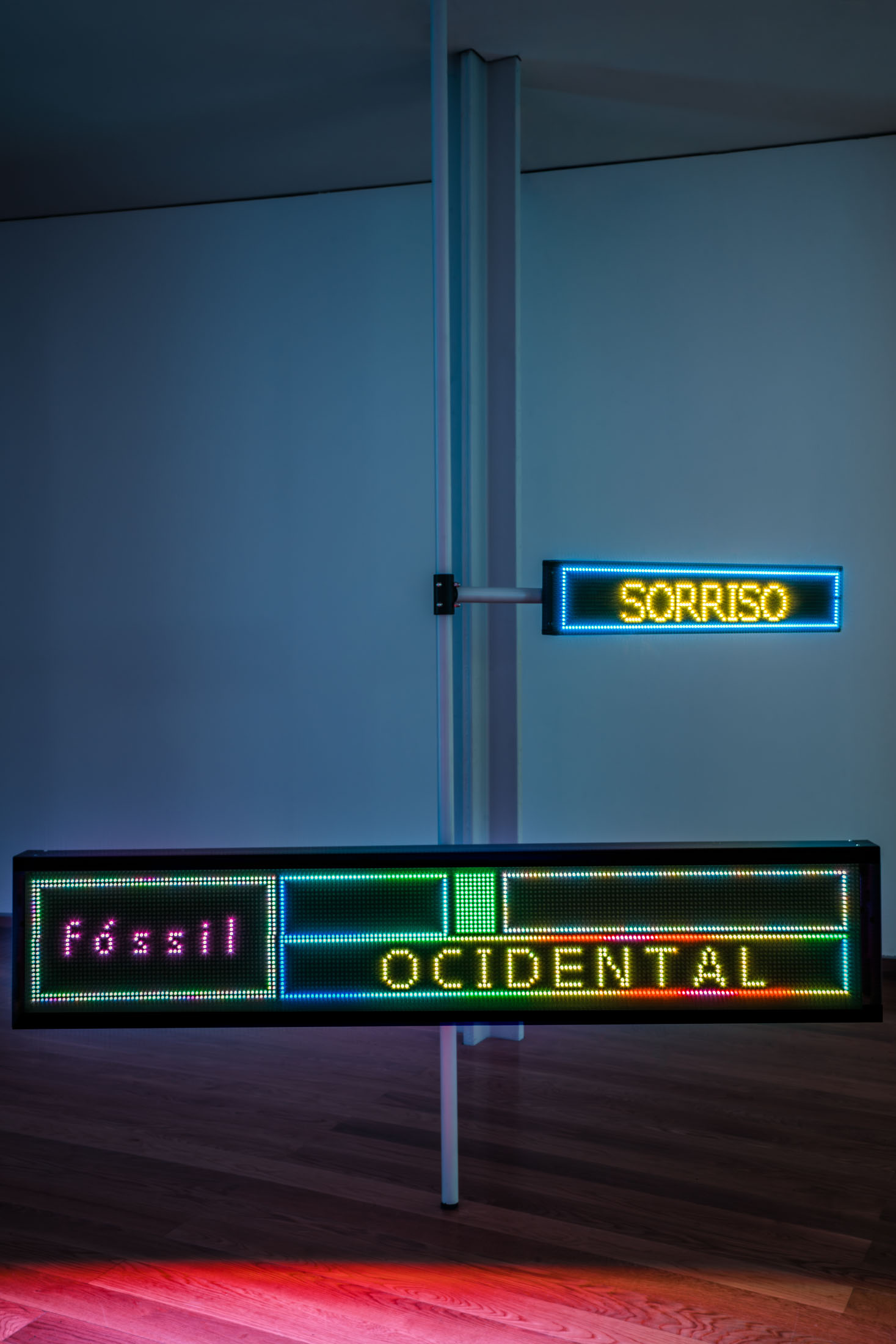 In Collapse, the artist presents an installation conceived for the space of Galeria Municipal do Porto that choreographs light, architecture, and language. Returning to the LED as an emitting device and cultural sign, he explores its apparent obsolescence as a metaphor for ruin and technological excess. The work evokes the urban landscape through visual and textual symbols, gathering echoes of earlier pieces and rehearsing new poetic possibilities. Between invention and critique, Pestana reaffirms experimental poetry as a tool for interrogating the present and our relationship with the promise and the erosion of technology.