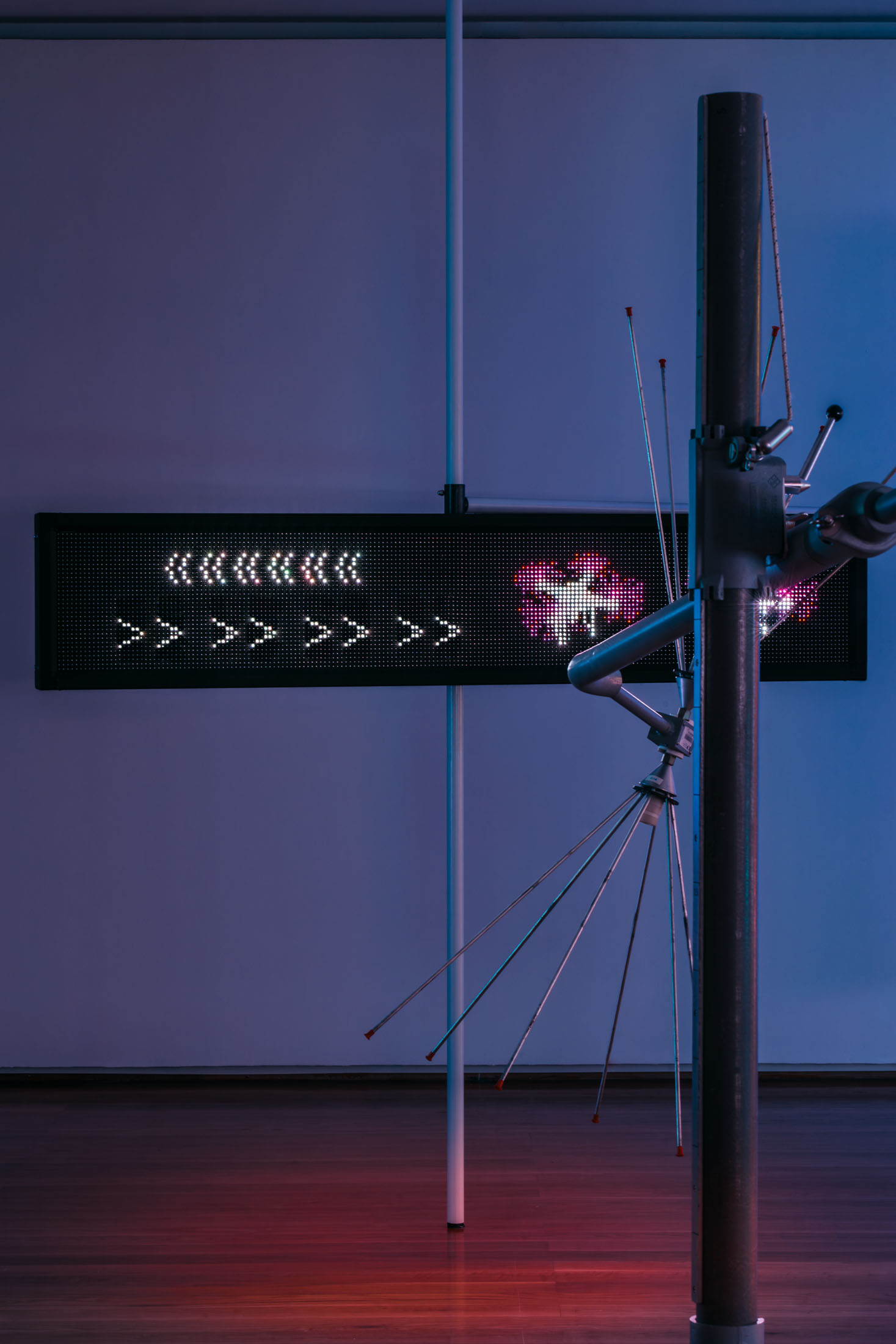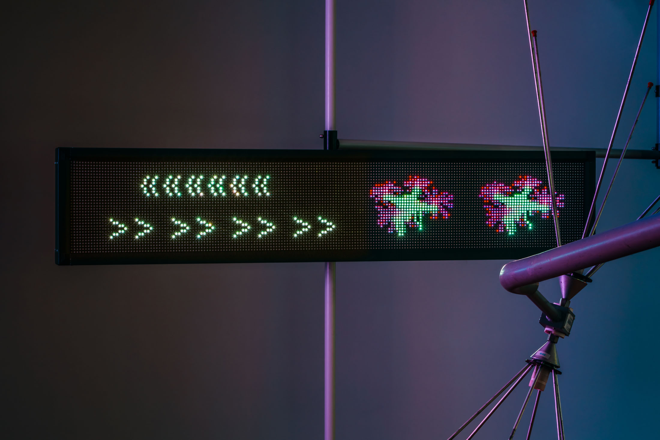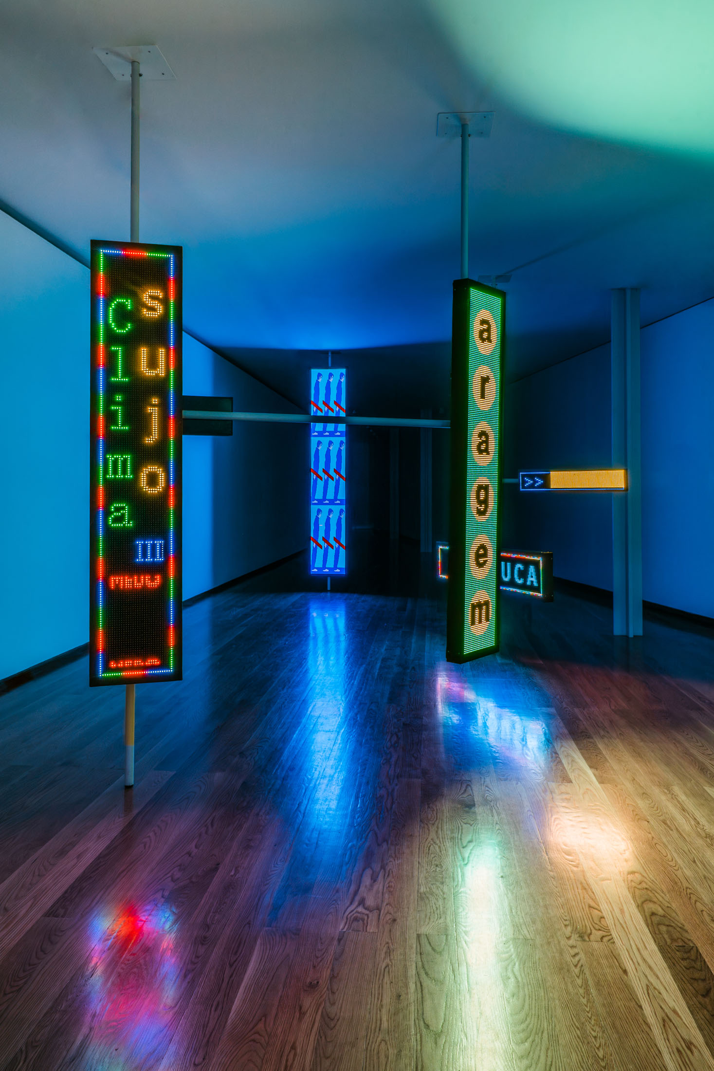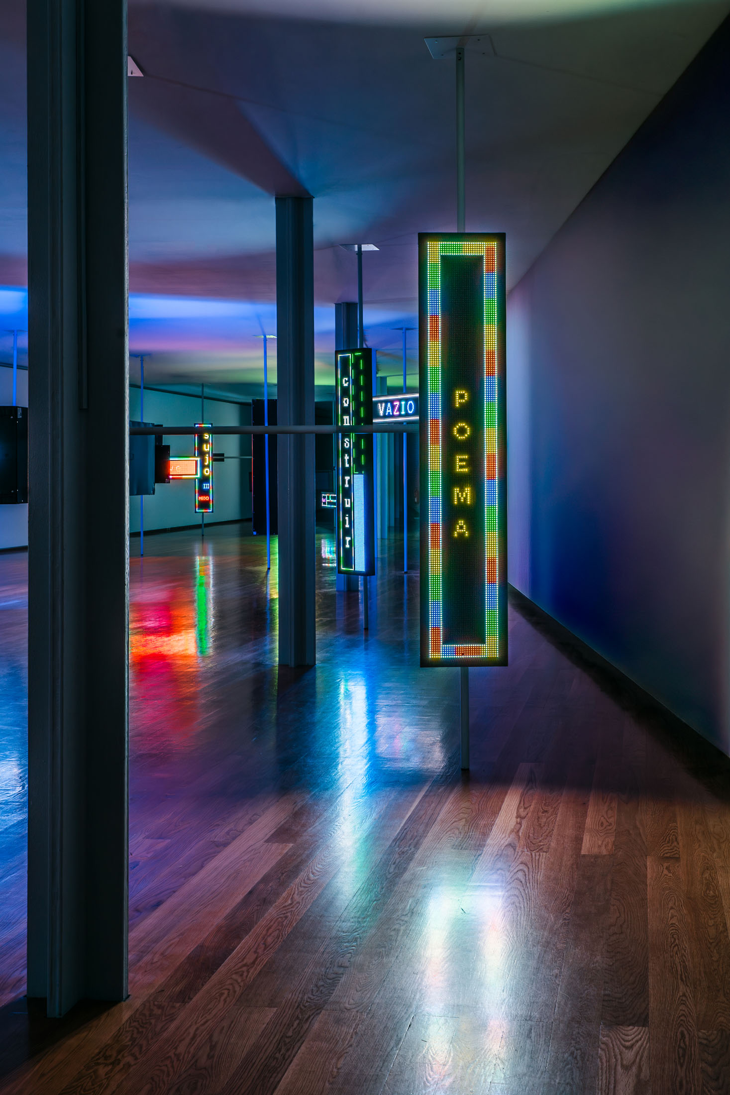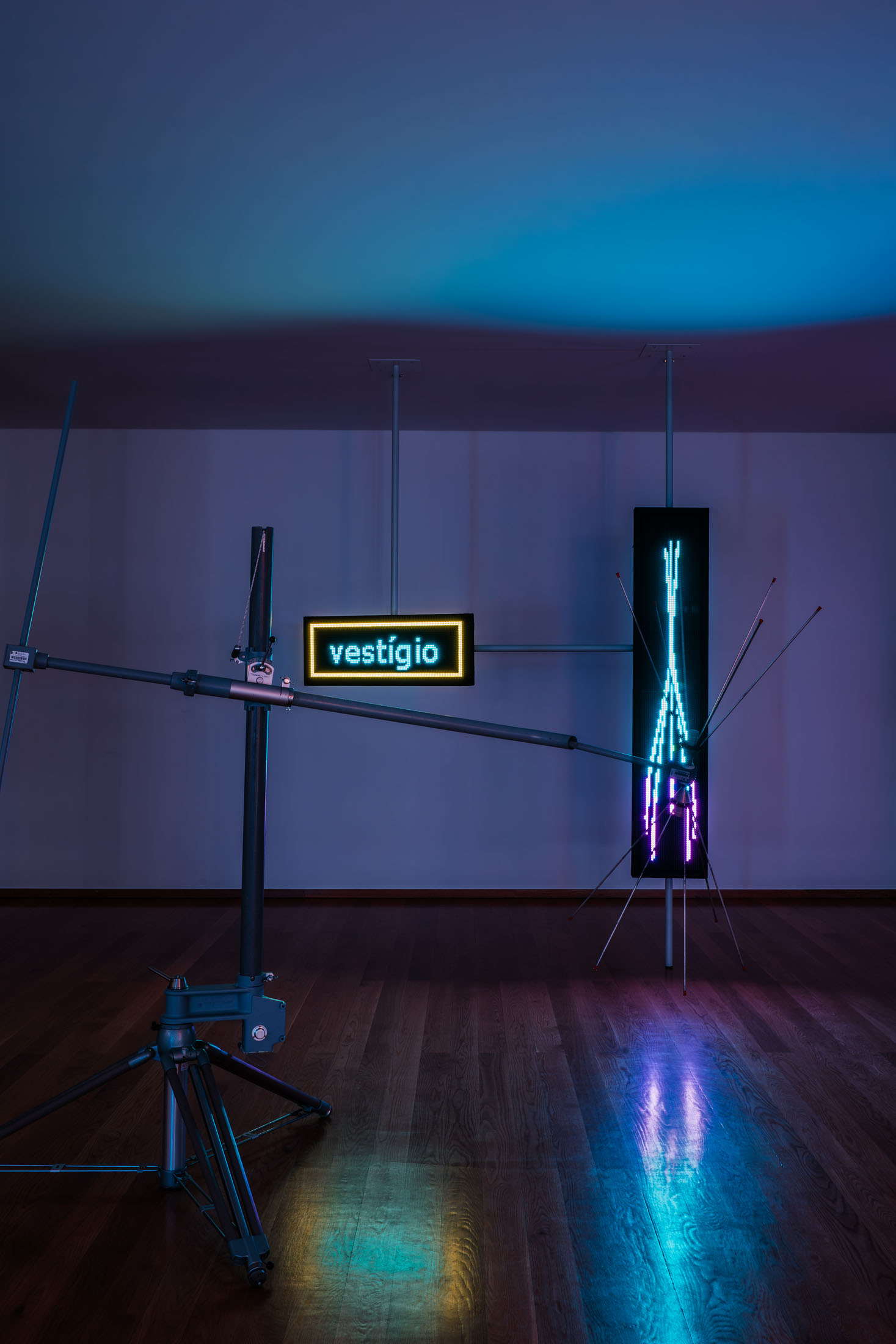 In Collapse, the artist presents an installation conceived for the space of Galeria Municipal do Porto that choreographs light, architecture, and language. Returning to the LED as an emitting device and cultural sign, he explores its apparent obsolescence as a metaphor for ruin and technological excess. The work evokes the urban landscape through visual and textual symbols, gathering echoes of earlier pieces and rehearsing new poetic possibilities. Between invention and critique, Pestana reaffirms experimental poetry as a tool for interrogating the present and our relationship with the promise and the erosion of technology.