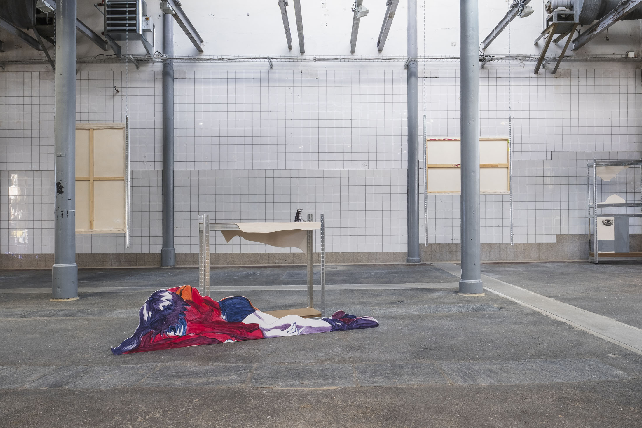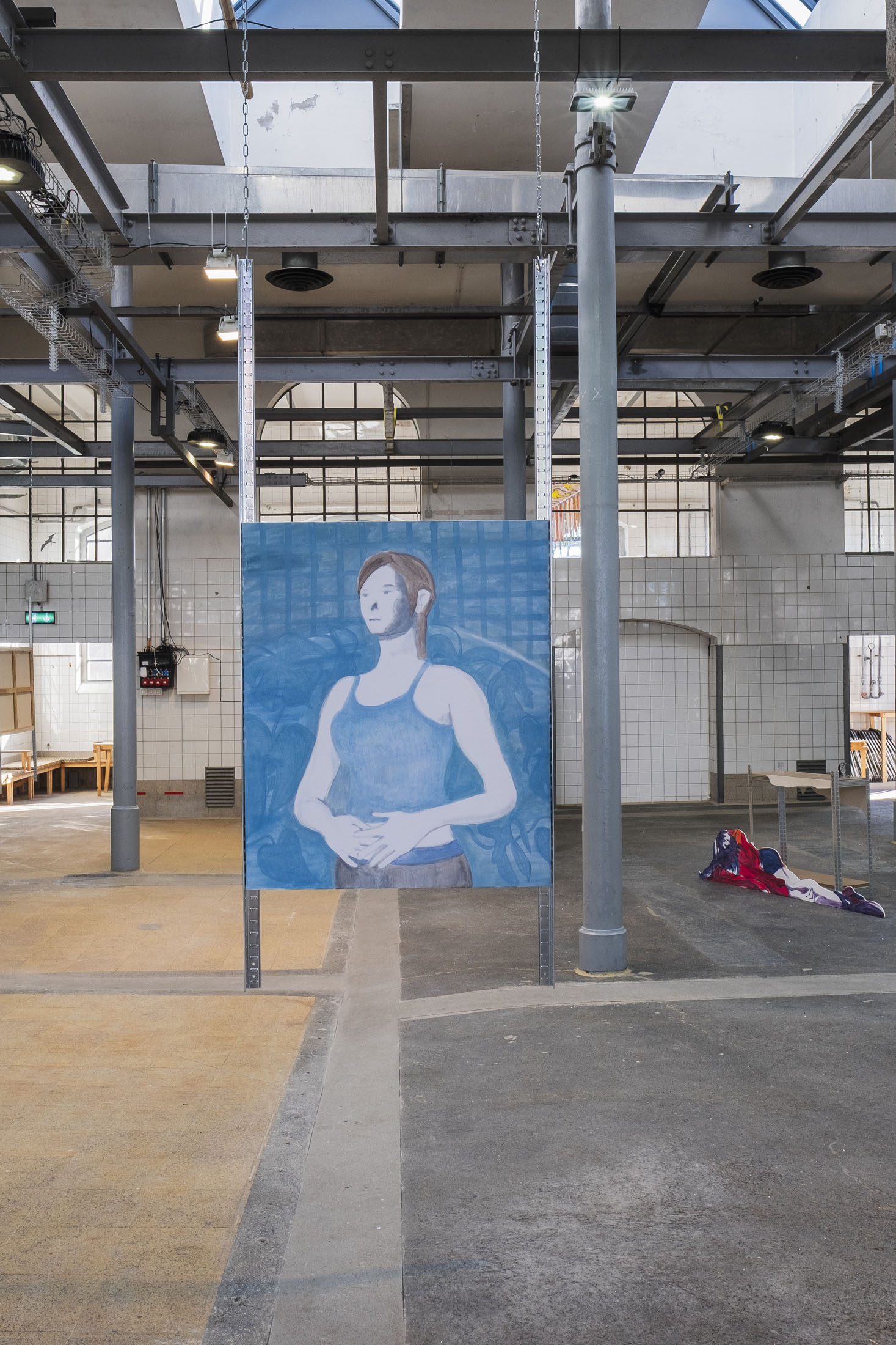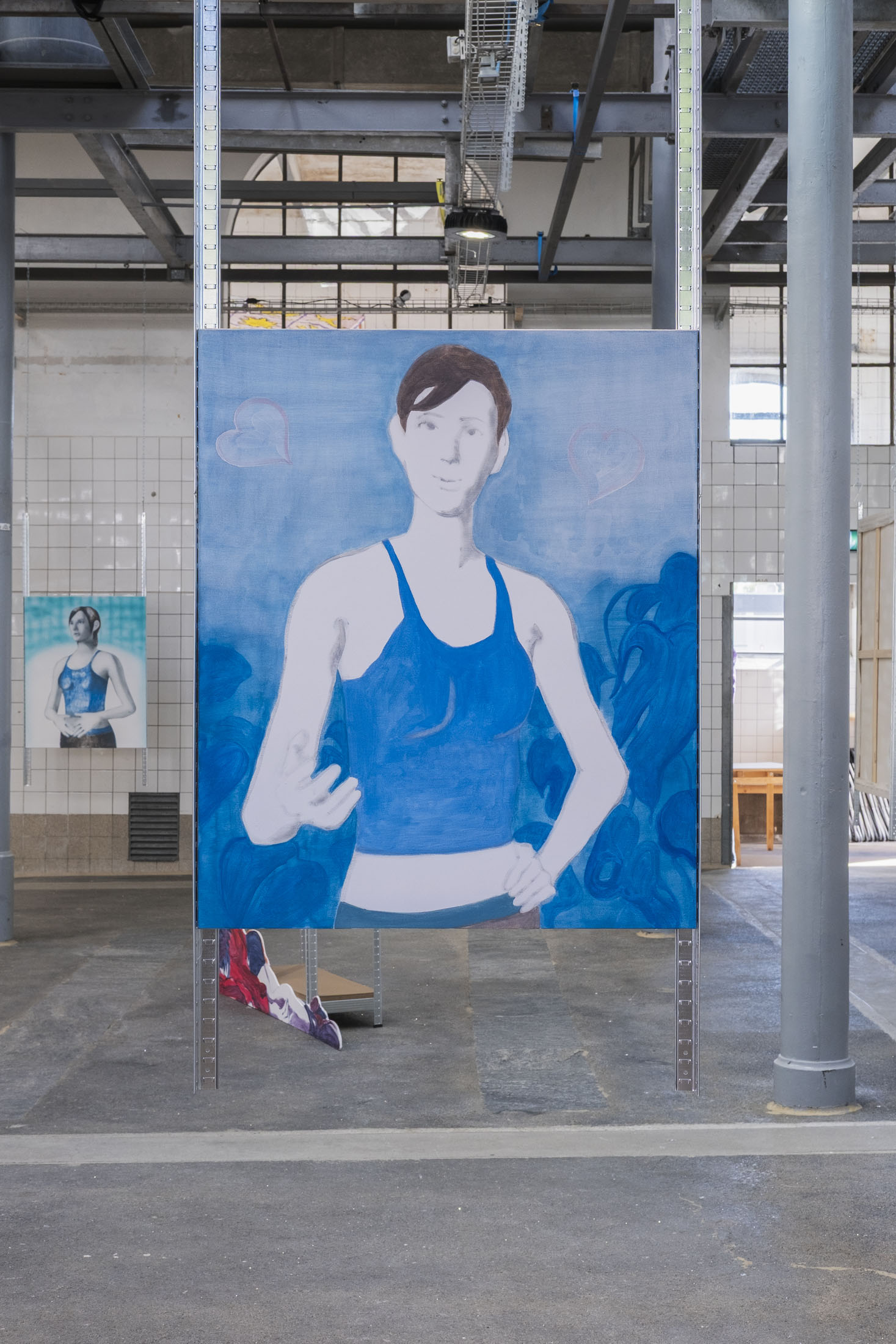 Like a Pokémon arena, the space is structured and carved out by Simone’s paintings, which seem to float. If there were a theme here, it would be repetition. A copy and paste on canvas or wood, evoking the fright felt by the young artist when his precious backup was erased from his Nintendo cartridge by a friend at the time. It was on that day that the beginnings of his research into multiplication were born. How do you represent the memory of players who have now been erased? Here, the characters exist in different ways, sometimes even identically, staring into the distance and clasping their hands over their stomachs. The notion of the double portrait, explored in particular in a quartet wearing skin-tight jumpsuits, refers to the idea of the evolution of video game avatars.