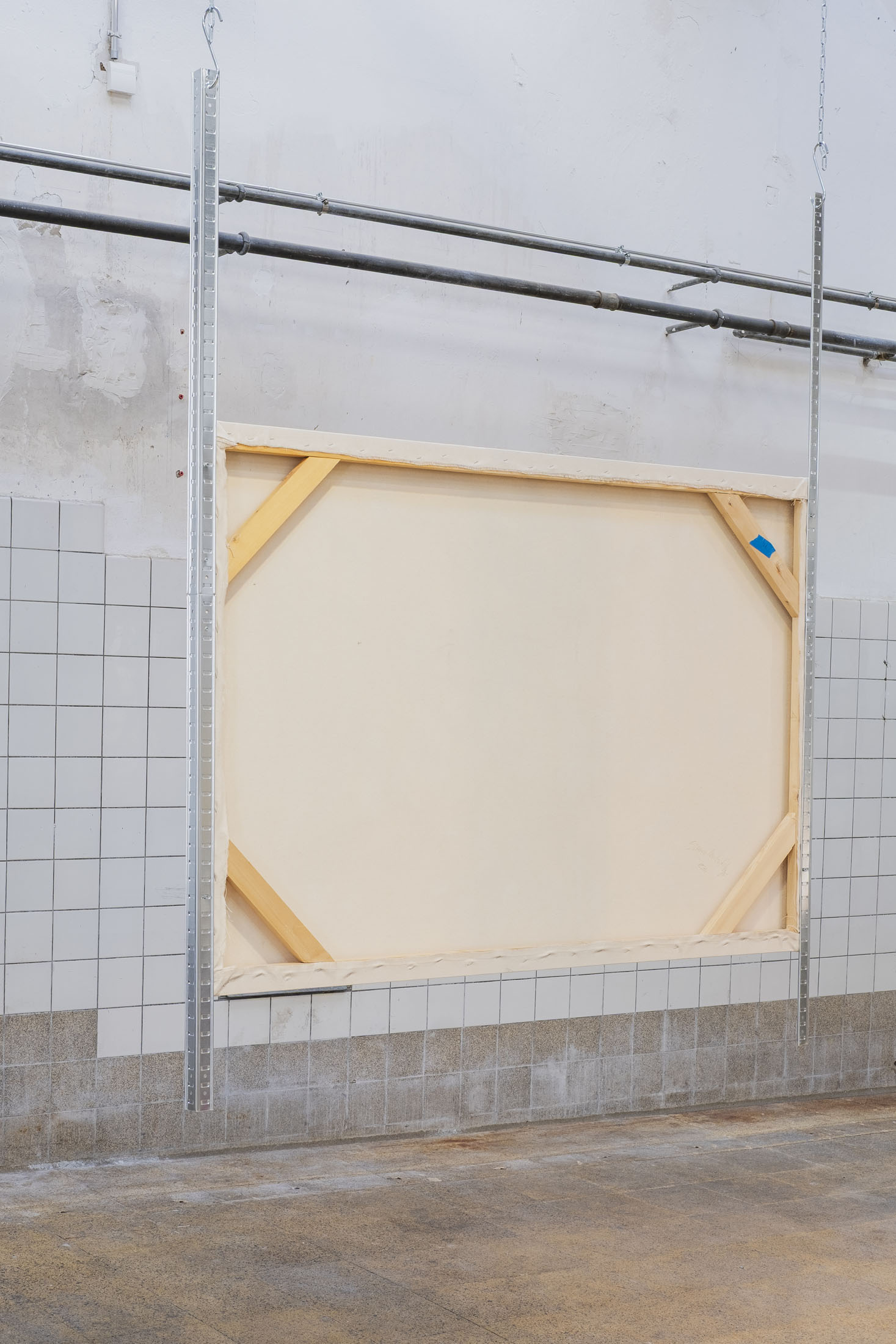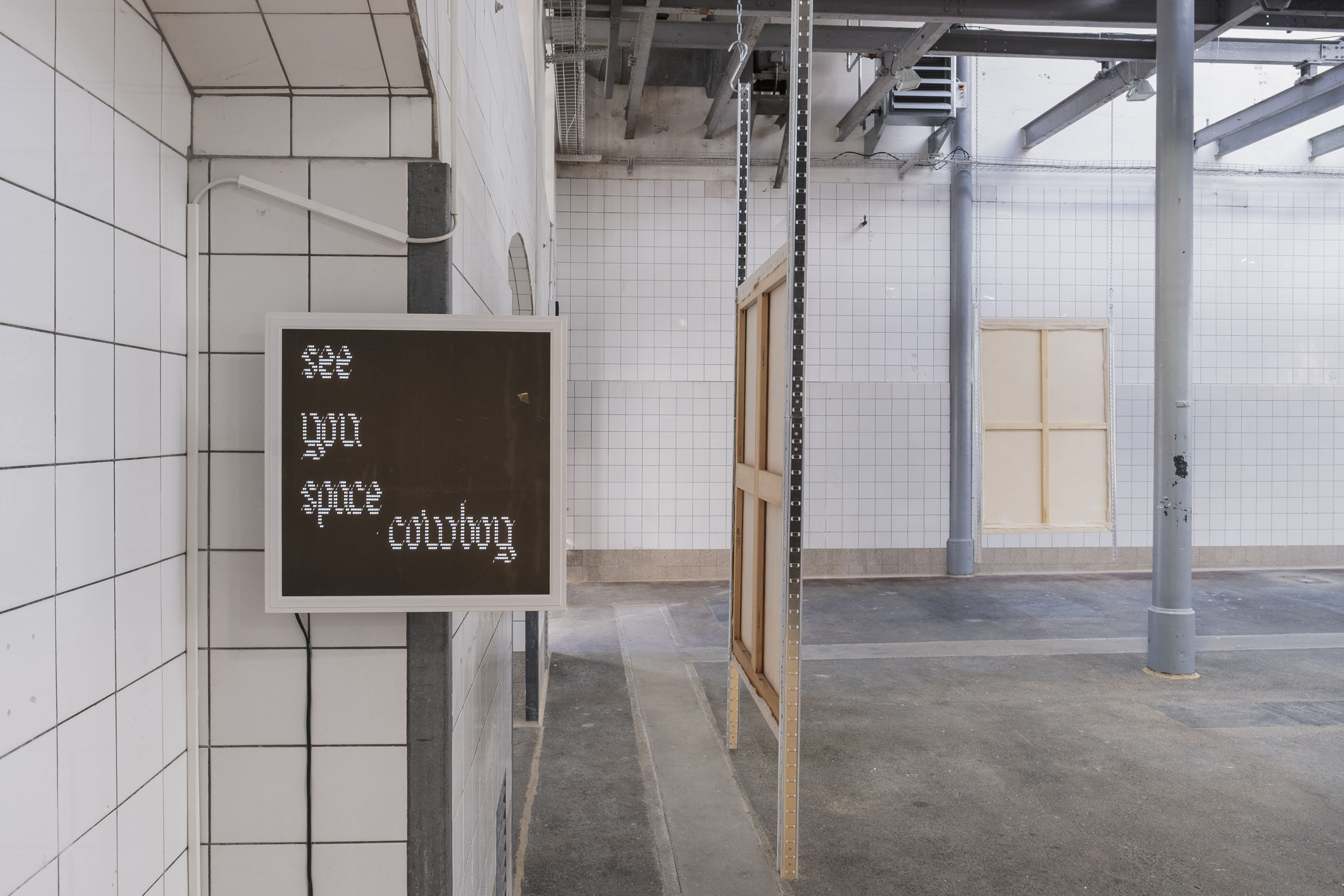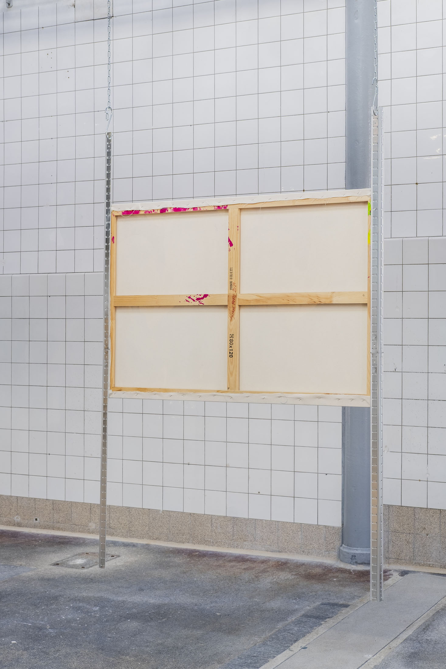 Like a Pokémon arena, the space is structured and carved out by Simone’s paintings, which seem to float. If there were a theme here, it would be repetition. A copy and paste on canvas or wood, evoking the fright felt by the young artist when his precious backup was erased from his Nintendo cartridge by a friend at the time. It was on that day that the beginnings of his research into multiplication were born. How do you represent the memory of players who have now been erased? Here, the characters exist in different ways, sometimes even identically, staring into the distance and clasping their hands over their stomachs. The notion of the double portrait, explored in particular in a quartet wearing skin-tight jumpsuits, refers to the idea of the evolution of video game avatars.