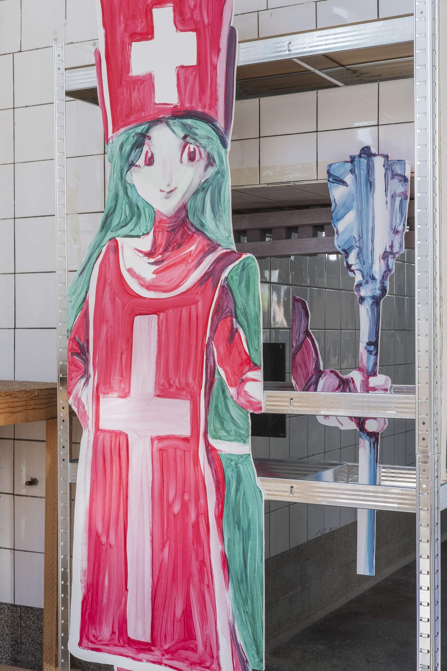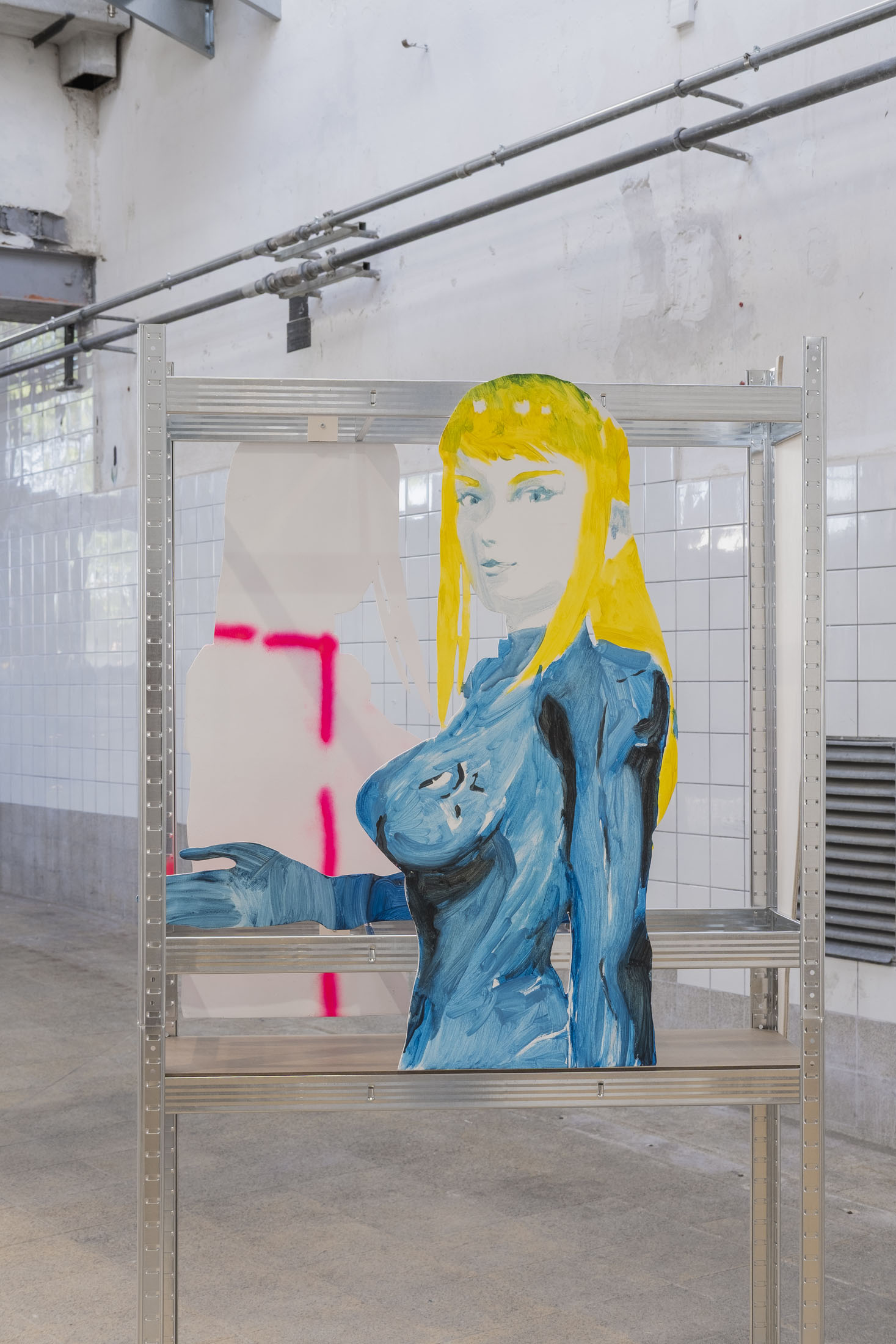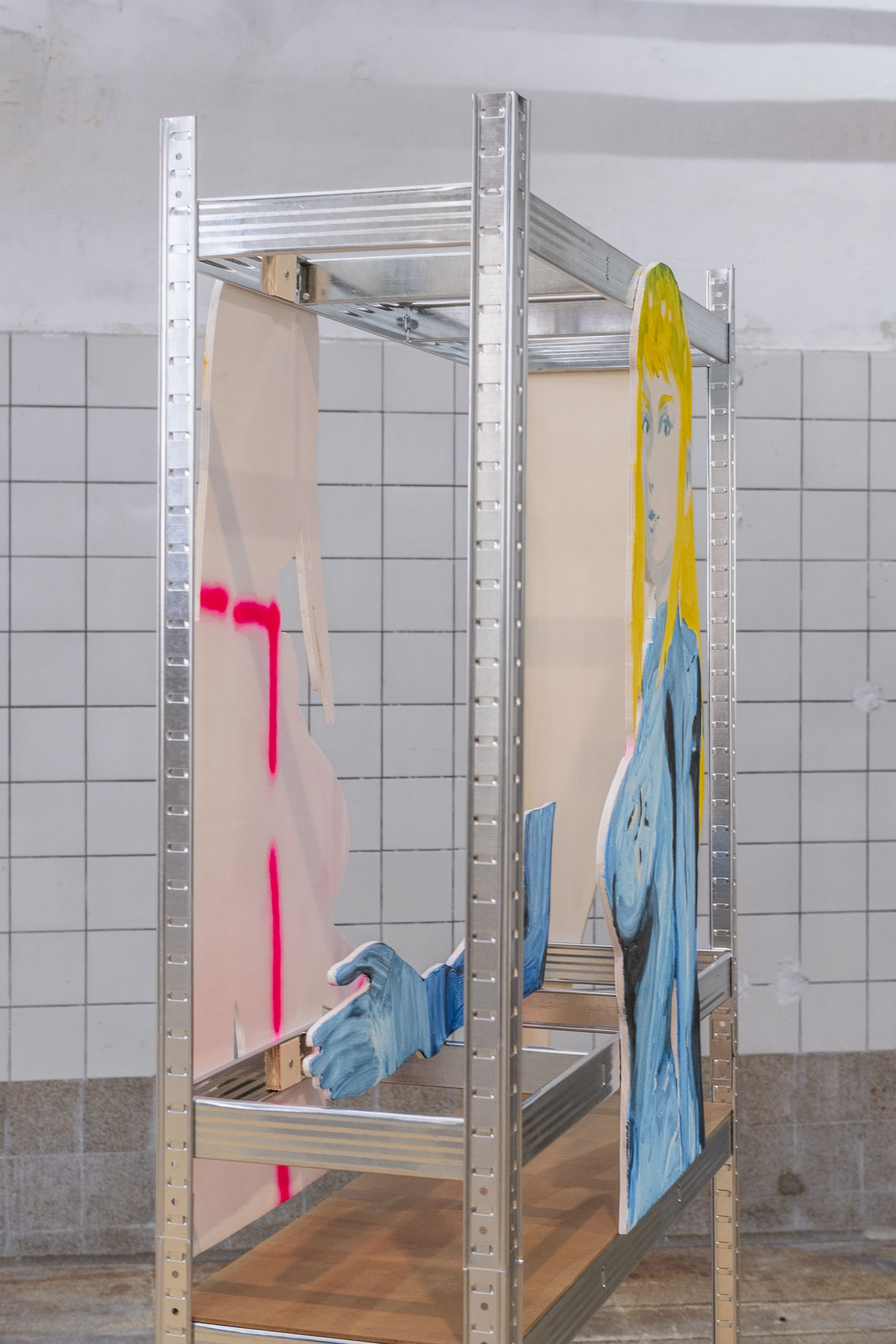By reappropriating the codes of this medium, Simone Nicola Filippo pays tribute to this particular world and its aesthetic, while at the same time drawing attention to some of the issues it raises. It’s all in the title. ‘Tour Bonheur’ [French, = Joyous Tower, or Happiness lap] not only recalls the joys experienced by the author-gamer during his virtual journeys, but also constitutes a pointed reference to the Pokémon universe; a secret and difficult-to-access dungeon that only a seasoned player is likely to find. In choosing this name, in making Quartier Général his tower of happiness, the artist has also crystallised a central element in his thinking: the disappearance of the boundary between the fictional and the concrete. In the exhibition space, there are no walls. Metal shelves take the place of picture rails, revealing the emptiness, while subtly evoking open-space layouts, where boundaries are blurred and hierarchies are hard to perceive. This scenographic gesture metaphorically (de)materialises the demarcation between the virtual world and the real world. By moving these fictitious figures into our physical reality, the painter highlights the crumbling of this boundary and the fantasies and imaginations held by and about these characters. Depicted in the form of silhouettes, reminiscent of promotional cards bearing the effigy of film stars, these figures accentuate this dimension of fan-idol fascination. This highlights the phenomenon of parasocial relationships: the emotional bonds that fans develop with fictional characters. These unilateral attachments can reveal loneliness, emotional deprivation or a form of nostalgia linked to childhood and play. They also question our relationship with unattainable desires and idealised models. Simone Nicola Filippo has selected various female figures from video and animated games to illustrate the contradictions in their representation.