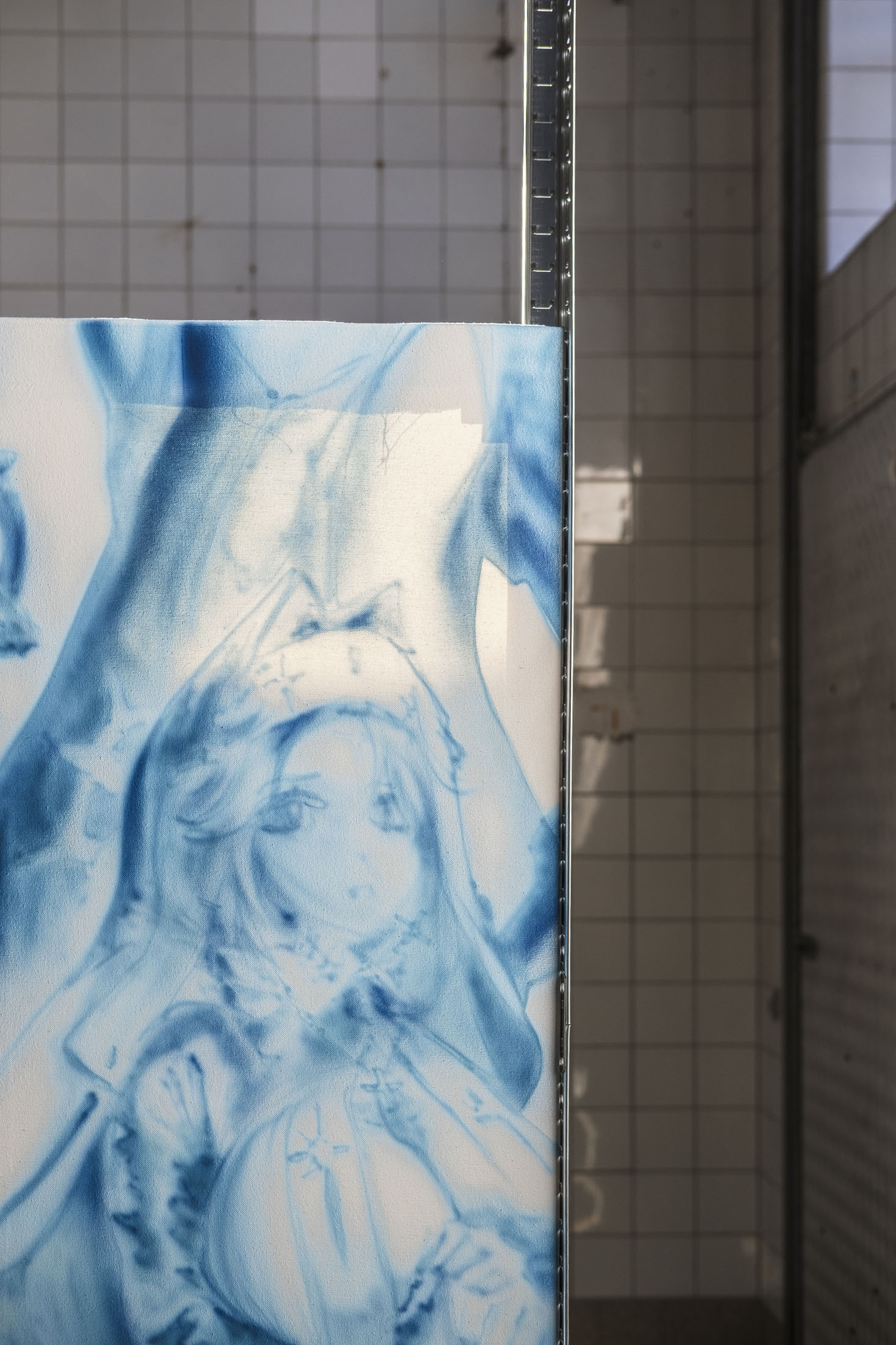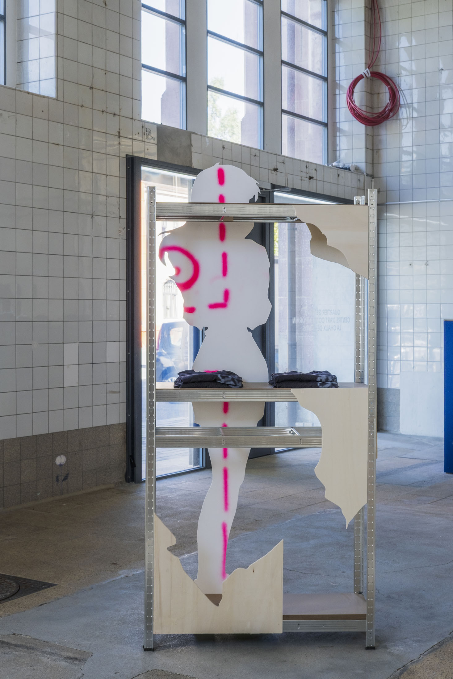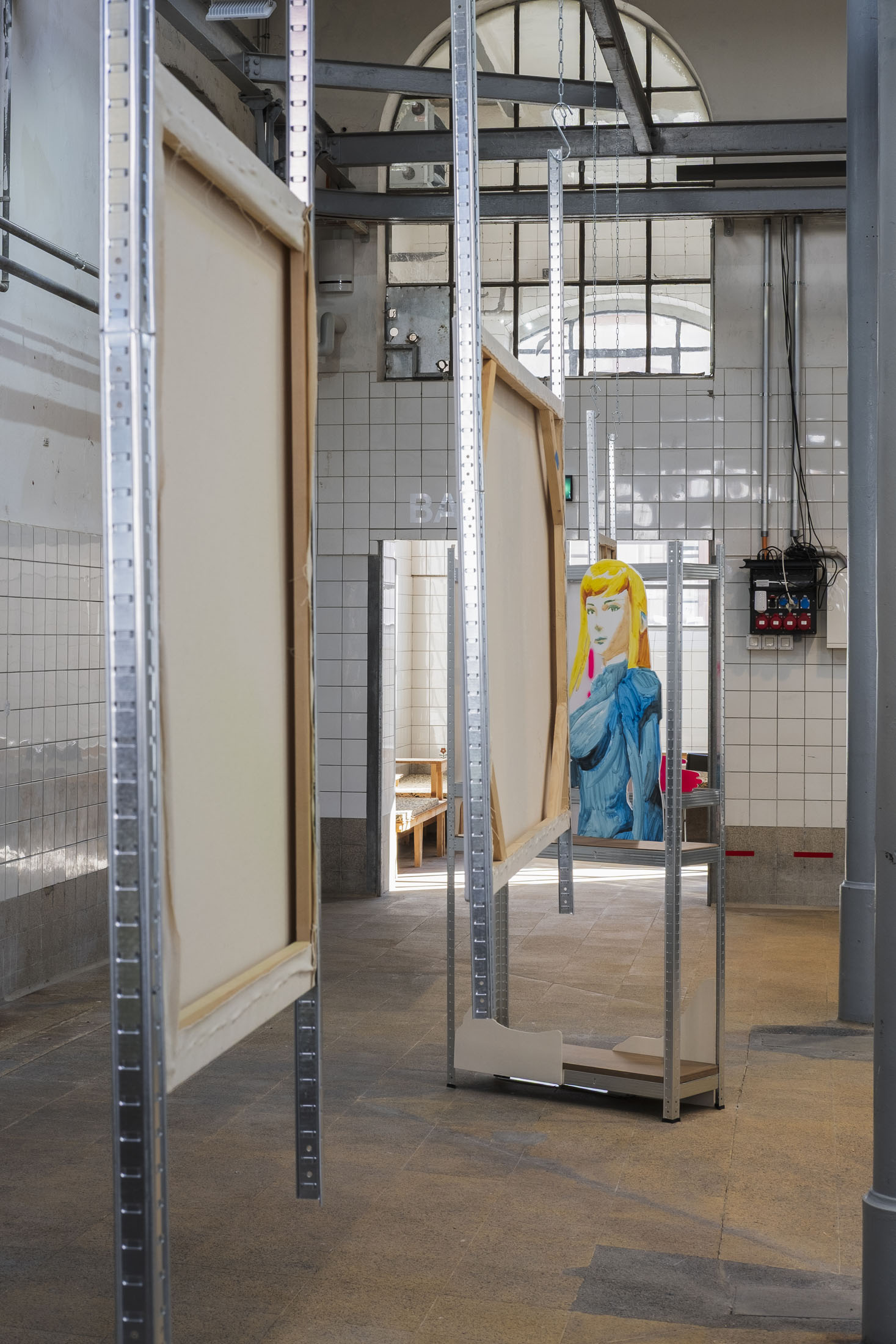 By reappropriating the codes of this medium, Simone Nicola Filippo pays tribute to this particular world and its aesthetic, while at the same time drawing attention to some of the issues it raises. It’s all in the title. ‘Tour Bonheur’ [French, = Joyous Tower, or Happiness lap] not only recalls the joys experienced by the author-gamer during his virtual journeys, but also constitutes a pointed reference to the Pokémon universe; a secret and difficult-to-access dungeon that only a seasoned player is likely to find. In choosing this name, in making Quartier Général his tower of happiness, the artist has also crystallised a central element in his thinking: the disappearance of the boundary between the fictional and the concrete. In the exhibition space, there are no walls. Metal shelves take the place of picture rails, revealing the emptiness, while subtly evoking open-space layouts, where boundaries are blurred and hierarchies are hard to perceive. This scenographic gesture metaphorically (de)materialises the demarcation between the virtual world and the real world. By moving these fictitious figures into our physical reality, the painter highlights the crumbling of this boundary and the fantasies and imaginations held by and about these characters. Depicted in the form of silhouettes, reminiscent of promotional cards bearing the effigy of film stars, these figures accentuate this dimension of fan-idol fascination. This highlights the phenomenon of parasocial relationships: the emotional bonds that fans develop with fictional characters. These unilateral attachments can reveal loneliness, emotional deprivation or a form of nostalgia linked to childhood and play. They also question our relationship with unattainable desires and idealised models. Simone Nicola Filippo has selected various female figures from video and animated games to illustrate the contradictions in their representation.