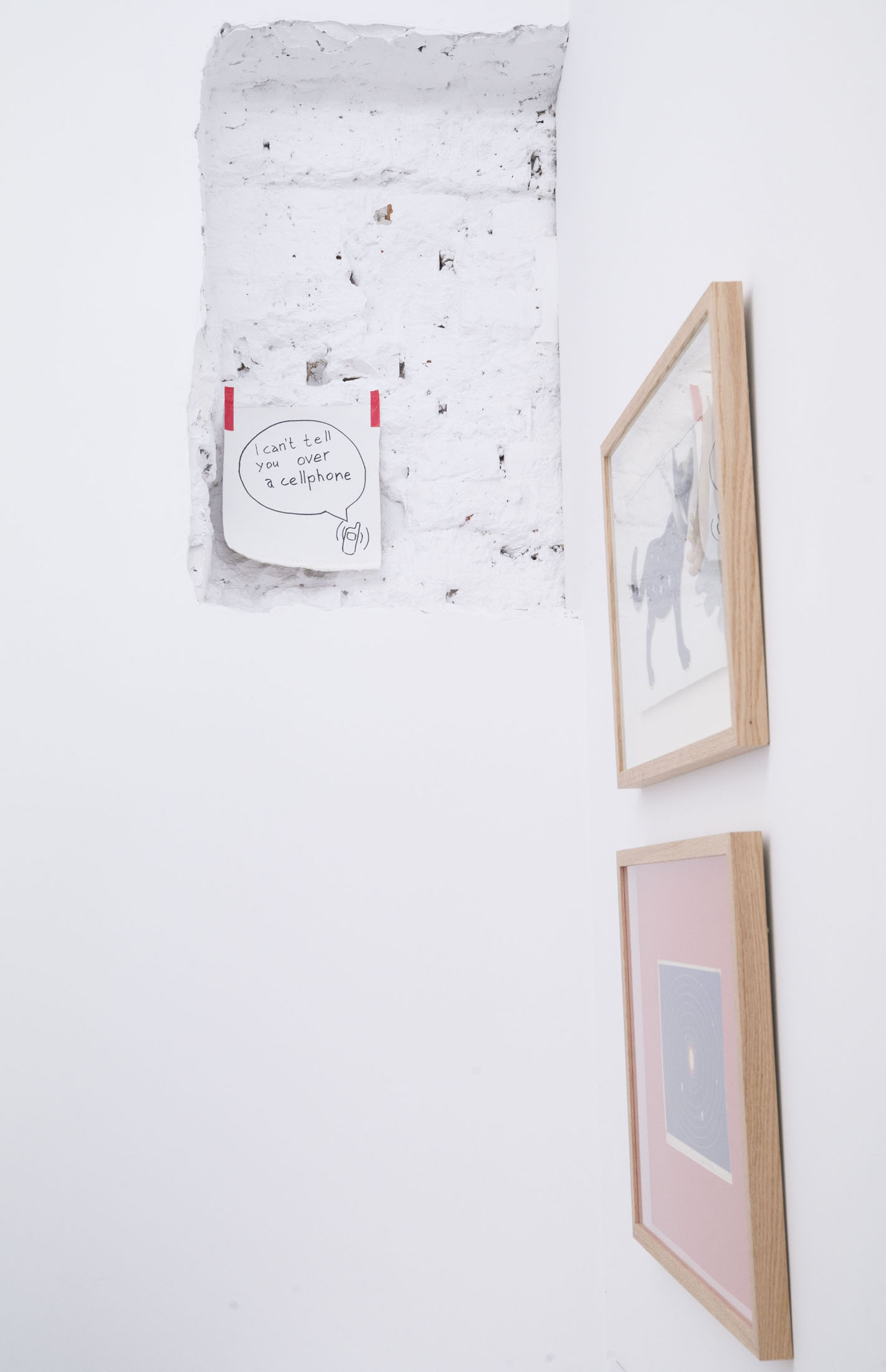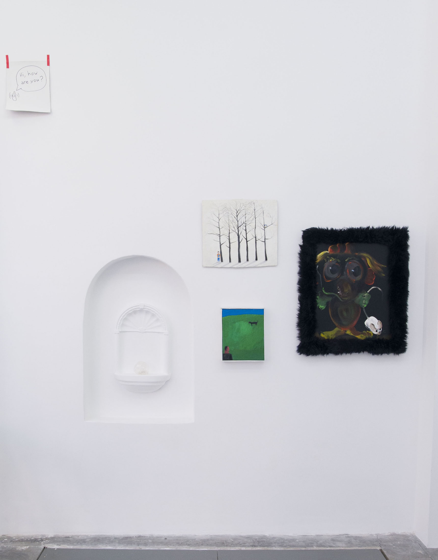 Samuil Stoyanov is presented with two works. “A Call” (2010) presents a brief, almost absurd dialogue, stripped of context and characters. The exchange – “Hi, how are you?” / “I can’t tell you over the phone.” – ironizes social clichés by exposing the gap between a formal gesture and an actual state of being, between what we say and what we withhold in a condition of silent anxiety. The work “Mirror” (2017) imitates a mirror, yet it is painted as if hastily, with silver spray directly onto the wall, echoing our desire to see ourselves right now and also precisely here. Thus the two works – one based on language, the other on image – create a shared field of doubt, reflection, and a gently ironic tension between the visible and the invisible, between what is spoken and what is left unsaid.