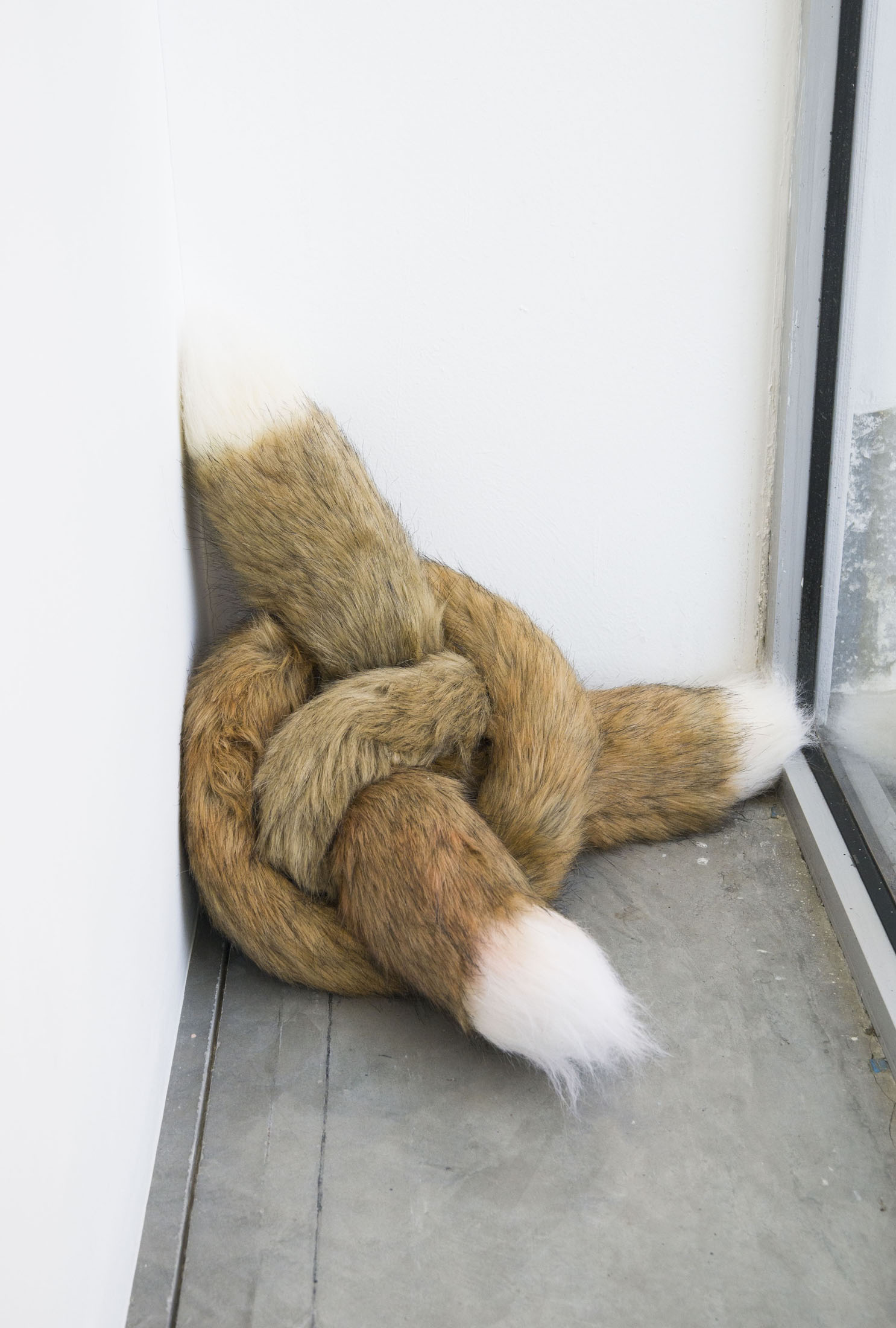 In “f(o)xy” (2024), Viktor Petrov seems to transform the ancient Thracian triskelion into an object made of three fox tails of synthetic fur, twisted into a knot without beginning or end. The artist explains that the title plays with the form of a mathematical function: just as variables x, y and z define the three spatial axes, o refers to the “origin” – the point from which everything unfolds and into which everything dissolves. The fox, as a mythical figure, enters into playful contrast with this geometric system. Known for its cunning and its ability to “bend” the truth, it acts like a function that destabilizes the rules of visual perception.