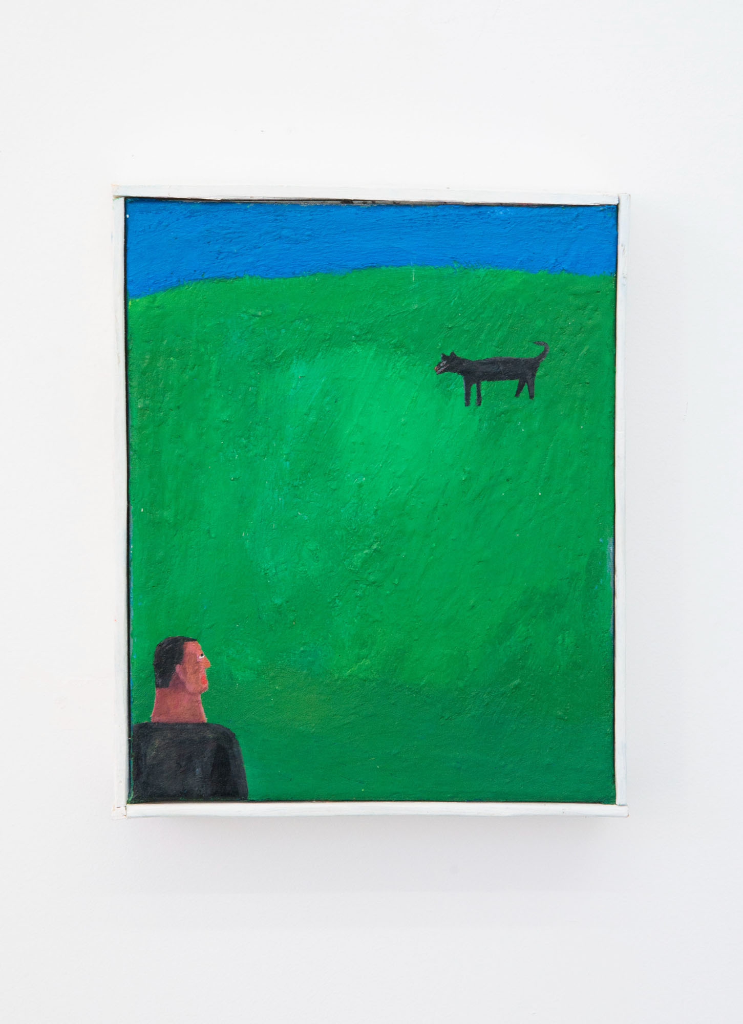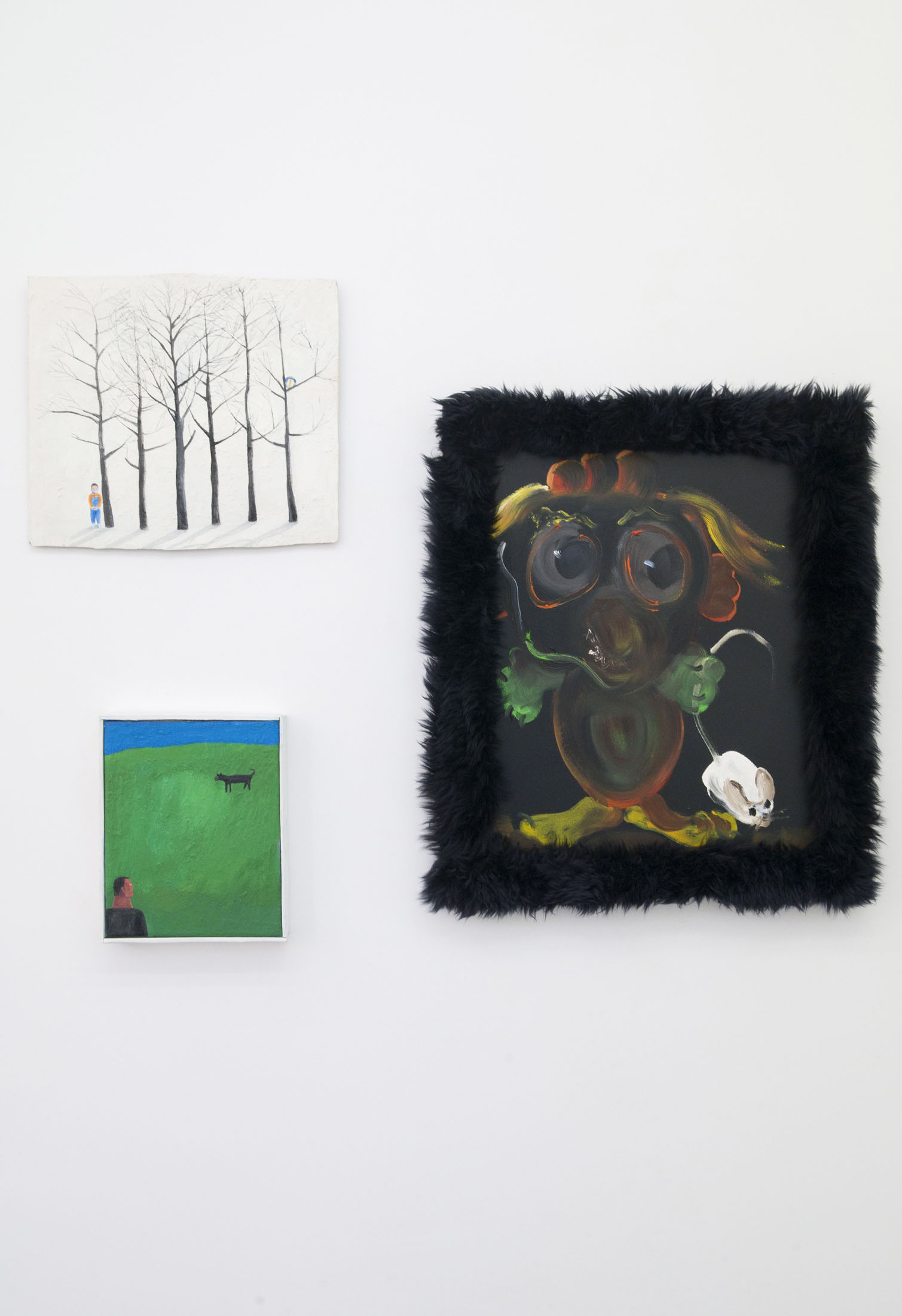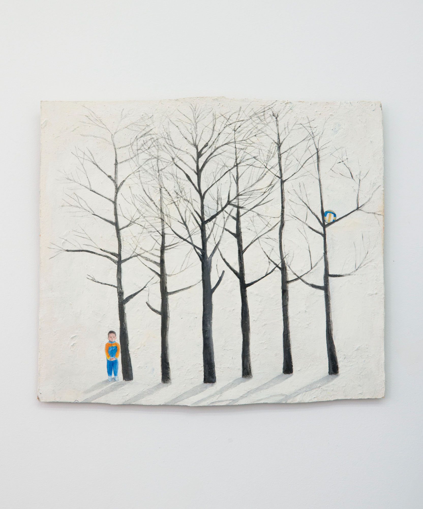 In the ironic “Portrait” (2016), Krassimir Terziev depicts a bear against a green background commonly used in film and television to be keyed out and replaced or to facilitate special effects. The same color (or a memory of it) appears in Artan Hajruhllahu’s “Memories on the Hill” (c. 2021), beyond its conceptual function in Terziev’s work. In his typical naïve style Hajruhllahu illustrates a silent conversation between a person and a memory hovering somewhere far off on the horizon of consciousness. His other work “Ball” (2018) shows a boy in a bare winter landscape whose ball has “escaped” high up onto a branch.
