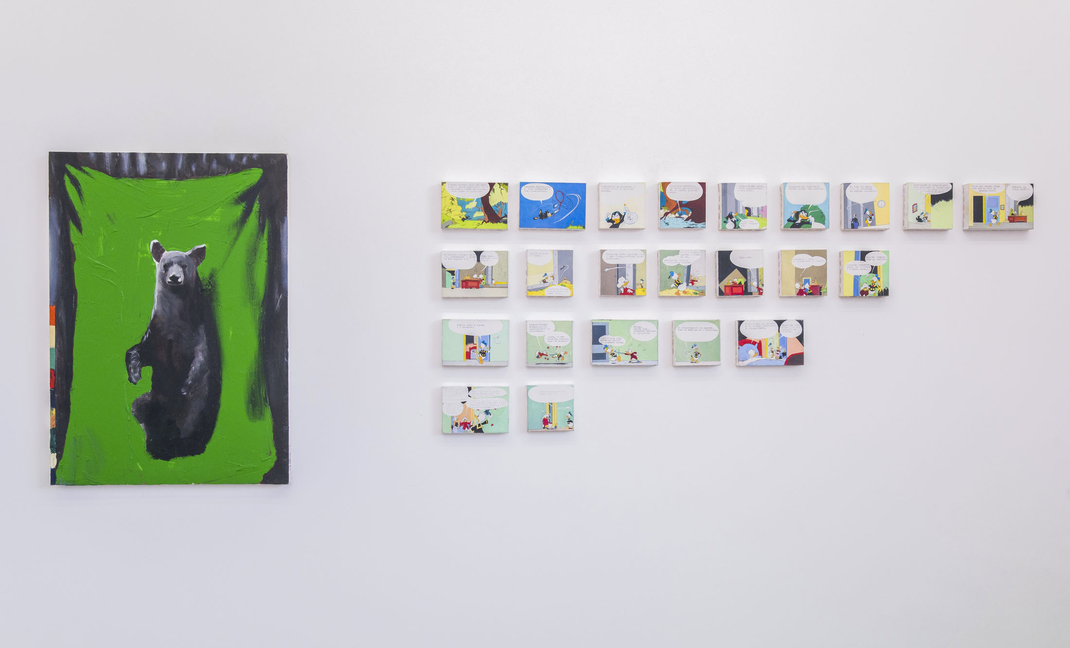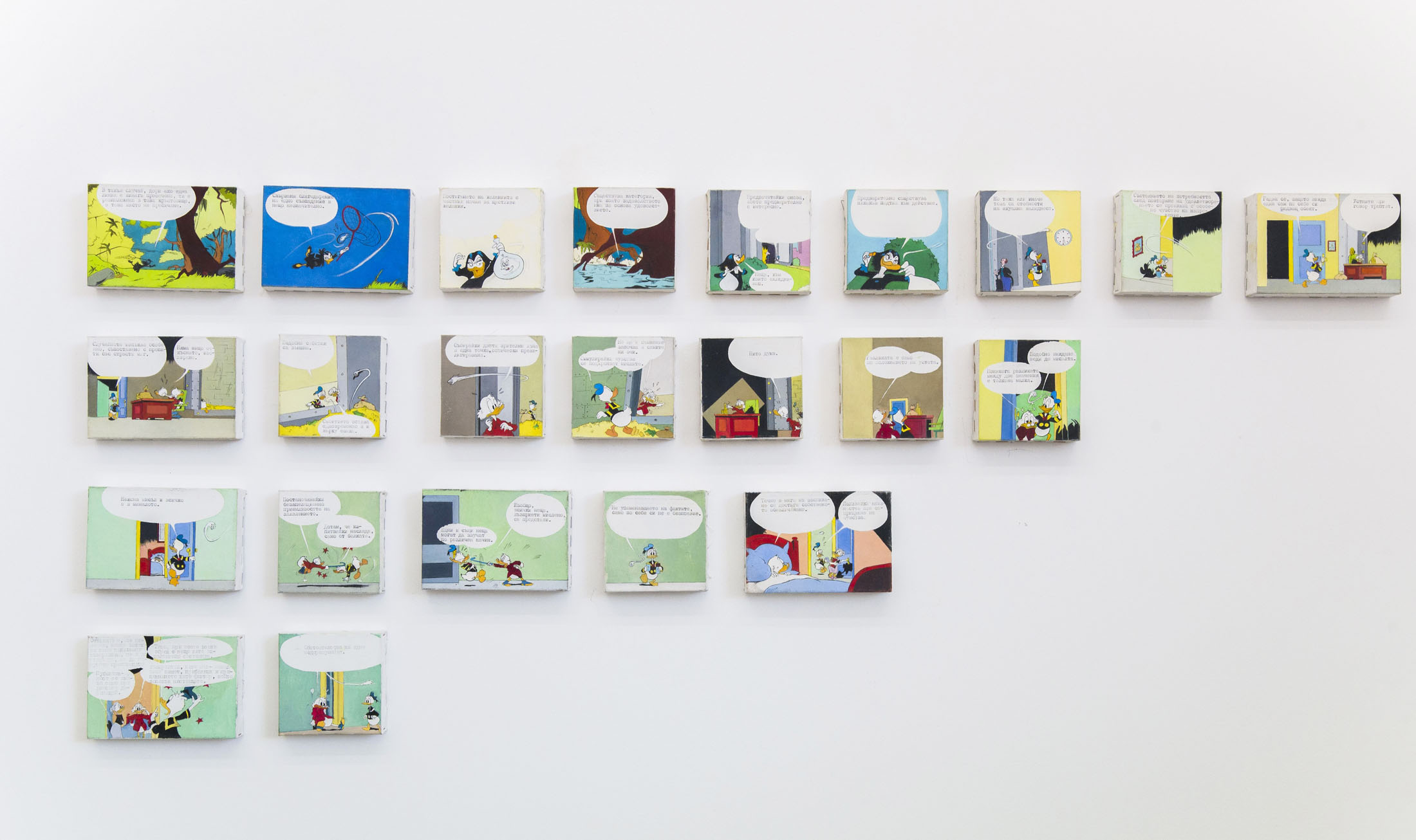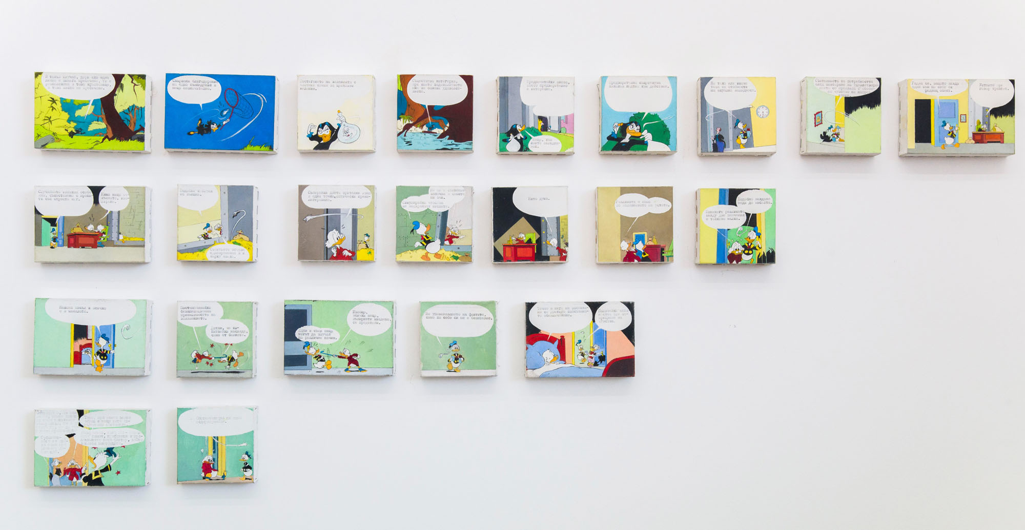“The Message Is Not the Media II” (2000) by Jelko Terziev challenges the boundaries of language and the visual – that is, meaning itself – in a situation where word and image become incompatible: twenty-three images painted in oil and acrylic reproduce an episode from a popular Donald Duck and Uncle Scrooge comic. The visual narrative begins with a witch releasing an evil spirit, triggering a conflict between the two main characters. At the end Uncle Scrooge is devastated to find his treasure vault empty. The dialogues from the original story are replaced with textual fragments from José Ortega y Gasset’s “Essays”, placed in the genre’s customary speech bubbles.