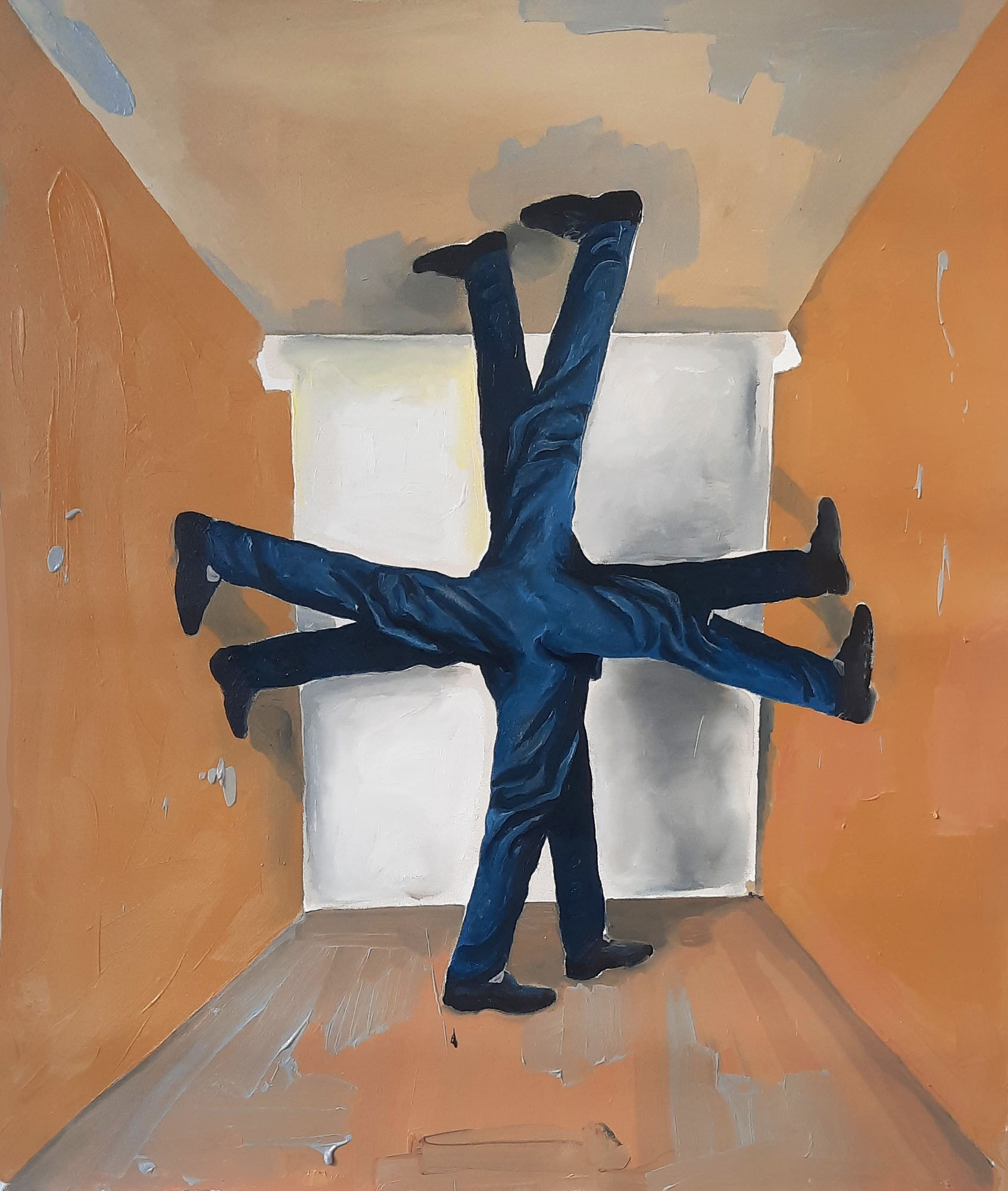 This visual logic of interweaving continues in Sasho Violetov’s painting (“Untitled”, 2025). Of his practice he notes: “I often work with familiar archetypes and cultural symbols only to reimagine them in unfamiliar, even uncomfortable contexts. Images, phrases and gestures taken from everyday life, memory and popular culture intertwine in compositions that imitate logic yet reject answers.”