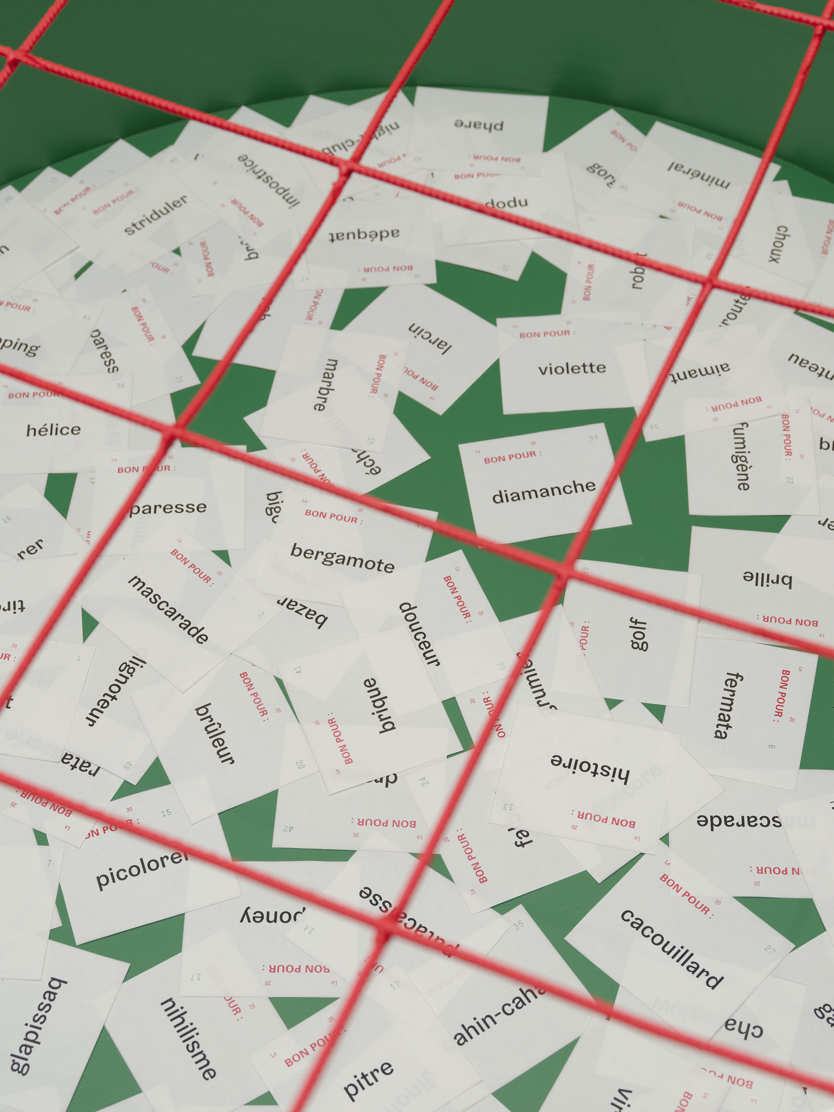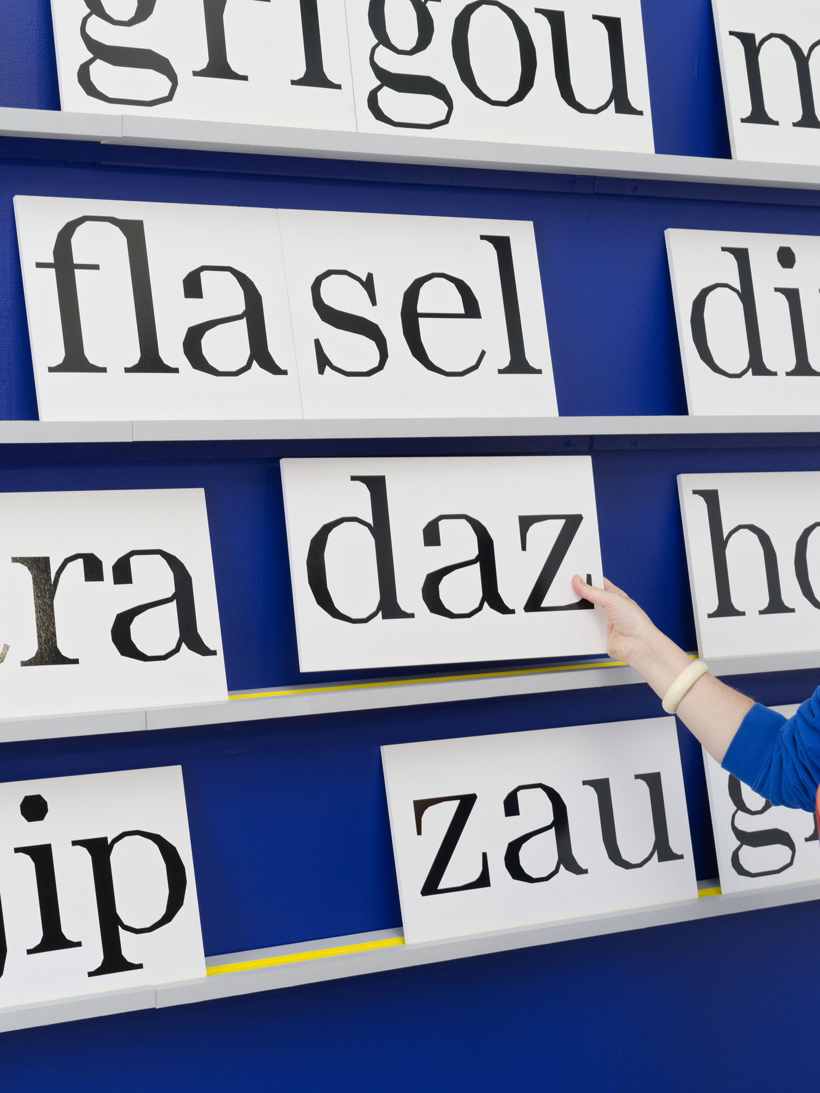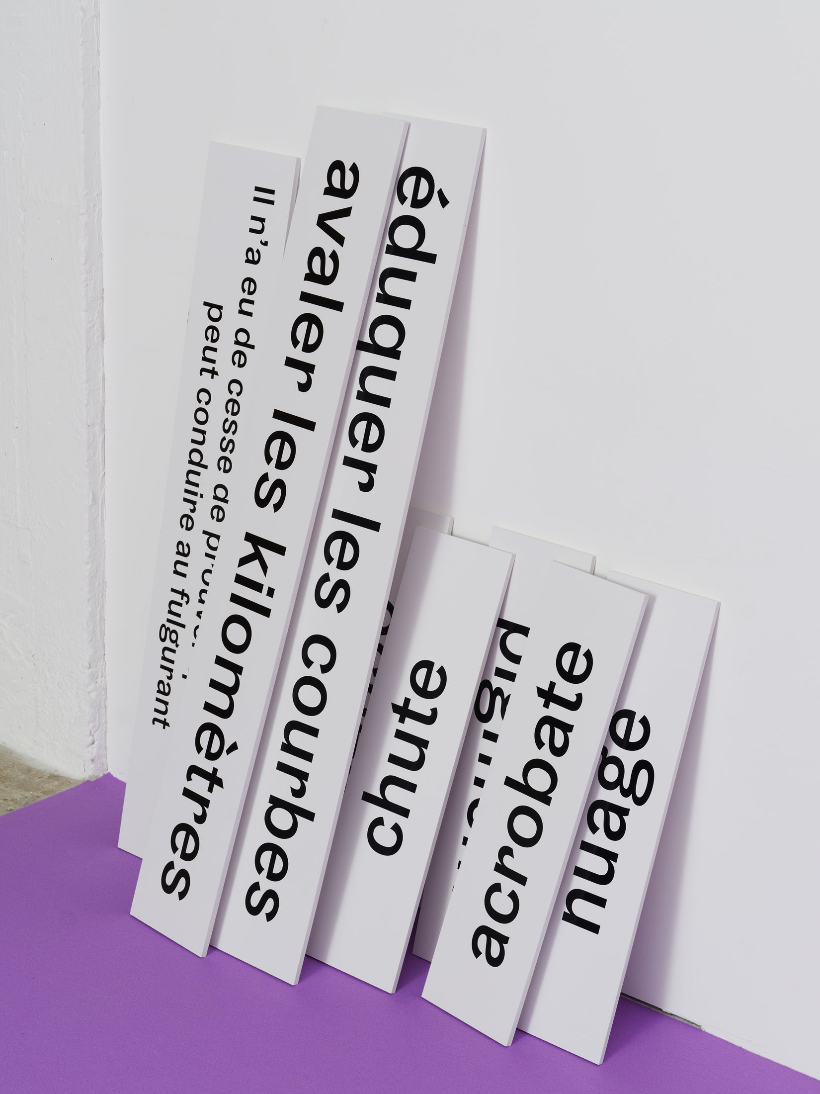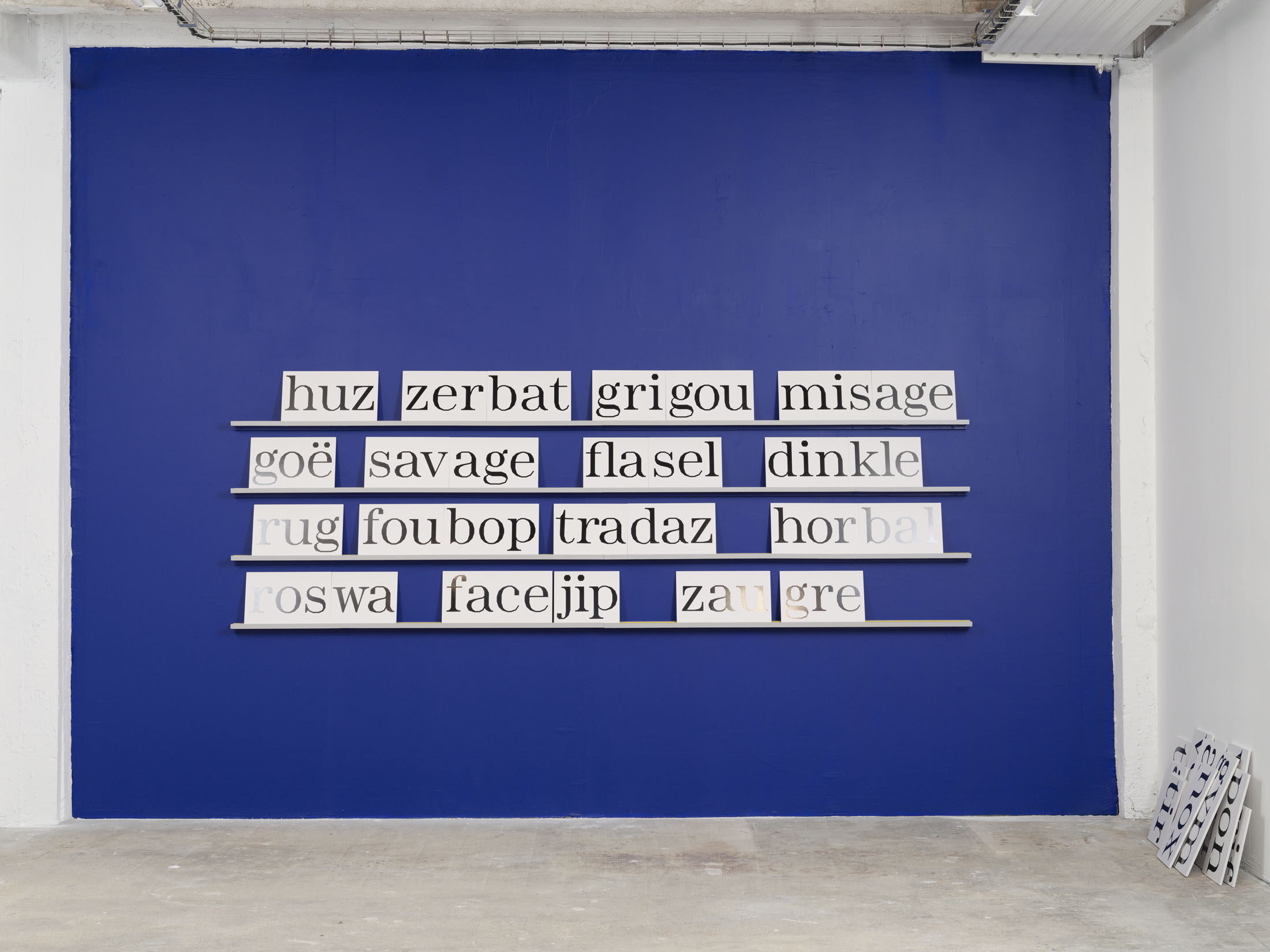 In this exhibition she invites us to plunge into an immersive landscape with multiple meanings. It’s a protected area where words are raised on high, cherished, welcomed, stripped bare, and listened to with curiosity. It’s then up to us to play with the ebb and flow of the language, to dive into the long words, to wander freely, chatter away, sail close to the wind or allow ourselves to be carried along on the drift.