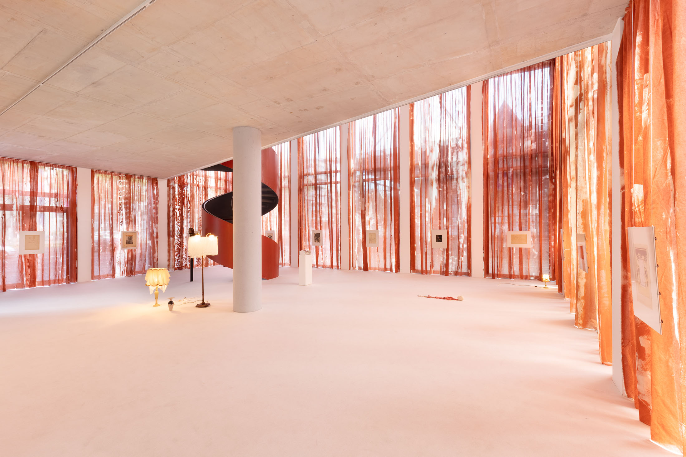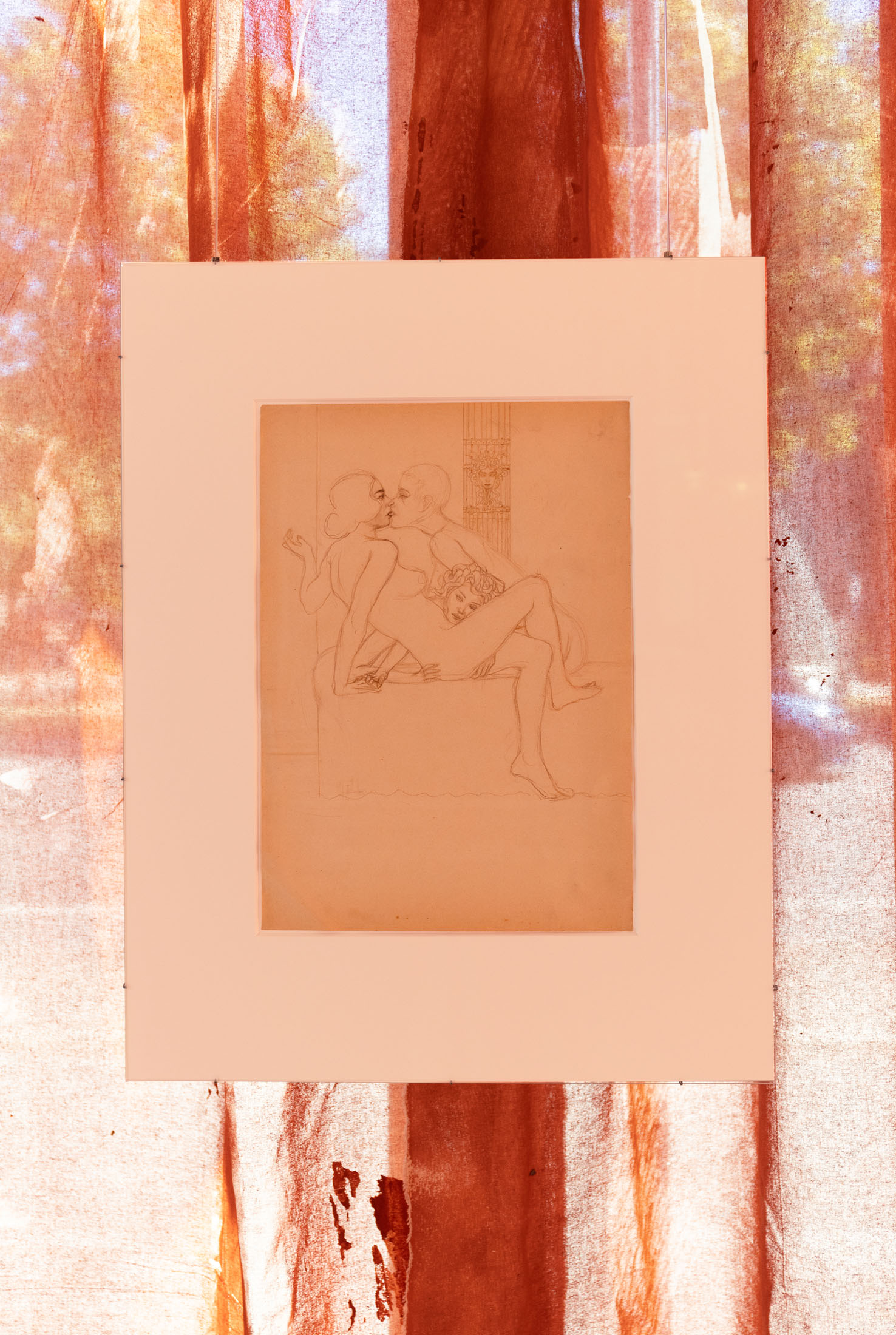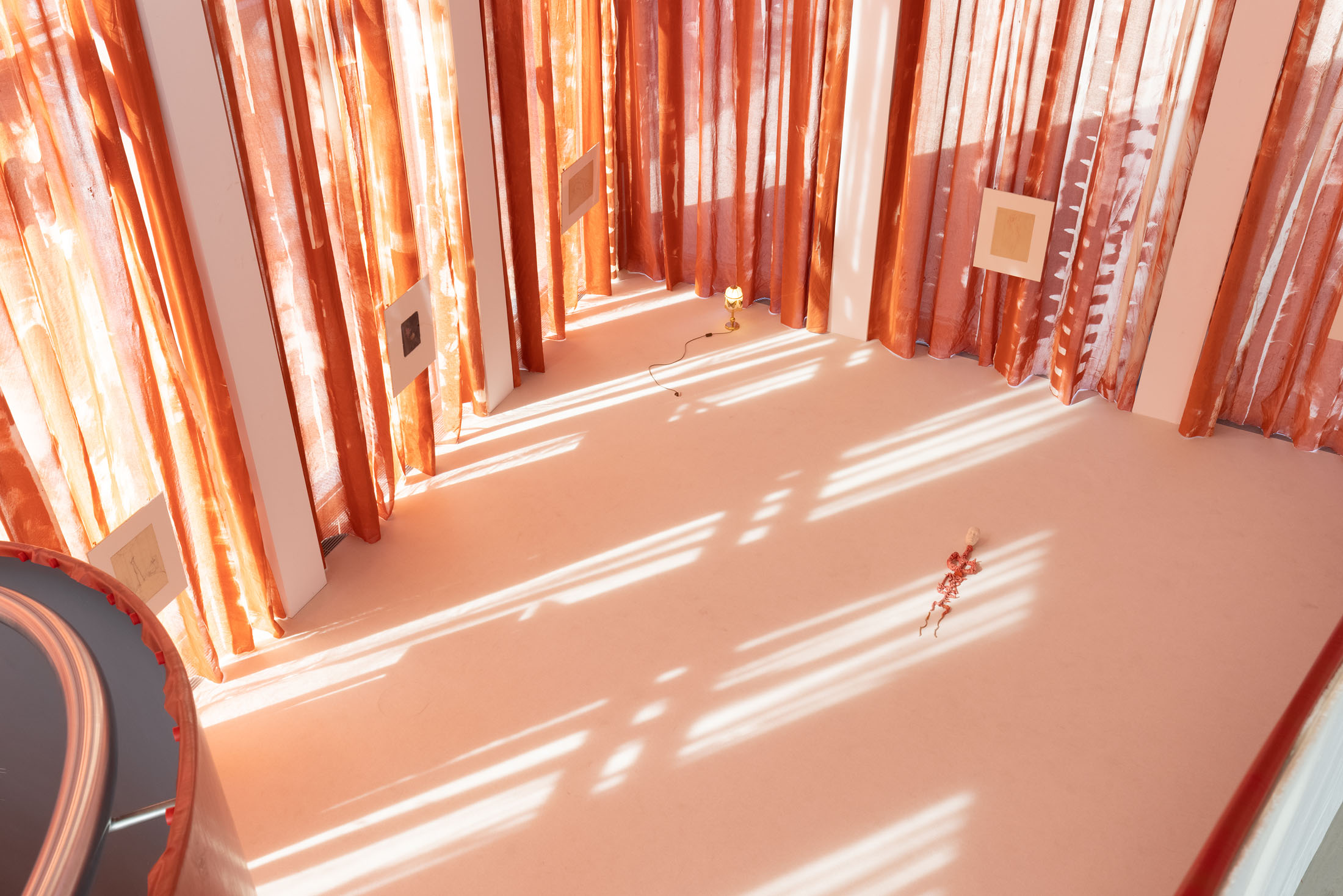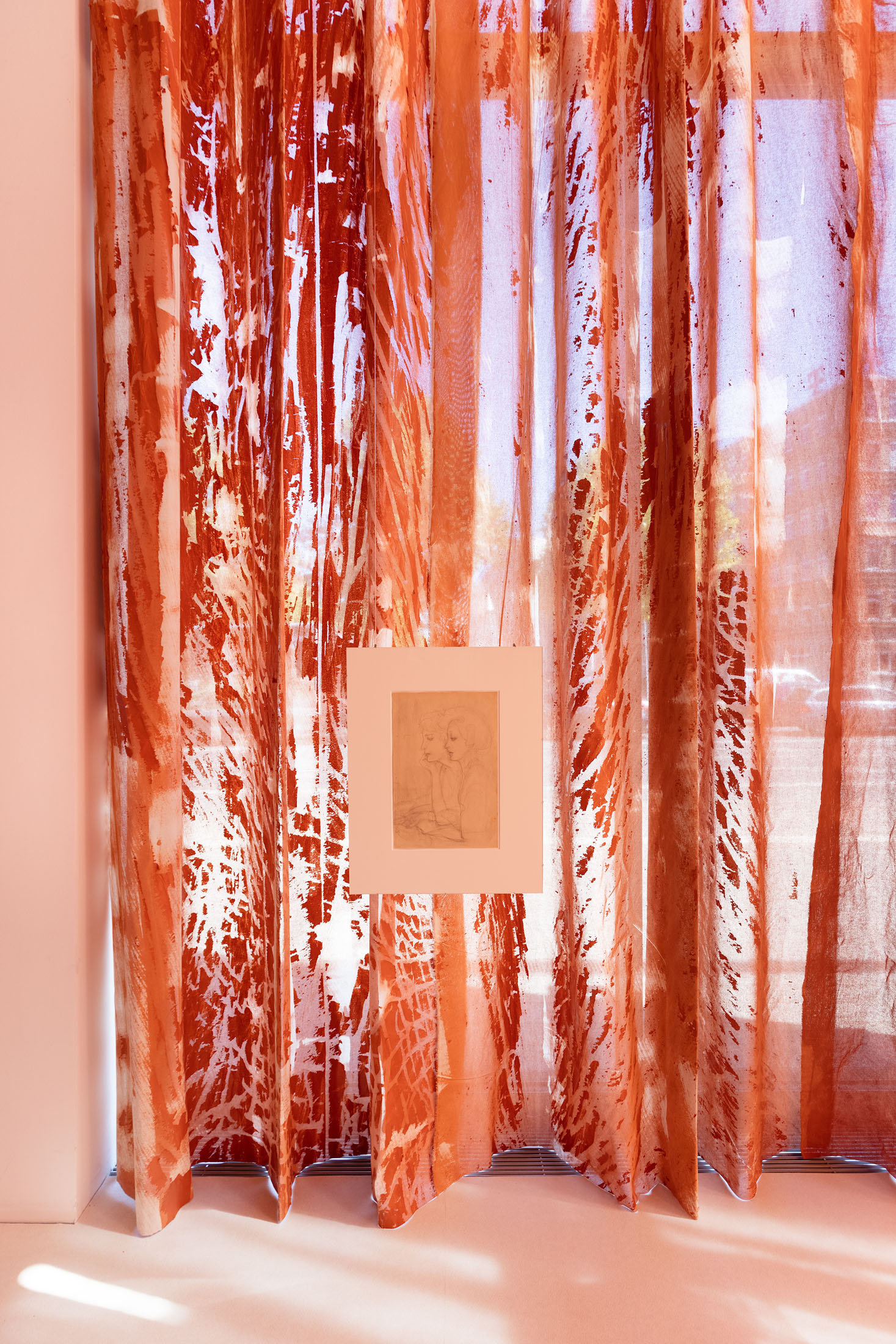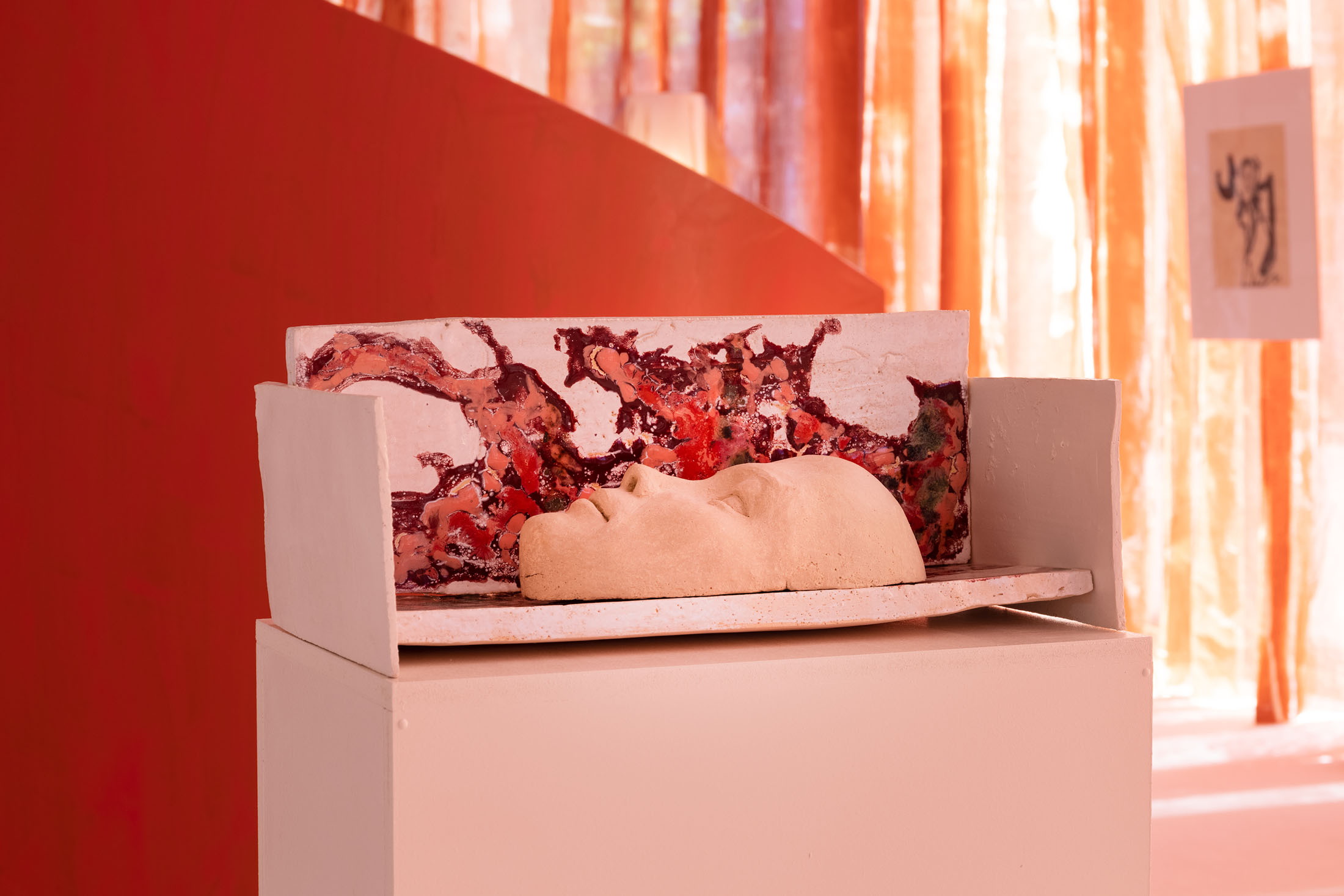 In Sleeves of Desire, Matsubara creates an immersive space through large-format fabrics, painted on-site, and a multipart series of drawings on found paper, antiques, and ceramic objects. The space evokes a sense of being inside one’s own body: sound-absorbing materials and oxblood-red curtains make the windows appear like closed eyelids, reinforcing an atmosphere of introspection. The overall scenography follows desire as what Han calls a ‘placeless utopia of the wholly Other.’