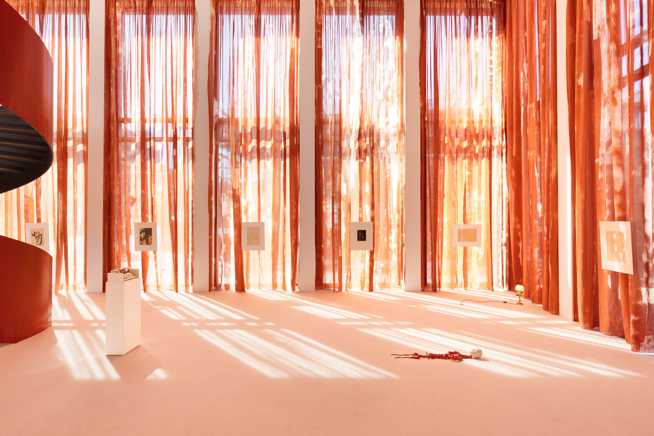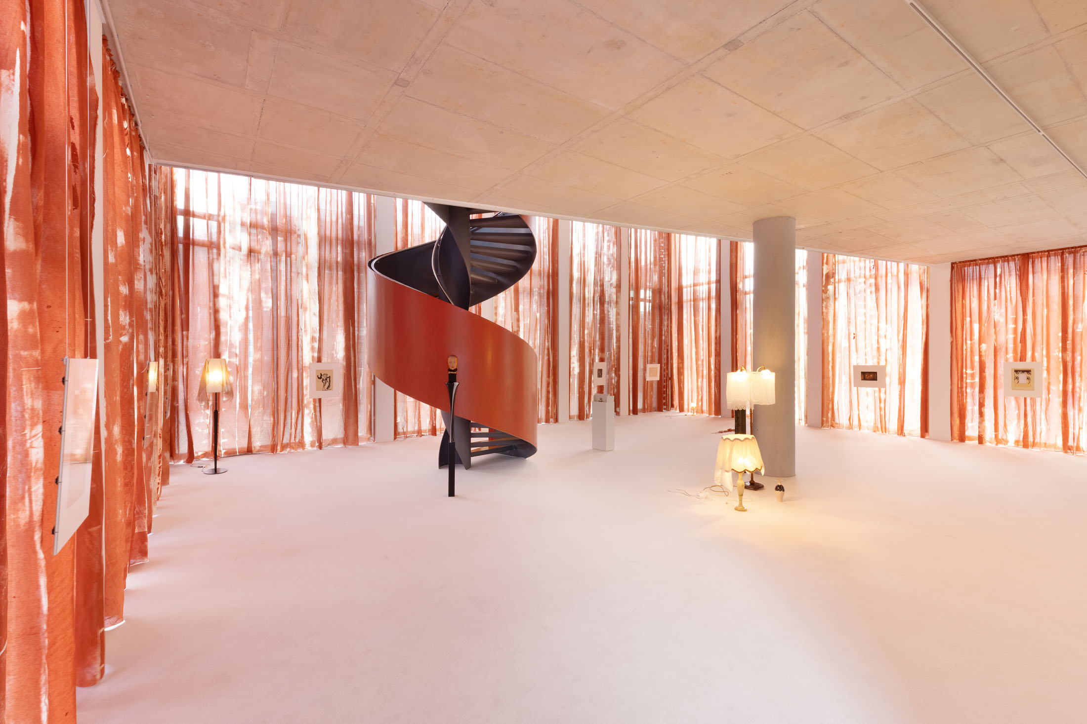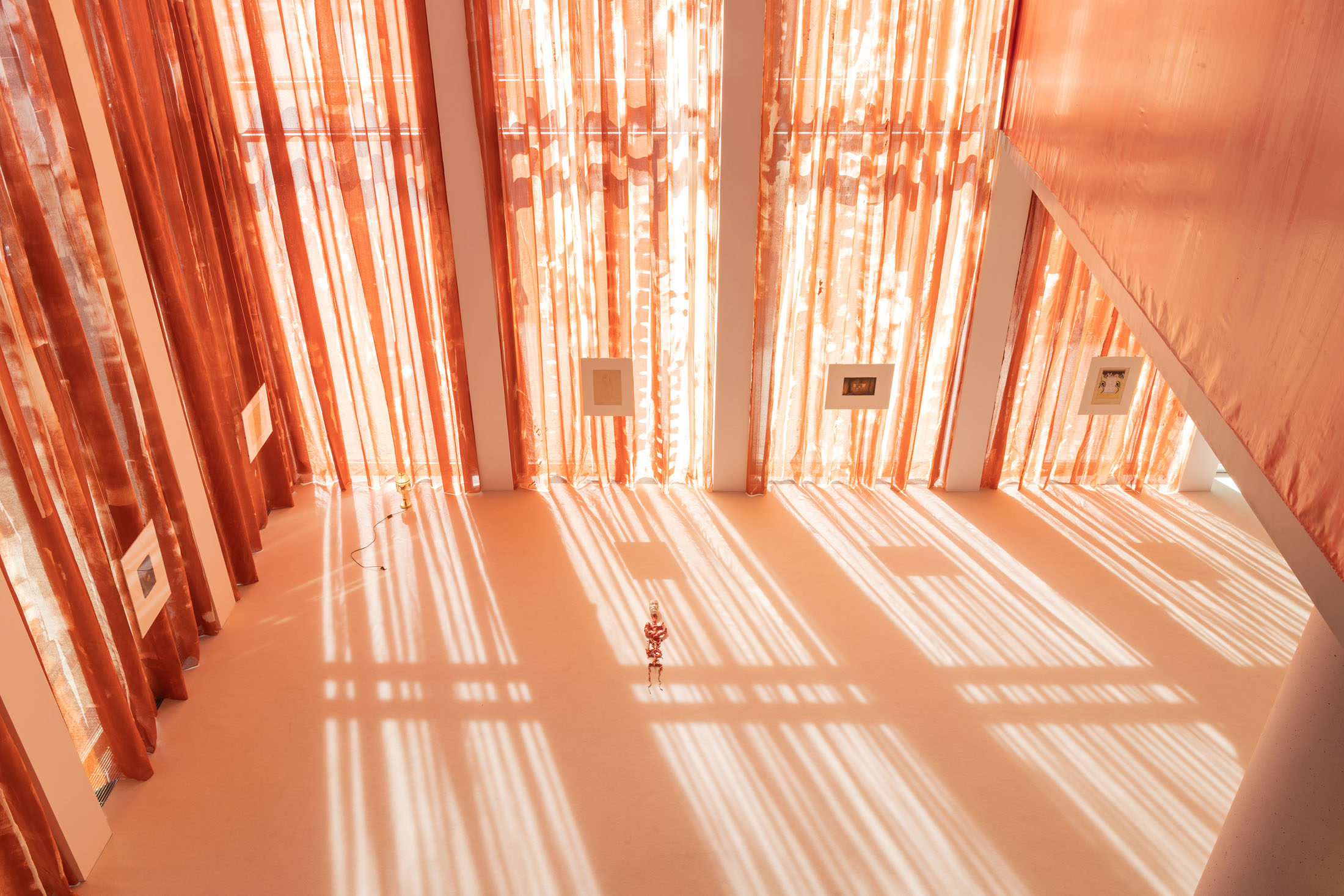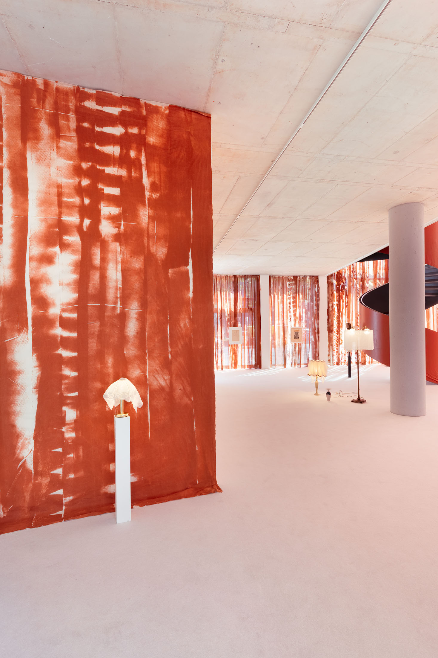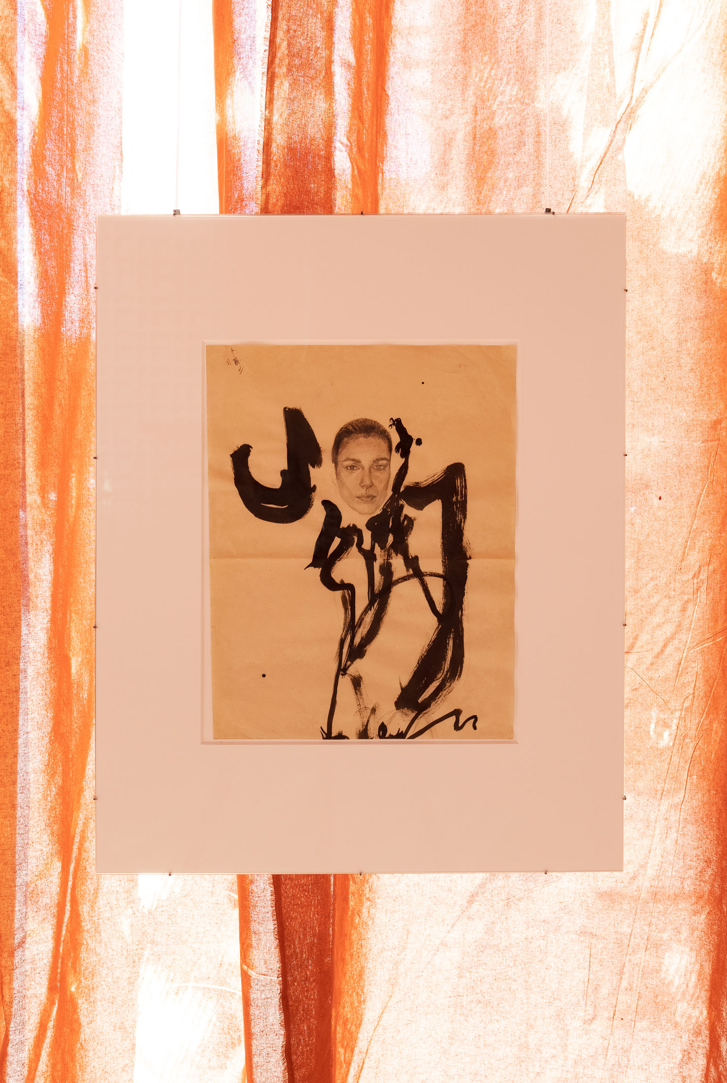 In Sleeves of Desire, Matsubara creates an immersive space through large-format fabrics, painted on-site, and a multipart series of drawings on found paper, antiques, and ceramic objects. The space evokes a sense of being inside one’s own body: sound-absorbing materials and oxblood-red curtains make the windows appear like closed eyelids, reinforcing an atmosphere of introspection. The overall scenography follows desire as what Han calls a ‘placeless utopia of the wholly Other.’