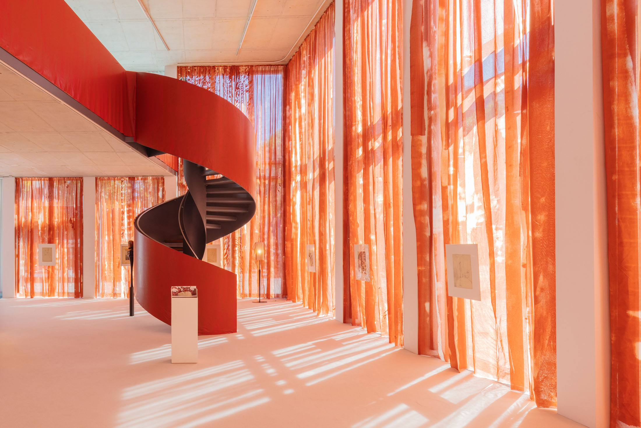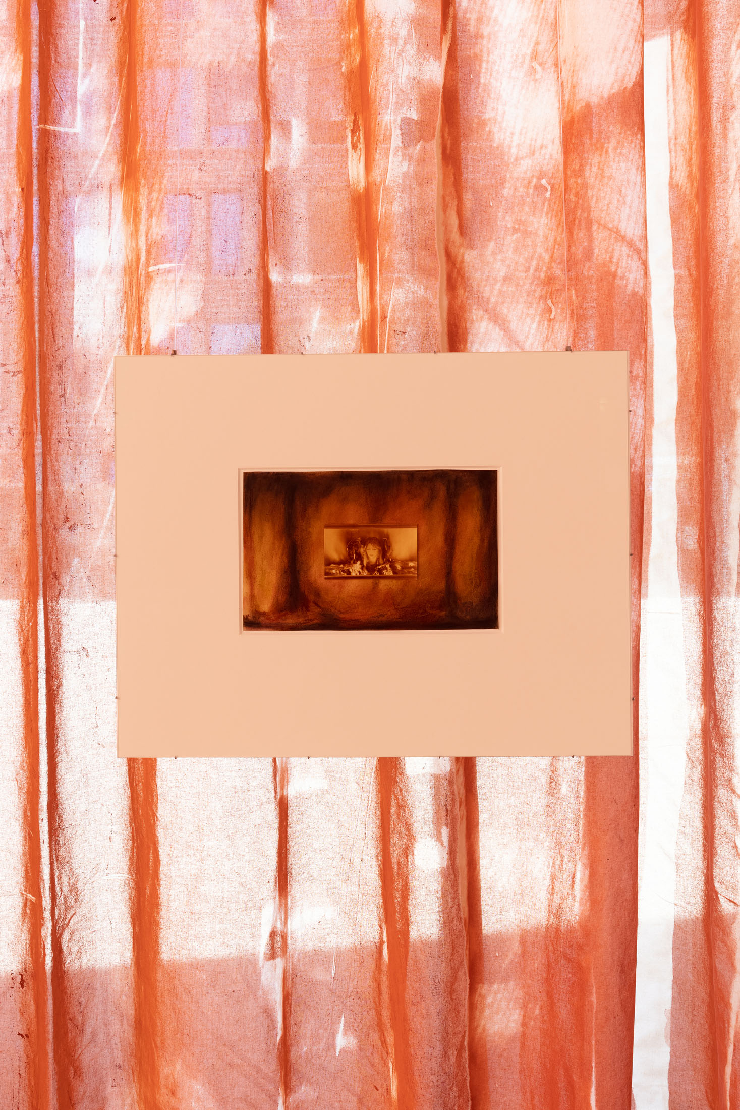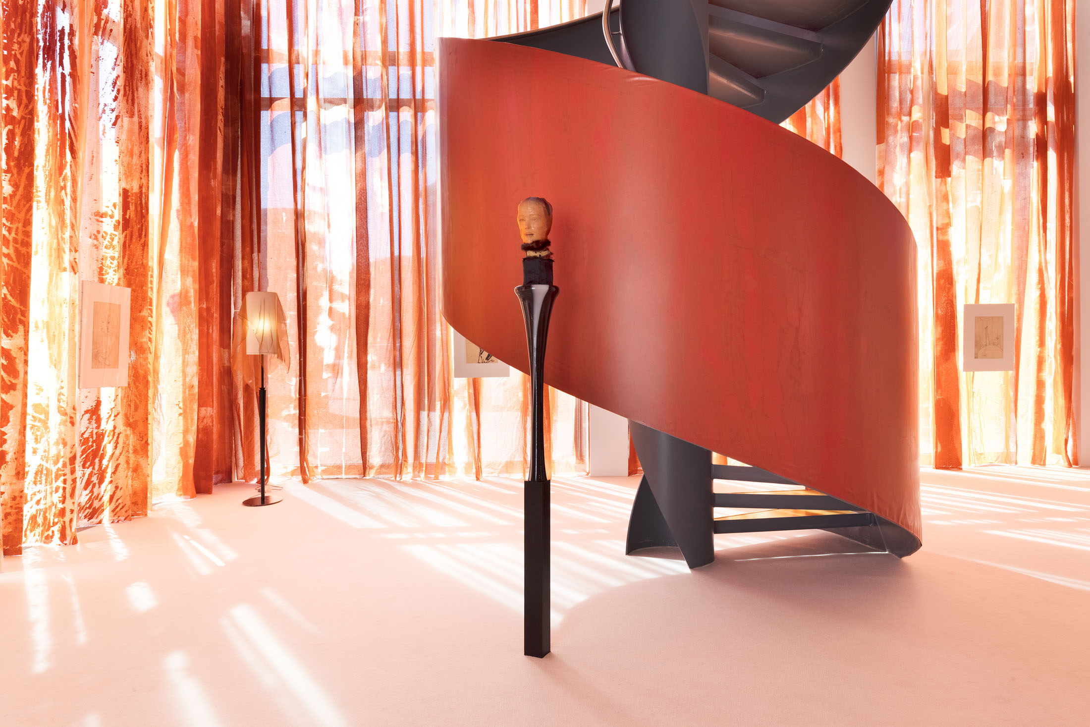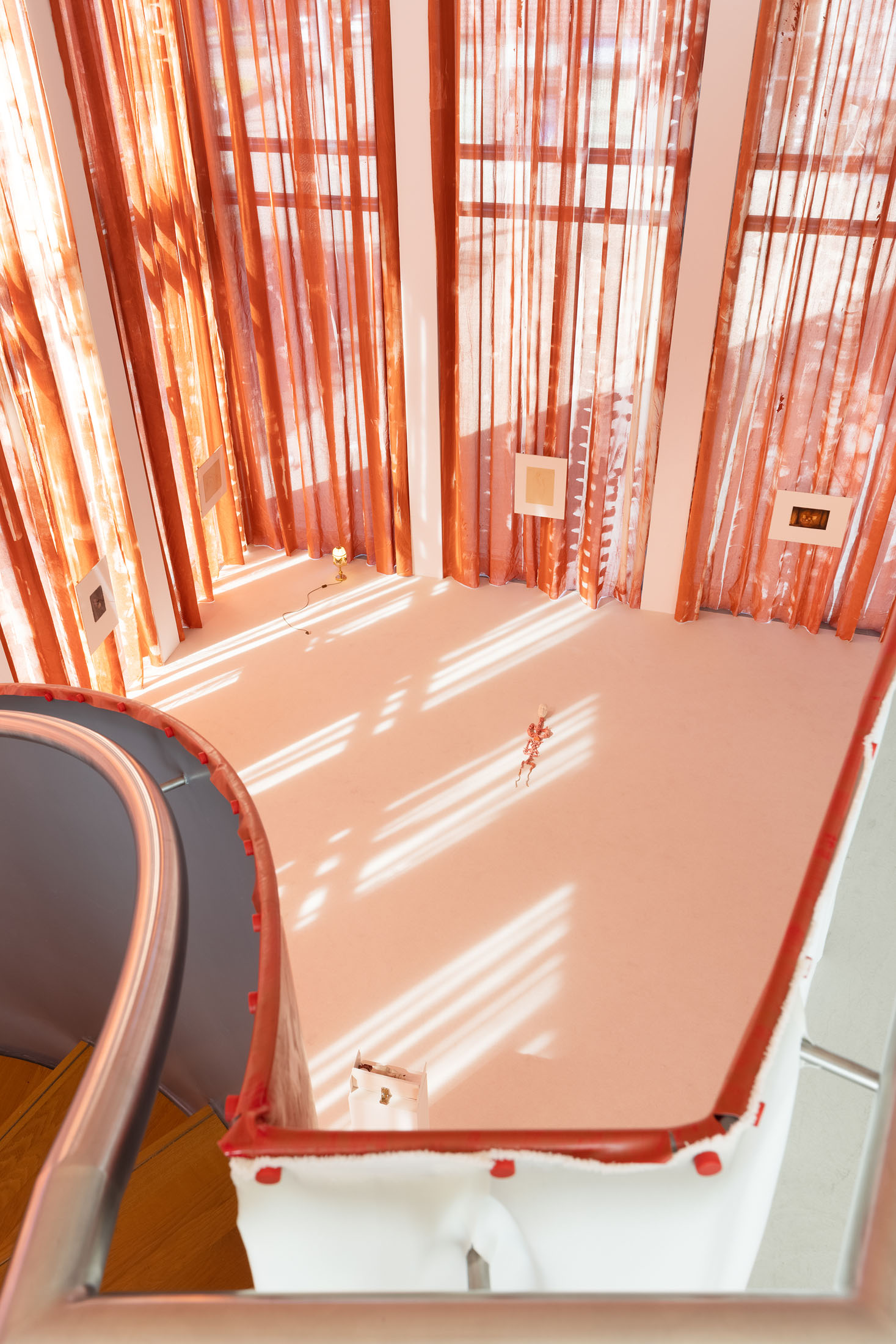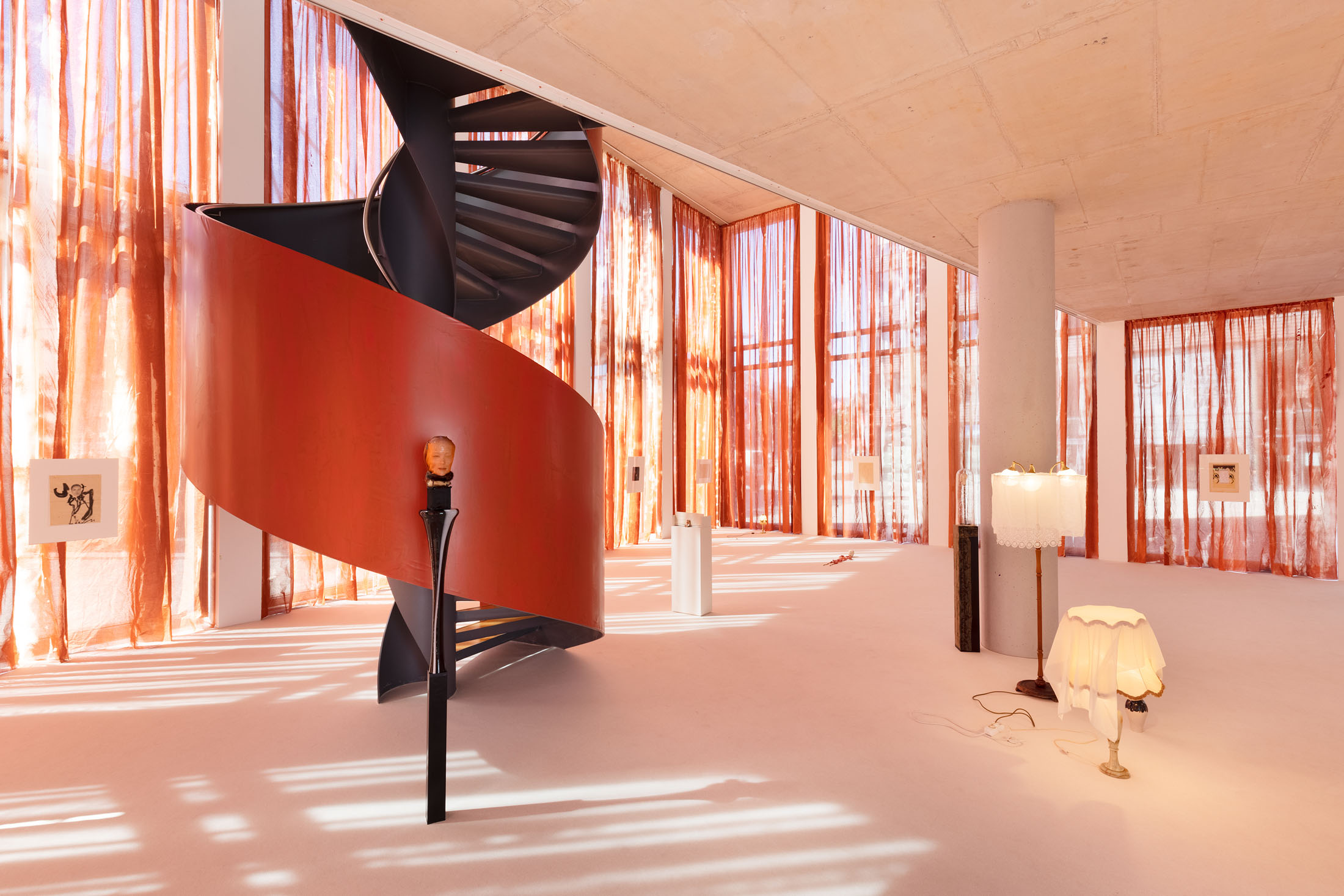 In Sleeves of Desire, Matsubara creates an immersive space through large-format fabrics, painted on-site, and a multipart series of drawings on found paper, antiques, and ceramic objects. The space evokes a sense of being inside one’s own body: sound-absorbing materials and oxblood-red curtains make the windows appear like closed eyelids, reinforcing an atmosphere of introspection. The overall scenography follows desire as what Han calls a ‘placeless utopia of the wholly Other.’